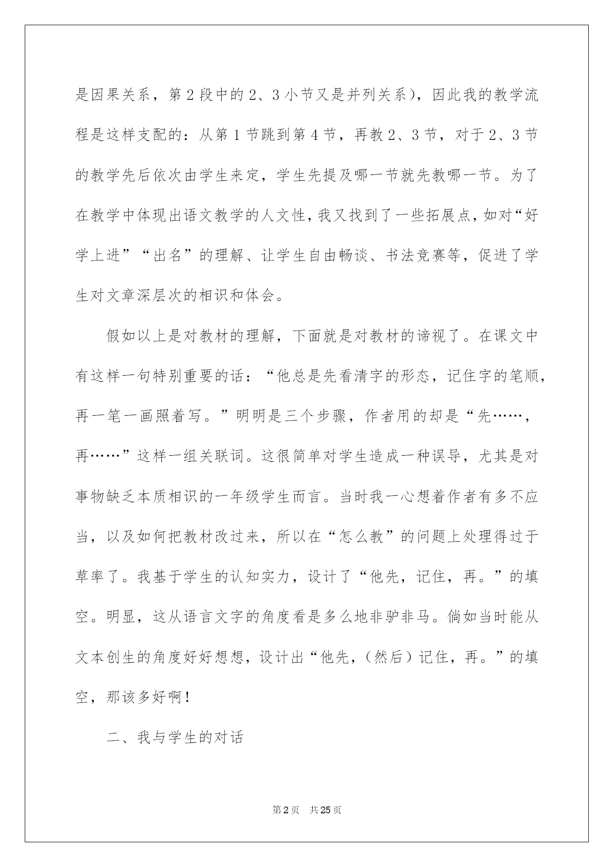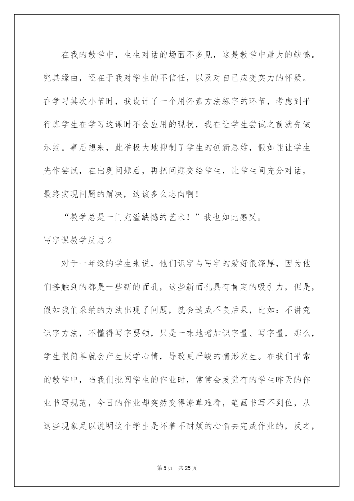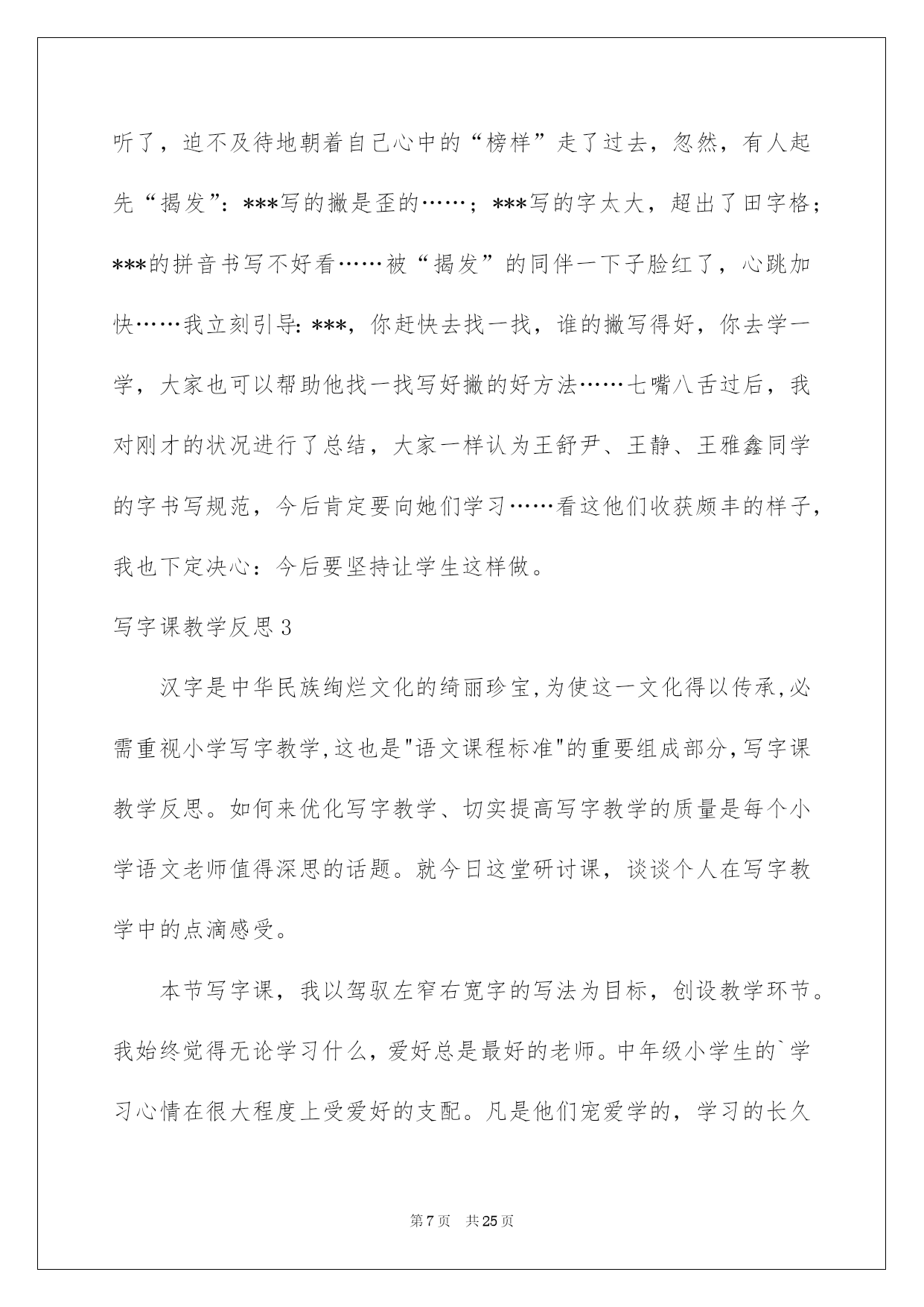 第PAGE\*Arabic\*MERGEFORMAT25页共NUMPAGES\*Arabic\*MERGEFORMAT25页第PAGE\*MERGEFORMAT25页共NUMPAGES\*MERGEFORMAT25页第PAGE\*MERGEFORMAT25页共NUMPAGES\*MERGEFORMAT25页第PAGE\*MERGEFORMAT25页共NUMPAGES\*MERGEFORMAT25页第PAGE\*MERGEFORMAT25页共NUMPAGES\*MERGEFORMAT25页第PAGE\*MERGEFORMAT25页共NUMPAGES\*MERGEFORMAT25页第PAGE\*MERGEFORMAT25页共NUMPAGES\*MERGEFORMAT25页第PAGE\*MERGEFORMAT25页共NUMPAGES\*MERGEFORMAT25页第PAGE\*MERGEFORMAT25页共NUMPAGES\*MERGEFORMAT25页第PAGE\*MERGEFORMAT25页共NUMPAGES\*MERGEFORMAT25页第PAGE\*MERGEFORMAT25页共NUMPAGES\*MERGEFORMAT25页2022写字课教学反思写字课教学反思作为一名人民老师,我们要有一流的教学实力,在写教学反思的时候可以反思自己的教学失误,如何把教学反思做到重点突出呢?以下是我收集整理的写字课教学反思,希望能够帮助到大家。写字课教学反思1一、我与文本的对话老师的教学必需建立在与文本充分对话的基础上。基于这样的相识,我不厌其烦地读这篇貌似平常的小文章,从我的学问结构动身,理解与谛视它。为了在教学中体现出语文教学的“语文味”,字词句短篇,我反复推敲。既找到了一些对于学生理解有重要作用的关键词,如“好学上进”、“特别仔细”、“出名”等,又完成了非线性的教学设计。考虑到文章可以分为三个意义段(第1节为第1段,讲的是少年怀素好学上进;第2、3节为第2段,讲的是为什么怀素可以成为出名的书法家;第4节为第3段,讲的是成年怀素的出名。),同时三个意义段之间又存在肯定的逻辑关系(1、3段是时间先后关系,2、3段是因果关系,第2段中的2、3小节又是并列关系),因此我的教学流程是这样支配的:从第1节跳到第4节,再教2、3节,对于2、3节的教学先后依次由学生来定,学生先提及哪一节就先教哪一节。为了在教学中体现出语文教学的人文性,我又找到了一些拓展点,如对“好学上进”“出名”的理解、让学生自由畅谈、书法竞赛等,促进了学生对文章深层次的相识和体会。假如以上是对教材的理解,下面就是对教材的谛视了。在课文中有这样一句特别重要的话:“他总是先看清字的形态,记住字的笔顺,再一笔一画照着写。”明明是三个步骤,作者用的却是“先……,再……”这样一组关联词。这很简单对学生造成一种误导,尤其是对事物缺乏本质相识的一年级学生而言。当时我一心想着作者有多不应当,以及如何把教材改过来,所以在“怎么教”的问题上处理得过于草率了。我基于学生的认知实力,设计了“他先,记住,再。”的填空。明显,这从语言文字的角度看是多么地非驴非马。倘如当时能从文本创生的角度好好想想,设计出“他先,(然后)记住,再。”的填空,那该多好啊!二、我与学生的对话许多大教化家都提倡在教学中建立民主同等、和谐融洽的师生关系。在我看来,师生之间良好的心理氛围是实现师生有效对话的重要条件,因此我也在教学中努力地实践这一点。首先我尽量通过自己的肢体语言拉近与学生之间的距离,如微笑、点头以及在学生答错时善意的夸张表情等。其次对于学生的回答我尽量用激励性的评价语,如“真不错!”“太厉害了!”“(字)真美丽!”“来,老师和你握个手。”等。对于学生不太好的回答,我也能赐予确定,同时加以正确的导向,如“能说得更生动些吗?”“能说得更详细些吗?”再次能把自己放在与学生同一水平处,话语中常用“我们”,如“让我们一起来一遍!”“让我们一起来试一试!”“我来当大家的开头炮!”假如说良好的师生关系是师生有效对话的第一个重要,还有两个条件也不容忽视的。一是老师对教材、教学设了然于心。只有超脱了文本以及设计对你的束缚,老师才会听清学生的话,才可以与学生对话。二是老师应具备相当的教学应变机灵。在这一点上我还是比较缺乏的,从某种程度上讲,有些担忧学生的回答出差、出错,胆怯课堂上出现我应付不了的局面。因此在教学中几次出现了“递词”现象,如理解“好学上进”一词时。想象当年自己当学生时就特别胆怯老师这一招,因为它会让自己手足无措,自己想说的不敢说,而老师提示的又不会说那种惊慌和局促犹在