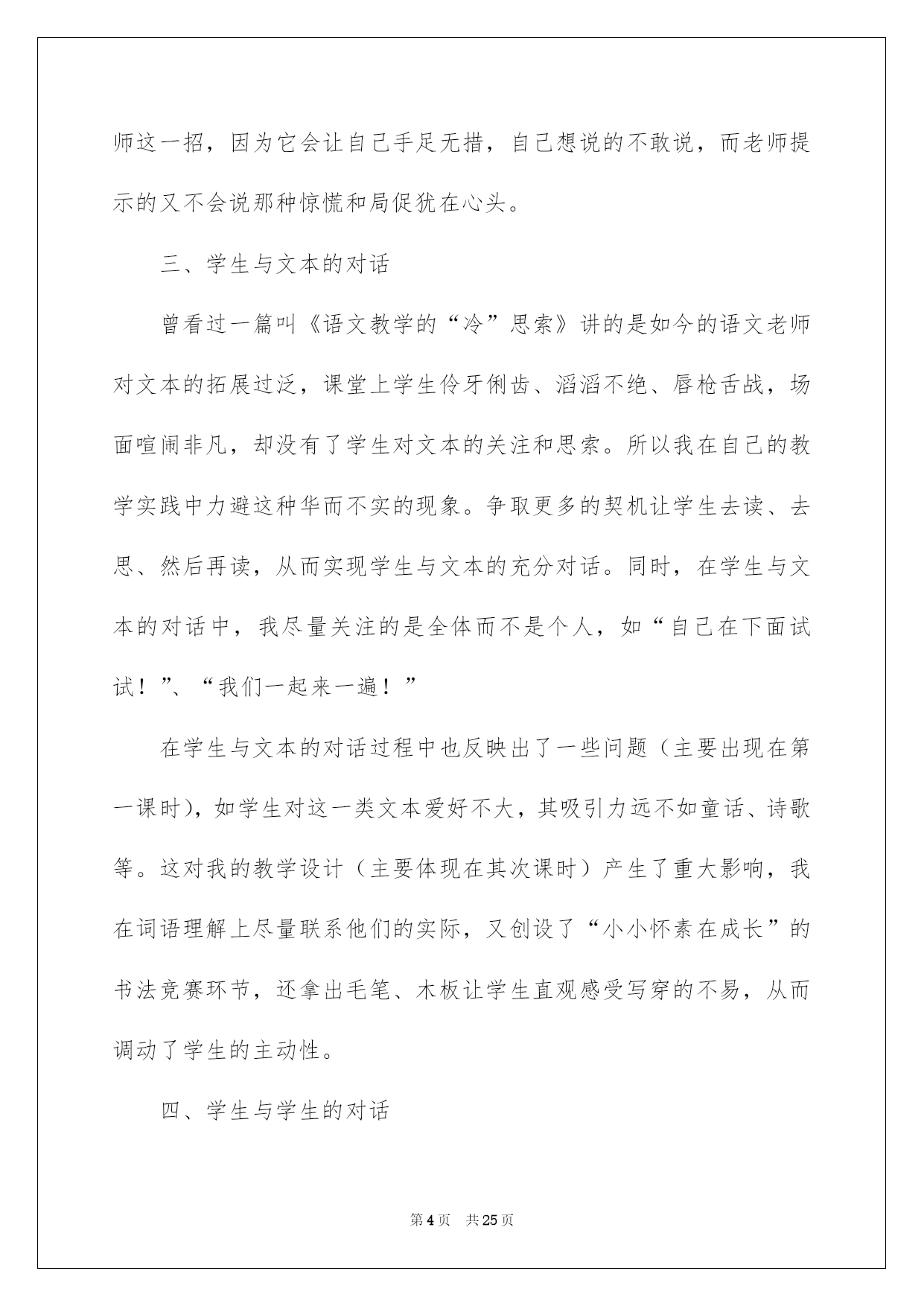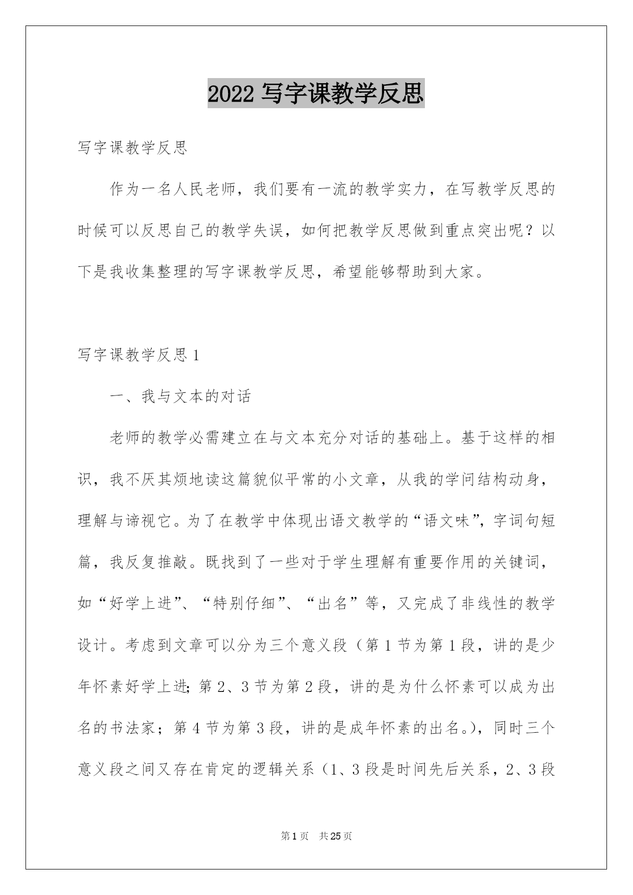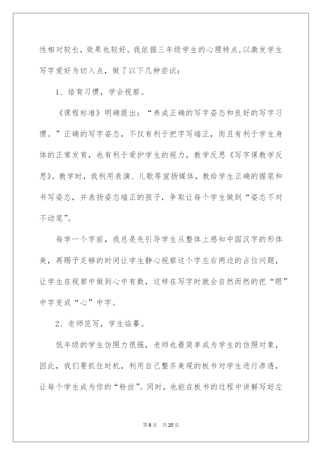 第PAGE\*Arabic\*MERGEFORMAT25页共NUMPAGES\*Arabic\*MERGEFORMAT25页第PAGE\*MERGEFORMAT25页共NUMPAGES\*MERGEFORMAT25页第PAGE\*MERGEFORMAT25页共NUMPAGES\*MERGEFORMAT25页第PAGE\*MERGEFORMAT25页共NUMPAGES\*MERGEFORMAT25页第PAGE\*MERGEFORMAT25页共NUMPAGES\*MERGEFORMAT25页第PAGE\*MERGEFORMAT25页共NUMPAGES\*MERGEFORMAT25页第PAGE\*MERGEFORMAT25页共NUMPAGES\*MERGEFORMAT25页第PAGE\*MERGEFORMAT25页共NUMPAGES\*MERGEFORMAT25页第PAGE\*MERGEFORMAT25页共NUMPAGES\*MERGEFORMAT25页第PAGE\*MERGEFORMAT25页共NUMPAGES\*MERGEFORMAT25页第PAGE\*MERGEFORMAT25页共NUMPAGES\*MERGEFORMAT25页2022写字课教学反思写字课教学反思作为一名人民老师,我们要有一流的教学实力,在写教学反思的时候可以反思自己的教学失误,如何把教学反思做到重点突出呢?以下是我收集整理的写字课教学反思,希望能够帮助到大家。写字课教学反思1一、我与文本的对话老师的教学必需建立在与文本充分对话的基础上。基于这样的相识,我不厌其烦地读这篇貌似平常的小文章,从我的学问结构动身,理解与谛视它。为了在教学中体现出语文教学的“语文味”,字词句短篇,我反复推敲。既找到了一些对于学生理解有重要作用的关键词,如“好学上进”、“特别仔细”、“出名”等,又完成了非线性的教学设计。考虑到文章可以分为三个意义段(第1节为第1段,讲的是少年怀素好学上进;第2、3节为第2段,讲的是为什么怀素可以成为出名的书法家;第4节为第3段,讲的是成年怀素的出名。),同时三个意义段之间又存在肯定的逻辑关系(1、3段是时间先后关系,2、3段是因果关系,第2段中的2、3小节又是并列关系),因此我的教学流程是这样支配的:从第1节跳到第4节,再教2、3节,对于2、3节的教学先后依次由学生来定,学生先提及哪一节就先教哪一节。为了在教学中体现出语文教学的人文性,我又找到了一些拓展点,如对“好学上进”“出名”的理解、让学生自由畅谈、书法竞赛等,促进了学生对文章深层次的相识和体会。假如以上是对教材的理解,下面就是对教材的谛视了。在课文中有这样一句特别重要的话:“他总是先看清字的形态,记住字的笔顺,再一笔一画照着写。”明明是三个步骤,作者用的却是“先……,再……”这样一组关联词。这很简单对学生造成一种误导,尤其是对事物缺乏本质相识的一年级学生而言。当时我一心想着作者有多不应当,以及如何把教材改过来,所以在“怎么教”的问题上处理得过于草率了。我基于学生的认知实力,设计了“他先,记住,再。”的填空。明显,这从语言文字的角度看是多么地非驴非马。倘如当时能从文本创生的角度好好想想,设计出“他先,(然后)记住,再。”的填空,那该多好啊!二、我与学生的对话许多大教化家都提倡在教学中建立民主同等、和谐融洽的师生关系。在我看来,师生之间良好的心理氛围是实现师生有效对话的重要条件,因此我也在教学中努力地实践这一点。首先我尽量通过自己的肢体语言拉近与学生之间的距离,如微笑、点头以及在学生答错时善意的夸张表情等。其次对于学生的回答我尽量用激励性的评价语,如“真不错!”“太厉害了!”“(字)真美丽!”“来,老师和你握个手。”等。对于学生不太好的回答,我也能赐予确定,同时加以正确的导向,如“能说得更生动些吗?”“能说得更详细些吗?”再次能把自己放在与学生同一水平处,话语中常用“我们”,如“让我们一起来一遍!”“让我们一起来试一试!”“我来当大家的开头炮!”假如说良好的师生关系是师生有效对话的第一个重要,还有两个条件也不容忽视的。一是老师对教材、教学设了然于心。只有超脱了文本以及设计对你的束缚,老师才会听清学生的话,才可以与学生对话。二是老师应具备相当的教学应变机灵。在这一点上我还是比较缺乏的,从某种程度上讲,有些担忧学生的回答出差、出错,胆怯课堂上出现我应付不了的局面。因此在教学中几次出现了“递词”现象,如理解“好学上进”一词时。想象当年自己当学生时就特别胆怯老师这一招,因为它会让自己手足无措,自己想说的不敢说,而老师提示的又不会说那种惊慌和局促犹在