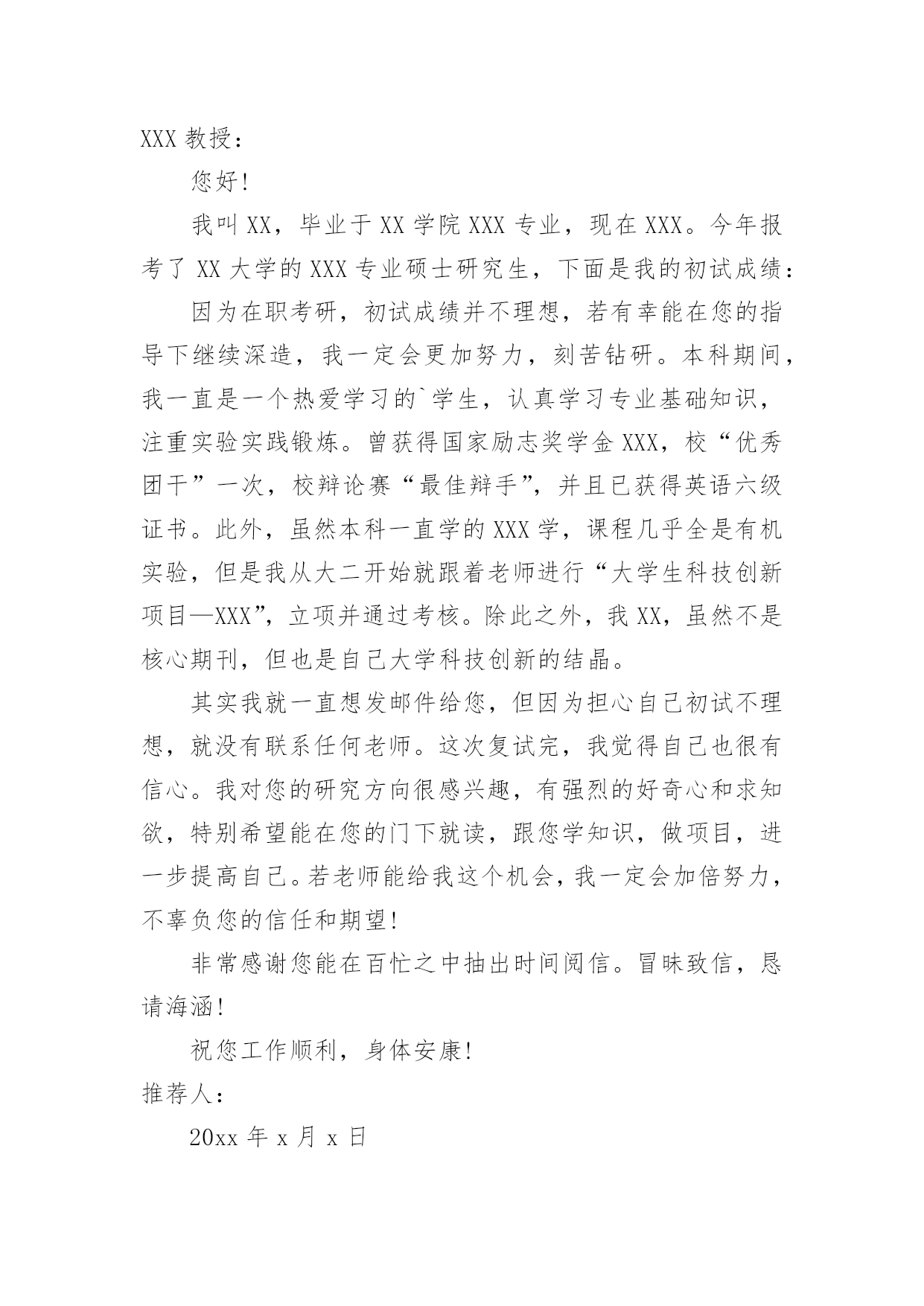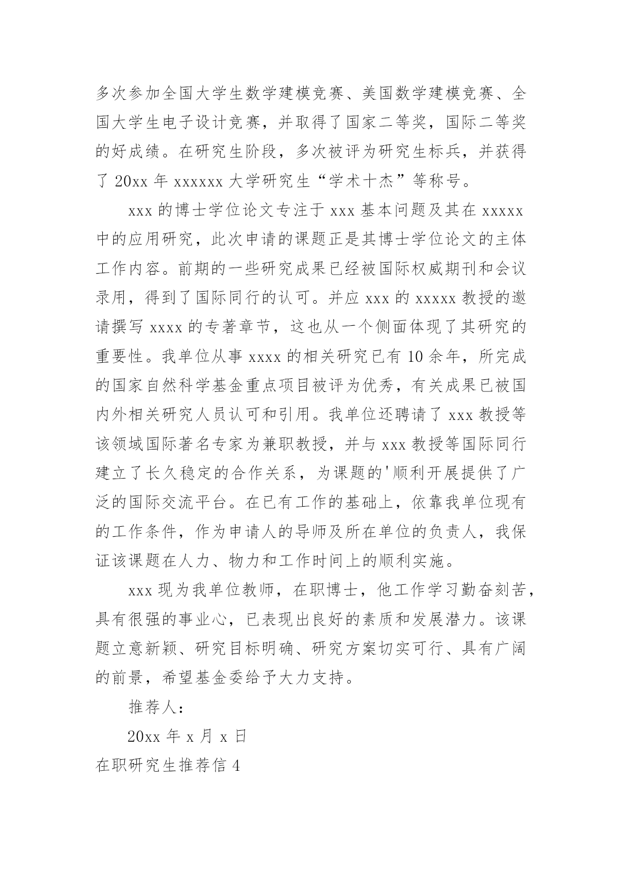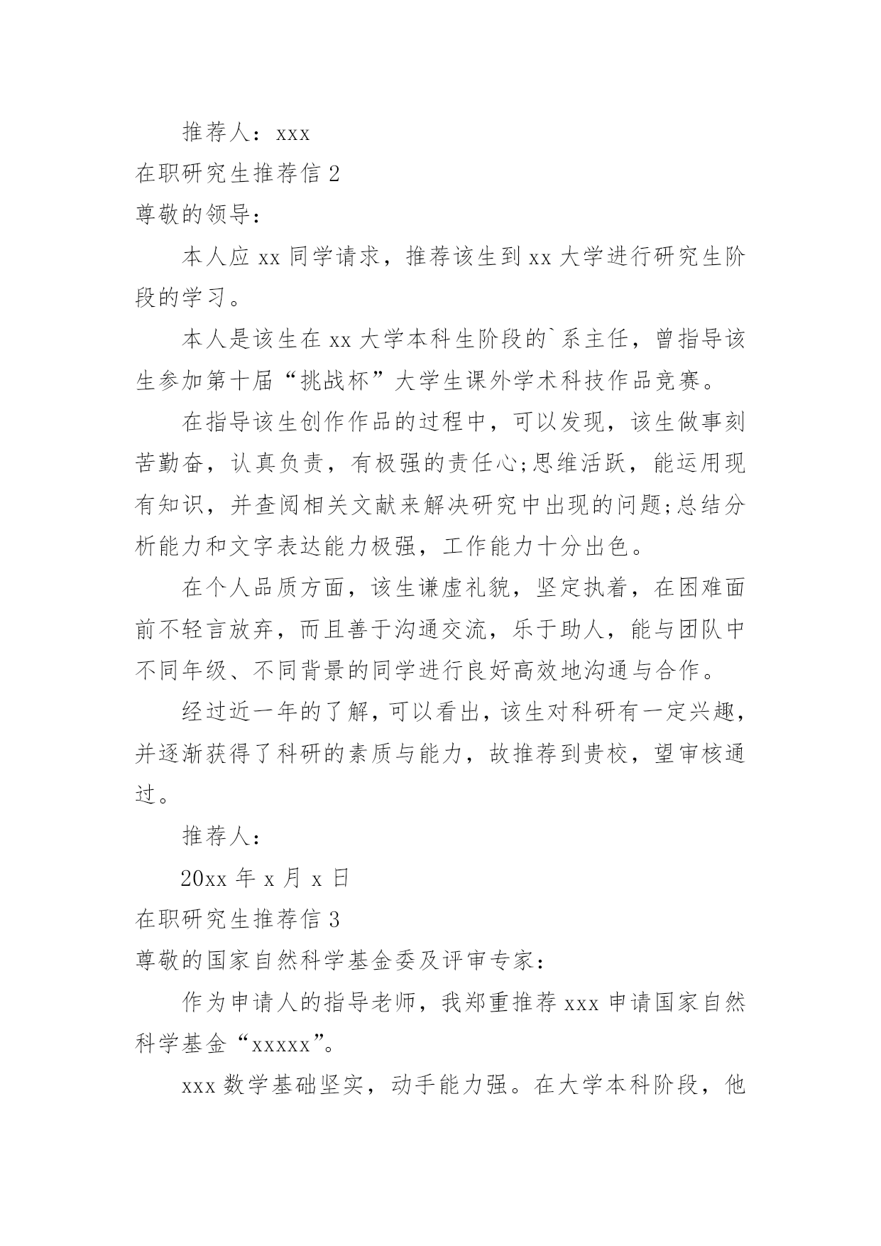在职研究生推荐信在职研究生推荐信在学习、工作生活中,推荐信的使用频率越来越高,推荐信也有着不同的类型。为了让您在写推荐信中更加简单方便,以下是小编为大家收集的在职研究生推荐信,仅供参考,大家一起来看看吧。在职研究生推荐信1尊敬的领导:某某同学是我所任教的“xxxx”的`学生。他每次上课时都在前排认真学习,与老师互动,学习的主动性和深入性,这点我非常欣赏。作为一名本科生,他没有满足于所学的基础知识,较早的进入实验室了解实验室的基本操作及实验方案。有良好的学习能力和学习习惯。在专业实习中,也虚心认真,表现突出。该生英语能力好,能适应以后阅读写作英语文献,良好的英语运用能力将服务于他以后的研究生学习。该生各方面全面,大学期间参加了学院的学生工作任学生会某部负责人同时参加各项活动比赛,获得了很多奖励。某某同学严格要求自己,基础扎实,对化学学科特别是高分子材料学科有浓厚的兴趣,故推荐到贵校,希望贵校审核通过。推荐人:xxx在职研究生推荐信2尊敬的领导:本人应xx同学请求,推荐该生到xx大学进行研究生阶段的学习。本人是该生在xx大学本科生阶段的`系主任,曾指导该生参加第十届“挑战杯”大学生课外学术科技作品竞赛。在指导该生创作作品的过程中,可以发现,该生做事刻苦勤奋,认真负责,有极强的责任心;思维活跃,能运用现有知识,并查阅相关文献来解决研究中出现的问题;总结分析能力和文字表达能力极强,工作能力十分出色。在个人品质方面,该生谦虚礼貌,坚定执着,在困难面前不轻言放弃,而且善于沟通交流,乐于助人,能与团队中不同年级、不同背景的同学进行良好高效地沟通与合作。经过近一年的了解,可以看出,该生对科研有一定兴趣,并逐渐获得了科研的素质与能力,故推荐到贵校,望审核通过。推荐人:20xx年x月x日在职研究生推荐信3尊敬的国家自然科学基金委及评审专家:作为申请人的指导老师,我郑重推荐xxx申请国家自然科学基金“xxxxx”。xxx数学基础坚实,动手能力强。在大学本科阶段,他多次参加全国大学生数学建模竞赛、美国数学建模竞赛、全国大学生电子设计竞赛,并取得了国家二等奖,国际二等奖的好成绩。在研究生阶段,多次被评为研究生标兵,并获得了20xx年xxxxxx大学研究生“学术十杰”等称号。xxx的博士学位论文专注于xxx基本问题及其在xxxxx中的应用研究,此次申请的课题正是其博士学位论文的主体工作内容。前期的一些研究成果已经被国际权威期刊和会议录用,得到了国际同行的认可。并应xxx的xxxxx教授的邀请撰写xxxx的专著章节,这也从一个侧面体现了其研究的重要性。我单位从事xxxx的相关研究已有10余年,所完成的国家自然科学基金重点项目被评为优秀,有关成果已被国内外相关研究人员认可和引用。我单位还聘请了xxx教授等该领域国际著名专家为兼职教授,并与xxx教授等国际同行建立了长久稳定的合作关系,为课题的'顺利开展提供了广泛的国际交流平台。在已有工作的基础上,依靠我单位现有的工作条件,作为申请人的导师及所在单位的负责人,我保证该课题在人力、物力和工作时间上的顺利实施。xxx现为我单位教师,在职博士,他工作学习勤奋刻苦,具有很强的事业心,已表现出良好的素质和发展潜力。该课题立意新颖、研究目标明确、研究方案切实可行、具有广阔的前景,希望基金委给予大力支持。推荐人:20xx年x月x日在职研究生推荐信4XXX教授:您好!我叫XX,毕业于XX学院XXX专业,现在XXX。今年报考了XX大学的XXX专业硕士研究生,下面是我的初试成绩:因为在职考研,初试成绩并不理想,若有幸能在您的指导下继续深造,我一定会更加努力,刻苦钻研。本科期间,我一直是一个热爱学习的`学生,认真学习专业基础知识,注重实验实践锻炼。曾获得国家励志奖学金XXX,校“优秀团干”一次,校辩论赛“最佳辩手”,并且已获得英语六级证书。此外,虽然本科一直学的XXX学,课程几乎全是有机实验,但是我从大二开始就跟着老师进行“大学生科技创新项目—XXX”,立项并通过考核。除此之外,我XX,虽然不是核心期刊,但也是自己大学科技创新的结晶。其实我就一直想发邮件给您,但因为担心自己初试不理想,就没有联系任何老师。这次复试完,我觉得自己也很有信心。我对您的研究方向很感兴趣,有强烈的好奇心和求知欲,特别希望能在您的门下就读,跟您学知识,做项目,进一步提高自己。若老师能给我这个机会,我一定会加倍努力,不辜负您的信任和期望!非常感谢您能在百忙之中抽出时间阅信。冒昧致信,恳请海涵!祝您工作顺利,身体安康!推荐人:20xx年x月x日