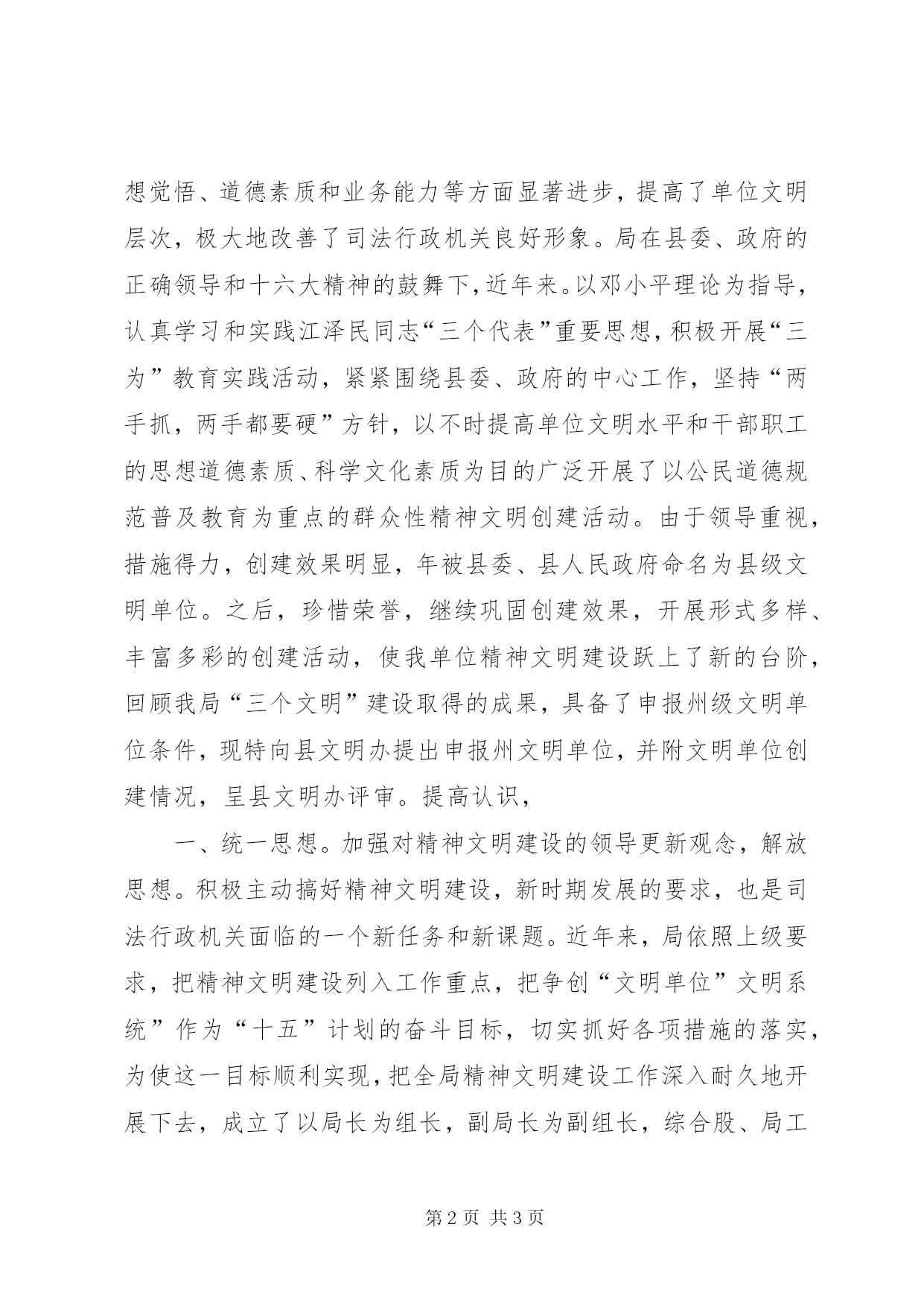 第PAGE\*Arabic\*MERGEFORMAT3页共NUMPAGES\*MERGEFORMAT3页司法局创明单位申请材料认真贯彻实施精神文明建设工程,全局依照文明单位管理方法的有关规定。全局上下积极开展维护国家利益主义、集体主义、社会主义,人生观、世界观、价值观和社会公德、职业道德、家庭美德的三义”三观”三德”教育活动,专门到麻栗坡接受维护国家利益主义教育,邀请了县委党校讲师专门授课。不时提高对创建“文明单位”重要意义的认识,使全体干警能够依照创建规范和要求自觉规范自己的言行。组织开展了三个代表”世贸知识和十六大报告的学习活动,观看了孔》成警示录》等优秀影片,学习了等先进事迹,同时在重点服务窗口律师事务所、法律服务所和公证处开展了年度执业执纪教育评查活动,开展行风评议,不时提高职业道德和执业纪律,做到文明服务,有效地提升了服务水平。今年开展的坚持共产党员先进性教育活动中,局紧紧抓住“三个代表”重要思想这条主线,掌握先进性这个主题,认真组织学习,开展交流讨论,认真剖析,开展批评与自我批评,不时提高队伍整体素质,增强队伍发明力、凝聚力和战斗力,今年3月,局还以“革除生活陋习,建议文明新风”为主题开展了文明礼貌月”活动,活动以“怎样树立司法行政机关良好形象”为专题从有利团结、组织纪律、奉献精神和工作生活作风等方面展开讨论,开展了讲服务用语、讲服务态度、讲服务质量的三讲”活动。通过学习教育,进一步转变了机关作风,增进了团结,思想觉悟、道德素质和业务能力等方面显著进步,提高了单位文明层次,极大地改善了司法行政机关良好形象。局在县委、政府的正确领导和十六大精神的鼓舞下,近年来。以邓小平理论为指导,认真学习和实践江泽民同志“三个代表”重要思想,积极开展“三为”教育实践活动,紧紧围绕县委、政府的中心工作,坚持“两手抓,两手都要硬”方针,以不时提高单位文明水平和干部职工的思想道德素质、科学文化素质为目的广泛开展了以公民道德规范普及教育为重点的群众性精神文明创建活动。由于领导重视,措施得力,创建效果明显,年被县委、县人民政府命名为县级文明单位。之后,珍惜荣誉,继续巩固创建效果,开展形式多样、丰富多彩的创建活动,使我单位精神文明建设跃上了新的台阶,回顾我局“三个文明”建设取得的成果,具备了申报州级文明单位条件,现特向县文明办提出申报州文明单位,并附文明单位创建情况,呈县文明办评审。提高认识,一、统一思想。加强对精神文明建设的领导更新观念,解放思想。积极主动搞好精神文明建设,新时期发展的要求,也是司法行政机关面临的一个新任务和新课题。近年来,局依照上级要求,把精神文明建设列入工作重点,把争创“文明单位”文明系统”作为“十五”计划的奋斗目标,切实抓好各项措施的落实,为使这一目标顺利实现,把全局精神文明建设工作深入耐久地开展下去,成立了以局长为组长,副局长为副组长,综合股、局工会、团支部,宣传股、公证处、律师事务所等股室负责人为成员的精神文明建设工作领导小组及办公室。负责对全局精神文明建设的领导和组织开展,领导小组成立后,组织学习了公民道德建设实施纲要》和州委、县委、上级业务部门有关精神文明建设文件精神,进一步统一了思想,提高了认识,为搞好全局精神文明建设奠定了基础。扎实开展理论学习和思想道德教育二、围绕精神文明建设工程。