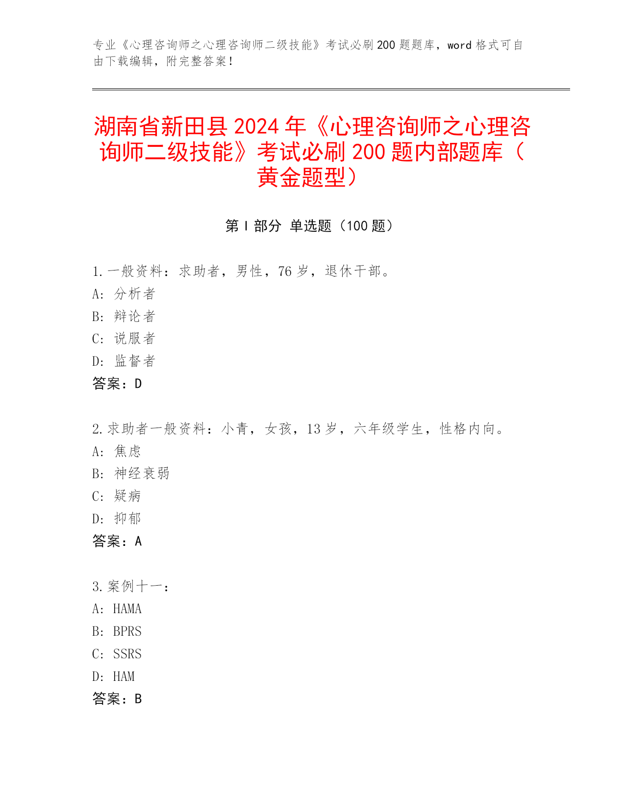 湖南省新田县2024年《心理咨询师之心理咨询师二级技能》考试必刷200题内部题库(黄金题型)