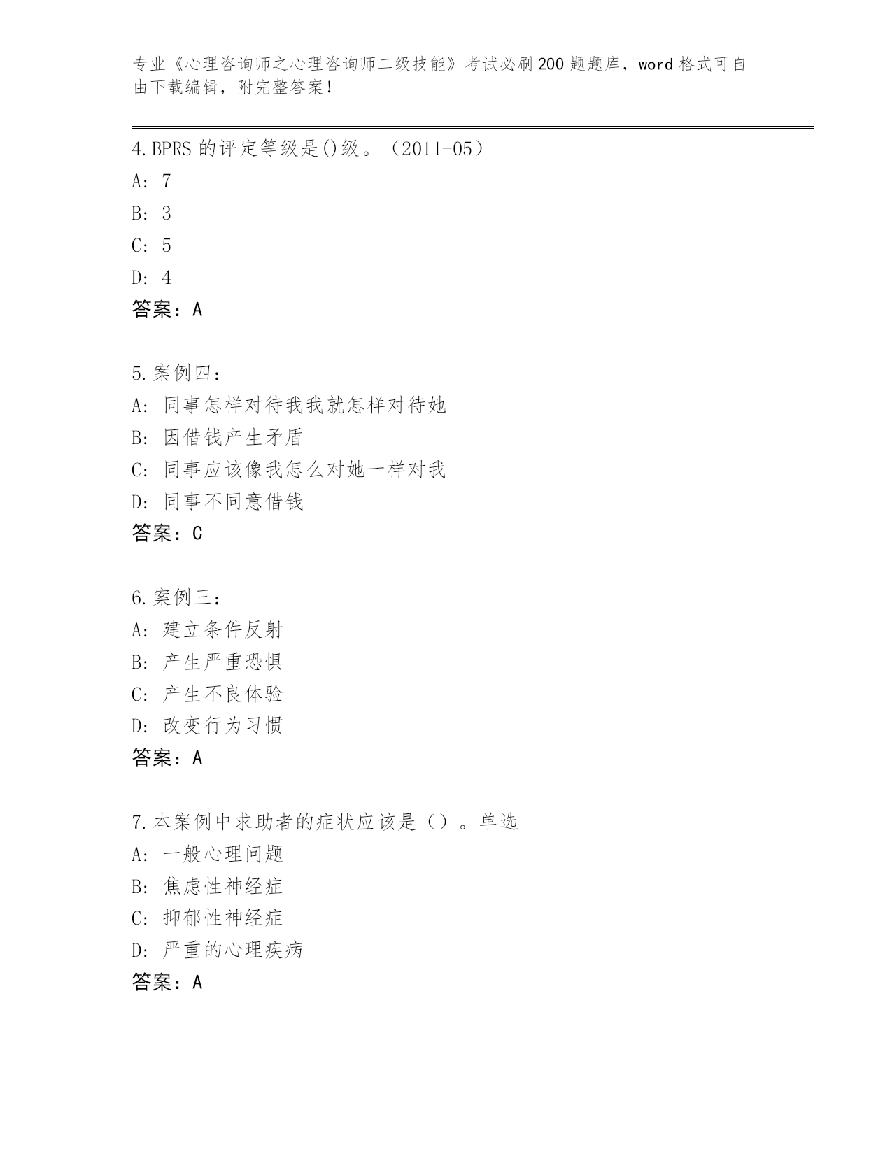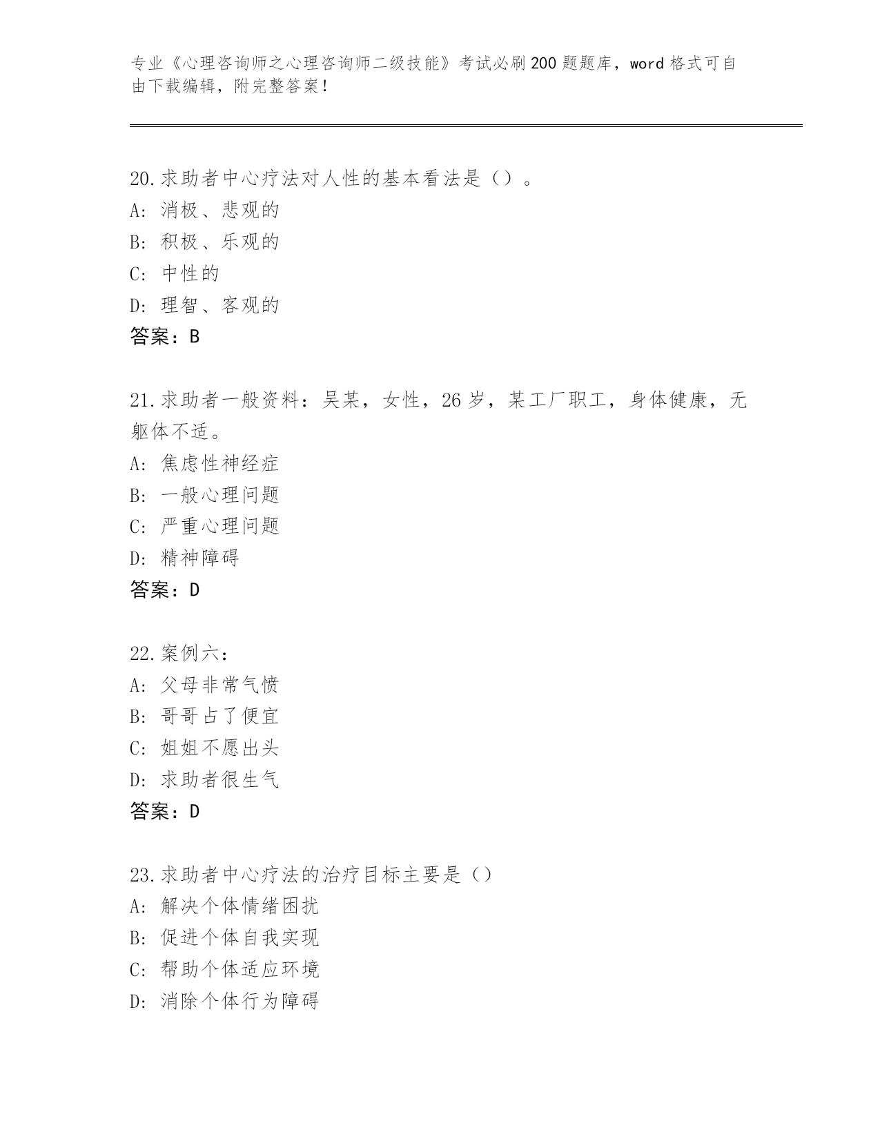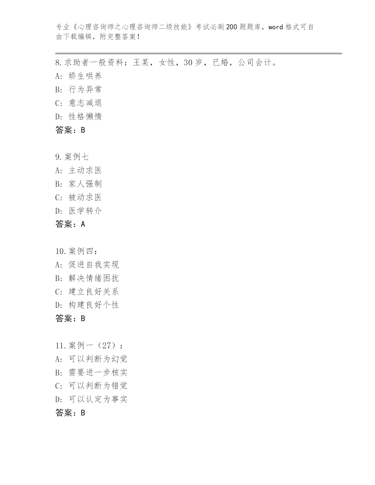 湖南省北塔区内部使用《心理咨询师之心理咨询师二级技能》考试必考200题内部题库(黄金题型)