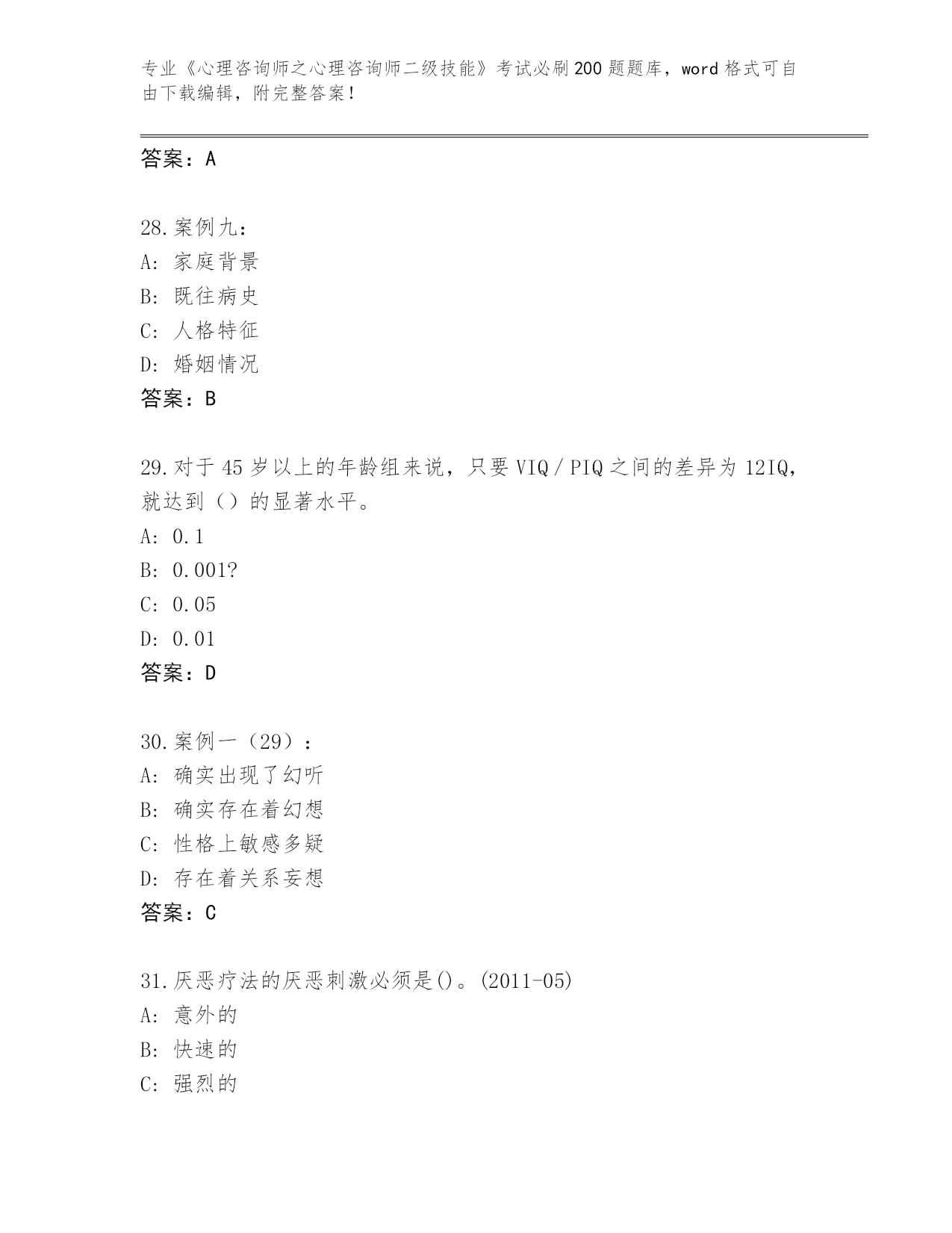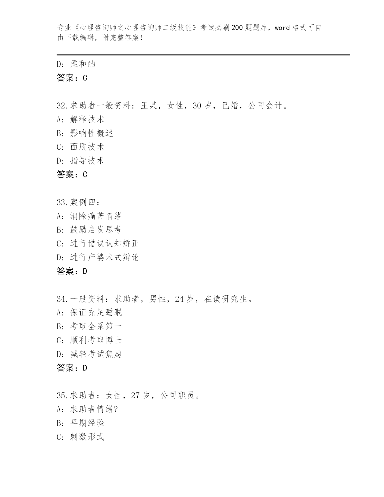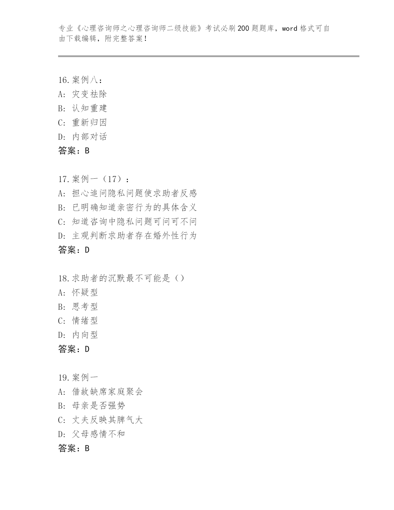 湖南省北塔区内部使用《心理咨询师之心理咨询师二级技能》考试必考200题内部题库(黄金题型)