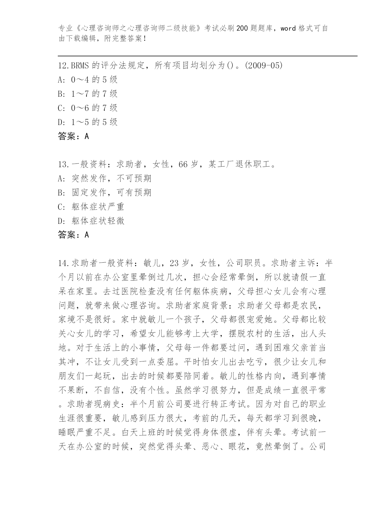 内部使用湖南省耒阳市《心理咨询师之心理咨询师二级技能》考试必刷200题(黄金题型)