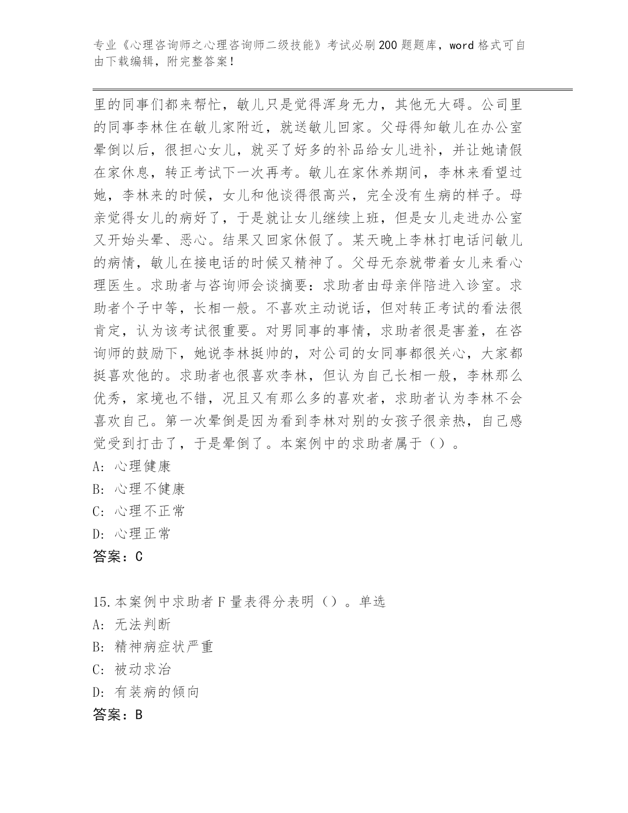 湖南省《心理咨询师之心理咨询师二级技能》考试必刷200题题库(满分必刷)