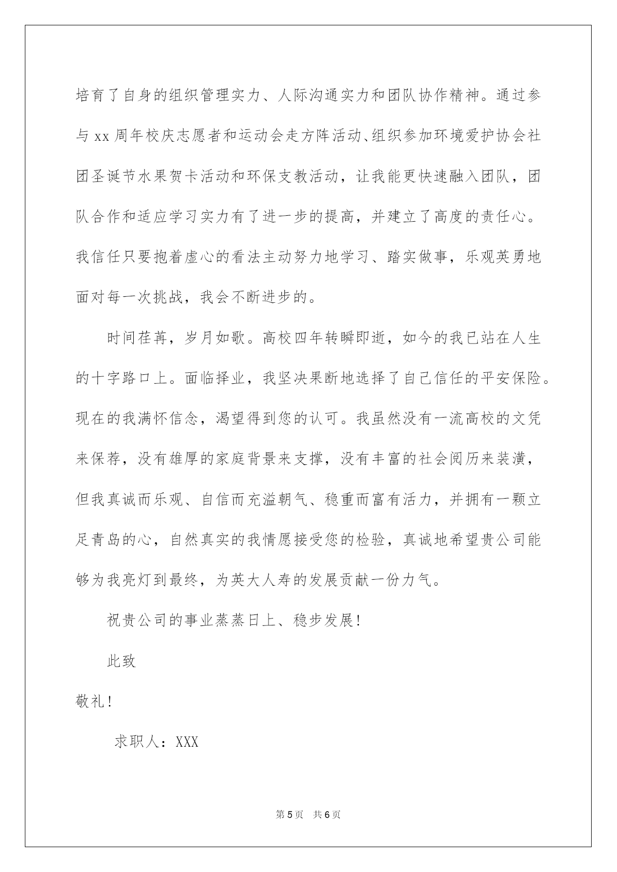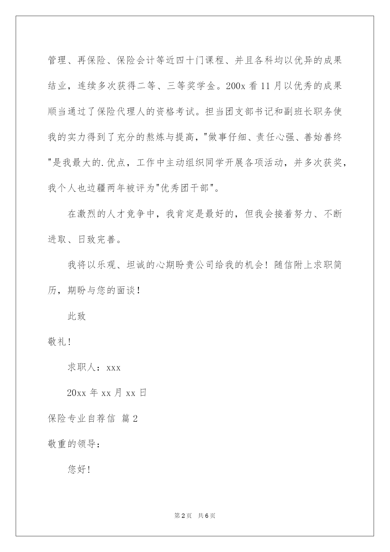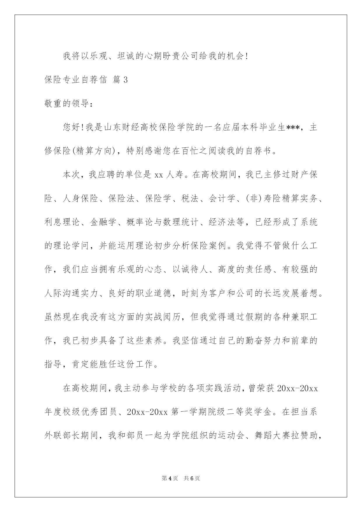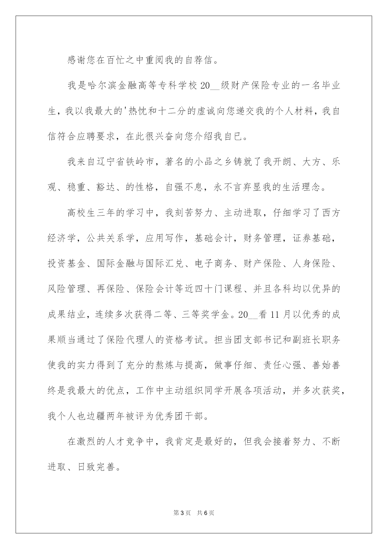 第PAGE\*Arabic\*MERGEFORMAT6页共NUMPAGES\*Arabic\*MERGEFORMAT6页第PAGE\*MERGEFORMAT6页共NUMPAGES\*MERGEFORMAT6页第PAGE\*MERGEFORMAT6页共NUMPAGES\*MERGEFORMAT6页第PAGE\*MERGEFORMAT6页共NUMPAGES\*MERGEFORMAT6页第PAGE\*MERGEFORMAT6页共NUMPAGES\*MERGEFORMAT6页第PAGE\*MERGEFORMAT6页共NUMPAGES\*MERGEFORMAT6页第PAGE\*MERGEFORMAT6页共NUMPAGES\*MERGEFORMAT6页第PAGE\*MERGEFORMAT6页共NUMPAGES\*MERGEFORMAT6页第PAGE\*MERGEFORMAT6页共NUMPAGES\*MERGEFORMAT6页第PAGE\*MERGEFORMAT6页共NUMPAGES\*MERGEFORMAT6页第PAGE\*MERGEFORMAT6页共NUMPAGES\*MERGEFORMAT6页2022保险专业自荐信关于保险专业自荐信三篇在当今中国社会,我们越来越常常运用自荐信,我们在写自荐信的时候可以留意一些写作要诀。你还不会写自荐信吗?以下是我帮大家整理的保险专业自荐信3篇,仅供参考,大家一起来看看吧。保险专业自荐信篇1敬重的领导:您好!感谢您在百忙之中阅读我的自荐信。我是哈尔滨金融高等专科学校xx级保险专业的一名毕业生,我以我最大的热忱和十二分的虚诚向您递交我的个人材料,我自信符合应聘要求,在此很兴奋向您作一个简洁的自我介绍。我来自辽宁省铁岭市,著名的“小品之乡”铸就了我开朗、大方、乐观、稳重、豁达、的性格,"自强不息,永不言弃"显我的生活理念。高校生三年的学习中,我刻苦努力、主动进取,仔细学习了西方经济学,公共关系学,应用写作,基础会计,财务管理,证券基础,投资基金、国际金融与国际汇兑、电子商务、财产保险、人身保险、风险管理、再保险、保险会计等近四十门课程、并且各科均以优异的成果结业,连续多次获得二等、三等奖学金。200x看11月以优秀的成果顺当通过了保险代理人的资格考试。担当团支部书记和副班长职务使我的实力得到了充分的熬炼与提高,"做事仔细、责任心强、善始善终"是我最大的.优点,工作中主动组织同学开展各项活动,并多次获奖,我个人也边疆两年被评为"优秀团干部"。在激烈的人才竞争中,我肯定是最好的,但我会接着努力、不断进取、日致完善。我将以乐观、坦诚的心期盼贵公司给我的机会!随信附上求职简历,期盼与您的面谈!此致敬礼!求职人:xxx20xx年xx月xx日保险专业自荐信篇2敬重的领导:您好!感谢您在百忙之中重阅我的自荐信。我是哈尔滨金融高等专科学校20__级财产保险专业的一名毕业生,我以我最大的'热忱和十二分的虚诚向您递交我的个人材料,我自信符合应聘要求,在此很兴奋向您介绍我自已。我来自辽宁省铁岭市,著名的小品之乡铸就了我开朗、大方、乐观、稳重、豁达、的性格,自强不息,永不言弃显我的生活理念。高校生三年的学习中,我刻苦努力、主动进取,仔细学习了西方经济学,公共关系学,应用写作,基础会计,财务管理,证券基础,投资基金、国际金融与国际汇兑、电子商务、财产保险、人身保险、风险管理、再保险、保险会计等近四十门课程、并且各科均以优异的成果结业,连续多次获得二等、三等奖学金。20__看11月以优秀的成果顺当通过了保险代理人的资格考试。担当团支部书记和副班长职务使我的实力得到了充分的熬炼与提高,做事仔细、责任心强、善始善终是我最大的优点,工作中主动组织同学开展各项活动,并多次获奖,我个人也边疆两年被评为优秀团干部。在激烈的人才竞争中,我肯定是最好的,但我会接着努力、不断进取、日致完善。我将以乐观、坦诚的心期盼贵公司给我的机会!保险专业自荐信篇3敬重的领导:您好!我是山东财经高校保险学院的一名应届本科毕业生***,主修保险(精算方向),特别感谢您在百忙之阅读我的自荐书。本次,我应聘的单位是xx人寿。在高校期间,我已主修过财产保险、人身保险、保险法、保险学、税法、会计学、(非)寿险精算实务、利息理论、金融学、概率论与数理统计、经济法等,已经形成了系统的理论学问,并能运用理论初步分析保险案例。我觉得不管做什么工作,我们应当拥有乐观的心态、以诚待人、高度的责任感、有较强的人际沟通实力、良好的职业道德,时刻为客户和公司的长远发展着想。虽然现在我没有这方面的实战阅历,但我觉得通过假期的各种兼职工作,我已