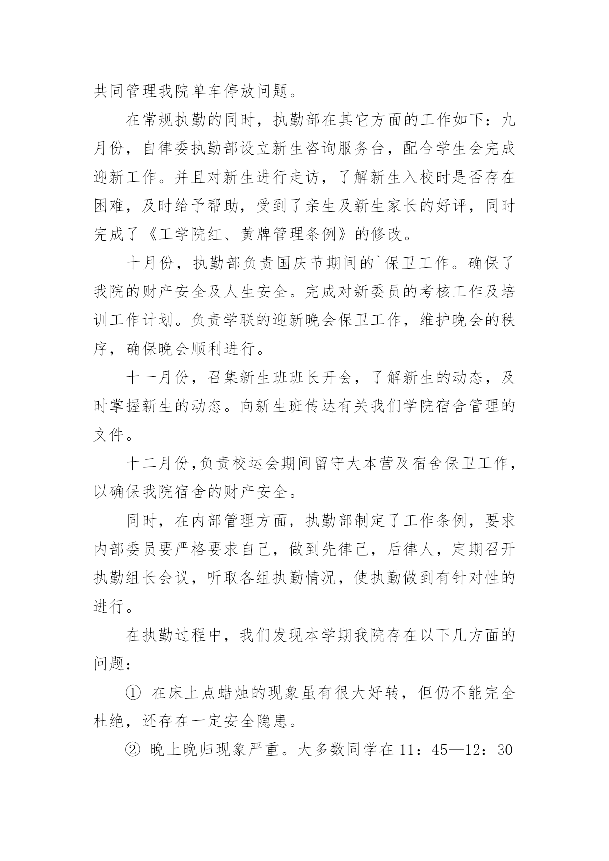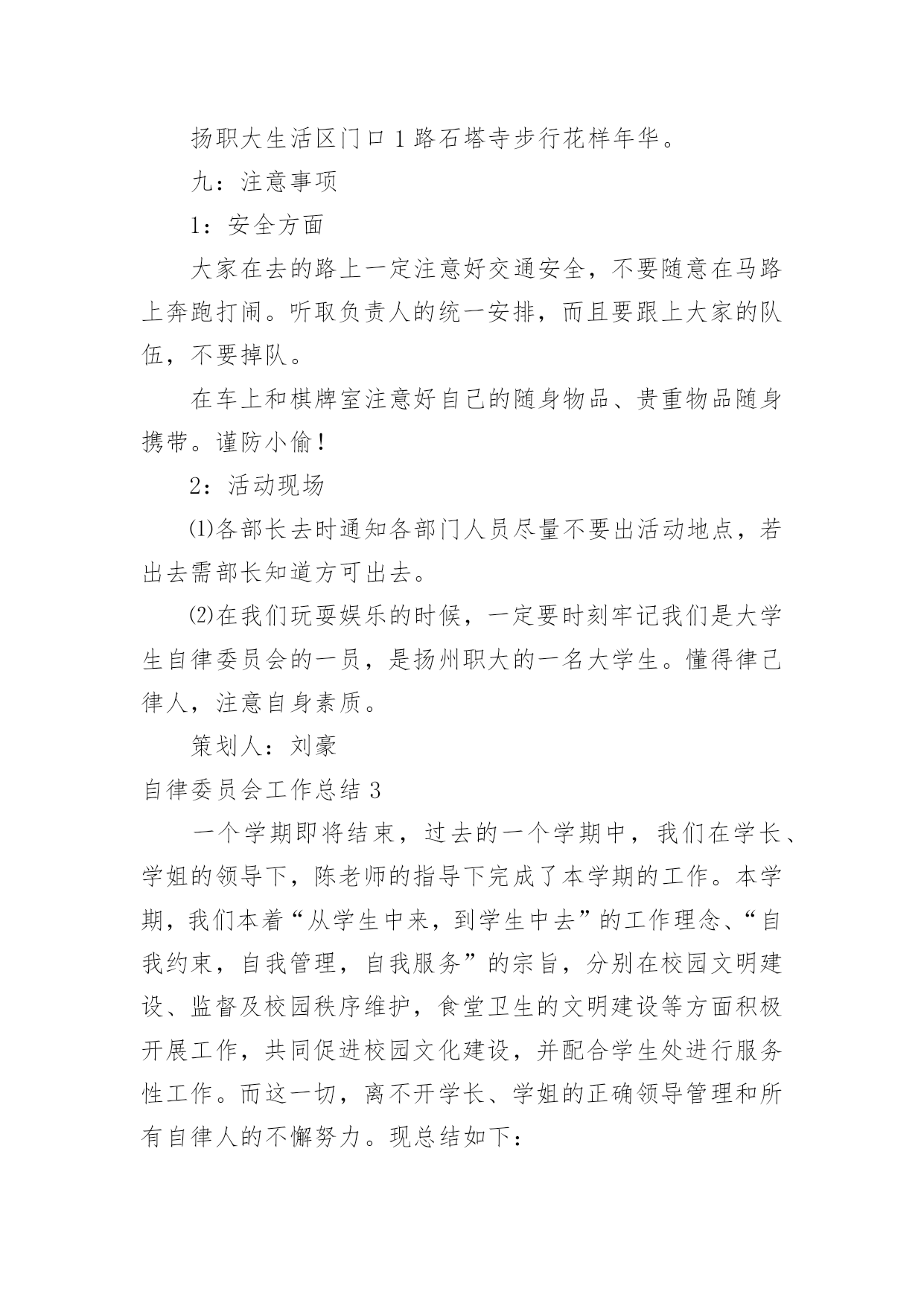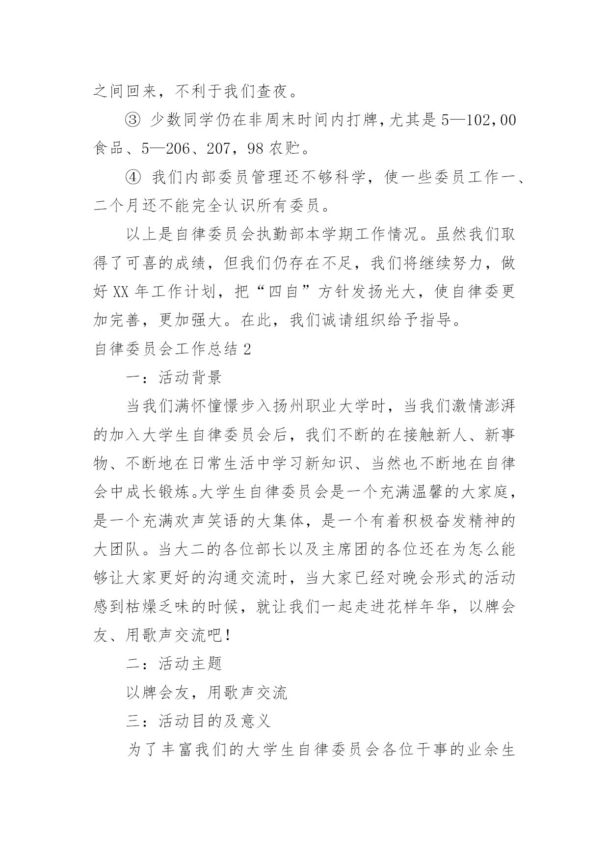 自律委员会工作总结自律委员会工作总结总结是指社会团体、企业单位和个人在自身的某一时期、某一项目或某些工作告一段落或者全部完成后进行回顾检查、分析评价,从而肯定成绩,得到经验,找出差距,得出教训和一些规律性认识的一种书面材料,通过它可以正确认识以往学习和工作中的优缺点,让我们一起来学习写总结吧。那么总结应该包括什么内容呢?下面是小编为大家收集的自律委员会工作总结,仅供参考,欢迎大家阅读。自律委员会工作总结1“不以规矩,无以成方圆”作为两院的自律人,在斑斓多姿的大学生活,我们有为同学服务的热情,有积极奋进之胆魄,有坚守人格的执着。我们敢于面对生活与学习的挑战。下面,我就对我的执勤工作总结一番,谢谢大家指导。时间如逝,转眼间一学期即将结束,在这时刻,我将代表工学院学生自律委员会执勤部进行工作总结。执勤部主要负责对宿舍区纪律的监督与检查,引导同学们自律成才,本学期执勤重点放在安全引患与作息两方面。安全隐患重点主要是在床上点蜡烛,夜不归宿,作息主要是阻止同学在归定的休息时间内大声喧哗,搞娱乐活动(如打牌、弹吉它、下棋等)。另外,执勤部还与学管科取得联系,共同管理我院单车停放问题。在常规执勤的同时,执勤部在其它方面的工作如下:九月份,自律委执勤部设立新生咨询服务台,配合学生会完成迎新工作。并且对新生进行走访,了解新生入校时是否存在困难,及时给予帮助,受到了亲生及新生家长的好评,同时完成了《工学院红、黄牌管理条例》的修改。十月份,执勤部负责国庆节期间的`保卫工作。确保了我院的财产安全及人生安全。完成对新委员的考核工作及培训工作计划。负责学联的迎新晚会保卫工作,维护晚会的秩序,确保晚会顺利进行。十一月份,召集新生班班长开会,了解新生的动态,及时掌握新生的动态。向新生班传达有关我们学院宿舍管理的文件。十二月份,负责校运会期间留守大本营及宿舍保卫工作,以确保我院宿舍的财产安全。同时,在内部管理方面,执勤部制定了工作条例,要求内部委员要严格要求自己,做到先律己,后律人,定期召开执勤组长会议,听取各组执勤情况,使执勤做到有针对性的进行。在执勤过程中,我们发现本学期我院存在以下几方面的问题:①在床上点蜡烛的现象虽有很大好转,但仍不能完全杜绝,还存在一定安全隐患。②晚上晚归现象严重。大多数同学在11:45—12:30之间回来,不利于我们查夜。③少数同学仍在非周末时间内打牌,尤其是5—102,00食品、5—206、207,98农贮。④我们内部委员管理还不够科学,使一些委员工作一、二个月还不能完全认识所有委员。以上是自律委员会执勤部本学期工作情况。虽然我们取得了可喜的成绩,但我们仍存在不足,我们将继续努力,做好XX年工作计划,把“四自”方针发扬光大,使自律委更加完善,更加强大。在此,我们诚请组织给予指导。自律委员会工作总结2一:活动背景当我们满怀憧憬步入扬州职业大学时,当我们激情澎湃的加入大学生自律委员会后,我们不断的在接触新人、新事物、不断地在日常生活中学习新知识、当然也不断地在自律会中成长锻炼。大学生自律委员会是一个充满温馨的大家庭,是一个充满欢声笑语的大集体,是一个有着积极奋发精神的大团队。当大二的各位部长以及主席团的各位还在为怎么能够让大家更好的沟通交流时,当大家已经对晚会形式的活动感到枯燥乏味的时候,就让我们一起走进花样年华,以牌会友、用歌声交流吧!二:活动主题以牌会友,用歌声交流三:活动目的及意义为了丰富我们的大学生自律委员会各位干事的业余生活,更好的增强部门之间的沟通与交流,使自律会的各个部门里的干事不再仅仅的局限于自己的小天地里而是积极地与其他部门的'干事开怀畅饮,增强干事之间的沟通与交流,使每一位干事对我们大学生自律委员会有更深一步的了解认识,方便大家以后再自律会的工作,扩大各位干事的交际范围与朋友圈,让大家在自律会的工作生活中不会感到孤单,快快乐乐的在自律会中工作。所以特想举办一次以牌会友、用歌声交流的休闲娱乐活动。四:活动对象大学生自律委员会全体干事及干部五:活动地点与时间扬州花样年华(棋牌室)5月26日周六下午12点—6点(具体时间由主席团商定)地点简介:经本人调查此红棋牌室环境优雅,适合大家休闲娱乐。大家可以在品茶的同时并一同与大家娱乐,并且在那儿还会送一间KTV大包间,这样一来大家玩的可以更尽兴。六:活动流程:1:自律会召开部长会议,商议此次活动的可实施时间,并由主席团确定活动的开展时间。2:由艺联部的许网金、刘豪负责去此棋牌室洽谈关于我们自律会的活动的有关事项,争取有更大的优惠,以方便大家。3:自律会各部门部长就此次活动对本部门大一干事进行宣传,争取大一干事有个高的出席率,使此次活动能够达到它的目的与效果。4:各个部门由部长或部长委派人员将会参加本次活动人员数以及个人费用交于秘书处秘书长手中。5:自律会秘书处负责去买扑克牌。