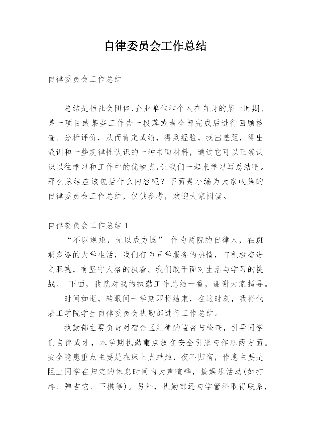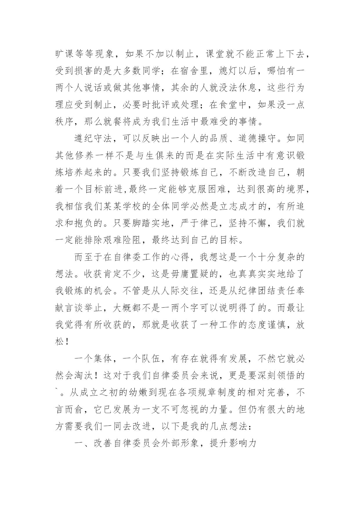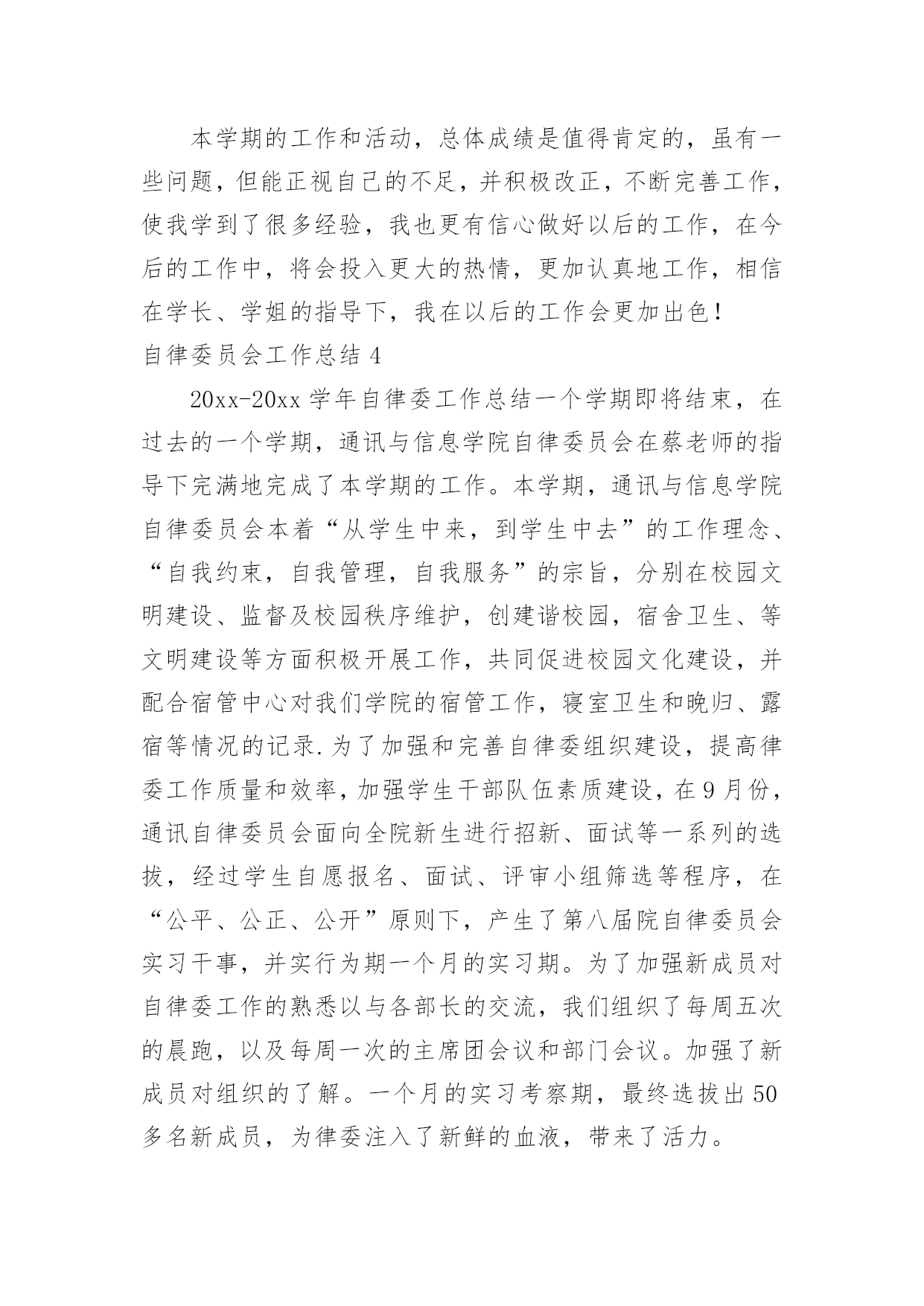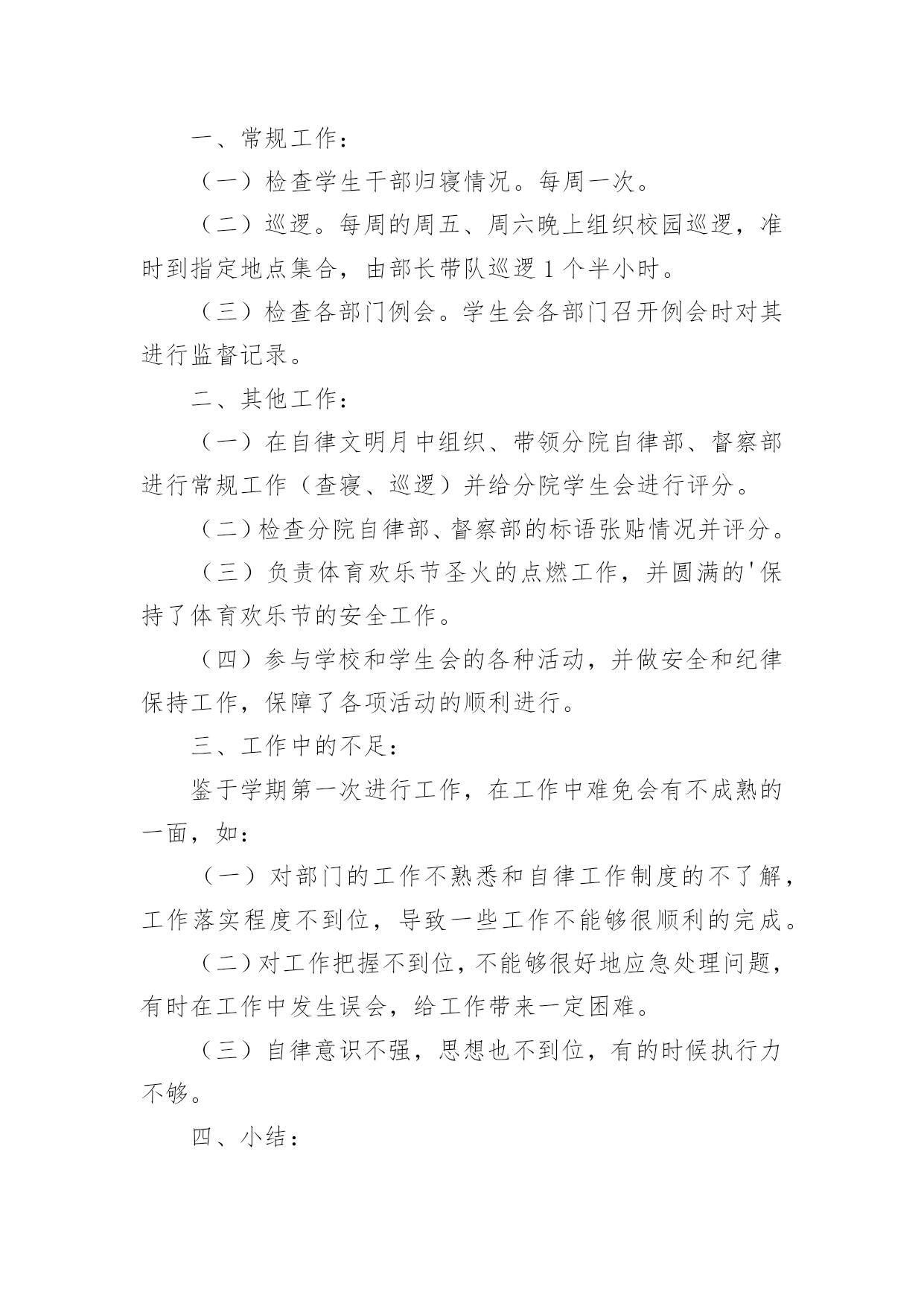 自律委员会工作总结自律委员会工作总结总结是指社会团体、企业单位和个人在自身的某一时期、某一项目或某些工作告一段落或者全部完成后进行回顾检查、分析评价,从而肯定成绩,得到经验,找出差距,得出教训和一些规律性认识的一种书面材料,通过它可以正确认识以往学习和工作中的优缺点,让我们一起来学习写总结吧。那么总结应该包括什么内容呢?下面是小编为大家收集的自律委员会工作总结,仅供参考,欢迎大家阅读。自律委员会工作总结1“不以规矩,无以成方圆”作为两院的自律人,在斑斓多姿的大学生活,我们有为同学服务的热情,有积极奋进之胆魄,有坚守人格的执着。我们敢于面对生活与学习的挑战。下面,我就对我的执勤工作总结一番,谢谢大家指导。时间如逝,转眼间一学期即将结束,在这时刻,我将代表工学院学生自律委员会执勤部进行工作总结。执勤部主要负责对宿舍区纪律的监督与检查,引导同学们自律成才,本学期执勤重点放在安全引患与作息两方面。安全隐患重点主要是在床上点蜡烛,夜不归宿,作息主要是阻止同学在归定的休息时间内大声喧哗,搞娱乐活动(如打牌、弹吉它、下棋等)。另外,执勤部还与学管科取得联系,共同管理我院单车停放问题。在常规执勤的同时,执勤部在其它方面的工作如下:九月份,自律委执勤部设立新生咨询服务台,配合学生会完成迎新工作。并且对新生进行走访,了解新生入校时是否存在困难,及时给予帮助,受到了亲生及新生家长的好评,同时完成了《工学院红、黄牌管理条例》的修改。十月份,执勤部负责国庆节期间的`保卫工作。确保了我院的财产安全及人生安全。完成对新委员的考核工作及培训工作计划。负责学联的迎新晚会保卫工作,维护晚会的秩序,确保晚会顺利进行。十一月份,召集新生班班长开会,了解新生的动态,及时掌握新生的动态。向新生班传达有关我们学院宿舍管理的文件。十二月份,负责校运会期间留守大本营及宿舍保卫工作,以确保我院宿舍的财产安全。同时,在内部管理方面,执勤部制定了工作条例,要求内部委员要严格要求自己,做到先律己,后律人,定期召开执勤组长会议,听取各组执勤情况,使执勤做到有针对性的进行。在执勤过程中,我们发现本学期我院存在以下几方面的问题:①在床上点蜡烛的现象虽有很大好转,但仍不能完全杜绝,还存在一定安全隐患。②晚上晚归现象严重。大多数同学在11:45—12:30之间回来,不利于我们查夜。③少数同学仍在非周末时间内打牌,尤其是5—102,00食品、5—206、207,98农贮。④我们内部委员管理还不够科学,使一些委员工作一、二个月还不能完全认识所有委员。以上是自律委员会执勤部本学期工作情况。虽然我们取得了可喜的成绩,但我们仍存在不足,我们将继续努力,做好XX年工作计划,把“四自”方针发扬光大,使自律委更加完善,更加强大。在此,我们诚请组织给予指导。自律委员会工作总结2一:活动背景当我们满怀憧憬步入扬州职业大学时,当我们激情澎湃的加入大学生自律委员会后,我们不断的在接触新人、新事物、不断地在日常生活中学习新知识、当然也不断地在自律会中成长锻炼。大学生自律委员会是一个充满温馨的大家庭,是一个充满欢声笑语的大集体,是一个有着积极奋发精神的大团队。当大二的各位部长以及主席团的各位还在为怎么能够让大家更好的沟通交流时,当大家已经对晚会形式的活动感到枯燥乏味的时候,就让我们一起走进花样年华,以牌会友、用歌声交流吧!二:活动主题以牌会友,用歌声交流三:活动目的及意义为了丰富我们的大学生自律委员会各位干事的业余生活,更好的增强部门之间的沟通与交流,使自律会的各个部门里的干事不再仅仅的局限于自己的小天地里而是积极地与其他部门的'干事开怀畅饮,增强干事之间的沟通与交流,使每一位干事对我们大学生自律委员会有更深一步的了解认识,方便大家以后再自律会的工作,扩大各位干事的交际范围与朋友圈,让大家在自律会的工作生活中不会感到孤单,快快乐乐的在自律会中工作。所以特想举办一次以牌会友、用歌声交流的休闲娱乐活动。四:活动对象大学生自律委员会全体干事及干部五:活动地点与时间扬州花样年华(棋牌室)5月26日周六下午12点—6点(具体时间由主席团商定)地点简介:经本人调查此红棋牌室环境优雅,适合大家休闲娱乐。大家可以在品茶的同时并一同与大家娱乐,并且在那儿还会送一间KTV大包间,这样一来大家玩的可以更尽兴。六:活动流程:1:自律会召开部长会议,商议此次活动的可实施时间,并由主席团确定活动的开展时间。2:由艺联部的许网金、刘豪负责去此棋牌室洽谈关于我们自律会的活动的有关事项,争取有更大的优惠,以方便大家。3:自律会各部门部长就此次活动对本部门大一干事进行宣传,争取大一干事有个高的出席率,使此次活动能够达到它的目的与效果。4:各个部门由部长或部长委派人员将会参加本次活动人员数以及个人费用交于秘书处秘书长手中。5:自律会秘书处负责去买扑克牌。