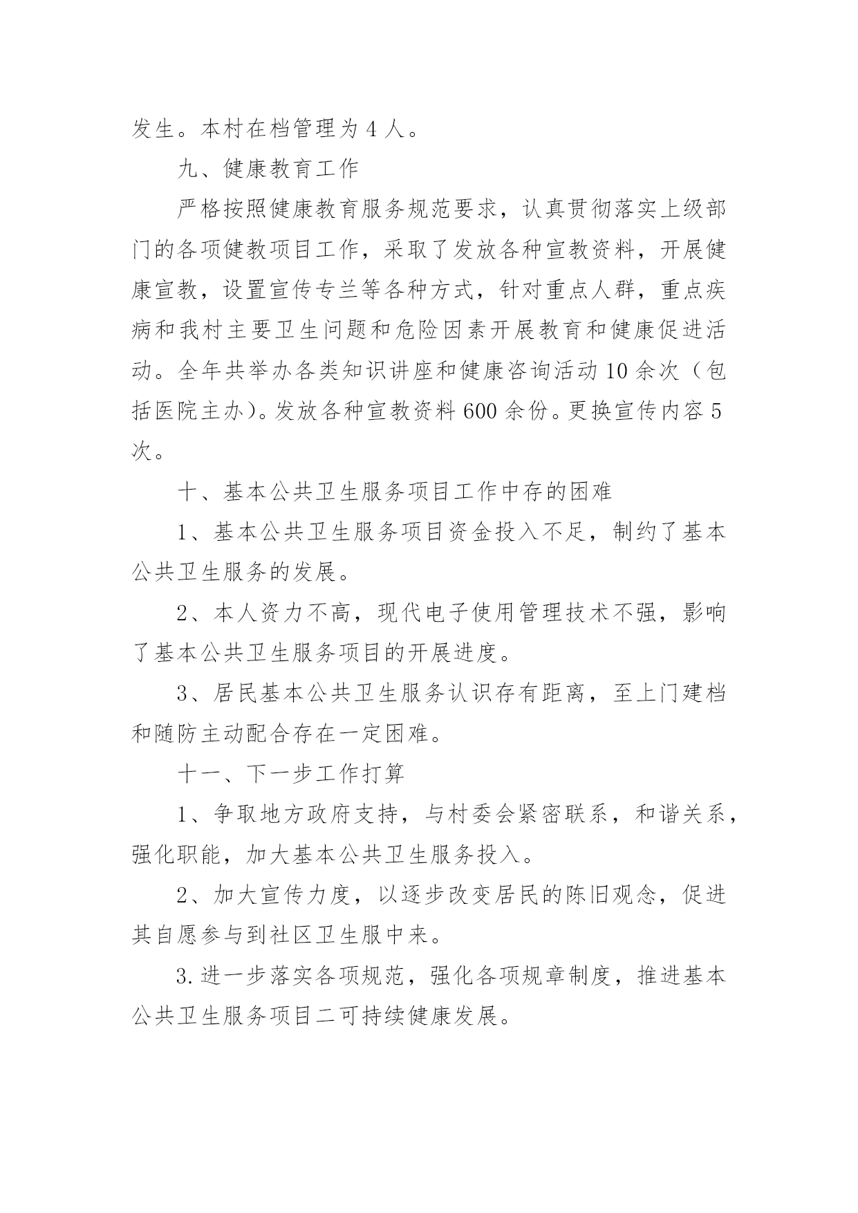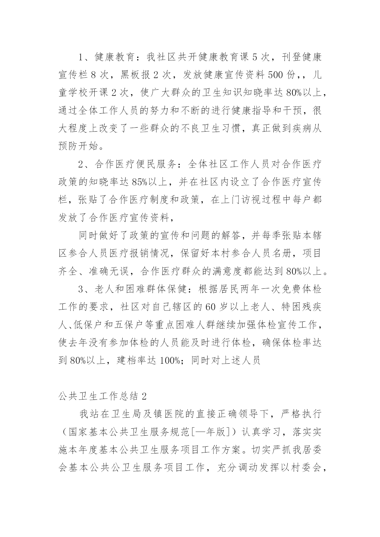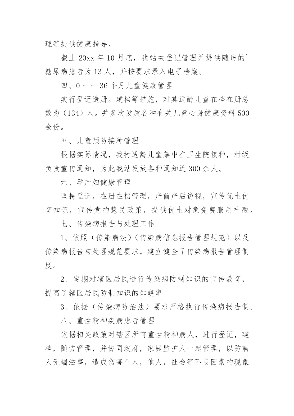 公共卫生工作总结1公共卫生工作总结总结是对过去一定时期的工作、学习或思想情况进行回顾、分析,并做出客观评价的书面材料,它可以明确下一步的工作方向,少走弯路,少犯错误,提高工作效益,因此,让我们写一份总结吧。总结怎么写才不会千篇一律呢?以下是小编收集整理的公共卫生工作总结,希望对大家有所帮助。公共卫生工作总结1时间飞逝,充实而又忙碌的一年已经过去,通过我社区全体工作人员的共同努力,今年的社区公共卫生工作已经完成,并取得了较好的成绩,但是也存在着一定的.问题需要整改。现根据年初的工作计划,对今年的社区公共卫生工作总结如下:一、落实组织,加强领导,健全制度,规范行为。领导班子能够团结合作,决策力、战斗力、凝聚力强,根据各自的分工,都已圆满完成任务,在书记、主任的领导下,均能认真贯彻好各级政府和街道办事处下达的各项工作任务和方针与政策;同时在原有的基础上,进一步完善了管理制度,并根据十二项公共卫生服务的内容和要求制定了工作考核制度、奖罚制度,提高了工作人员的工作责任心、积极性,为我社区今年取得的良好成绩打下了基础。二、五项公共卫生服务情况。1、健康教育:我社区共开健康教育课5次,刊登健康宣传栏8次,黑板报2次,发放健康宣传资料500份,,儿童学校开课2次,使广大群众的卫生知识知晓率达80%以上,通过全体工作人员的努力和不断的进行健康指导和干预,很大程度上改变了一些群众的不良卫生习惯,真正做到疾病从预防开始。2、合作医疗便民服务:全体社区工作人员对合作医疗政策的知晓率达85%以上,并在社区内设立了合作医疗宣传栏,张贴了合作医疗制度和政策,在上门访视过程中每户都发放了合作医疗宣传资料,同时做好了政策的宣传和问题的解答,并每季张贴本辖区参合人员医疗报销情况,保留好本村参合人员名册,项目齐全、准确无误,合作医疗群众的满意度都能达到80%以上。3、老人和困难群体保健:根据居民两年一次免费体检工作的要求,社区对自己辖区的60岁以上老人、特困残疾人、低保户和五保户等重点困难人群继续加强体检宣传工作,使去年没有参加体检的人员能及时进行体检,确保体检率达到80%以上,建档率达100%;同时对上述人员公共卫生工作总结2我站在卫生局及镇医院的直接正确领导下,严格执行(国家基本公共卫生服务规范[—年版])认真学习,落实实施本年度基本公共卫生服务项目工作方案。切实严抓我居委会基本公共公卫生服务项目工作,充分调动发挥以村委会,群众,村医为一体的互动组合团体,收集整理了各项所需信息资料,确保‘公卫’项目的启动与正常运行,并取得了一点成绩,特作出总结报告如下。在实施国家基公共卫生服务。9个项目中,我站医生是加班加点,废寝忘食,走乡串户,打硬仗,持久仗,终于基本完成了上级交给的项目任务。一、居民健康档案工作根据(—年基本公共卫生服务建立居民健康档案项目工作方案)要求,在上级领导统一部署下,我村即元月份继续开展了—年度居民建档工作。1、争取领导重视,搞好综合协调与沟通,得到了村委,村民的大力协助与支持。2、加大宣传力度,提高居民主动建档意识,我站大力宣传发放各类宣传资料,让每一名居民了解健康档案,并积极主动配合我村建裆工作顺完成。截止20xx年10月底,我站共建居民家庭健康档案(522)份,计;2593人,电子录入2360人。二、老年人健康管理工作根据(20xx年基公共卫生服务老人健康档案管理项目工作方案)及上级部门要求,我村开展了老年人健康管理服务项目。1、结合建立居民健康档案,对我村65岁以上老年人进行登记管理,并对其老人免费进行一次健康危险因素和一般体格检查及空腹血糖测试,被检人数(81)人份。并提供自我保健及伤害预防,自救等健康指导。2、开展老人健康干预,对发现已确诊的高血压和2型糖尿病患者纳入相应的慢性病进行管理,对存在危险因素,且未纳入其它疾病管理的老年居民进行定期随访。并告之一年后进行下次免费体检。截止10月底,我村共登记管理65岁以上老年人215人,免费体检85人。并按要求录入电子健康档案系统。三、慢性病管理工作为有效预防和控制高血压,糖尿病等慢性病,建立健康档案,开展高血压,糖尿病等慢病的随访管理,康复指导工作,掌握我村高血压。糖尿病等慢性病发病,死亡和现患病情况。1、高血压患者管理;一是通过开展35岁以上居民首诊测血压,居民诊疗过程测血压,健康体检测血压,和建档过程中询问等方式发现高血压患者。二是对确诊确高血压患者进行登记管理,并提供面对面随访,询问病情,测量血压对用药,饮食,运动,心理等提供健康指导。三是对已经登记管理的高血压患者进行一次免费健康体检(含一般体格检查和随机血糖测试)。截止20xx年10月底,我站共登记管理并提供随访高血压患者为112人。并按要求录入电子档案糸统。2、2型糖尿病管理;。一是通过健康体检和高危人群筛查检测血糖,建档过