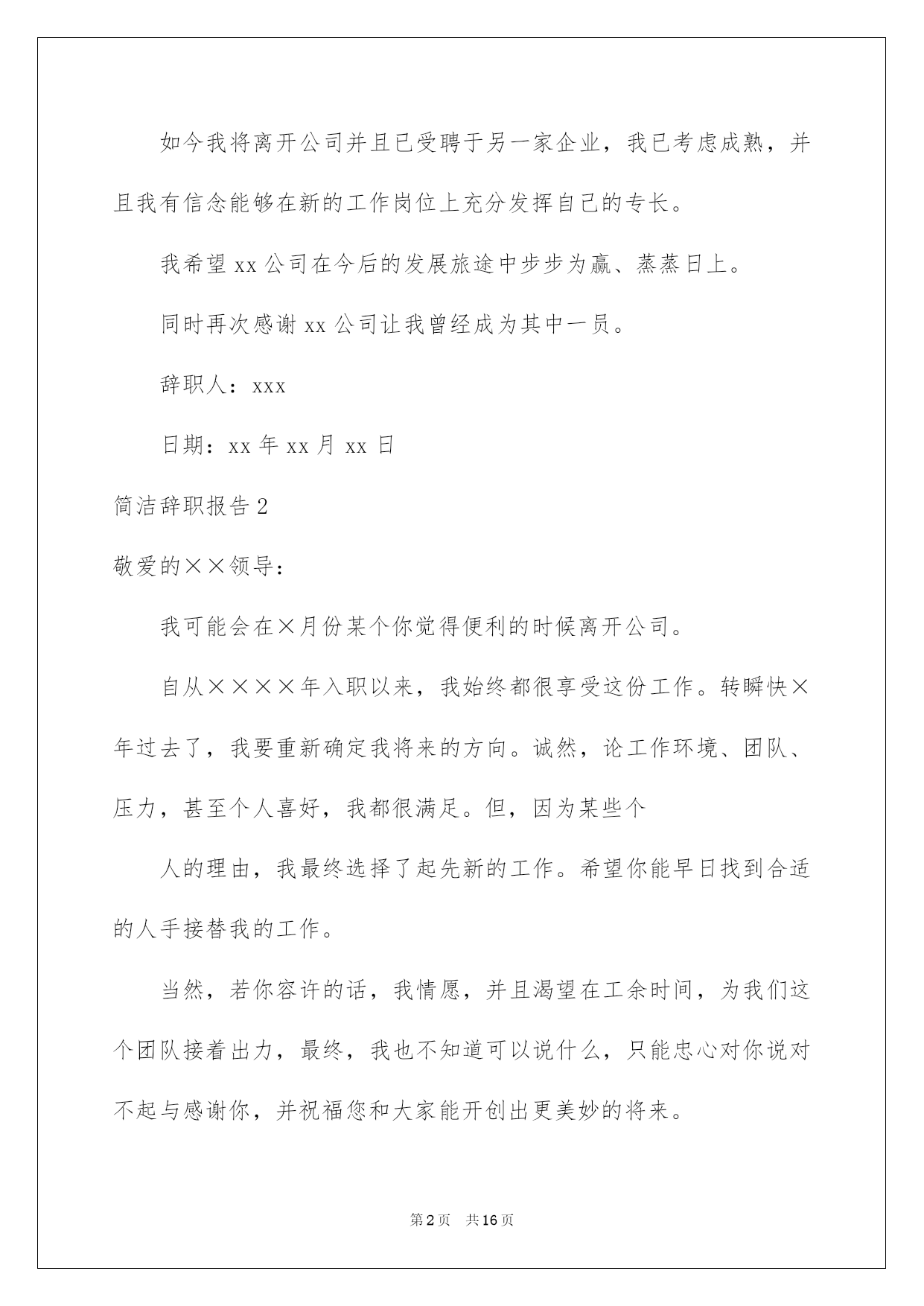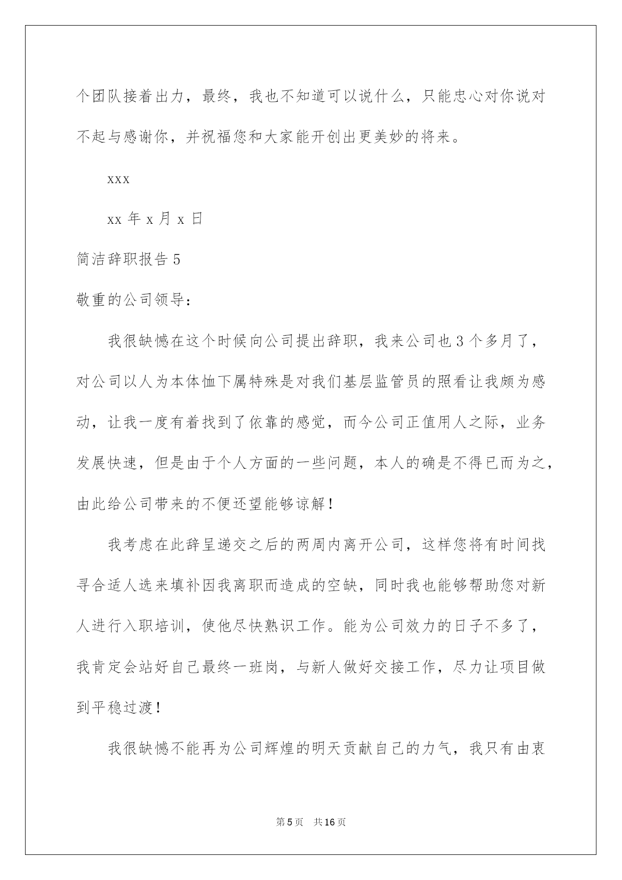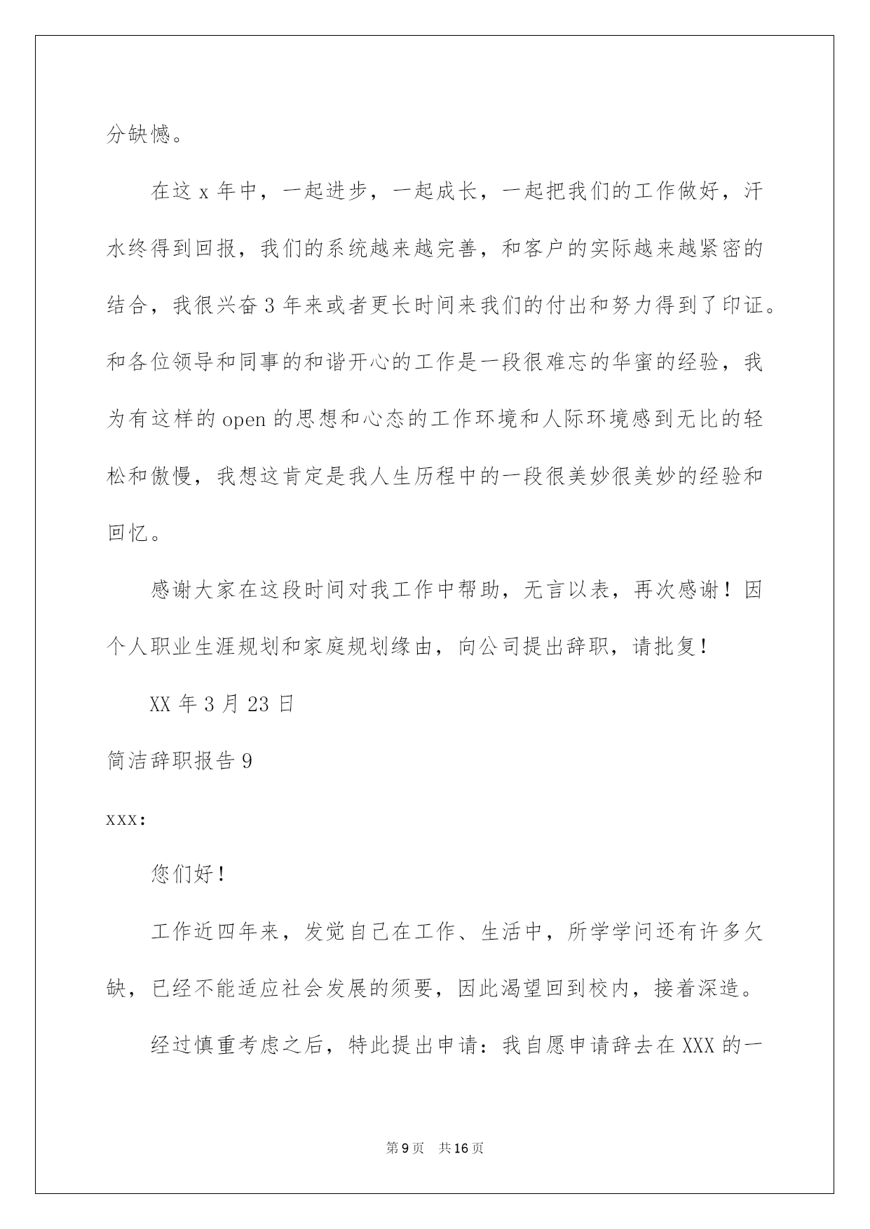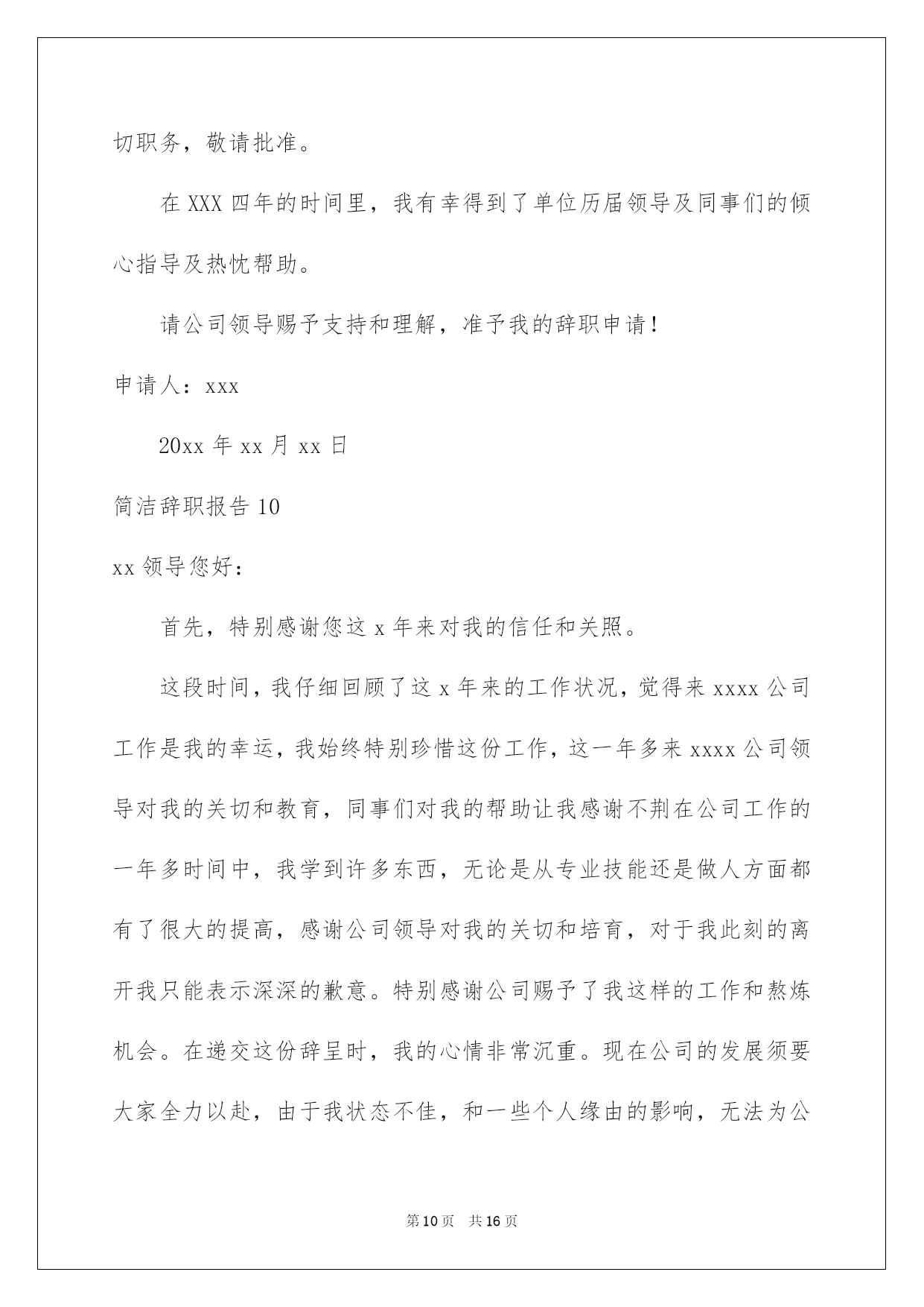 第PAGE\*Arabic\*MERGEFORMAT16页共NUMPAGES\*Arabic\*MERGEFORMAT16页第PAGE\*MERGEFORMAT16页共NUMPAGES\*MERGEFORMAT16页第PAGE\*MERGEFORMAT16页共NUMPAGES\*MERGEFORMAT16页第PAGE\*MERGEFORMAT16页共NUMPAGES\*MERGEFORMAT16页第PAGE\*MERGEFORMAT16页共NUMPAGES\*MERGEFORMAT16页第PAGE\*MERGEFORMAT16页共NUMPAGES\*MERGEFORMAT16页第PAGE\*MERGEFORMAT16页共NUMPAGES\*MERGEFORMAT16页第PAGE\*MERGEFORMAT16页共NUMPAGES\*MERGEFORMAT16页第PAGE\*MERGEFORMAT16页共NUMPAGES\*MERGEFORMAT16页第PAGE\*MERGEFORMAT16页共NUMPAGES\*MERGEFORMAT16页第PAGE\*MERGEFORMAT16页共NUMPAGES\*MERGEFORMAT16页2022简单辞职报告简洁辞职报告15篇随着个人的素养不断提高,须要运用报告的状况越来越多,报告中涉及到专业性术语要说明清晰。信任很多人会觉得报告很难写吧,下面是我为大家整理的简洁辞职报告,仅供参考,大家一起来看看吧。简洁辞职报告1敬重的xx领导:您好!我特别感谢xx公司给我的机遇和帮助!但是由于某些个人缘由,使我只能离开我酷爱的公司,所以在此提出辞职申请。在过去x年的时间里,公司教给了我许多东西,并且赐予我许多帮助和熬炼的机会,让我在这个岗位上积累了肯定的专业技能和工作阅历,同时也学学到了许多工作以外的,为人处事等道理,我很感谢公司对我的帮助,我信任这也是我一生中最难得的财宝,因为这些都为我在将来的工作和生活中带来帮助和便利。如今我将离开公司并且已受聘于另一家企业,我已考虑成熟,并且我有信念能够在新的工作岗位上充分发挥自己的专长。我希望xx公司在今后的发展旅途中步步为赢、蒸蒸日上。同时再次感谢xx公司让我曾经成为其中一员。辞职人:xxx日期:xx年xx月xx日简洁辞职报告2敬爱的××领导:我可能会在×月份某个你觉得便利的时候离开公司。自从××××年入职以来,我始终都很享受这份工作。转瞬快×年过去了,我要重新确定我将来的方向。诚然,论工作环境、团队、压力,甚至个人喜好,我都很满足。但,因为某些个人的理由,我最终选择了起先新的工作。希望你能早日找到合适的人手接替我的工作。当然,若你容许的话,我情愿,并且渴望在工余时间,为我们这个团队接着出力,最终,我也不知道可以说什么,只能忠心对你说对不起与感谢你,并祝福您和大家能开创出更美妙的将来。辞职人:xx日期:xx年9月简洁辞职报告3敬重的学校领导:我是xx,xx年学校为正式员工,现因个人缘由正式提出辞职。几年的工作使我体会到:做事先做人,正人先正己;看法确定思路,思路确定出路。可以说,学校使我完成了从社会人到公务员的角色转变,在思想、相识、技能等方面获得了提高。在这里学到的东西将使我终生受益,我要感谢这段不平凡的岁月!但是,工作中我也体会到了不足,正是这些不足使我决心要辞去职务,再学习再提高。第一,我自身身体素养不好,加上工作时间的超长和工作压力的加大以及24小时的备勤、值班,使我在身体上和精神上都感到很乏累,身体素养每况愈下,精神状态萎靡不振,所以希望能够在一个宽松的环境中使身体得到复原。这是我辞职的主要缘由。其次,工作中我发觉自己的学问还有许多欠缺,处理实际工作的技能还有许多不足,对真理和信仰的不懈追求使我希望有一个足够的时间来学习提高。这是我辞职的重要缘由。总之,学校的工作是开心的。但由于自身的不足,我提出辞职。望批准!此致敬礼!辞职人:xxx20xx年xx月xx日简洁辞职报告4敬重的学校领导:我可能会在x月份某个你觉得便利的时候离开学校。自从20xx年入职以来,我始终都很享受这份工作。转瞬快2年过去了,我要重新确定我将来的方向。诚然,论工作环境、团队、压力,甚至个人喜好,我都很满足。但,因为某些个人的'理由,我最终选择了起先新的工作。希望你能早日找到合适的人手接替我的工作。学校是一棵参天大树,而我,只不过是树上的一片叶子。每年的秋风起时,都有些树叶会掉落,但是,大树总是那么挺立和伟岸,希望我的走开不会给学校带来不便。当然,若你容许的话,我情愿,并且渴望在工余时间,为我们这个团队接着出力,最终,我也不知