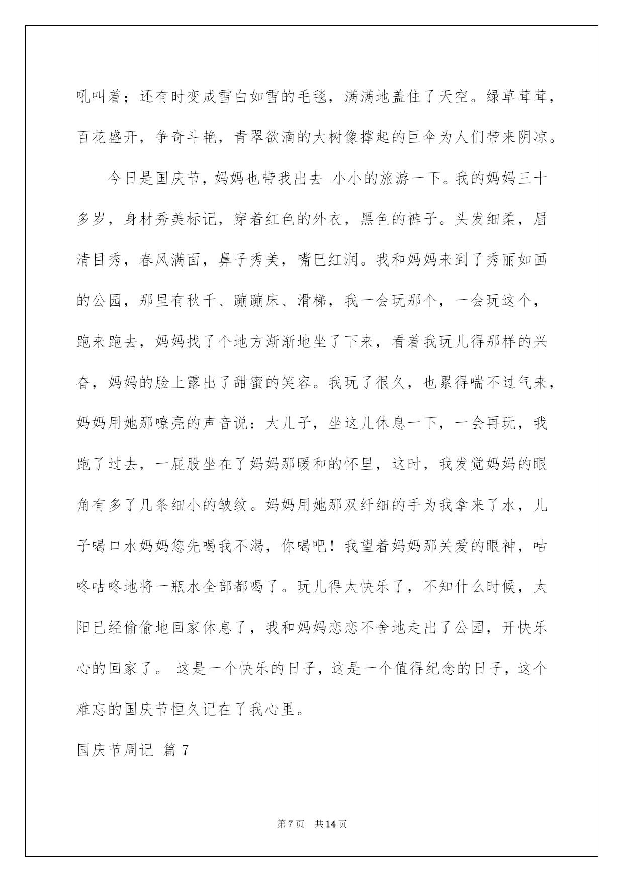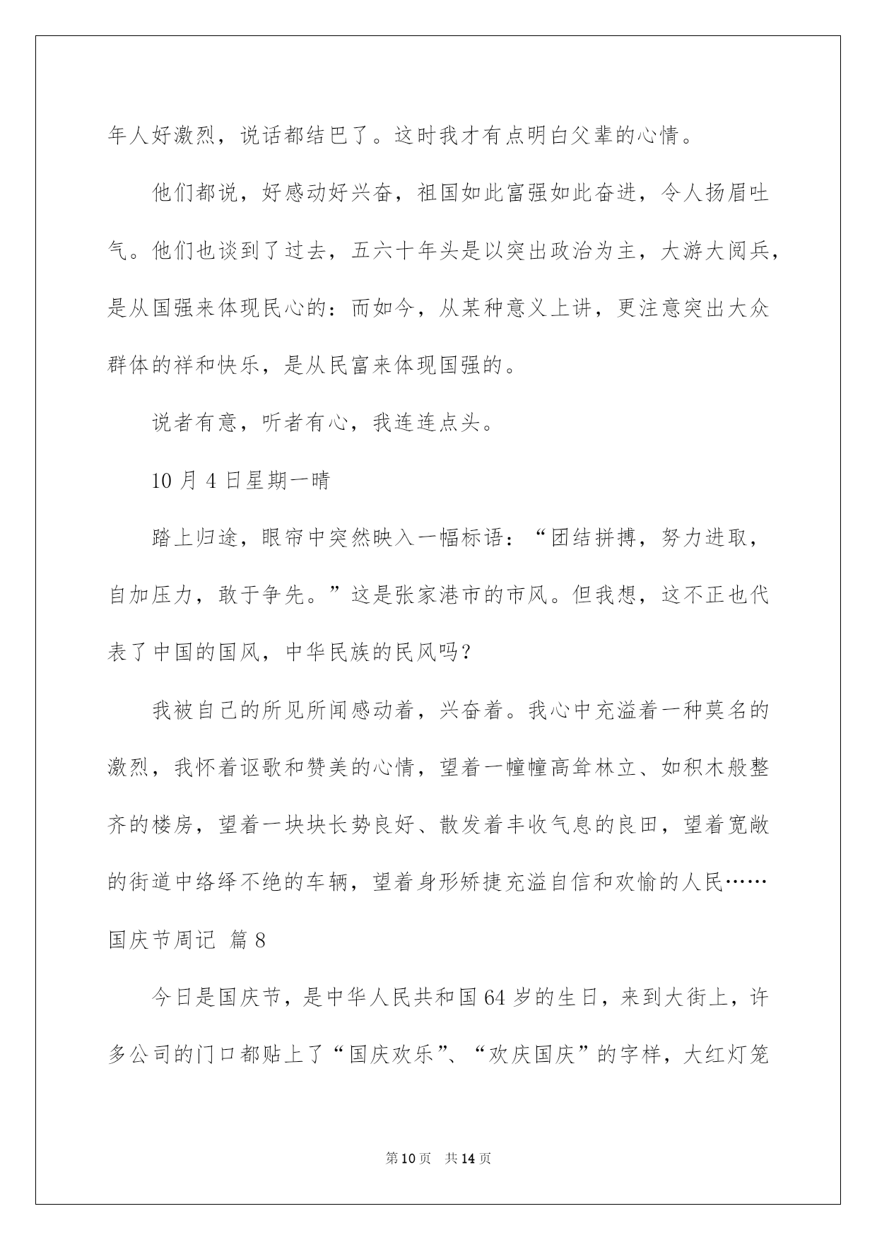 第PAGE\*Arabic\*MERGEFORMAT14页共NUMPAGES\*Arabic\*MERGEFORMAT14页第PAGE\*MERGEFORMAT14页共NUMPAGES\*MERGEFORMAT14页第PAGE\*MERGEFORMAT14页共NUMPAGES\*MERGEFORMAT14页第PAGE\*MERGEFORMAT14页共NUMPAGES\*MERGEFORMAT14页第PAGE\*MERGEFORMAT14页共NUMPAGES\*MERGEFORMAT14页第PAGE\*MERGEFORMAT14页共NUMPAGES\*MERGEFORMAT14页第PAGE\*MERGEFORMAT14页共NUMPAGES\*MERGEFORMAT14页第PAGE\*MERGEFORMAT14页共NUMPAGES\*MERGEFORMAT14页第PAGE\*MERGEFORMAT14页共NUMPAGES\*MERGEFORMAT14页第PAGE\*MERGEFORMAT14页共NUMPAGES\*MERGEFORMAT14页第PAGE\*MERGEFORMAT14页共NUMPAGES\*MERGEFORMAT14页2022国庆节周记国庆节周记10篇时间过得太快,让人猝不及防,转瞬一周又过去了,我们肯定有印象深刻的事情,这时就须要我们仔细地写一篇周记了。在写之前,要先考虑好内容和结构喔!下面是我为大家收集的国庆节周记10篇,欢迎阅读,希望大家能够喜爱。国庆节周记篇1经过9月30日的诗诵会,今日,是10月1日。不仅仅是祖国老妈的生日,还意味着,国庆假期就此起先了!早晨,很多人家都提着大包小包离开了小区,他们都在赶路到自己的“归宿地”。我望了这些人一眼,灵机一动,朝旁边刚来我家的奶奶说:“今日我们去海岸城吃肯德基并且去书城看书,明天我要和老爸坐地铁到少年宫玩,好好看一下那里的海洋馆。”每次跟奶奶说话,老爸老妈的看法就只有点头。“好啊!”奶奶爽快地答应了。这下,我们家也背着小包赶到了海岸城。在海岸城的天桥底下正好有个肯德基餐厅,我们在那里吃了香喷喷的全家桶。炸鸡翅、炸薯条,加上一大堆番茄酱,味道好极了!再来点西式面包,香味俱全。嘴巴塞在一块,最终还是提着一杯大可乐慢悠悠地走出了肯德基餐厅。现在想起来,我恨不得再来吃一份呢!下午,我们走过了书城。在那里,我看到了很多中国古代的邮票和铜币,俄罗斯和法国、瑞士和西班牙,上面的纸币虽然很新,但却又觉得这些纸币特别有价值。最终,我们带着奶奶,在鼎太小区车的座位上,离开了书城,结束了美妙的旅程。明天,我们同一时间,快速动身去旅行吧!国庆节周记篇2国庆节是宏大的祖国的生日。全国人民用不同的方式祝愿宏大的祖国旺盛昌盛,在祖国母亲生日里,各族人民团聚一堂,共庆祖国母亲的生日。早晨,我通过电视看到了北京天安门广场隆重庄重的升旗仪式,艳丽的五星红旗冉冉升起,迎风飘扬。国旗护卫队持枪敬礼,天安门广场上空响起雄壮的国歌:“起来,不愿做奴隶的人们……。”宏伟的人民英雄纪念碑前,领导人献上花篮,向为建立共和国而牺牲的英雄表达怀念的心情。在我的家乡——新乡也是到处张灯结彩,在绿色的草原上,公园里的园艺师用各种各样颜色的花草扎成栩栩如生的小动物,有大象;有孔雀开屏;有小鸟;还有兔子……看到栩栩如生的小动物们,人们争先恐后的在它们前面合影留念,人们都想留住着无比欢乐的时间。节日的大街小巷到处是热门的人群,熙熙攘攘的,不仅烘托了节日的欢乐气氛,也呈现了旺盛景象,各大商家也借长假之机打出了各种促销手段,让人们在这黄金时间休闲购物,十一国庆节不仅是祖国的生日,还是大家的休息日,父母可以从繁忙的工作中走出来,陪伴我们共享天伦之乐,看着大街上大人小孩欢乐的笑脸,到处显示了生活的快乐。祖国在前进,中国在腾飞。祝福祖国日益旺盛富强!国庆节周记篇3一觉醒来,发觉天还没亮,但日历已经翻过去了一页——金秋十月已经来临。十月一日,祖国的生日,我们怎能忘怀?九月三十日,大街小巷、店铺广场上就已经飞扬着艳丽的红色,好像一片红色海洋,把人们包围在红色的长河里……我的思绪纷纷从心头跌落下来,随着红“海”的翻滚,在脑海中纷飞。转瞬,这光辉的旗帜在空中已经飘舞了xx年了。随着年龄的增长,我从红旗的飘舞中,读出了历史的沧桑,也读出了祖国的艰辛。总是爱睡懒觉的我起了个大早,我确定看那轮骄阳冉冉升起,把国旗染成血一般的红,把那在心底燃烧的`激情岁月轻轻唤醒。窗外,天空还是灰蓝色的,四周一片宁静,树木、小草、花朵全都低垂着头沉睡。只有蟋蟀还在弹奏,那不同的音调弹出来的不同的心情,却把这黎明来临
