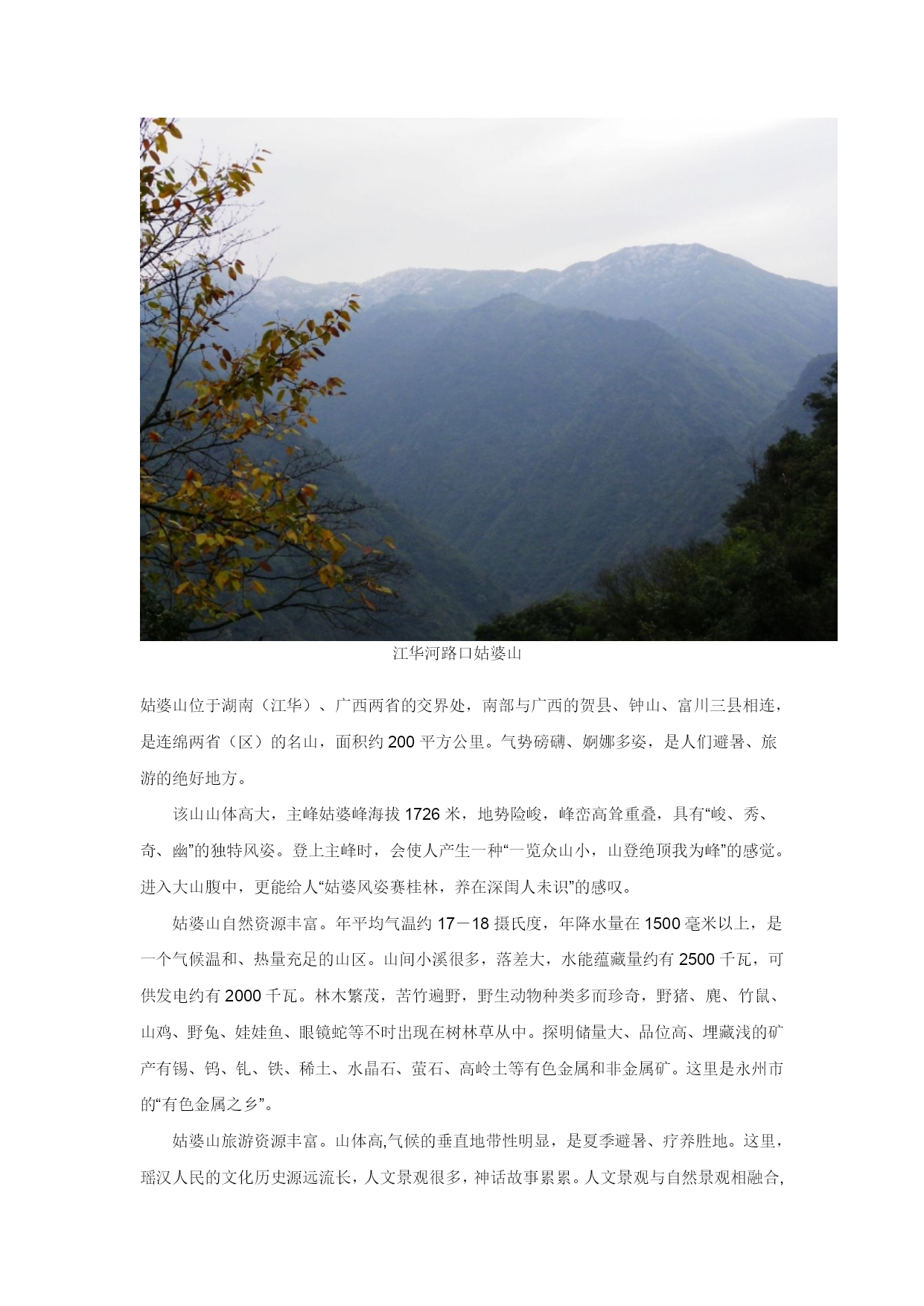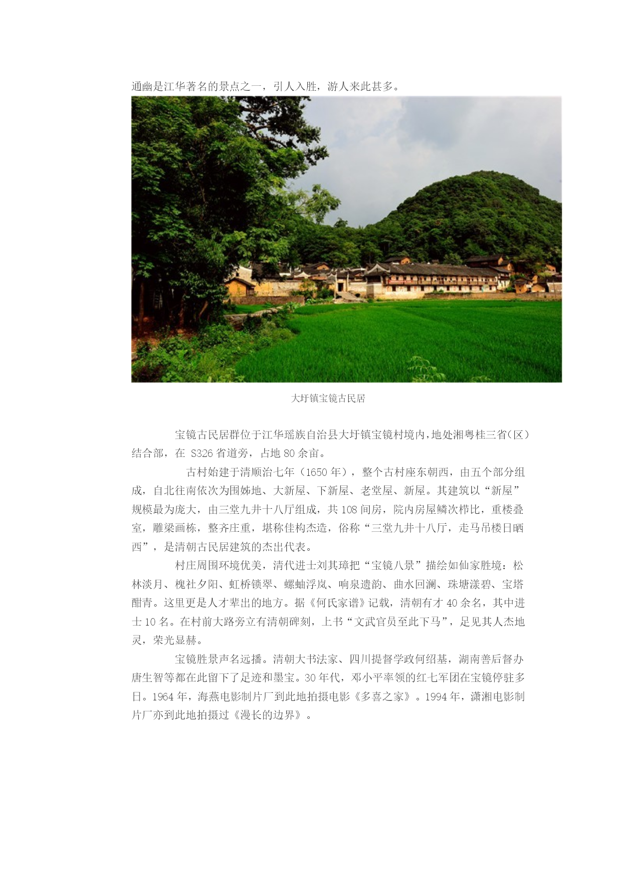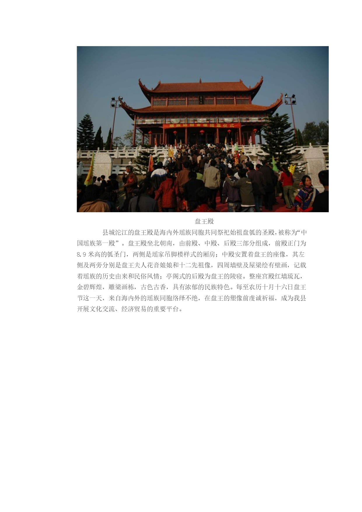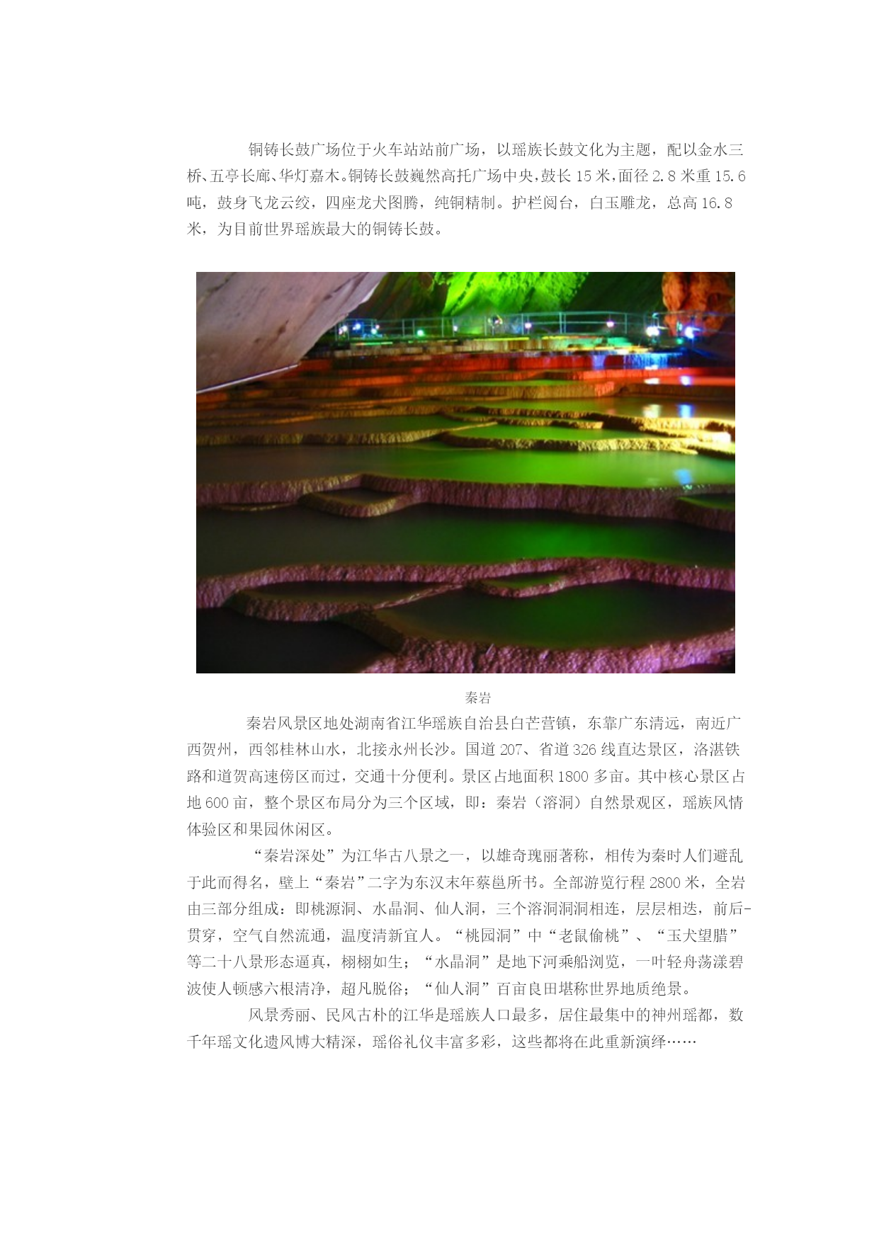 美丽的江华旅游景点豸山古寺位于县城东南沱水之畔,明公历四年(1576年)依岩势建寺于其间,前后三进,依次有观音阁、吕祖阁、文昌阁、明远楼等,寺门外有六角亭设于渡口。同治八年(1869年)江华抗法名将王德榜捐资独修凌云塔于豸山之巅,集佛教、道教、伊斯兰教建筑风格于一体,七级八方四门,顶置铁刹,直插云霄,号称“凌云塔”。瑶族图腾园包括瑶族图腾浮雕墙、图腾柱及各种图腾雕塑、广场旱喷、瑶族文化铺地。图腾墙高10.8米,宽36米,图腾柱高10.8米,直径长1.2米,图腾墙上雕刻有盘瓠龙犬图腾形象。由图腾墙和图腾柱共同组成的图腾坊,为目前世界最大的瑶族图腾坊。阳华岩地处县城东南5公里处竹园寨回山下,岩上小山矗立,岩面向南宽敞。洞中怪石嶙峋,泉水晶莹透澈。唐道州刺史元结多次游于此,作《阳华岩铭(并序)》。著名书法家县令瞿令问将《铭》以隶、篆、籀三种书体命人刻于崖壁上,世称名迹。自唐代以后,历代游人咏题甚多,现保存四十余方碑刻。2006年被列为国家级文物保护单位。耸立于县境北部的九嶷山,是江华与宁远、道县、蓝山的分界山脉,群峰林立,云雾缭绕,气势磅礴。湘江乡庙子源村的黄龙山为九嶷山在江华境内的最高峰,海拔1823.9米,山中多斑竹、方竹和香草。唐刘禹锡《潇湘神》诗云:“斑竹枝,斑竹枝,泪痕点点寄相思。楚客欲听瑶瑟怨,潇湘深夜月明时。”“湘水流,湘水流,九疑云物至今愁。君问二妃何处所?零陵香草露中秋。”位于县城东南,建于清光绪二十四年(1889年)。桥为七拱,全用青料石砌成,长约120米,宽约7米,两侧有1米多高的石柱栏杆,配以龙云鸟兽、八仙飘海、文王求贤等人物故事精致石刻,上置千姿百态小石狮近百尊。两端各设一对大石狮,桥身造型优美,状如长虹,故有“云龙飞驾”、“西佛拱秀”之美誉。铜铸长鼓广场位于火车站站前广场,以瑶族长鼓文化为主题,配以金水三桥、五亭长廊、华灯嘉木。铜铸长鼓巍然高托广场中央,鼓长15米,面径2.8米重15.6吨,鼓身飞龙云绞,四座龙犬图腾,纯铜精制。护栏阅台,白玉雕龙,总高16.8米,为目前世界瑶族最大的铜铸长鼓。秦岩秦岩风景区地处湖南省江华瑶族自治县白芒营镇,东靠广东清远,南近广西贺州,西邻桂林山水,北接永州长沙。国道207、省道326线直达景区,洛湛铁路和道贺高速傍区而过,交通十分便利。景区占地面积1800多亩。其中核心景区占地600亩,整个景区布局分为三个区域,即:秦岩(溶洞)自然景观区,瑶族风情体验区和果园休闲区。“秦岩深处”为江华古八景之一,以雄奇瑰丽著称,相传为秦时人们避乱于此而得名,壁上“秦岩”二字为东汉末年蔡邕所书。全部游览行程2800米,全岩由三部分组成:即桃源洞、水晶洞、仙人洞,三个溶洞洞洞相连,层层相迭,前后贯穿,空气自然流通,温度清新宜人。“桃园洞”中“老鼠偷桃”、“玉犬望腊”等二十八景形态逼真,栩栩如生;“水晶洞”是地下河乘船浏览,一叶轻舟荡漾碧波使人顿感六根清净,超凡脱俗;“仙人洞”百亩良田堪称世界地质绝景。风景秀丽、民风古朴的江华是瑶族人口最多,居住最集中的神州瑶都,数千年瑶文化遗风博大精深,瑶俗礼仪丰富多彩,这些都将在此重新演绎……盘王殿县城沱江的盘王殿是海内外瑶族同胞共同祭祀始祖盘瓠的圣殿,被称为“中国瑶族第一殿”。盘王殿坐北朝南,由前殿、中殿、后殿三部分组成,前殿正门为8.9米高的瓠圣门,两侧是瑶家吊脚楼样式的厢房;中殿安置着盘王的座像,其左侧及两旁分别是盘王夫人花音娘娘和十二先祖像,四周墙壁及屋梁绘有壁画,记载着瑶族的历史由来和民俗风情;亭阁式的后殿为盘王的陵寝。整座宫殿红墙琉瓦,金碧辉煌,雕梁画栋,古色古香,具有浓郁的民族特色。每至农历十月十六日盘王节这一天,来自海内外的瑶族同胞络绎不绝,在盘王的塑像前虔诚祈福,成为我县开展文化交流、经济贸易的重要平台。大龙山虎踞县境东南部的大龙山,山势起伏,蜿蜒如龙,最高峰海拔1577米,为湖南与广东、广西的分界山脉,距广东连州50公里,有326省道相连,正在修建的二广高速傍区而过。山内茂林修竹遍野,多原始次森林,是国家二级保护动物娃娃鱼的栖息地,溪河冲沟密布,水质清澈、甘甜,空气中富含负氧离子,最多处达每立方厘米6万余个。九龙井风景九龙井原始生态园位于县城沱江镇东北方向4公里之莲花地、白竹园两村境内,景区面积80余亩,景区内分布着形状奇特的古檵木树群落,共174株。历2000余年,仍枝繁叶茂,像这样的原始檵木林群落全国极为罕见,曾被学者专家誉为“南方最后的原始森林”。特别让人叹为观止的是点缀在群落中间的3000年古樟,叶茂径粗,根系发达,盘根错节,且底部涌出9股清泉,故名“九龙井”。景区可供游客观光、休闲、娱乐、食宿,是度假休闲、释放心情的好地方。目前,九龙井已被评为四星级乡村旅游点。大圩穿岩