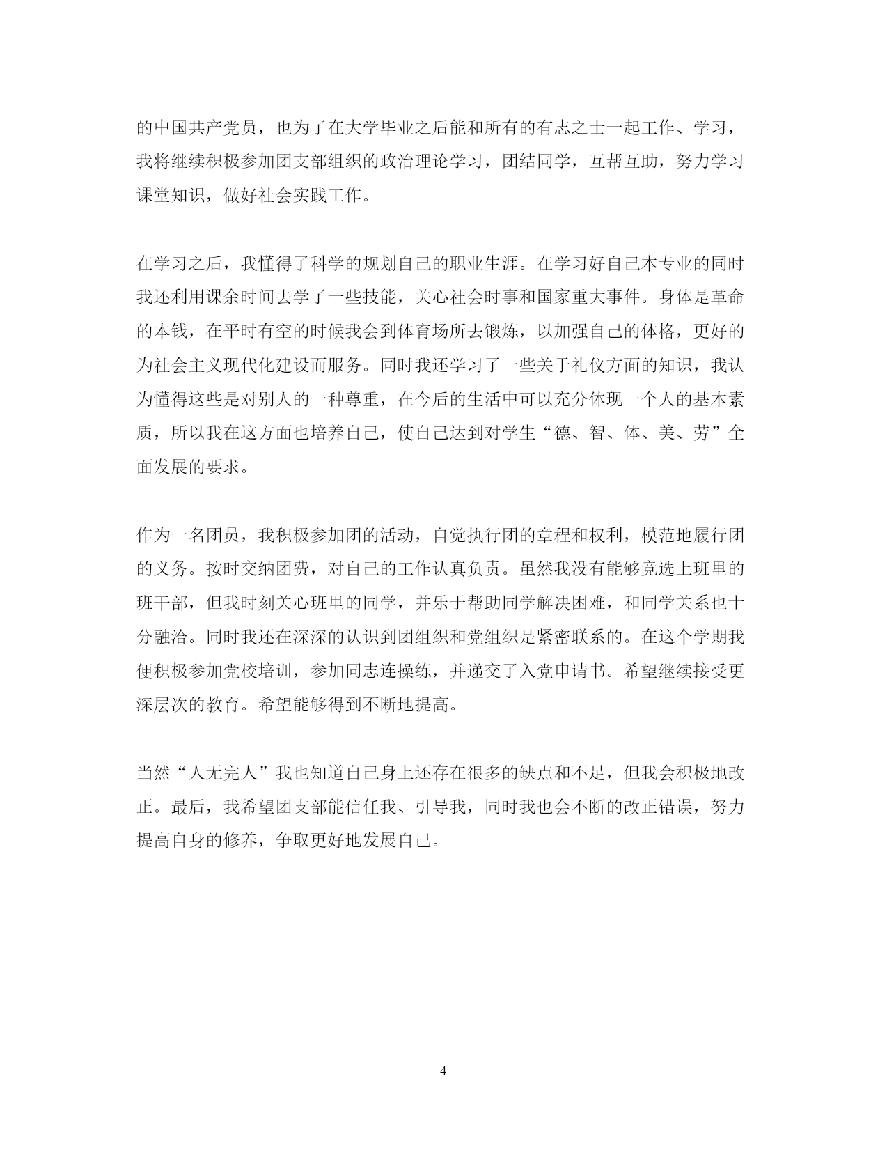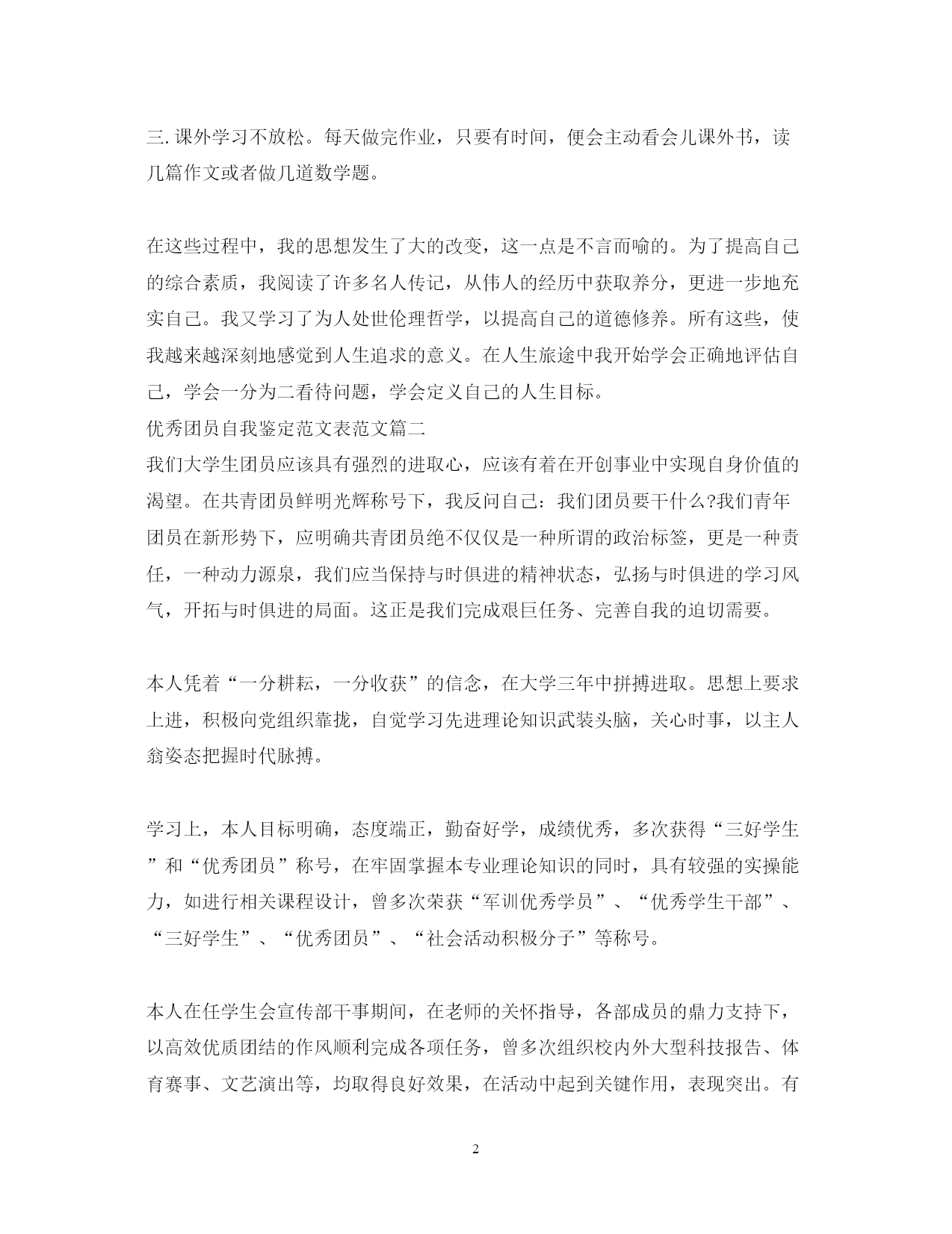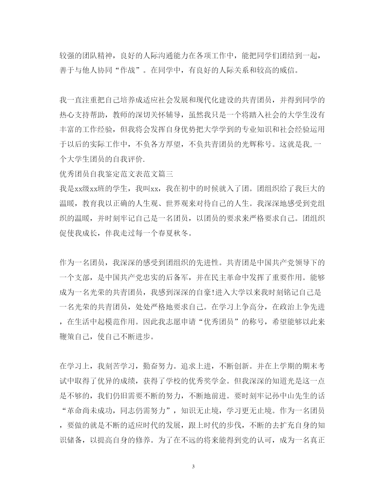 此资料由网络收集而来,如有侵权请告知上传者立即删除。资料共分享,我们负责传递知识。PAGEPAGE4优秀团员自我鉴定范文表范文团员要将学到的专业知识和社会经验运用于以后的实际工作中,不负各方厚望,不负共青团员的光辉称号。以下是范文网小编整理的3篇优秀团员自我鉴定范文表范文,仅供参考,希望对大家有所帮助。优秀团员自我鉴定范文表范文篇一初三的第一个学期结束了。在这个学期里,老师为我们的学习和成长付出了许多心血,我也为自己的学习付出了努力。作为一个团员,过去的半年,学习中我注意总结、思考,认认真真看书,及时的预习,及时的总结自己不明白的问题,日常生活中,我注意团结同学,尊敬老师,爱护公物,积极打扫卫生,积极参加各种学校举办的活动。过去的半年,我继续着为国做贡献的思想。努力学习,积极锻炼身体,为我即将开始的新学年打好知识基础,身体基础。可我需要更好的鞭策自己,参加了光荣的中国共青团以后,使我的思想基础更加牢固!总结这个学期的学习,主要有以下几个方面。一.学习态度比较端正。能够做到上课认真听讲,积极发言,自觉遵守课堂纪律,不跟同学交头接耳,不做小动作;对老师布置的作业,能够认真完成;对不懂的问题,能主动向同学和老师请教。二.认真做好课前预习和课后复习。上课时有不懂和不明白的问题敢于举手提问;在家做作业中遇到做错和不会做的,让家长给讲一讲;经常把以前做错的题拿出来复习,直到弄懂弄会。三.课外学习不放松。每天做完作业,只要有时间,便会主动看会儿课外书,读几篇作文或者做几道数学题。在这些过程中,我的思想发生了大的改变,这一点是不言而喻的。为了提高自己的综合素质,我阅读了许多名人传记,从伟人的经历中获取养分,更进一步地充实自己。我又学习了为人处世伦理哲学,以提高自己的道德修养。所有这些,使我越来越深刻地感觉到人生追求的意义。在人生旅途中我开始学会正确地评估自己,学会一分为二看待问题,学会定义自己的人生目标。优秀团员自我鉴定范文表范文篇二我们大学生团员应该具有强烈的进取心,应该有着在开创事业中实现自身价值的渴望。在共青团员鲜明光辉称号下,我反问自己:我们团员要干什么?我们青年团员在新形势下,应明确共青团员绝不仅仅是一种所谓的政治标签,更是一种责任,一种动力源泉,我们应当保持与时俱进的精神状态,弘扬与时俱进的学习风气,开拓与时俱进的局面。这正是我们完成艰巨任务、完善自我的迫切需要。本人凭着“一分耕耘,一分收获”的信念,在大学三年中拼搏进取。思想上要求上进,积极向党组织靠拢,自觉学习先进理论知识武装头脑,关心时事,以主人翁姿态把握时代脉搏。学习上,本人目标明确,态度端正,勤奋好学,成绩优秀,多次获得“三好学生”和“优秀团员”称号,在牢固掌握本专业理论知识的同时,具有较强的实操能力,如进行相关课程设计,曾多次荣获“军训优秀学员”、“优秀学生干部”、“三好学生”、“优秀团员”、“社会活动积极分子”等称号。本人在任学生会宣传部干事期间,在老师的关怀指导,各部成员的鼎力支持下,以高效优质团结的作风顺利完成各项任务,曾多次组织校内外大型科技报告、体育赛事、文艺演出等,均取得良好效果,在活动中起到关键作用,表现突出。有较强的团队精神,良好的人际沟通能力在各项工作中,能把同学们团结到一起,善于与他人协同“作战”。在同学中,有良好的人际关系和较高的威信。我一直注重把自己培养成适应社会发展和现代化建设的共青团员,并得到同学的热心支持帮助,教师的深切关怀辅导,虽然我只是一个将踏入社会的大学生没有丰富的工作经验,但我将会发挥自身优势把大学学到的专业知识和社会经验运用于以后的实际工作中,不负各方厚望,不负共青团员的光辉称号。这就是我,一个大学生团员的自我评价.优秀团员自我鉴定范文表范文篇三我是xx级xx班的学生,我叫xx,我在初中的时候就入了团。团组织给了我巨大的温暖,教育我以正确的人生观、世界观来对待自己的人生。我深深地感受到党组织的温暖,并时刻牢记自己是一名团员,以团员的要求来严格要求自己。团组织促使我成长,伴我走过每一个春夏秋冬。作为一名团员,我深深的感受到团组织的先进性。共青团是中国共产党领导下的一个支部,是中国共产党忠实的后备军,并在民主革命中发挥了重要作用。能够成为一名光荣的共青团员,我感到深深的自豪!进入大学以来我时刻铭记自己是一名光荣的共青团员,处处严格地要求自己。在学习上争高分,在政治上争先进,在生活中起模范作用。因此我志愿申请“优秀团员”的称号,希望能够以此来鞭策自己,使自己不断进步。在学习上,我刻苦学习,勤奋努力。追求上进,不断创新。并在上学期的期末考试中取得了优异的成绩,获得了学校的优秀奖学金。但我深深的知道光是这一点是不够的,我们仍旧需要不断的努力,不断地前进。要时刻牢记孙中山先生的话“革命尚
