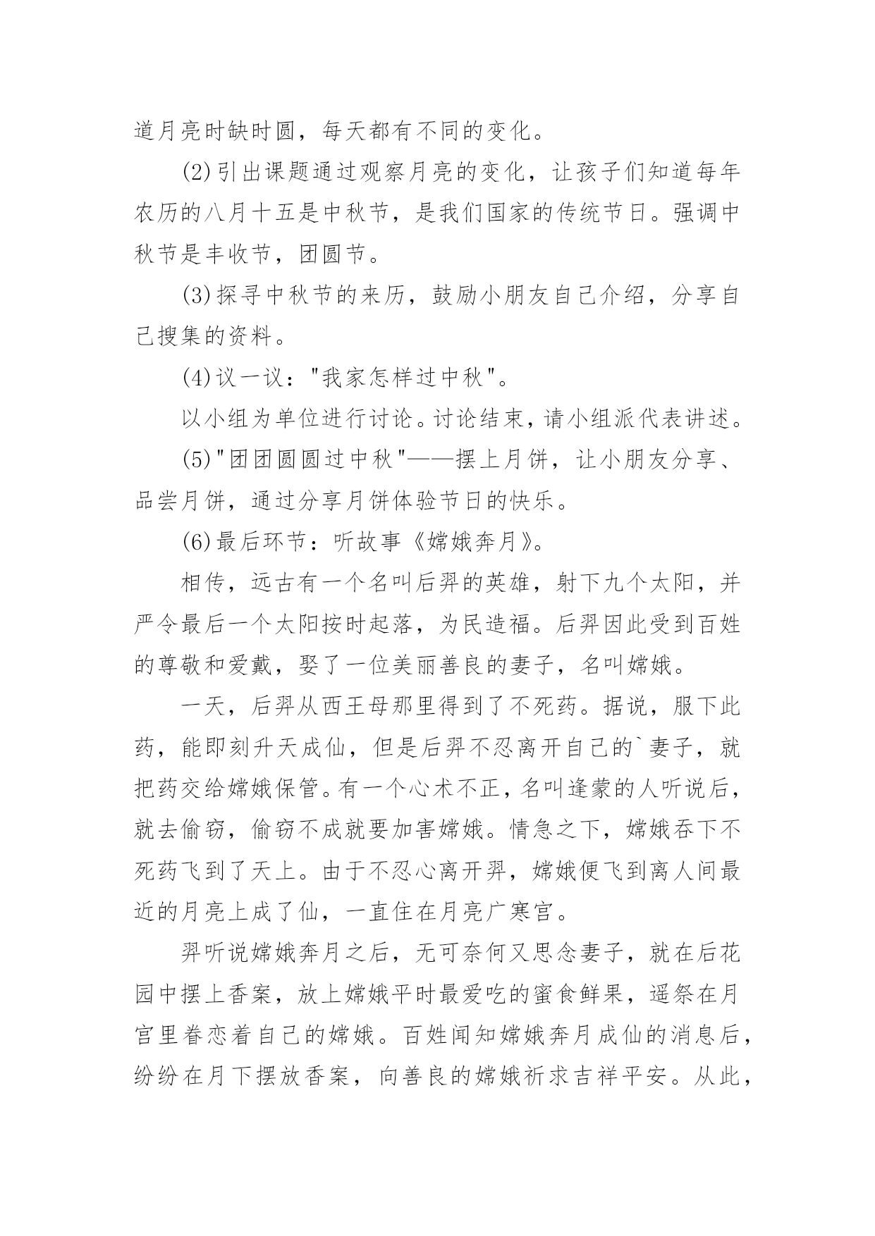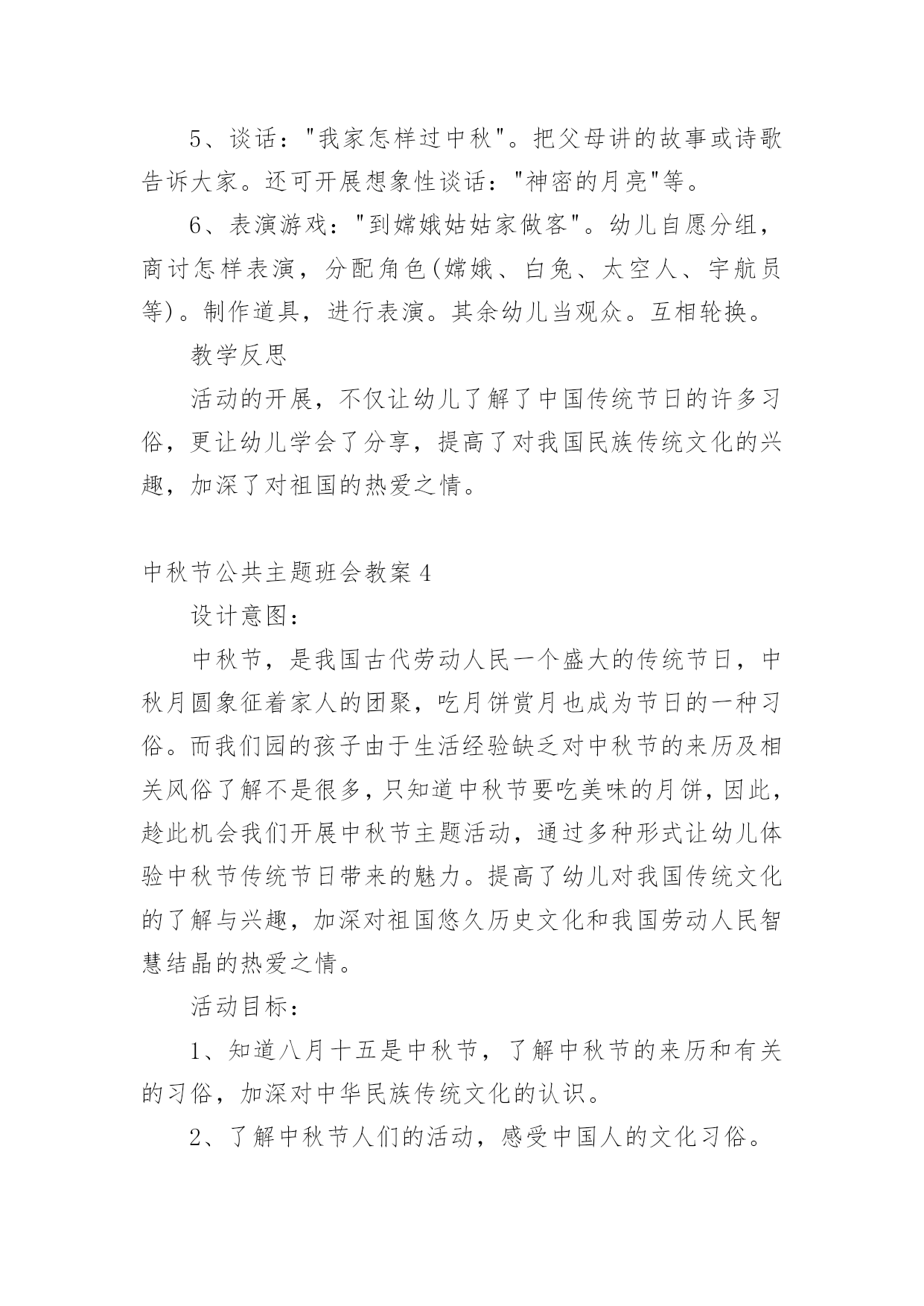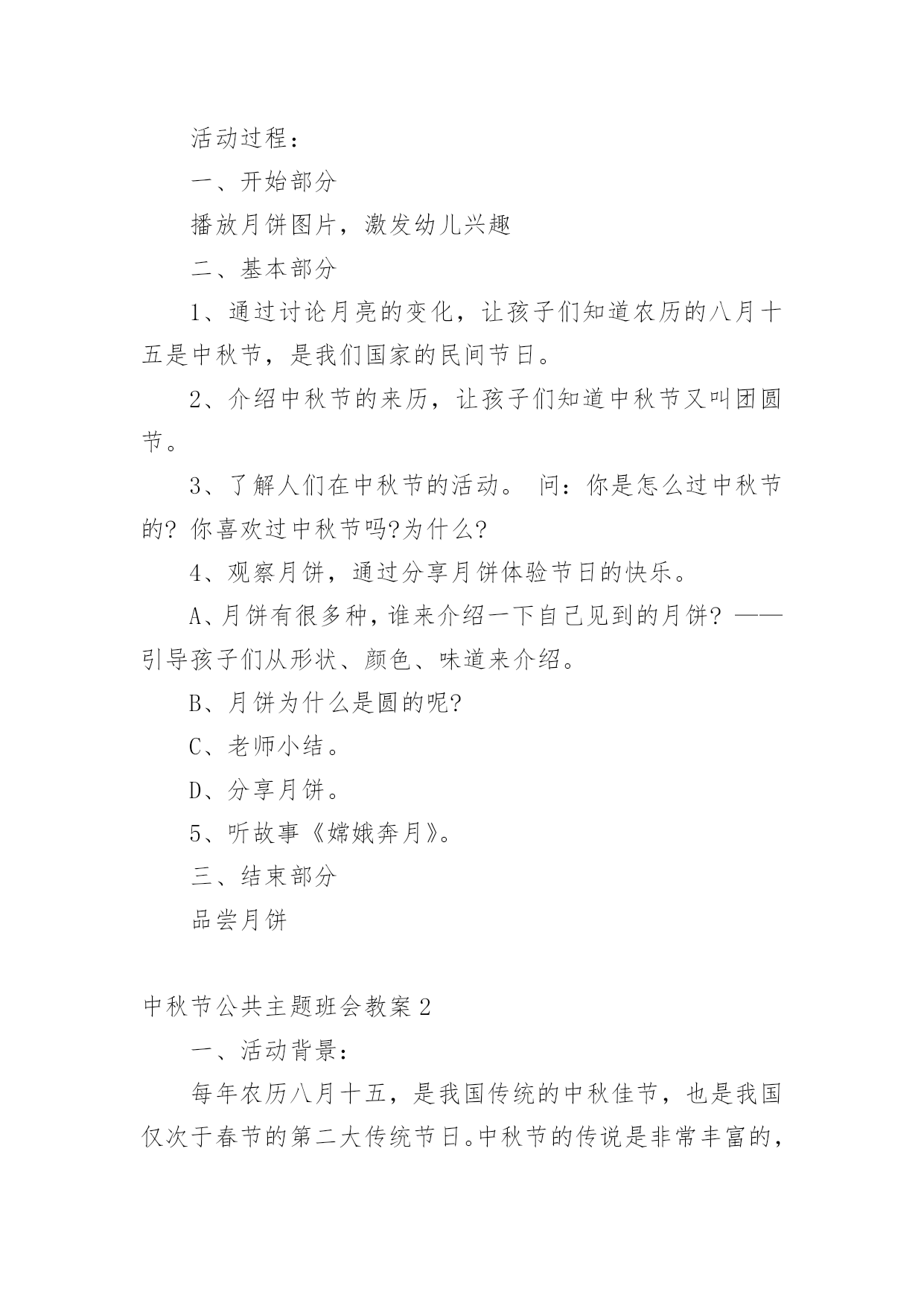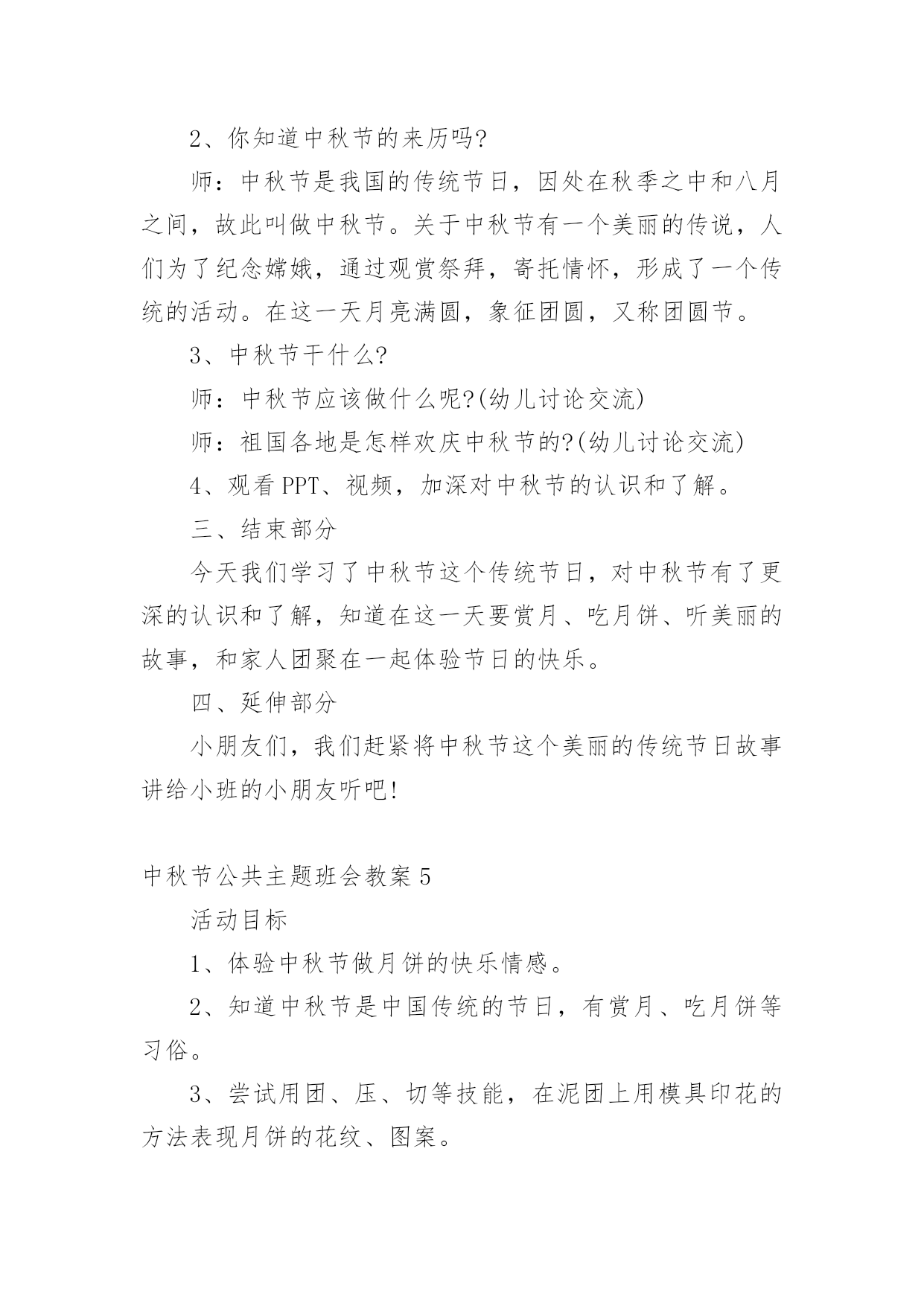 中秋节公共主题班会教案中秋节公共主题班会教案范文(通用5篇)作为一名专为他人授业解惑的人民教师,通常需要用到教案来辅助教学,借助教案可以更好地组织教学活动。那么写教案需要注意哪些问题呢?以下是小编收集整理的中秋节公共主题班会教案范文(通用5篇),希望对大家有所帮助。中秋节公共主题班会教案1活动内容:认识中秋节活动目标1、知道每年的农历八月十五是中秋节,体验民族节日的.快乐。2、喜欢民族节日,了解简单的节日风俗和有关的民间传说。3、知道吃月饼的意义,体会分享的愉快,了解简单的节日风俗和有关的民间传说。活动重、难点:知道每年的农历八月十五是中秋节活动准备:1、月饼图片。2、民间故事《嫦娥奔月》活动过程:一、开始部分播放月饼图片,激发幼儿兴趣二、基本部分1、通过讨论月亮的变化,让孩子们知道农历的八月十五是中秋节,是我们国家的民间节日。2、介绍中秋节的来历,让孩子们知道中秋节又叫团圆节。3、了解人们在中秋节的活动。问:你是怎么过中秋节的?你喜欢过中秋节吗?为什么?4、观察月饼,通过分享月饼体验节日的快乐。A、月饼有很多种,谁来介绍一下自己见到的月饼?——引导孩子们从形状、颜色、味道来介绍。B、月饼为什么是圆的呢?C、老师小结。D、分享月饼。5、听故事《嫦娥奔月》。三、结束部分品尝月饼中秋节公共主题班会教案2一、活动背景:每年农历八月十五,是我国传统的中秋佳节,也是我国仅次于春节的第二大传统节日。中秋节的传说是非常丰富的,嫦娥奔月、吴刚伐桂、玉兔捣药之类的神话故事流传甚广。中秋节的习俗也很多,中华民族的节日有很多,中秋节是中华民族的传统节日。"月到中秋分外明",大班幼儿对其有深厚的兴趣及探究欲望。时值中秋节的来临之际,为了提高孩子们对我国民族传统文化的了解与兴趣,加深对祖国悠久历史文化和我国劳动人民智慧结晶的热爱之情。由此,我开展了此主题。二、活动目标:1、初步了解了解中秋节的来历,感受体验传统文化;2、通过讨论和讲述,发展幼儿口语表达能力;3、让幼儿体验和伙伴老师一起过节日的快乐并学会分享;4、通过观察、记录月亮的变化,培养幼儿的观察能力及思维能力。三、活动准备:1、教师和幼儿一起创设反映中秋节的环境,如张贴有关中秋节的挂图;2、家长帮助孩子搜集关于中秋节的资料,并为孩子准备一块月饼;3、关于中秋节前后月亮变化的幻灯片及民间故事《嫦娥奔月》四、活动过程:(1)导入给小朋友展示关于中秋节前后月亮变化的幻灯片,激发幼儿兴趣。让小朋友通过观察、记录月亮变化,知道月亮时缺时圆,每天都有不同的变化。(2)引出课题通过观察月亮的变化,让孩子们知道每年农历的八月十五是中秋节,是我们国家的传统节日。强调中秋节是丰收节,团圆节。(3)探寻中秋节的来历,鼓励小朋友自己介绍,分享自己搜集的资料。(4)议一议:"我家怎样过中秋"。以小组为单位进行讨论。讨论结束,请小组派代表讲述。(5)"团团圆圆过中秋"——摆上月饼,让小朋友分享、品尝月饼,通过分享月饼体验节日的快乐。(6)最后环节:听故事《嫦娥奔月》。相传,远古有一个名叫后羿的英雄,射下九个太阳,并严令最后一个太阳按时起落,为民造福。后羿因此受到百姓的尊敬和爱戴,娶了一位美丽善良的妻子,名叫嫦娥。一天,后羿从西王母那里得到了不死药。据说,服下此药,能即刻升天成仙,但是后羿不忍离开自己的`妻子,就把药交给嫦娥保管。有一个心术不正,名叫逢蒙的人听说后,就去偷窃,偷窃不成就要加害嫦娥。情急之下,嫦娥吞下不死药飞到了天上。由于不忍心离开羿,嫦娥便飞到离人间最近的月亮上成了仙,一直住在月亮广寒宫。羿听说嫦娥奔月之后,无可奈何又思念妻子,就在后花园中摆上香案,放上嫦娥平时最爱吃的蜜食鲜果,遥祭在月宫里眷恋着自己的嫦娥。百姓闻知嫦娥奔月成仙的消息后,纷纷在月下摆放香案,向善良的嫦娥祈求吉祥平安。从此,中秋节拜月的风俗在民间传开。教学反思:中秋佳节是我们中国一个传统的重大节日,一年一度的中秋佳节,是孩子们观赏月亮,品尝月饼,学习分享的大好时机。为了使孩子们感受民族传统文化之美,活动前让孩子们自己和家长一起买月饼,带月饼到幼儿园,并请家长们配合晚上和幼儿在家一起观赏美丽的月光。中秋节公共主题班会教案3活动目标:了解中秋节的来历和有关习俗;体验分享祥和的欢乐。简单了解节日的来历,知道其全称、日期和意义。知道节日时人们主要的庆祝活动。活动准备:月饼,各种水果。活动过程:1、环境创设。和幼儿一起布置中秋的大型壁画,其中有月亮的变化、宫灯,月亮的传说故事。2、讲有关中秋节的传说。强调中秋节是丰收节,团圆节。3、"团团圆圆过中秋"。摆上月饼和水果,师生一起品尝。4、请幼儿晚上与家人一起观赏中秋的月亮,并讲一个关于月亮的故事或教给幼儿一首有关月亮、中秋的.古诗。5、谈话:"我家怎样过中秋"。把父母讲的故事或诗歌告诉大家。还可开展想象