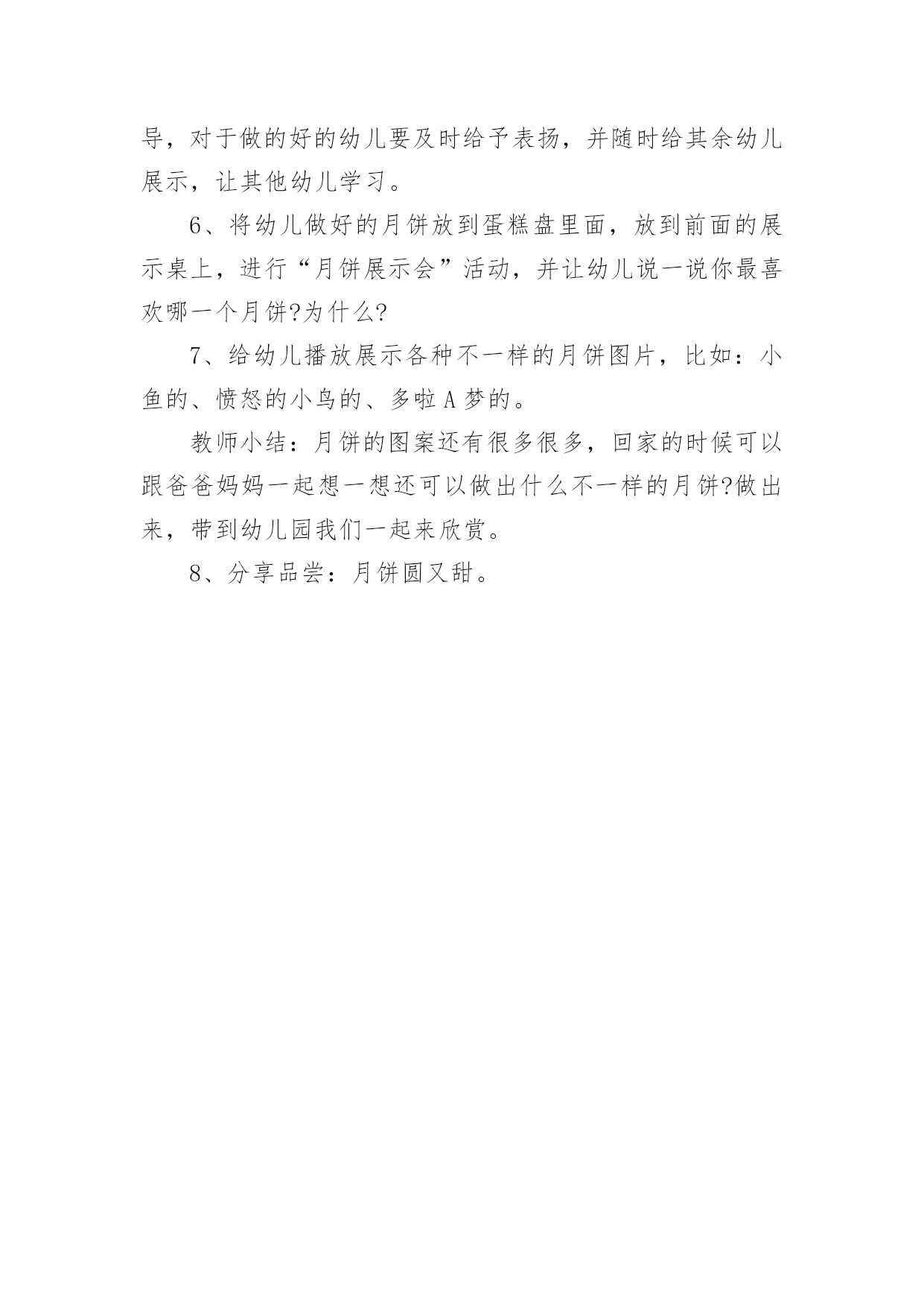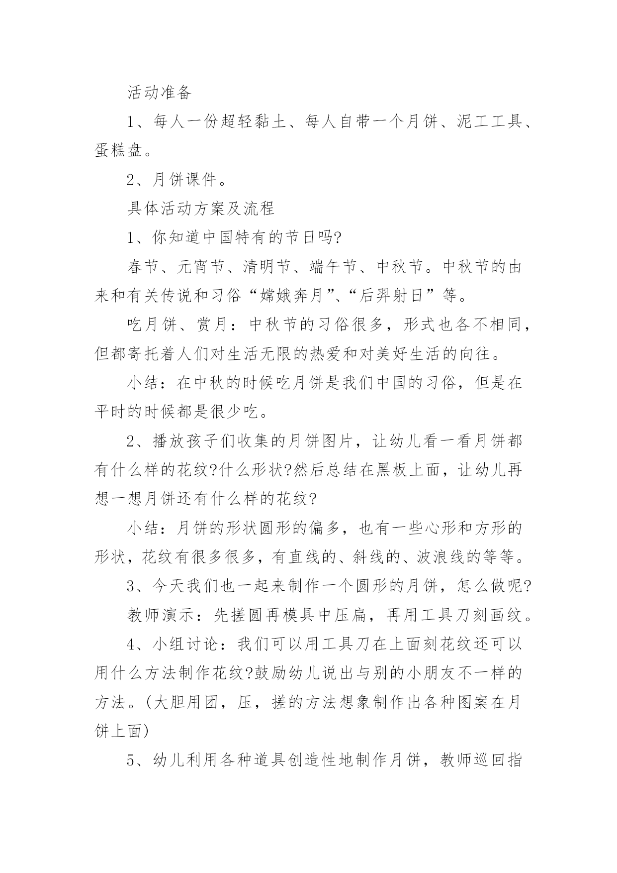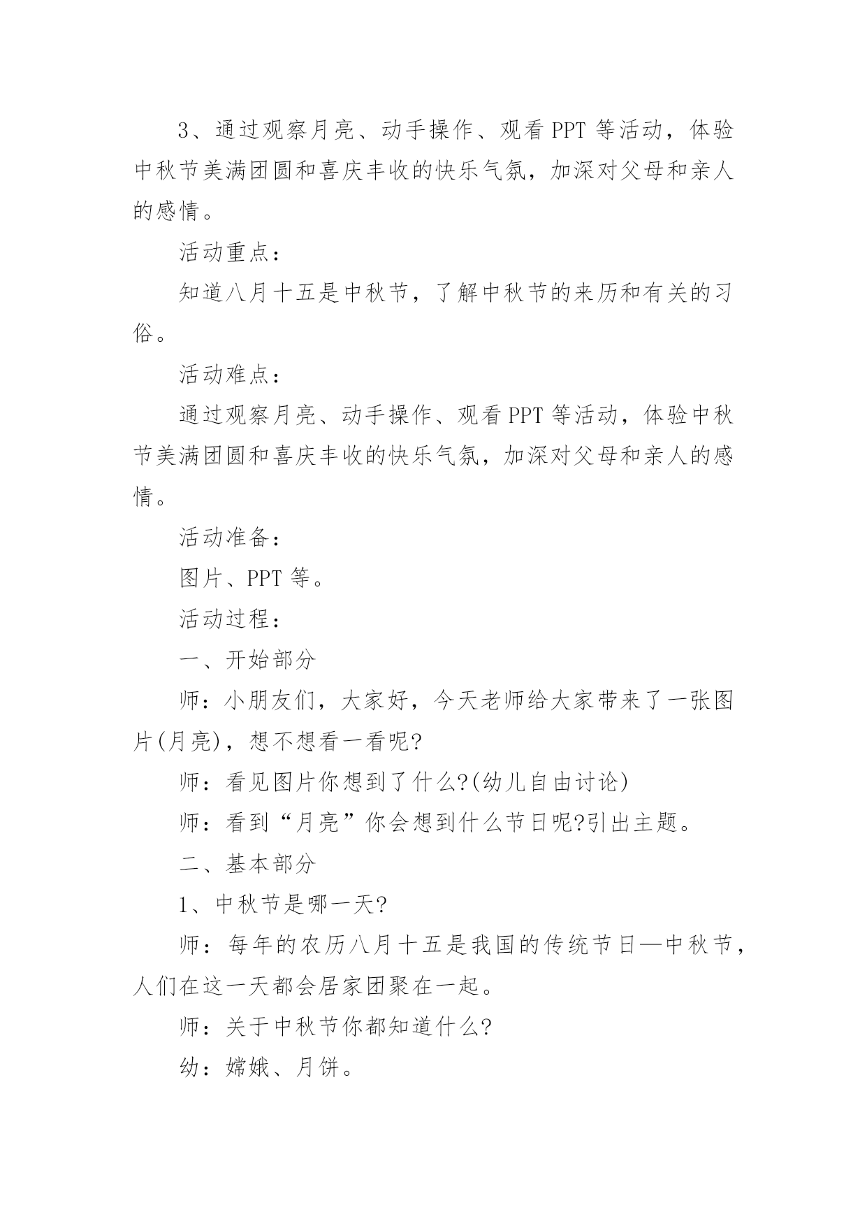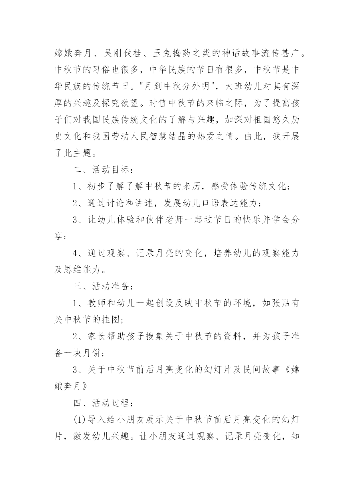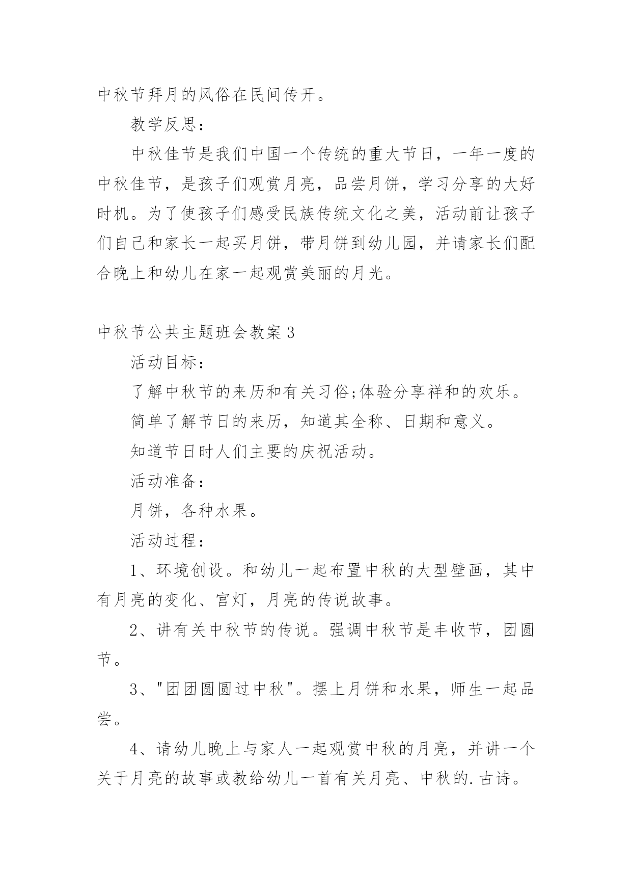 中秋节公共主题班会教案中秋节公共主题班会教案范文(通用5篇)作为一名专为他人授业解惑的人民教师,通常需要用到教案来辅助教学,借助教案可以更好地组织教学活动。那么写教案需要注意哪些问题呢?以下是小编收集整理的中秋节公共主题班会教案范文(通用5篇),希望对大家有所帮助。中秋节公共主题班会教案1活动内容:认识中秋节活动目标1、知道每年的农历八月十五是中秋节,体验民族节日的.快乐。2、喜欢民族节日,了解简单的节日风俗和有关的民间传说。3、知道吃月饼的意义,体会分享的愉快,了解简单的节日风俗和有关的民间传说。活动重、难点:知道每年的农历八月十五是中秋节活动准备:1、月饼图片。2、民间故事《嫦娥奔月》活动过程:一、开始部分播放月饼图片,激发幼儿兴趣二、基本部分1、通过讨论月亮的变化,让孩子们知道农历的八月十五是中秋节,是我们国家的民间节日。2、介绍中秋节的来历,让孩子们知道中秋节又叫团圆节。3、了解人们在中秋节的活动。问:你是怎么过中秋节的?你喜欢过中秋节吗?为什么?4、观察月饼,通过分享月饼体验节日的快乐。A、月饼有很多种,谁来介绍一下自己见到的月饼?——引导孩子们从形状、颜色、味道来介绍。B、月饼为什么是圆的呢?C、老师小结。D、分享月饼。5、听故事《嫦娥奔月》。三、结束部分品尝月饼中秋节公共主题班会教案2一、活动背景:每年农历八月十五,是我国传统的中秋佳节,也是我国仅次于春节的第二大传统节日。中秋节的传说是非常丰富的,嫦娥奔月、吴刚伐桂、玉兔捣药之类的神话故事流传甚广。中秋节的习俗也很多,中华民族的节日有很多,中秋节是中华民族的传统节日。"月到中秋分外明",大班幼儿对其有深厚的兴趣及探究欲望。时值中秋节的来临之际,为了提高孩子们对我国民族传统文化的了解与兴趣,加深对祖国悠久历史文化和我国劳动人民智慧结晶的热爱之情。由此,我开展了此主题。二、活动目标:1、初步了解了解中秋节的来历,感受体验传统文化;2、通过讨论和讲述,发展幼儿口语表达能力;3、让幼儿体验和伙伴老师一起过节日的快乐并学会分享;4、通过观察、记录月亮的变化,培养幼儿的观察能力及思维能力。三、活动准备:1、教师和幼儿一起创设反映中秋节的环境,如张贴有关中秋节的挂图;2、家长帮助孩子搜集关于中秋节的资料,并为孩子准备一块月饼;3、关于中秋节前后月亮变化的幻灯片及民间故事《嫦娥奔月》四、活动过程:(1)导入给小朋友展示关于中秋节前后月亮变化的幻灯片,激发幼儿兴趣。让小朋友通过观察、记录月亮变化,知道月亮时缺时圆,每天都有不同的变化。(2)引出课题通过观察月亮的变化,让孩子们知道每年农历的八月十五是中秋节,是我们国家的传统节日。强调中秋节是丰收节,团圆节。(3)探寻中秋节的来历,鼓励小朋友自己介绍,分享自己搜集的资料。(4)议一议:"我家怎样过中秋"。以小组为单位进行讨论。讨论结束,请小组派代表讲述。(5)"团团圆圆过中秋"——摆上月饼,让小朋友分享、品尝月饼,通过分享月饼体验节日的快乐。(6)最后环节:听故事《嫦娥奔月》。相传,远古有一个名叫后羿的英雄,射下九个太阳,并严令最后一个太阳按时起落,为民造福。后羿因此受到百姓的尊敬和爱戴,娶了一位美丽善良的妻子,名叫嫦娥。一天,后羿从西王母那里得到了不死药。据说,服下此药,能即刻升天成仙,但是后羿不忍离开自己的`妻子,就把药交给嫦娥保管。有一个心术不正,名叫逢蒙的人听说后,就去偷窃,偷窃不成就要加害嫦娥。情急之下,嫦娥吞下不死药飞到了天上。由于不忍心离开羿,嫦娥便飞到离人间最近的月亮上成了仙,一直住在月亮广寒宫。羿听说嫦娥奔月之后,无可奈何又思念妻子,就在后花园中摆上香案,放上嫦娥平时最爱吃的蜜食鲜果,遥祭在月宫里眷恋着自己的嫦娥。百姓闻知嫦娥奔月成仙的消息后,纷纷在月下摆放香案,向善良的嫦娥祈求吉祥平安。从此,中秋节拜月的风俗在民间传开。教学反思:中秋佳节是我们中国一个传统的重大节日,一年一度的中秋佳节,是孩子们观赏月亮,品尝月饼,学习分享的大好时机。为了使孩子们感受民族传统文化之美,活动前让孩子们自己和家长一起买月饼,带月饼到幼儿园,并请家长们配合晚上和幼儿在家一起观赏美丽的月光。中秋节公共主题班会教案3活动目标:了解中秋节的来历和有关习俗;体验分享祥和的欢乐。简单了解节日的来历,知道其全称、日期和意义。知道节日时人们主要的庆祝活动。活动准备:月饼,各种水果。活动过程:1、环境创设。和幼儿一起布置中秋的大型壁画,其中有月亮的变化、宫灯,月亮的传说故事。2、讲有关中秋节的传说。强调中秋节是丰收节,团圆节。3、"团团圆圆过中秋"。摆上月饼和水果,师生一起品尝。4、请幼儿晚上与家人一起观赏中秋的月亮,并讲一个关于月亮的故事或教给幼儿一首有关月亮、中秋的.古诗。5、谈话:"我家怎样过中秋"。把父母讲的故事或诗歌告诉大家。还可开展想象