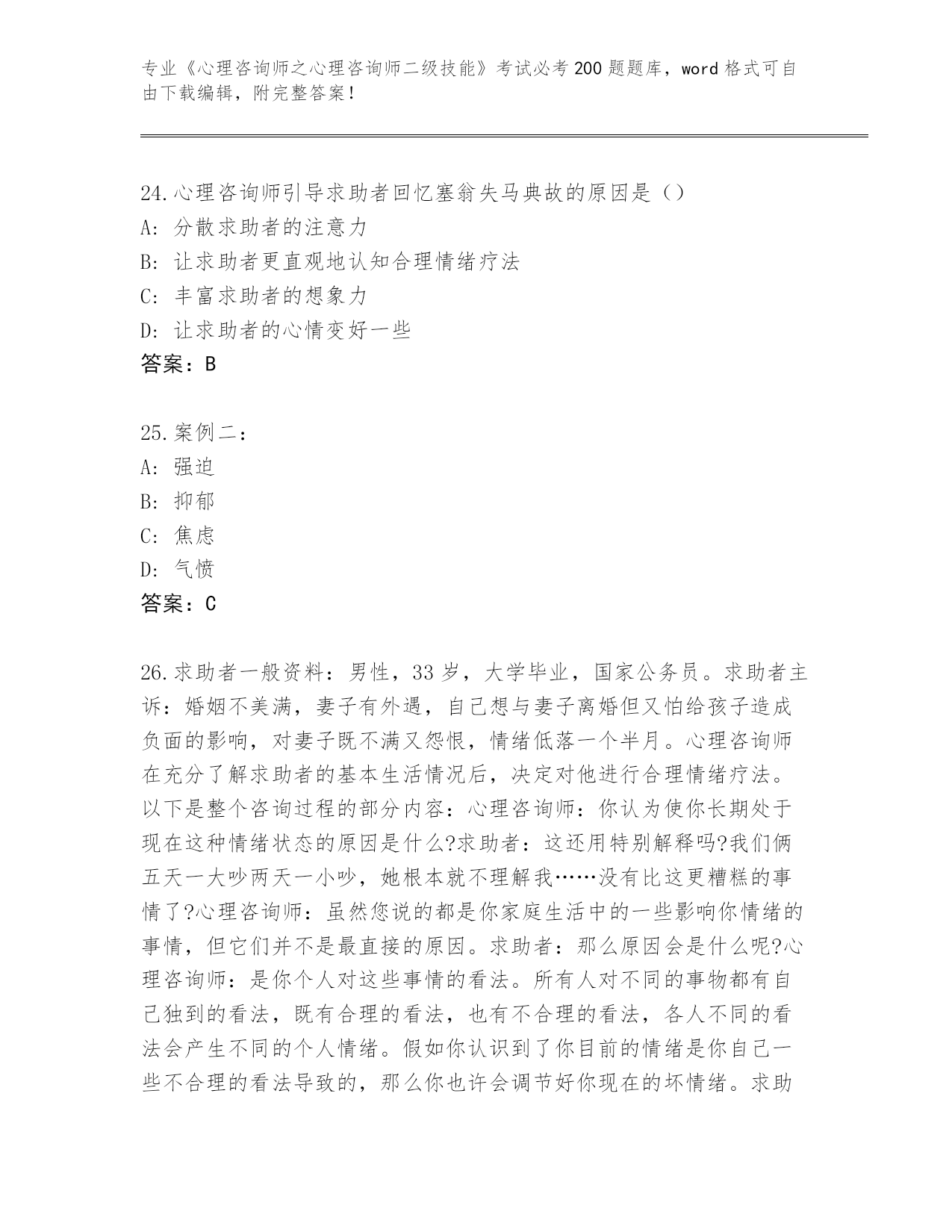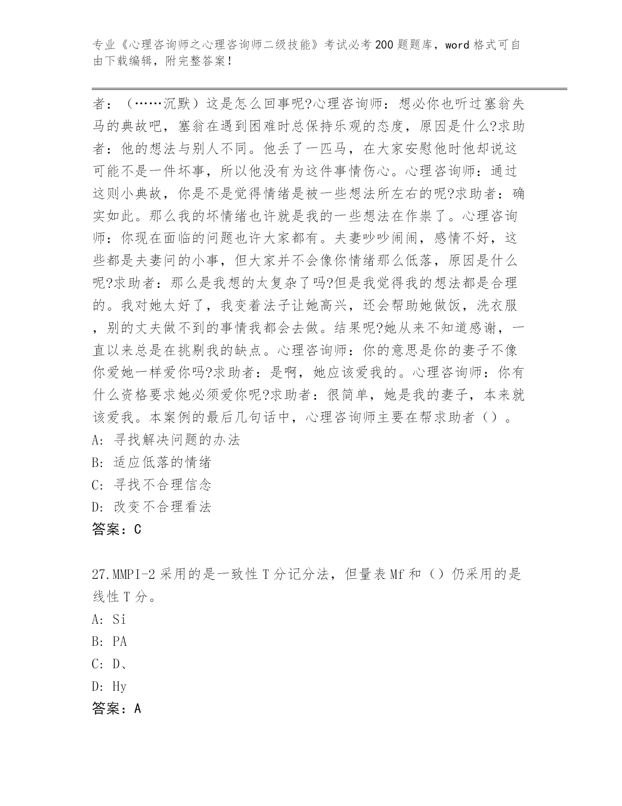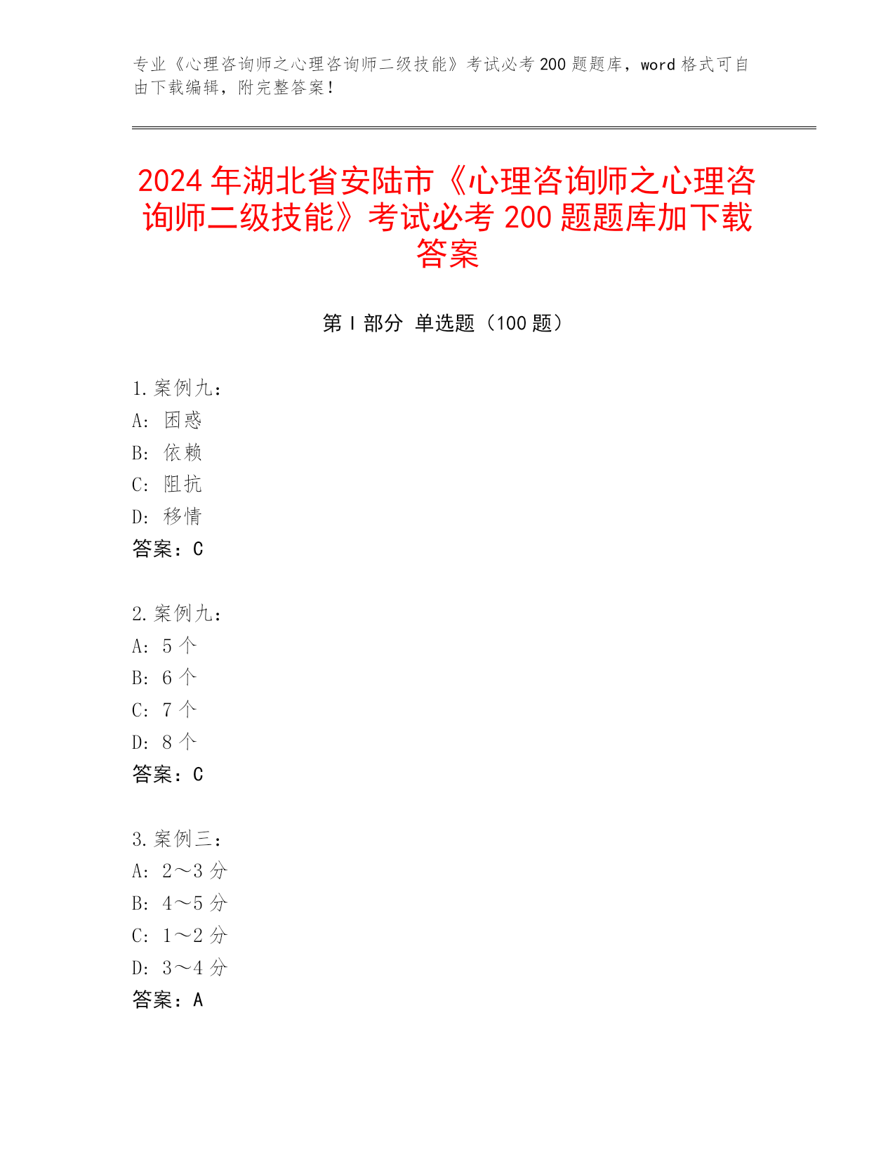 2024湖北省安陆市《心理咨询师之心理咨询师二级技能》考试必考200题题库往年题考