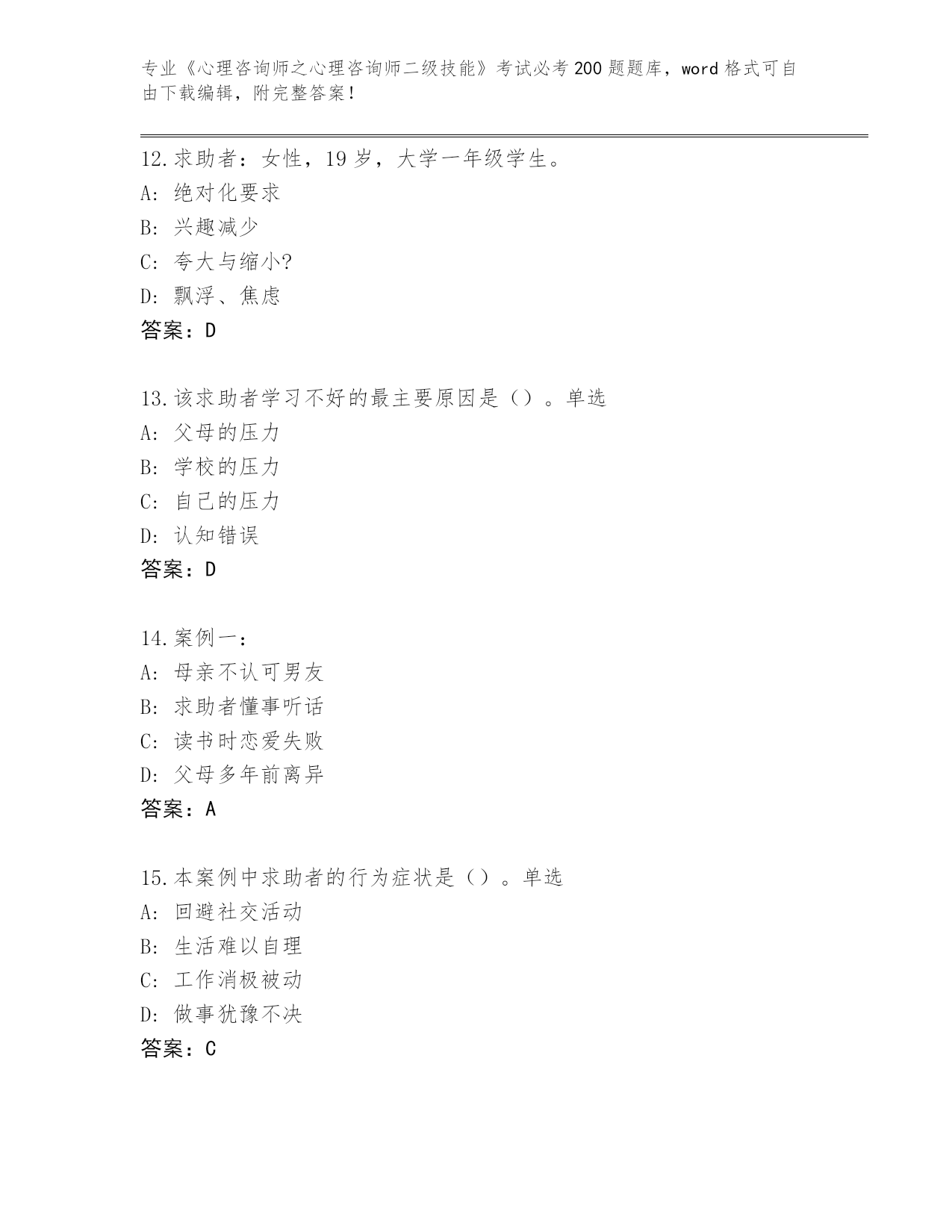 海南省《心理咨询师之心理咨询师二级技能》考试必考200题王牌题库加答案