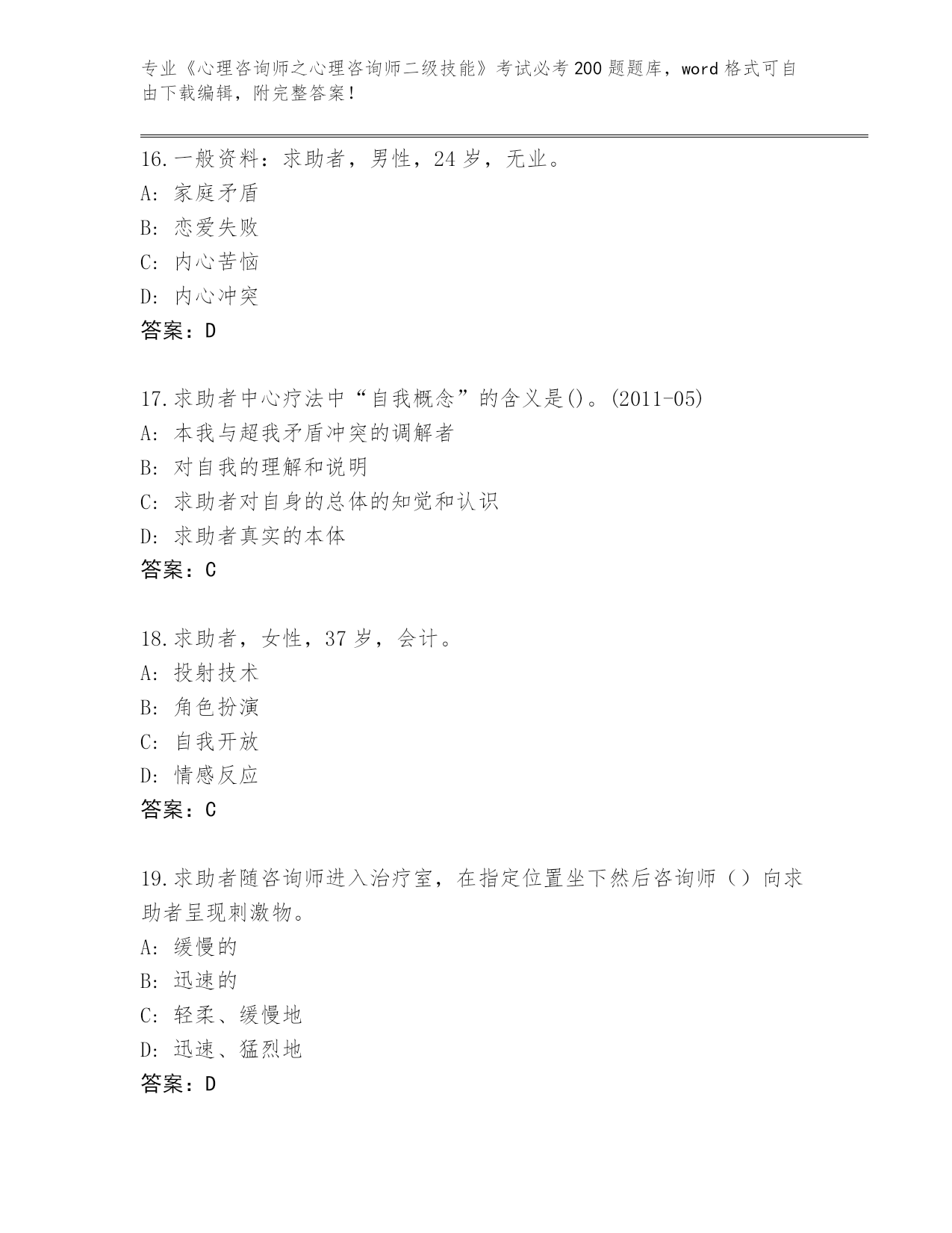 山东省《心理咨询师之心理咨询师二级技能》考试必考200题及下载答案