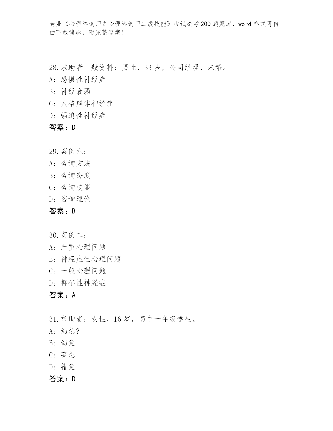 2024年湖北省通山县《心理咨询师之心理咨询师二级技能》考试必考200题题库下载答案