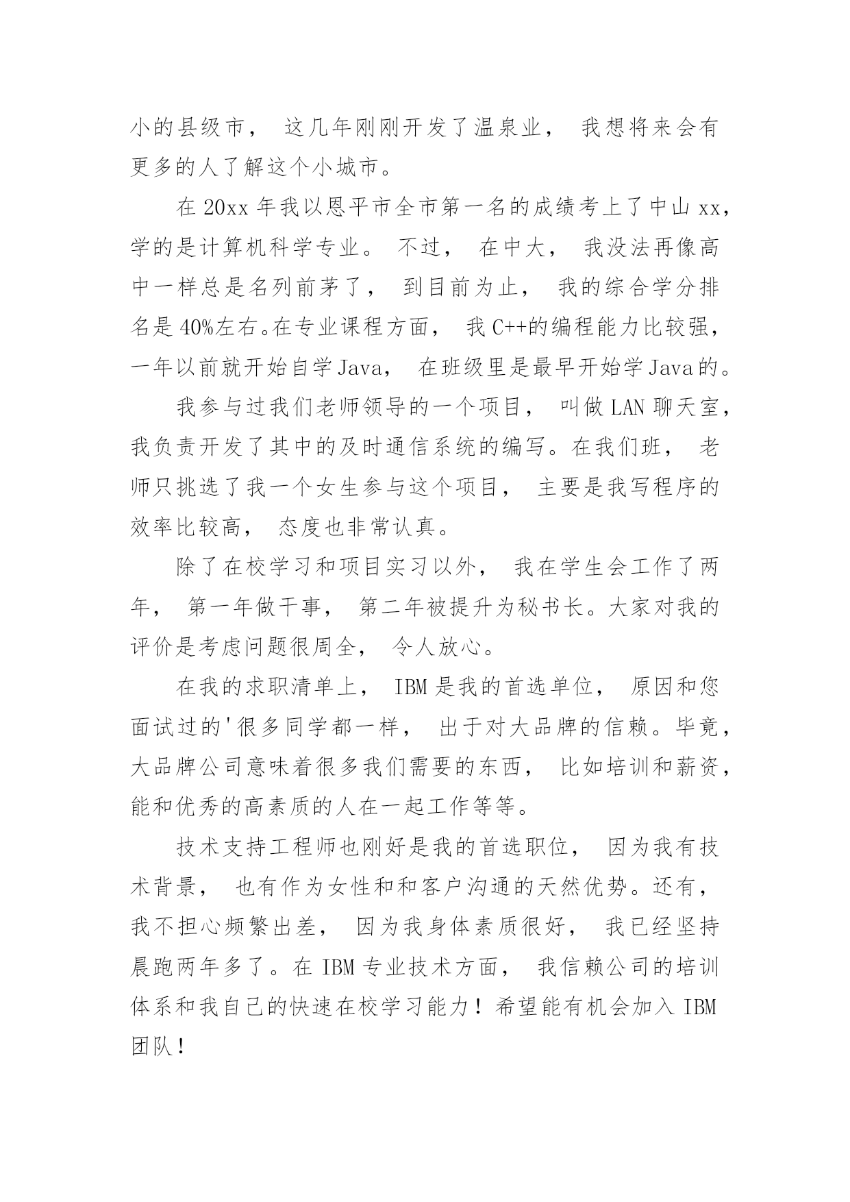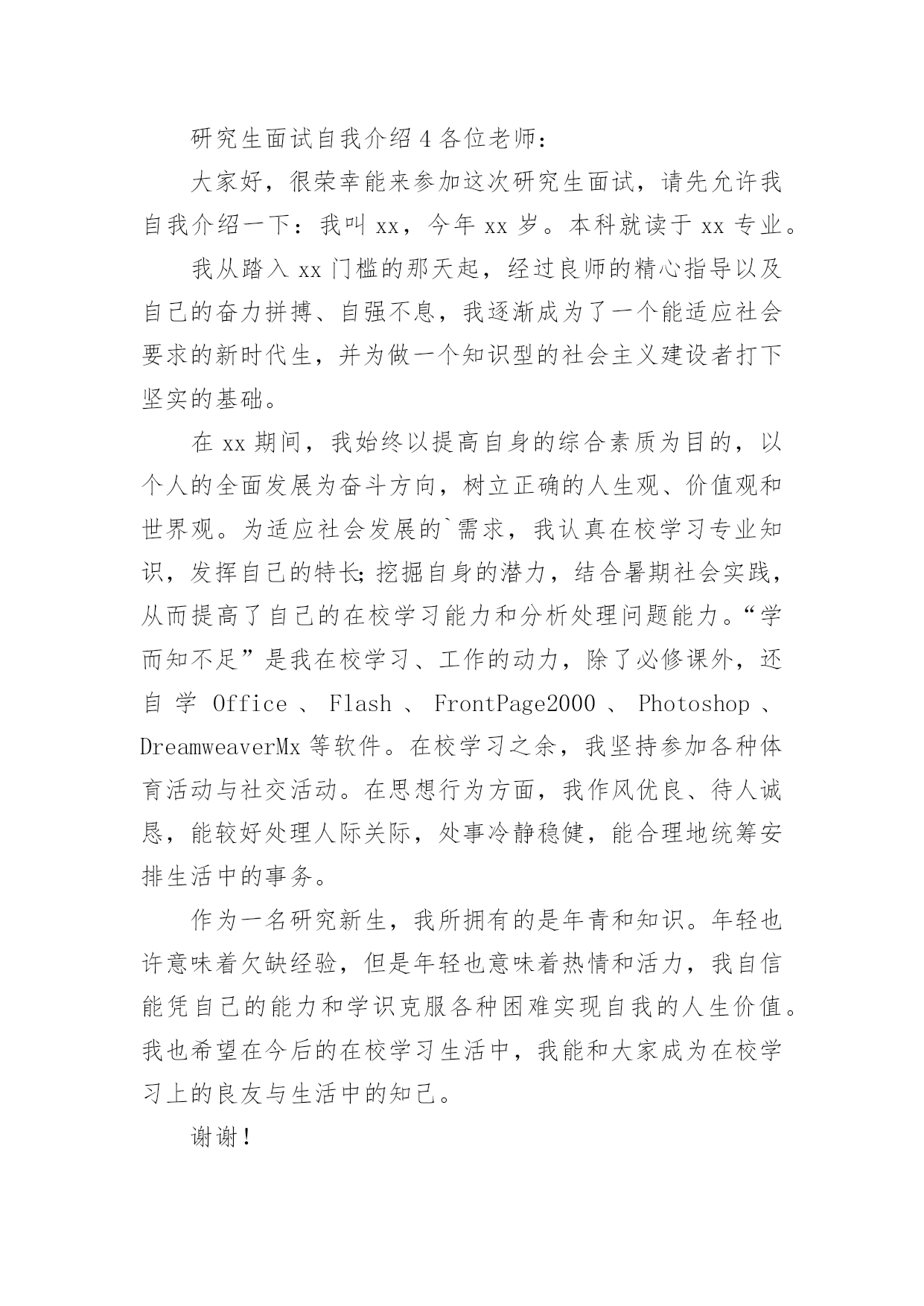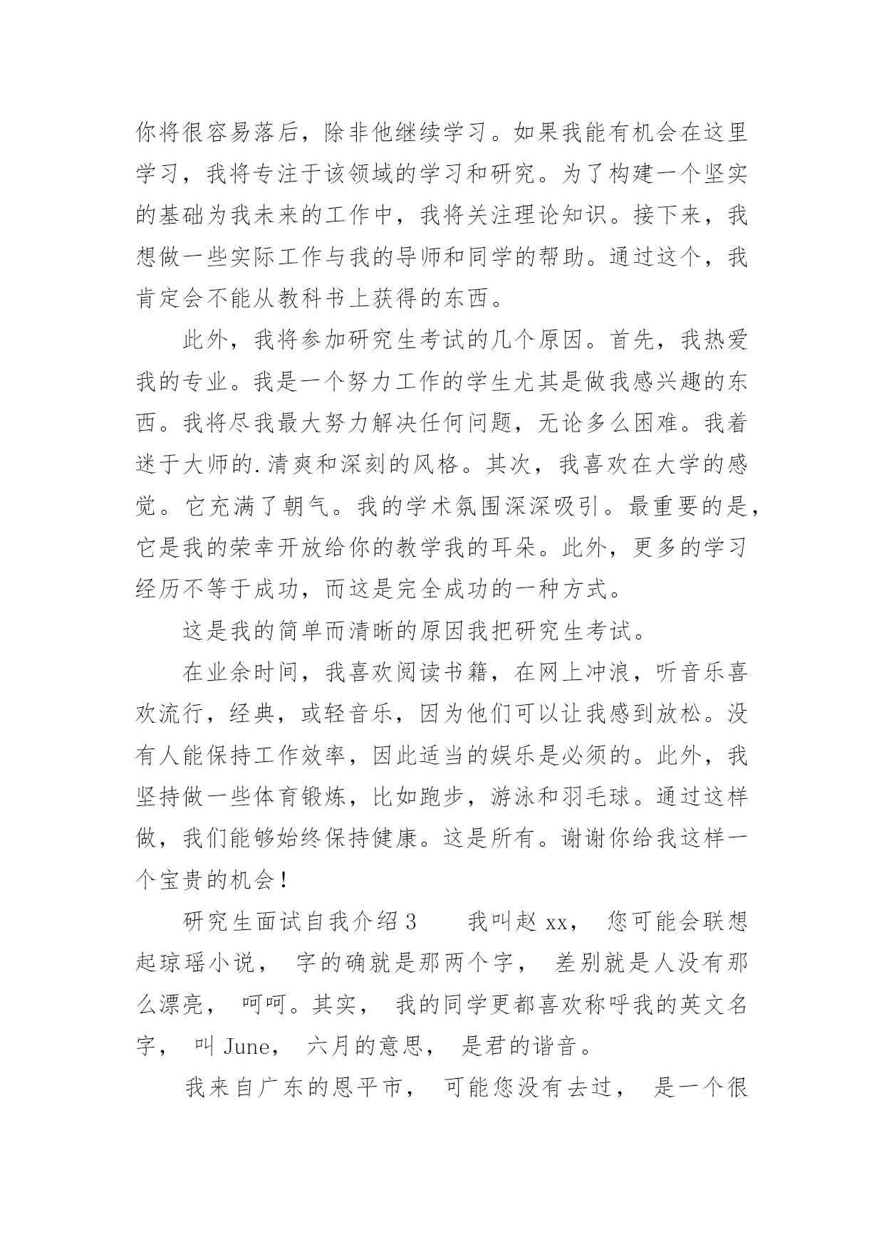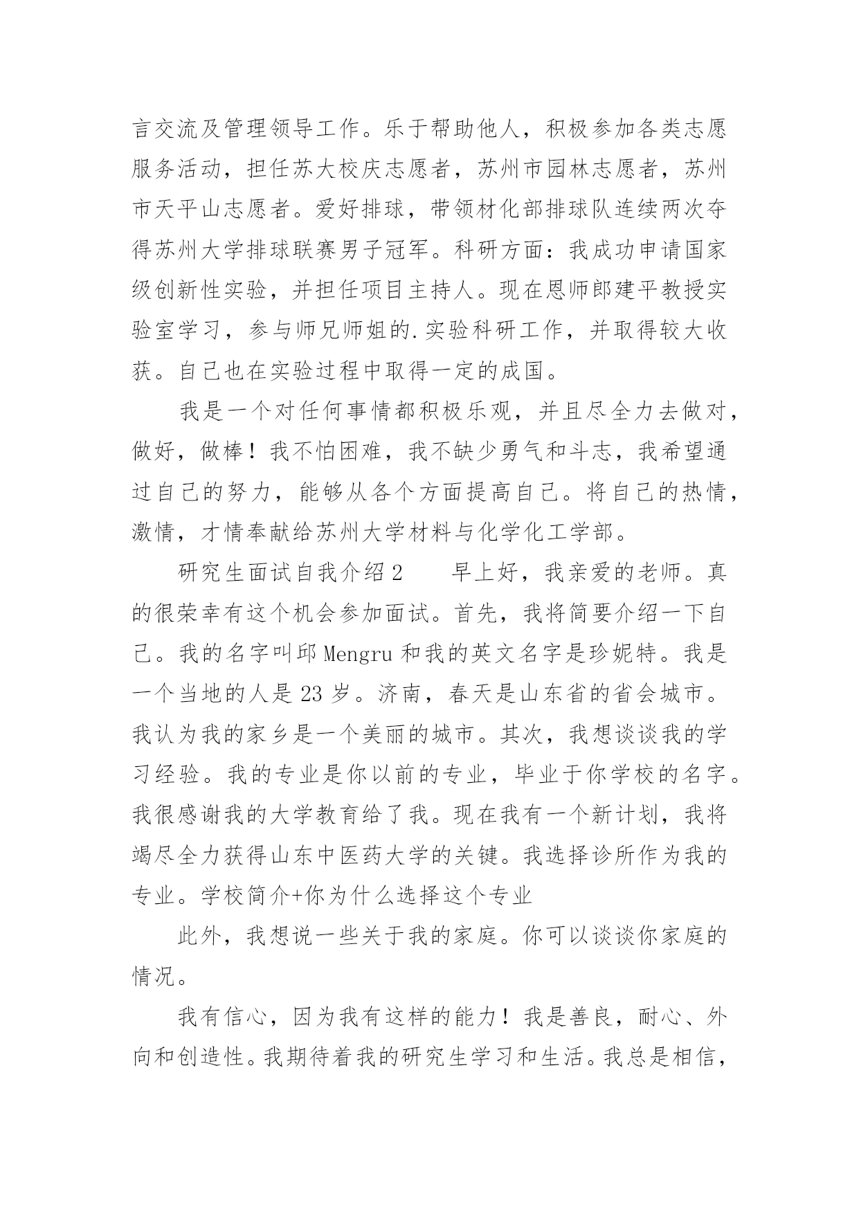 研究生面试自我介绍研究生面试自我介绍当换了一个新环境后,我们不得不需要向他人介绍自己,自我介绍是人与人进行沟通的出发点。相信许多人会觉得自我介绍很难写吧,以下是小编帮大家整理的研究生面试自我介绍,欢迎大家分享。研究生面试自我介绍1各位老师,同学:家好。我叫xxxx,来自苏州大学材料与化学化工学部09级化学班。非常荣幸能够有机会参加这次保研面试,我希望能够通过自己的努力成功进入材化部,完成即将而来的研究生学业。我来自江苏省扬州市,高中时期一直任班级班长,先后获得校三好生,扬州市三好生。大学期间,在学部领导、团委老师的关心下,同学们的帮助下,自己学会很多,收获很多。在学习方面:先后获得国家励志奖学金,苏州大学人民综合三等奖学金,国家助学金。在工作方面:曾担任材化部学生会主席,化学班副班长,组织参与学校、学部各类大型活动,认真负责元旦晚会各项工作。先后获得苏州大学优秀学生会干部,苏州大学暑期社会实践先进个人,苏州大学青年志愿服务先进个人,苏州大学优秀共青团员。在生活方面:我性格开朗,做事积极认真,善于沟通语言交流及管理领导工作。乐于帮助他人,积极参加各类志愿服务活动,担任苏大校庆志愿者,苏州市园林志愿者,苏州市天平山志愿者。爱好排球,带领材化部排球队连续两次夺得苏州大学排球联赛男子冠军。科研方面:我成功申请国家级创新性实验,并担任项目主持人。现在恩师郎建平教授实验室学习,参与师兄师姐的.实验科研工作,并取得较大收获。自己也在实验过程中取得一定的成国。我是一个对任何事情都积极乐观,并且尽全力去做对,做好,做棒!我不怕困难,我不缺少勇气和斗志,我希望通过自己的努力,能够从各个方面提高自己。将自己的热情,激情,才情奉献给苏州大学材料与化学化工学部。研究生面试自我介绍2早上好,我亲爱的老师。真的很荣幸有这个机会参加面试。首先,我将简要介绍一下自己。我的名字叫邱Mengru和我的英文名字是珍妮特。我是一个当地的人是23岁。济南,春天是山东省的省会城市。我认为我的家乡是一个美丽的城市。其次,我想谈谈我的学习经验。我的专业是你以前的专业,毕业于你学校的名字。我很感谢我的大学教育给了我。现在我有一个新计划,我将竭尽全力获得山东中医药大学的关键。我选择诊所作为我的专业。学校简介+你为什么选择这个专业此外,我想说一些关于我的家庭。你可以谈谈你家庭的情况。我有信心,因为我有这样的能力!我是善良,耐心、外向和创造性。我期待着我的研究生学习和生活。我总是相信,你将很容易落后,除非他继续学习。如果我能有机会在这里学习,我将专注于该领域的学习和研究。为了构建一个坚实的基础为我未来的工作中,我将关注理论知识。接下来,我想做一些实际工作与我的导师和同学的帮助。通过这个,我肯定会不能从教科书上获得的东西。此外,我将参加研究生考试的几个原因。首先,我热爱我的专业。我是一个努力工作的学生尤其是做我感兴趣的东西。我将尽我最大努力解决任何问题,无论多么困难。我着迷于大师的.清爽和深刻的风格。其次,我喜欢在大学的感觉。它充满了朝气。我的学术氛围深深吸引。最重要的是,它是我的荣幸开放给你的教学我的耳朵。此外,更多的学习经历不等于成功,而这是完全成功的一种方式。这是我的简单而清晰的原因我把研究生考试。在业余时间,我喜欢阅读书籍,在网上冲浪,听音乐喜欢流行,经典,或轻音乐,因为他们可以让我感到放松。没有人能保持工作效率,因此适当的娱乐是必须的。此外,我坚持做一些体育锻炼,比如跑步,游泳和羽毛球。通过这样做,我们能够始终保持健康。这是所有。谢谢你给我这样一个宝贵的机会!研究生面试自我介绍3我叫赵xx,您可能会联想起琼瑶小说,字的确就是那两个字,差别就是人没有那么漂亮,呵呵。其实,我的同学更都喜欢称呼我的英文名字,叫June,六月的意思,是君的谐音。我来自广东的恩平市,可能您没有去过,是一个很小的县级市,这几年刚刚开发了温泉业,我想将来会有更多的人了解这个小城市。在20xx年我以恩平市全市第一名的成绩考上了中山xx,学的是计算机科学专业。不过,在中大,我没法再像高中一样总是名列前茅了,到目前为止,我的综合学分排名是40%左右。在专业课程方面,我C++的编程能力比较强,一年以前就开始自学Java,在班级里是最早开始学Java的。我参与过我们老师领导的一个项目,叫做LAN聊天室,我负责开发了其中的及时通信系统的编写。在我们班,老师只挑选了我一个女生参与这个项目,主要是我写程序的效率比较高,态度也非常认真。除了在校学习和项目实习以外,我在学生会工作了两年,第一年做干事,第二年被提升为秘书长。大家对我的评价是考虑问题很周全,令人放心。在我的求职清单上,IBM是我的首选单位,原因和您面试过的'很多同学都一样,出于对大品牌的信赖。毕竟,大品牌公司意味着很多我们需要的东西,比如培训和薪资,能和优秀