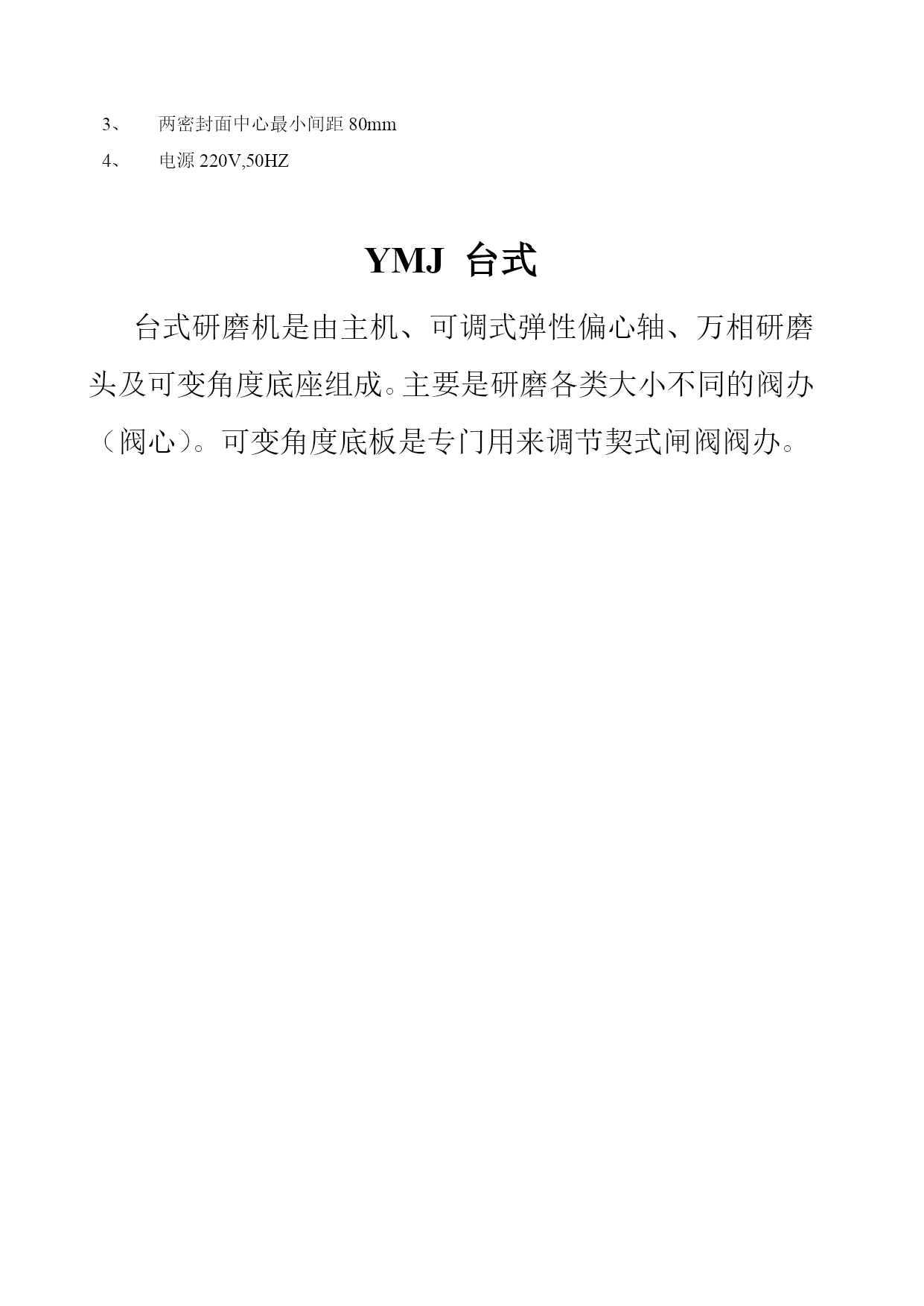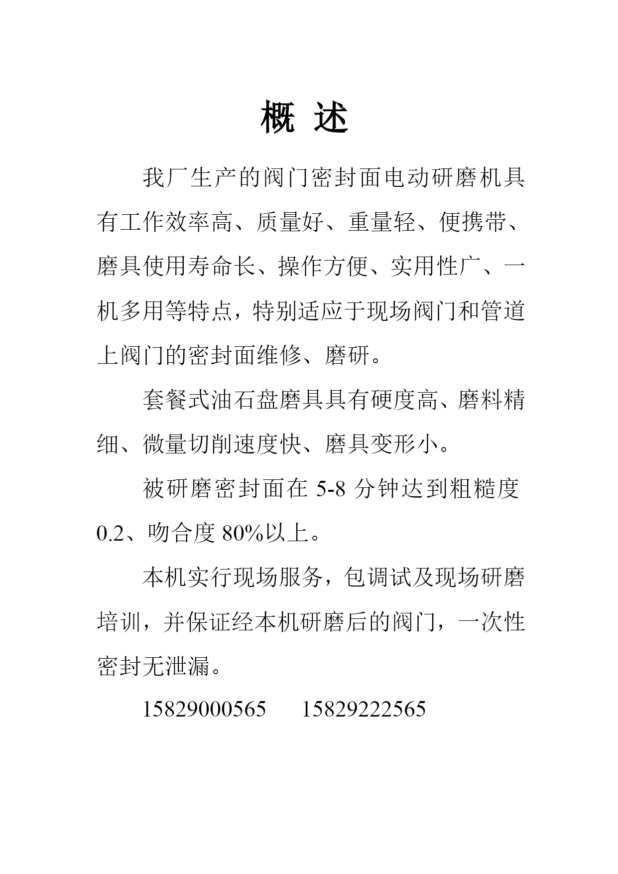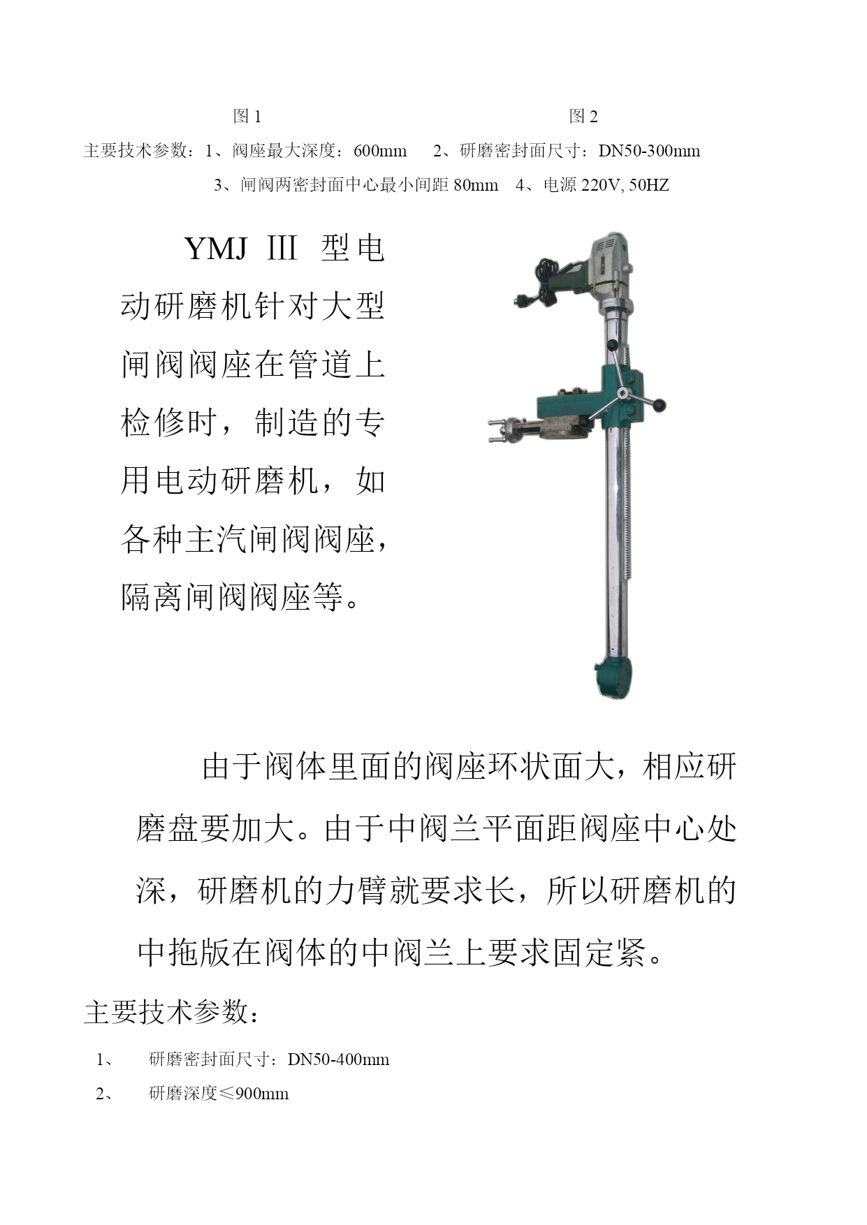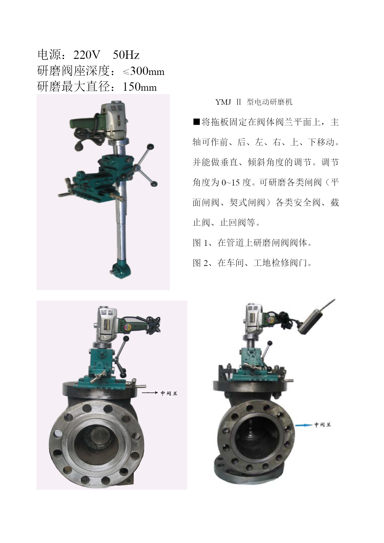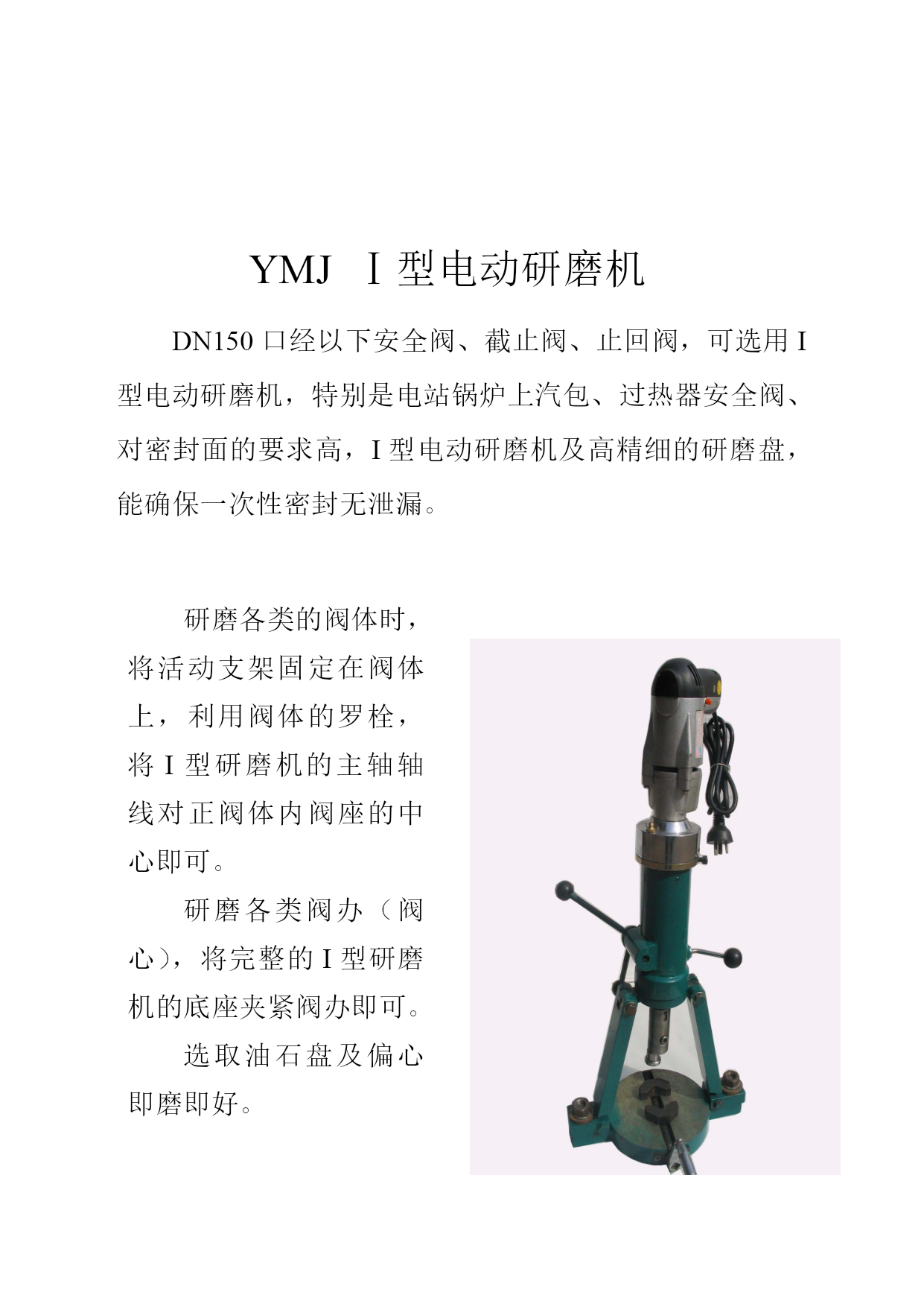概述我厂生产的阀门密封面电动研磨机具有工作效率高、质量好、重量轻、便携带、磨具使用寿命长、操作方便、实用性广、一机多用等特点,特别适应于现场阀门和管道上阀门的密封面维修、磨研。套餐式油石盘磨具具有硬度高、磨料精细、微量切削速度快、磨具变形小。被研磨密封面在5-8分钟达到粗糙度0.2、吻合度80%以上。本机实行现场服务,包调试及现场研磨培训,并保证经本机研磨后的阀门,一次性密封无泄漏。1582900056515829222565YMJⅠ型电动研磨机DN150口经以下安全阀、截止阀、止回阀,可选用I型电动研磨机,特别是电站锅炉上汽包、过热器安全阀、对密封面的要求高,I型电动研磨机及高精细的研磨盘,能确保一次性密封无泄漏。研磨各类的阀体时,将活动支架固定在阀体上,利用阀体的罗栓,将I型研磨机的主轴轴线对正阀体内阀座的中心即可。研磨各类阀办(阀心),将完整的I型研磨机的底座夹紧阀办即可。选取油石盘及偏心即磨即好。电源:220V50Hz研磨阀座深度:≤300mm研磨最大直径:150mmYMJⅡ型电动研磨机■将拖板固定在阀体阀兰平面上,主轴可作前、后、左、右、上、下移动。并能做垂直、倾斜角度的调节。调节角度为0~15度。可研磨各类闸阀(平面闸阀、契式闸阀)各类安全阀、截止阀、止回阀等。图1、在管道上研磨闸阀阀体。图2、在车间、工地检修阀门。图1图2主要技术参数:1、阀座最大深度:600mm2、研磨密封面尺寸:DN50-300mm3、闸阀两密封面中心最小间距80mm4、电源220V,50HZYMJⅢ型电动研磨机针对大型闸阀阀座在管道上检修时,制造的专用电动研磨机,如各种主汽闸阀阀座,隔离闸阀阀座等。由于阀体里面的阀座环状面大,相应研磨盘要加大。由于中阀兰平面距阀座中心处深,研磨机的力臂就要求长,所以研磨机的中拖版在阀体的中阀兰上要求固定紧。主要技术参数:研磨密封面尺寸:DN50-400mm研磨深度≤900mm两密封面中心最小间距80mm电源220V,50HZYMJ台式台式研磨机是由主机、可调式弹性偏心轴、万相研磨头及可变角度底座组成。主要是研磨各类大小不同的阀办(阀心)。可变角度底板是专门用来调节契式闸阀阀办。油石盘系列