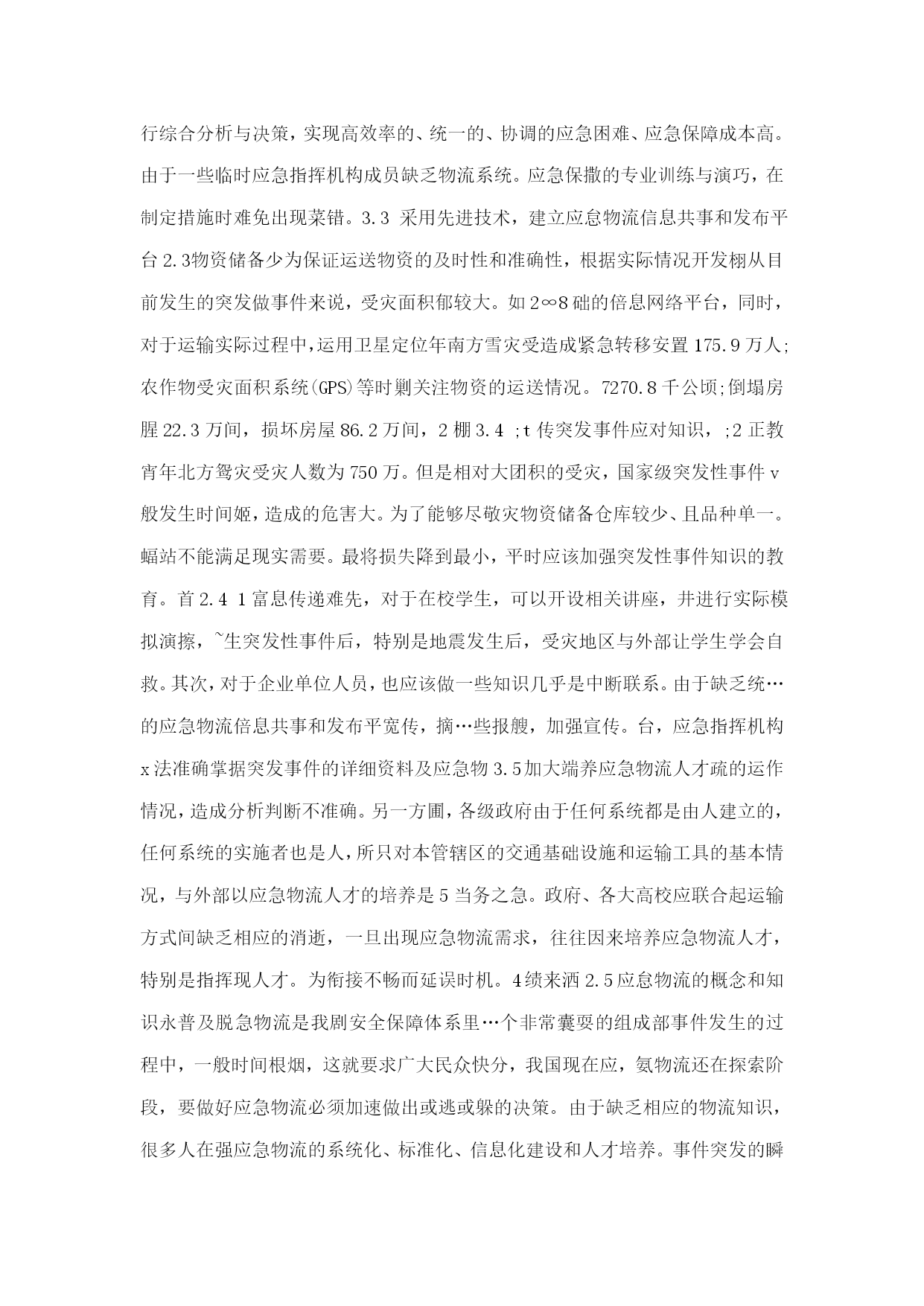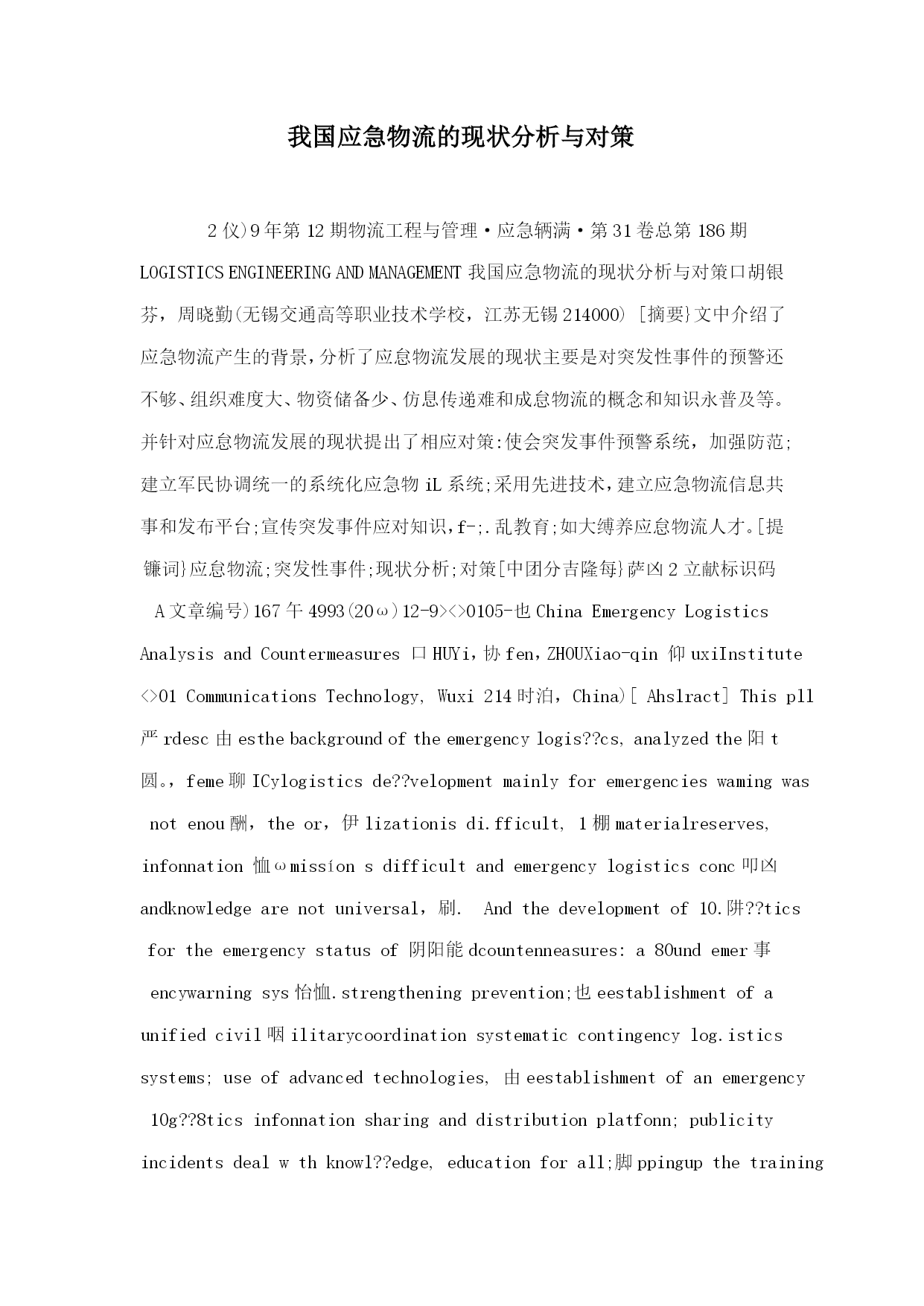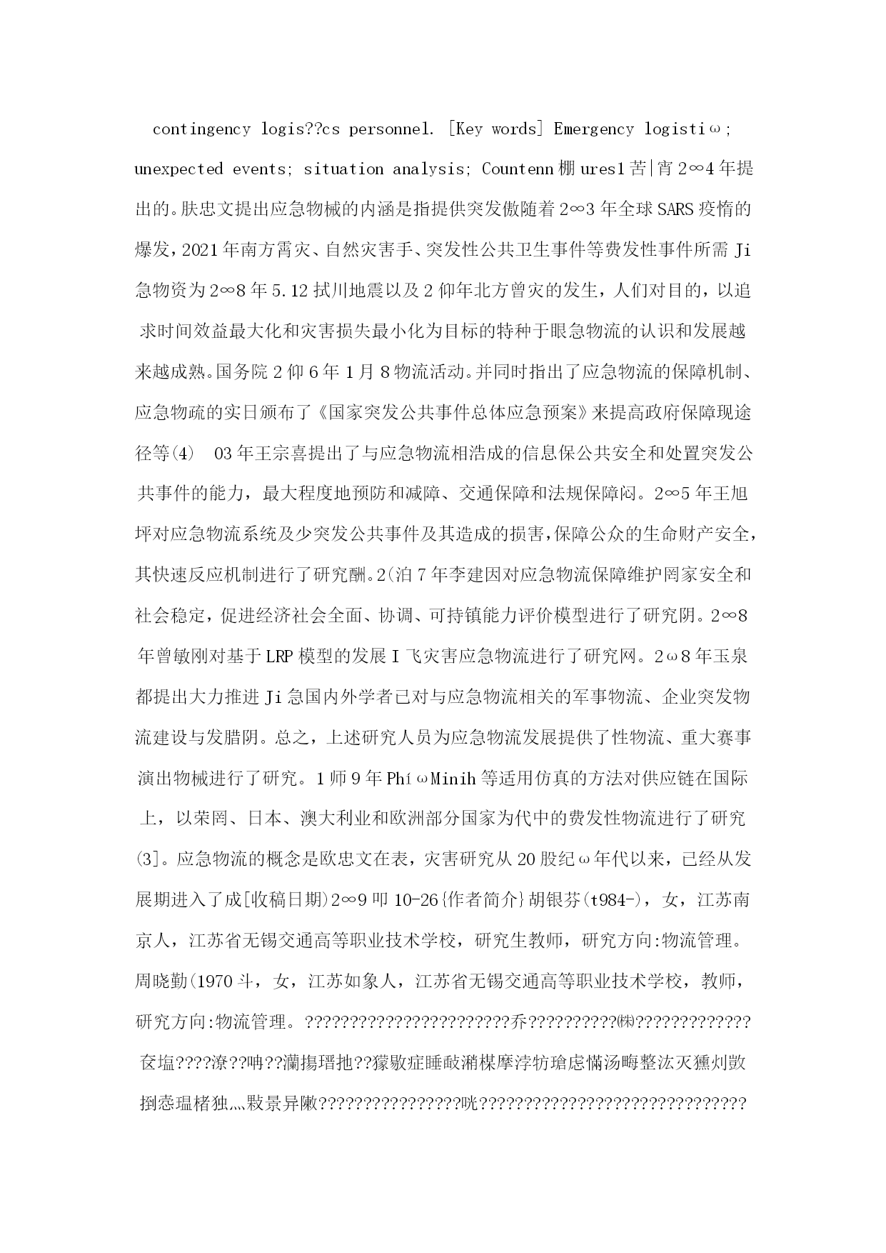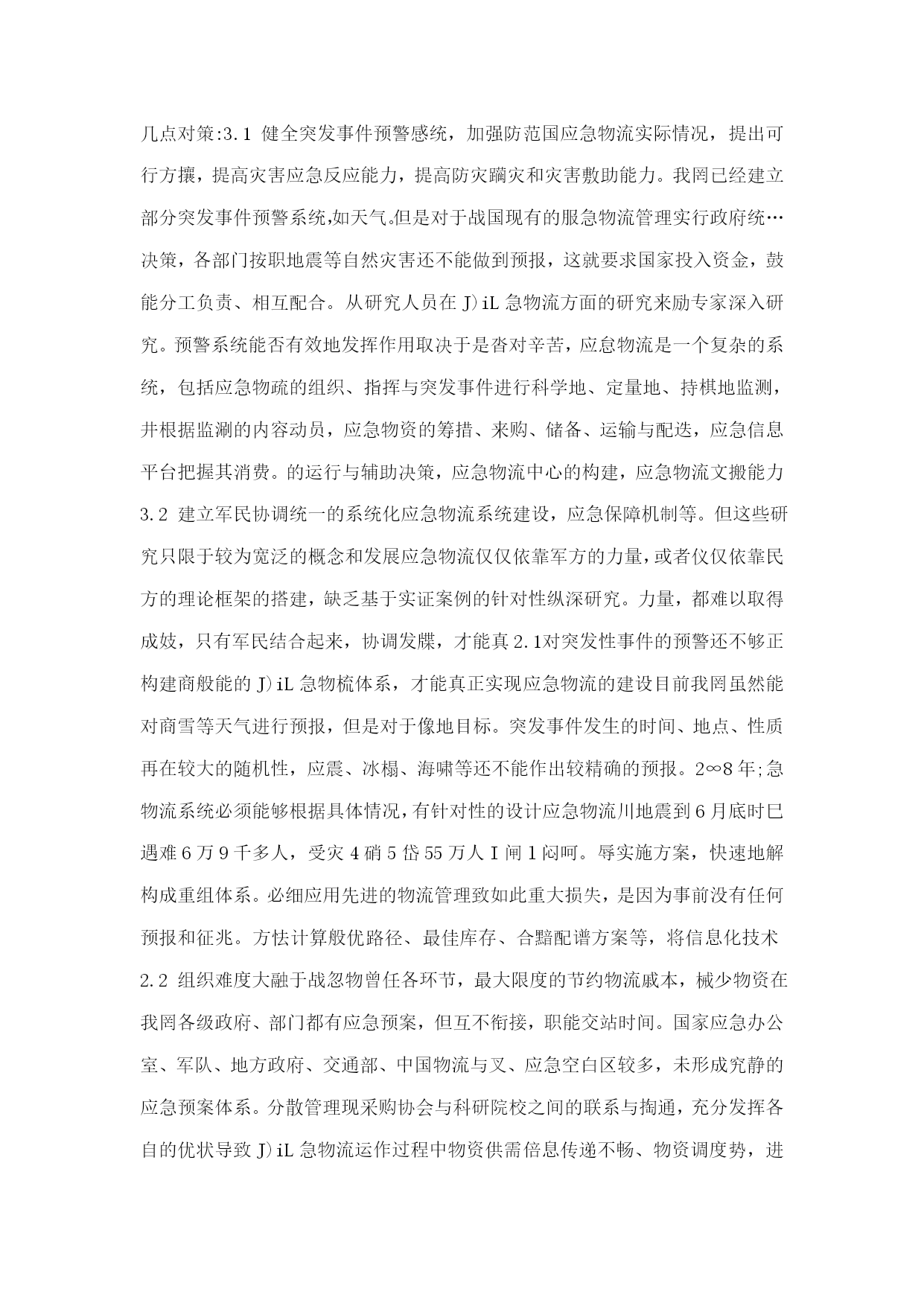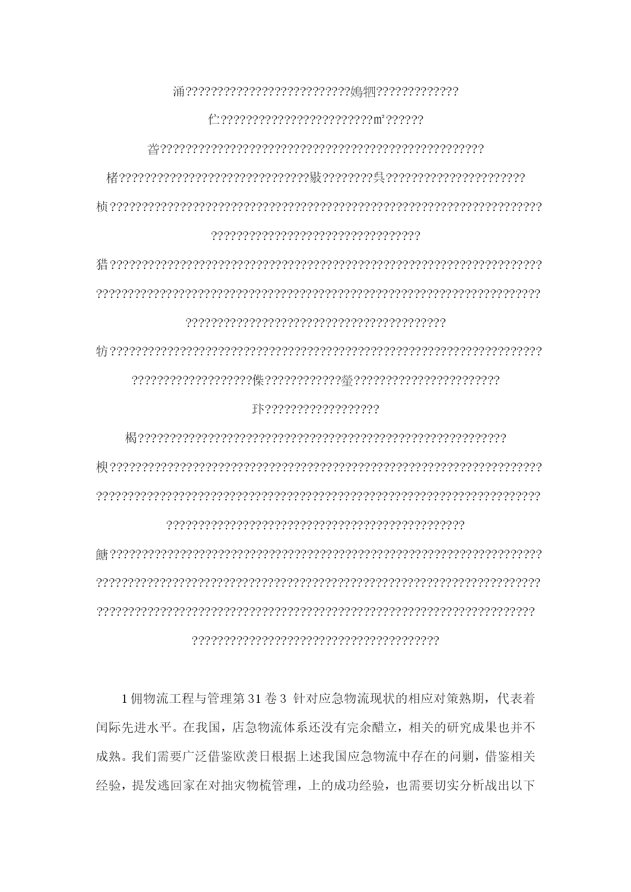我国应急物流的现状分析与对策(常用版)(可以直接使用,可编辑完整版资料,欢迎下载)我国应急物流的现状分析与对策2仪)9年第12期物流工程与管理·应急辆满·第31卷总第186期LOGISTICSENGINEERINGANDMANAGEMENT我国应急物流的现状分析与对策口胡银芬,周晓勤(无锡交通高等职业技术学校,江苏无锡214000)[摘要}文中介绍了应急物流产生的背景,分析了应怠物流发展的现状主要是对突发性事件的预警还不够、组织难度大、物资储备少、仿息传递难和成怠物流的概念和知识永普及等。并针对应怠物流发展的现状提出了相应对策:使会突发事件预警系统,加强防范;建立军民协调统一的系统化应急物iL系统;采用先进技术,建立应急物流信息共事和发布平台;宣传突发事件应对知识,f-;.乱教育;如大缚养应怠物流人才。[提镰词}应怠物流;突发性事件;现状分析;对策[中团分吉隆每}萨凶2立献标识码A文章编号)167午4993(20ω)12-9><>0105-也ChinaEmergencyLogisticsAnalysisandCountermeasures口HUYi,协fen,ZHOUXiao-qin仰uxiInstitute<>01CommunicationsTechnology,Wuxi214时泊,China)[Ahslract]Thispll严rdesc由esthebackgroundoftheemergencylogis??cs,analyzedthe阳t圆。,feme聊ICylogisticsde??velopmentmainlyforemergencieswamingwasnotenou酬,theor,伊lizationisdi.fficult,1棚materialreserves,infonnation恤ωmissíonsdifficultandemergencylogisticsconc叩凶andknowledgearenotuniversal,刷.Andthedevelopmentof10.阱??ticsfortheemergencystatusof阴阳能dcountenneasures:a80undemer事encywarningsys怡恤.strengtheningprevention;也eestablishmentofaunifiedcivil咽ilitarycoordinationsystematiccontingencylog.isticssystems;useofadvancedtechnologies,由eestablishmentofanemergency10g??8ticsinfonnationsharinganddistributionplatfonn;publicityincidentsdealwthknowl??edge,educationforall;脚ppingupthetrainingcontingencylogis??cspersonnel.[Keywords]Emergencylogistiω;unexpectedevents;situationanalysis;Countenn棚ures1苦|宵2∞4年提出的。肤忠文提出应急物械的内涵是指提供突发傲随着2∞3年全球SARS疫惰的爆发,2021年南方霄灾、自然灾害手、突发性公共卫生事件等费发性事件所需Ji急物资为2∞8年5.12拭川地震以及2仰年北方曾灾的发生,人们对目的,以追求时间效益最大化和灾害损失最小化为目标的特种于眼急物流的认识和发展越来越成熟。国务院2仰6年1月8物流活动。并同时指出了应急物流的保障机制、应急物疏的实日颁布了《国家突发公共事件总体应急预案》来提高政府保障现途径等(4)03年王宗喜提出了与应急物流相浩成的信息保公共安全和处置突发公共事件的能力,最大程度地预防和减障、交通保障和法规保障闷。2∞5年王旭坪对应急物流系统及少突发公共事件及其造成的损害,保障公众的生命财产安全,其快速反应机制进行了研究酬。2(泊7年李建因对应急物流保障维护罔家安全和社会稳定,促进经济社会全面、协调、可持镇能力评价模型进行了研究阴。2∞8年曾敏刚对基于LRP模型的发展I飞灾害应急物流进行了研究网。2ω8年玉泉都提出大力推进Ji急国内外学者已对与应急物流相关的军事物流、企业突发物流建设与发腊阴。总之,上述研究人员为应急物流发展提供了性物流、重大赛事演出物械进行了研究。1师9年PhíωMinih等适用仿真的方法对供应链在国际上,以荣罔、日本、澳大利业和欧洲部分国家为代中的费发性物流进行了研究(3]。应急物流的概念是欧忠文在表,灾害研究从20股纪ω年代以来,已经从发展期进入了成[收稿日期)2∞9叩10-26{作者简介}胡银芬(t984-),女,江