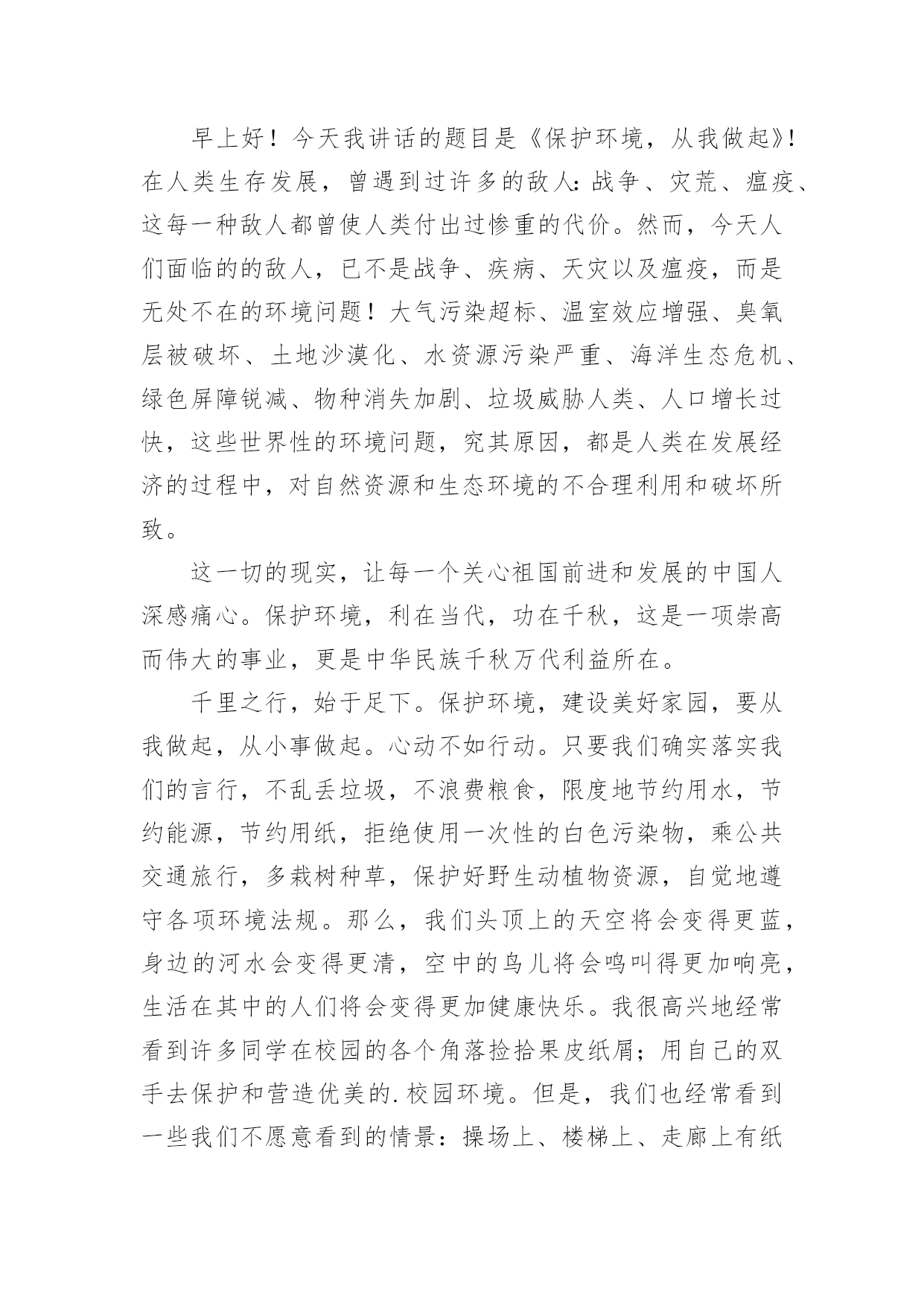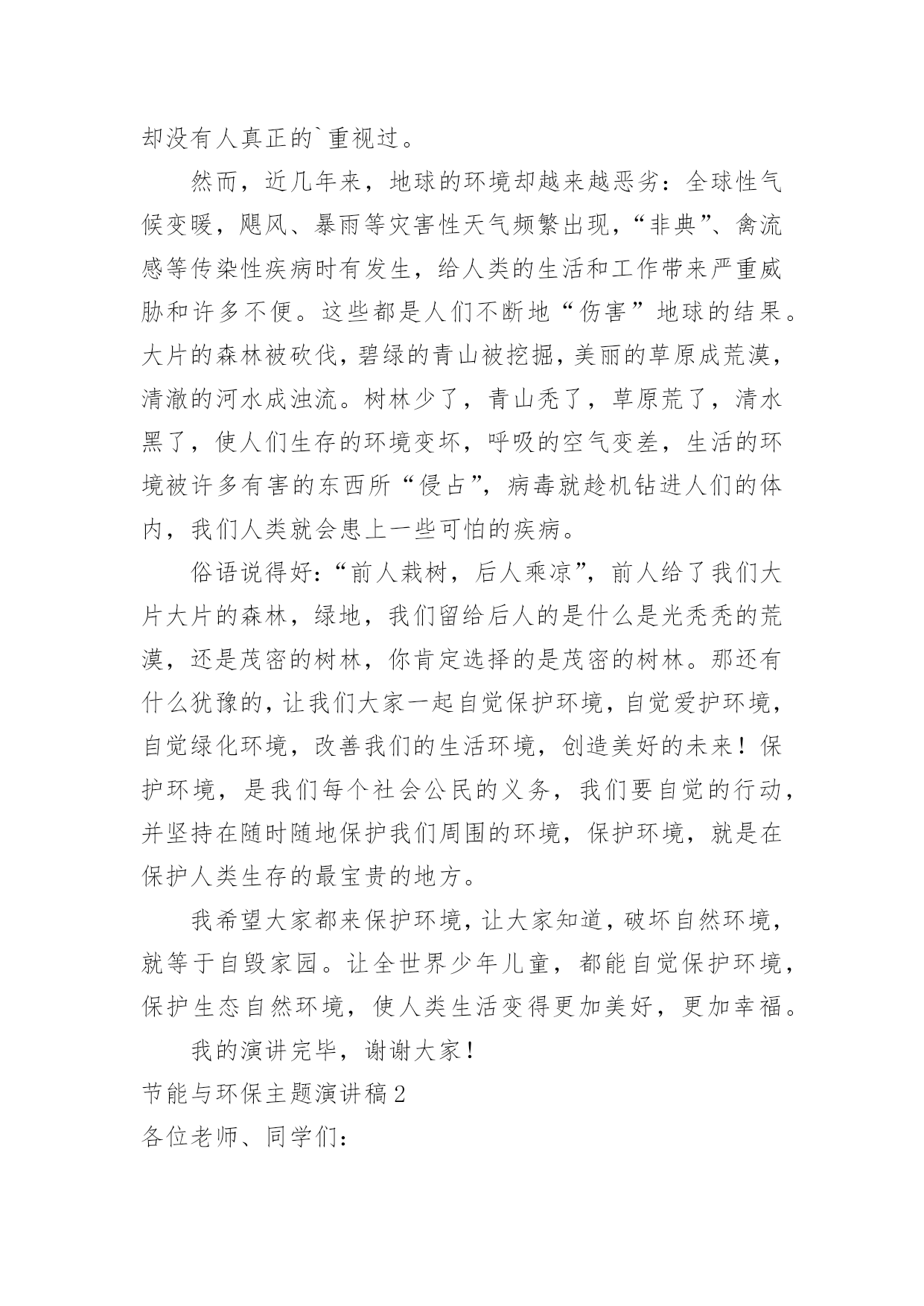 节能与环保主题演讲稿节能与环保主题演讲稿演讲稿以发表意见,表达观点为主,是为演讲而事先准备好的文稿。在日新月异的现代社会中,演讲稿的使用越来越广泛,为了让您在写演讲稿时更加简单方便,以下是小编收集整理的节能与环保主题演讲稿,欢迎大家借鉴与参考,希望对大家有所帮助。节能与环保主题演讲稿1尊敬的老师,亲爱的同学们:大家好!地球是我们人类的家园,也是人类的母亲。我们依赖它,探索它。这个蔚蓝色的星球多么美丽,但我们要知道:地球只有一个!我为周围环境的恶化而感到心痛,我想:作为未来接班人的青少年,如果不了解环境问题的严重性,无视有关环境保护的法律法规,不去增强环境保护意识,我们的生命将毁在自己的手中,老天将对我们作出严厉的惩罚。为此我下定决心要从我做起爱护环境,保护我们这个赖以生存的家园,做一个保护环境的卫士。如果我们破坏环境,浪费水资源,生物会灭绝,人类会渴死,地球会变成沙漠。水是人类的好朋友。我们从小就被大人教育,节约用水,这个道理我们谁都可以倒背如流,但却没有人真正的`重视过。然而,近几年来,地球的环境却越来越恶劣:全球性气候变暖,飓风、暴雨等灾害性天气频繁出现,“非典”、禽流感等传染性疾病时有发生,给人类的生活和工作带来严重威胁和许多不便。这些都是人们不断地“伤害”地球的结果。大片的森林被砍伐,碧绿的青山被挖掘,美丽的草原成荒漠,清澈的河水成浊流。树林少了,青山秃了,草原荒了,清水黑了,使人们生存的环境变坏,呼吸的空气变差,生活的环境被许多有害的东西所“侵占”,病毒就趁机钻进人们的体内,我们人类就会患上一些可怕的疾病。俗语说得好:“前人栽树,后人乘凉”,前人给了我们大片大片的森林,绿地,我们留给后人的是什么是光秃秃的荒漠,还是茂密的树林,你肯定选择的是茂密的树林。那还有什么犹豫的,让我们大家一起自觉保护环境,自觉爱护环境,自觉绿化环境,改善我们的生活环境,创造美好的未来!保护环境,是我们每个社会公民的义务,我们要自觉的行动,并坚持在随时随地保护我们周围的环境,保护环境,就是在保护人类生存的最宝贵的地方。我希望大家都来保护环境,让大家知道,破坏自然环境,就等于自毁家园。让全世界少年儿童,都能自觉保护环境,保护生态自然环境,使人类生活变得更加美好,更加幸福。我的演讲完毕,谢谢大家!节能与环保主题演讲稿2各位老师、同学们:早上好!今天我讲话的题目是《保护环境,从我做起》!在人类生存发展,曾遇到过许多的敌人:战争、灾荒、瘟疫、这每一种敌人都曾使人类付出过惨重的代价。然而,今天人们面临的的敌人,已不是战争、疾病、天灾以及瘟疫,而是无处不在的环境问题!大气污染超标、温室效应增强、臭氧层被破坏、土地沙漠化、水资源污染严重、海洋生态危机、绿色屏障锐减、物种消失加剧、垃圾威胁人类、人口增长过快,这些世界性的环境问题,究其原因,都是人类在发展经济的过程中,对自然资源和生态环境的不合理利用和破坏所致。这一切的现实,让每一个关心祖国前进和发展的中国人深感痛心。保护环境,利在当代,功在千秋,这是一项崇高而伟大的事业,更是中华民族千秋万代利益所在。千里之行,始于足下。保护环境,建设美好家园,要从我做起,从小事做起。心动不如行动。只要我们确实落实我们的言行,不乱丢垃圾,不浪费粮食,限度地节约用水,节约能源,节约用纸,拒绝使用一次性的白色污染物,乘公共交通旅行,多栽树种草,保护好野生动植物资源,自觉地遵守各项环境法规。那么,我们头顶上的天空将会变得更蓝,身边的河水会变得更清,空中的鸟儿将会鸣叫得更加响亮,生活在其中的人们将会变得更加健康快乐。我很高兴地经常看到许多同学在校园的各个角落捡拾果皮纸屑;用自己的双手去保护和营造优美的.校园环境。但是,我们也经常看到一些我们不愿意看到的情景:操场上、楼梯上、走廊上有纸屑、食品袋;雪白的墙壁上被印上手印、脚印和球印;教室里、走廊上留有难以清除的口香糖的污迹这说明,我们的习惯还没有很好的养成。同学们,我们是21世纪的主人,具有环保意识是现代文明人的标志。我们要有时代感责任感,要心系全球,着眼身边,立足校园。勿以善小而不为,勿以恶小而为之,让我们积极行动起来,从身边的小事做起,培养环保意识,养成环保习惯,创造我们美好的校园,塑造我们美好的灵魂!谢谢大家。