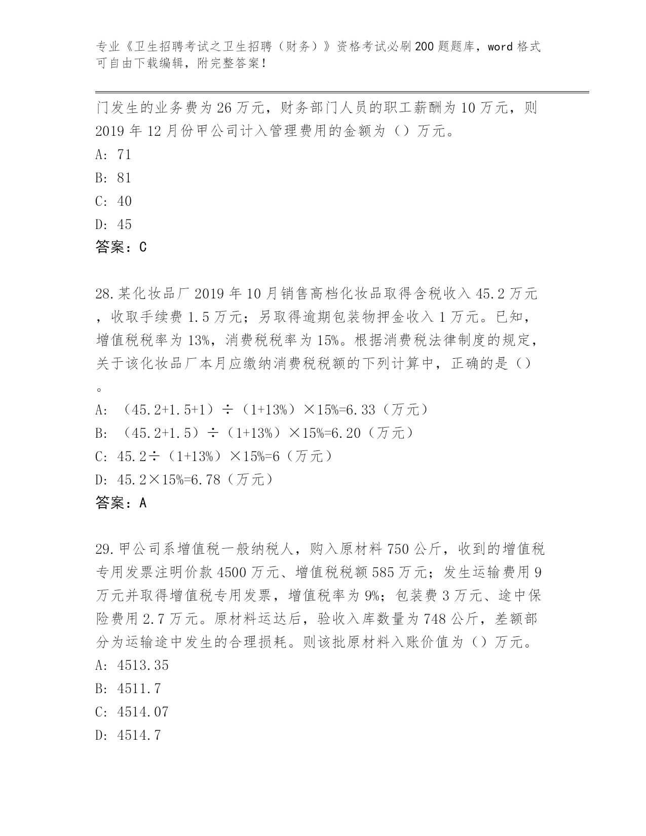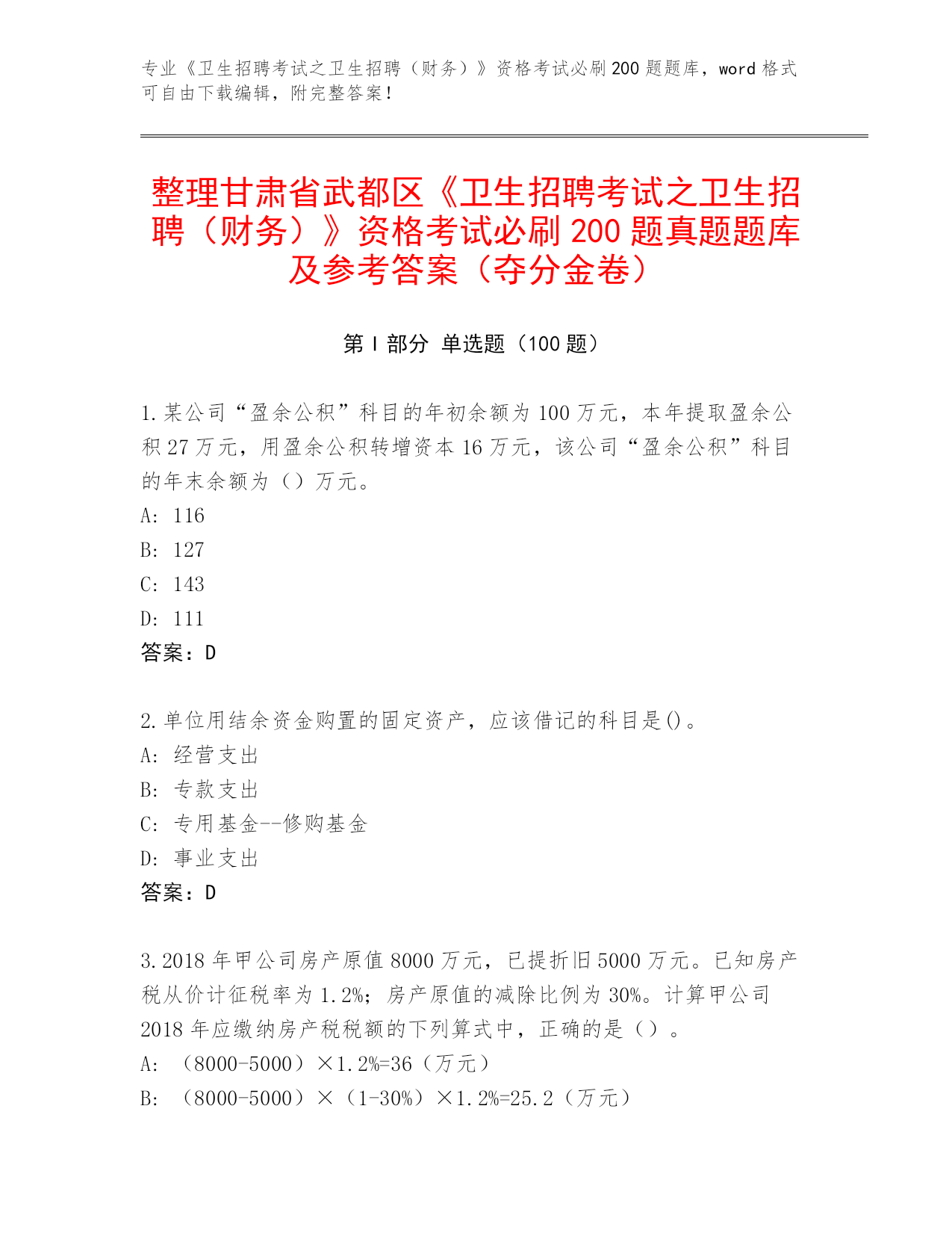 整理甘肃省武都区《卫生招聘考试之卫生招聘(财务)》资格考试必刷200题真题题库及参考答案(夺分金卷)
