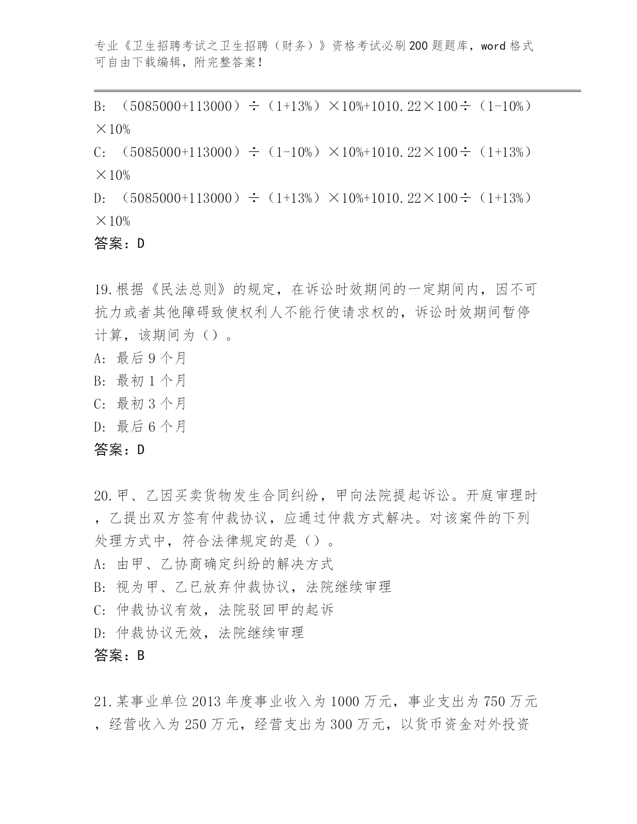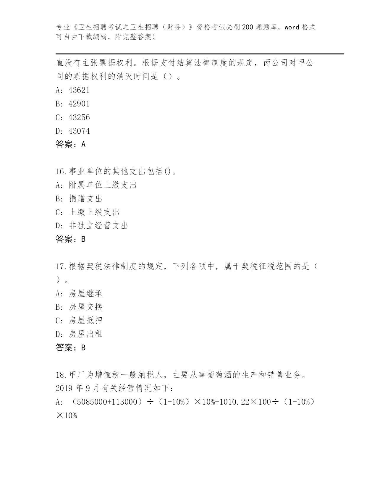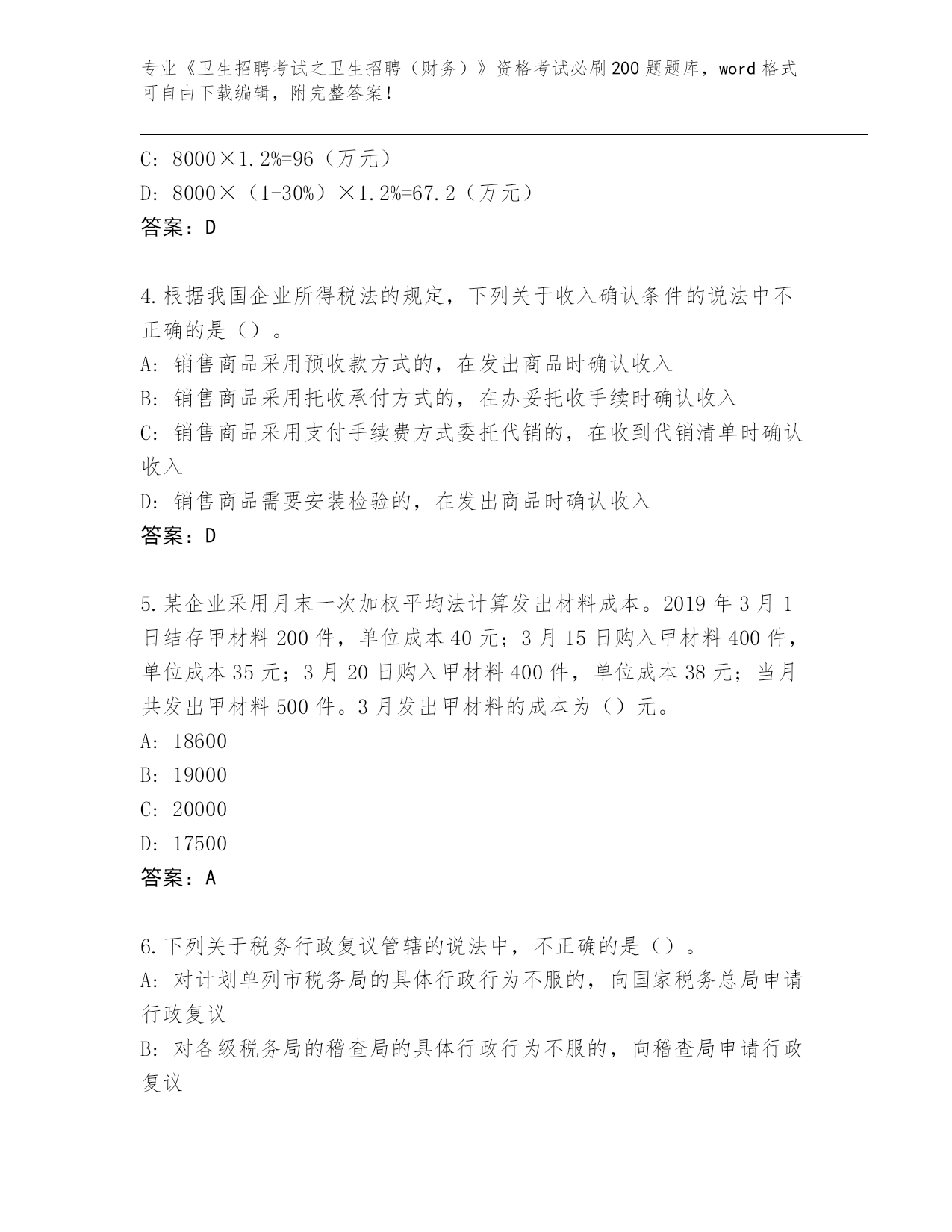 整理甘肃省《卫生招聘考试之卫生招聘(财务)》资格考试必刷200题真题题库及答案()