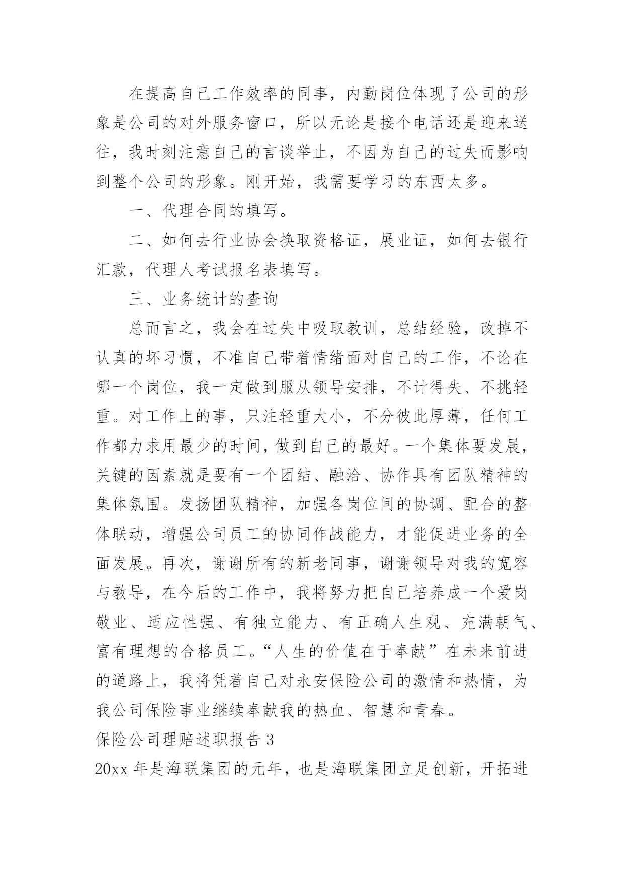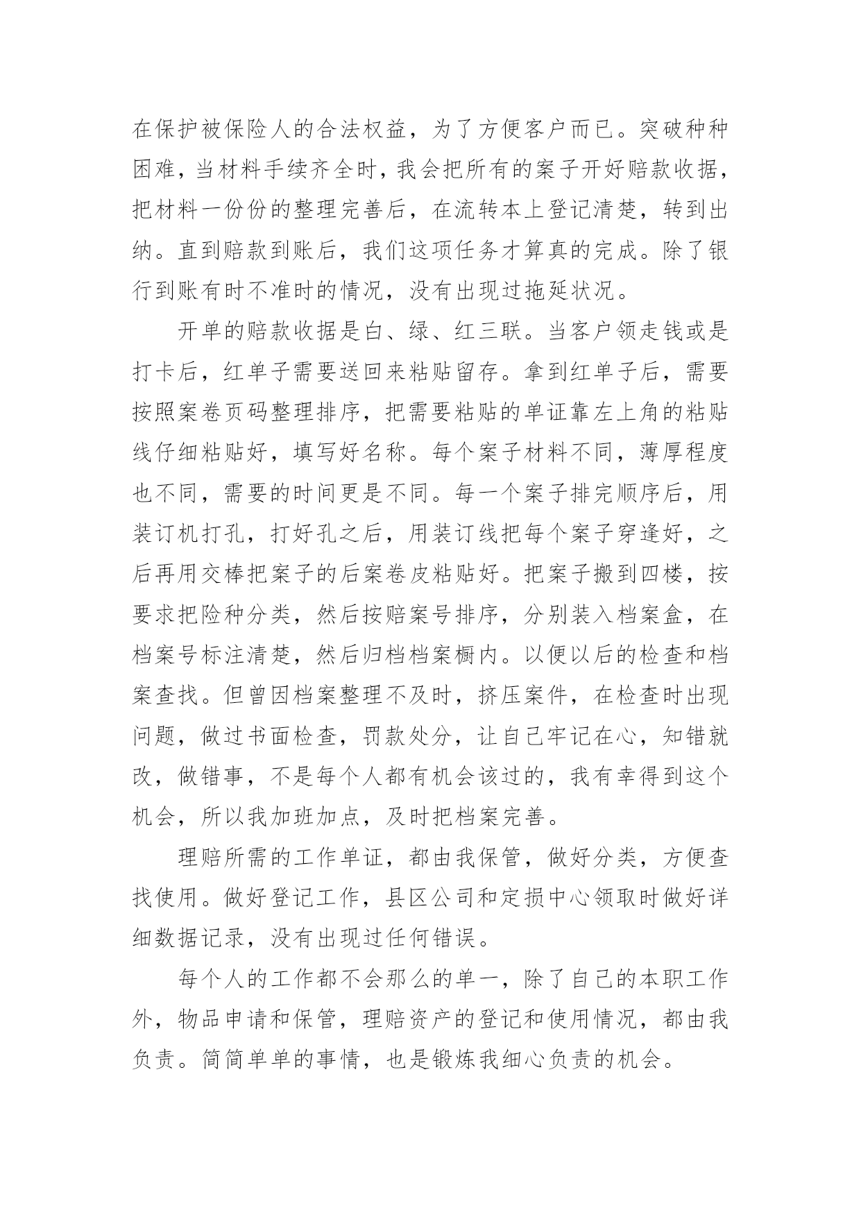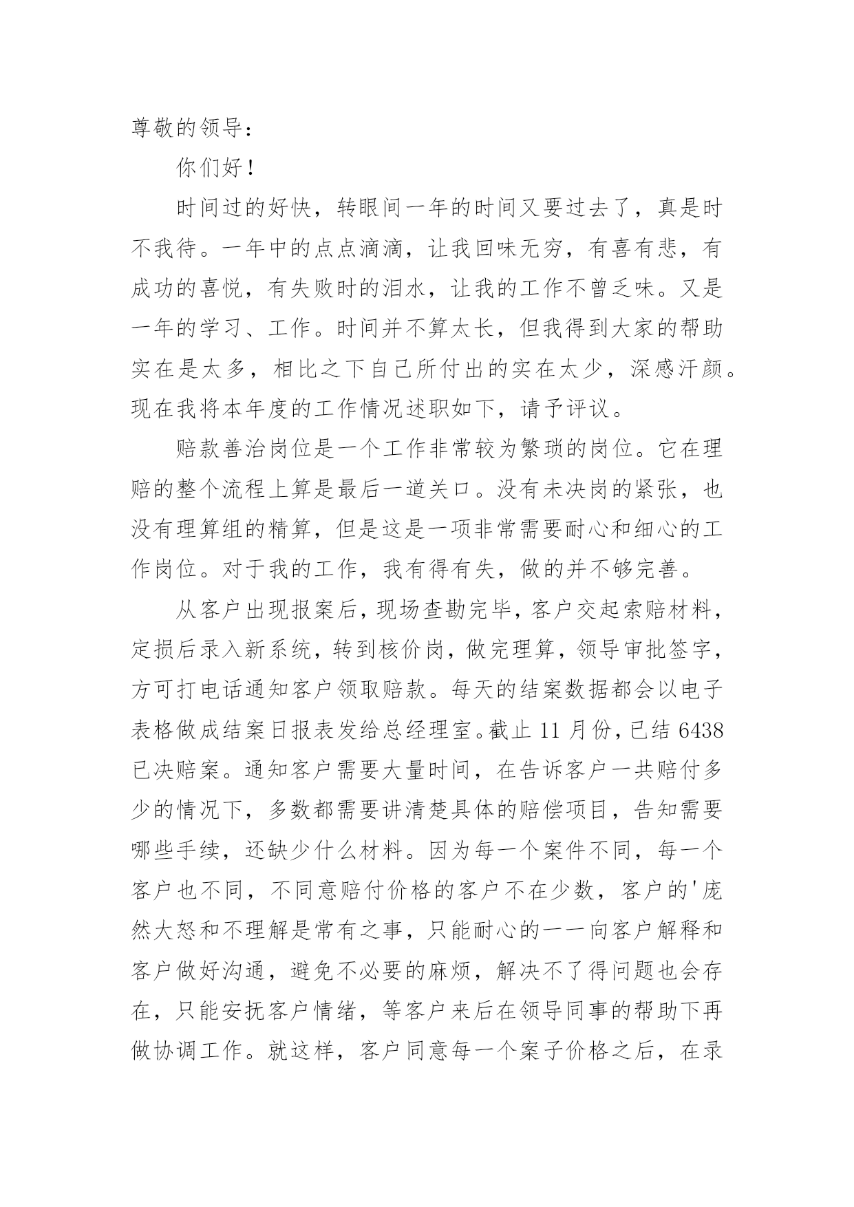 保险公司理赔述职报告保险公司理赔述职报告在人们越来越注重自身素养的今天,报告的用途越来越大,报告成为了一种新兴产业。其实写报告并没有想象中那么难,以下是小编为大家整理的保险公司理赔述职报告,仅供参考,希望能够帮助到大家。保险公司理赔述职报告1保险理赔述职报告20xx年是海联集团的元年,也是海联集团立足创新,开拓进取的一年。一年来,在集团领导和公司领导的关心指导下,在部门员工的大力支持下,保险理赔较好地完成了年度计划,取得了一定的成绩。现述职如下:保险理赔全年的工作主要是根据市场变化和公司的发展目标,加强自身建设,全面提升管理水平和服务水平,提高公司的经营效益,扩大市场份额。一、加强学习,拓宽思路,不断提升业务水平和管理能力。加强自身的管理能力和思想学习,认真领会一汽大众的各项流程和公司的各项方针政策,不断提高工作认识的.思想和论断。通过不断学习,增强了事业心,提高了工作的管理能力。同时不断拓宽工作思路,增强创新精神,才使得自身工作能力得到提升。明确了努力工作的方向,从而增强对工作的责任感和使命感。二、利用一切可利用资源提高经营效率。随着大环境的变化,为提高保险理赔的业务发展,围绕公司的发展目标,充分发挥员工的积极性、创造性,充分调动员工的主观能动性,提高员工的服务意识,转变思路,深入挖潜,取得了一定的成效。产量提前完成全年计划,产值完成了。三、做好基础工作,推动部门业务稳步发展。在公司业务发展的同时,也要求自身管理能力要不断得到加强。注重工作环节,责任到人,严格按照一汽大众工作流程完成工作。加强员工理赔数据化管理。定期对日常工作进行总结、分析,及时发现工作中的问题,把问题消灭在萌芽状态。针对个别员工工作不在状态的情况,平心促谈,让员工真正热爱本职工作。回顾一年的工作和学习,在取得上述成绩的同时,还有一些在今后的工作中亟待提高的地方:一是要提高自身的业务水平和管理水平,二是提高业务员的接待水平和业务水平,降低各项成本。三是要增强服务意识,提高业务员的责任心和责任感,以提高客户满意度和忠诚度,从而扩大市场份额,增加企业效益。在下一年的工作中,我将进一步强化学习意识,坚持学以致用,用以促学的原则,不断提升自身管理能力,以便更好地适应工作要求。严于律己、克己奉公,在思想上提高认识,行动上严格要求,以饱满的激情,迎接海联集团的辉煌未来。保险公司理赔述职报告2尊敬的领导:你们好!时间过的好快,转眼间一年的时间又要过去了,真是时不我待。一年中的点点滴滴,让我回味无穷,有喜有悲,有成功的喜悦,有失败时的泪水,让我的工作不曾乏味。又是一年的学习、工作。时间并不算太长,但我得到大家的帮助实在是太多,相比之下自己所付出的实在太少,深感汗颜。现在我将本年度的工作情况述职如下,请予评议。赔款善治岗位是一个工作非常较为繁琐的岗位。它在理赔的整个流程上算是最后一道关口。没有未决岗的紧张,也没有理算组的精算,但是这是一项非常需要耐心和细心的工作岗位。对于我的工作,我有得有失,做的并不够完善。从客户出现报案后,现场查勘完毕,客户交起索赔材料,定损后录入新系统,转到核价岗,做完理算,领导审批签字,方可打电话通知客户领取赔款。每天的结案数据都会以电子表格做成结案日报表发给总经理室。截止11月份,已结6438已决赔案。通知客户需要大量时间,在告诉客户一共赔付多少的情况下,多数都需要讲清楚具体的赔偿项目,告知需要哪些手续,还缺少什么材料。因为每一个案件不同,每一个客户也不同,不同意赔付价格的客户不在少数,客户的'庞然大怒和不理解是常有之事,只能耐心的一一向客户解释和客户做好沟通,避免不必要的麻烦,解决不了得问题也会存在,只能安抚客户情绪,等客户来后在领导同事的帮助下再做协调工作。就这样,客户同意每一个案子价格之后,在录入系统核赔结案。因此现在的价格纠纷已经逐渐减少。因为每天来的客户不是我们所能安排的,所以每天的工作量也是不同的。有时一天来的客户也就是几个人而已,相对开单就没有那么繁忙,那么混乱。而有时一天的客户接二连三,甚至一起挨号催喊,让自己手忙脚乱。而且因此我把县区营销部领取赔款的日子都差分开,一到星期五各一天,因为县区工作人员带来的案子比较多。客户称领取赔款时,首先要录入系统查询,看是否结案可领取赔款,如果确认结案,从档案橱中按赔案编号找出案子,先翻阅案子材料是否齐全,随后根据计算书准确无误的填写赔款收据,把单子交给客户到出纳窗口领取赔款。从实行赔款到账户,客户送交索赔材料的同时把银行账号和身份证复印件留存,案子结案时,直接开单转财务打到客户账号上。按常理来讲,这一规定,不紧保证了被保险人赔款的安全性,还方便了客户,不用再跑远路,进行那些繁琐的手续亲自来领取。但是因为刚刚实施不久,并没有我们想象的那么顺利,我们遇到种种困难,因为当时我们公司对于储蓄银行和信用