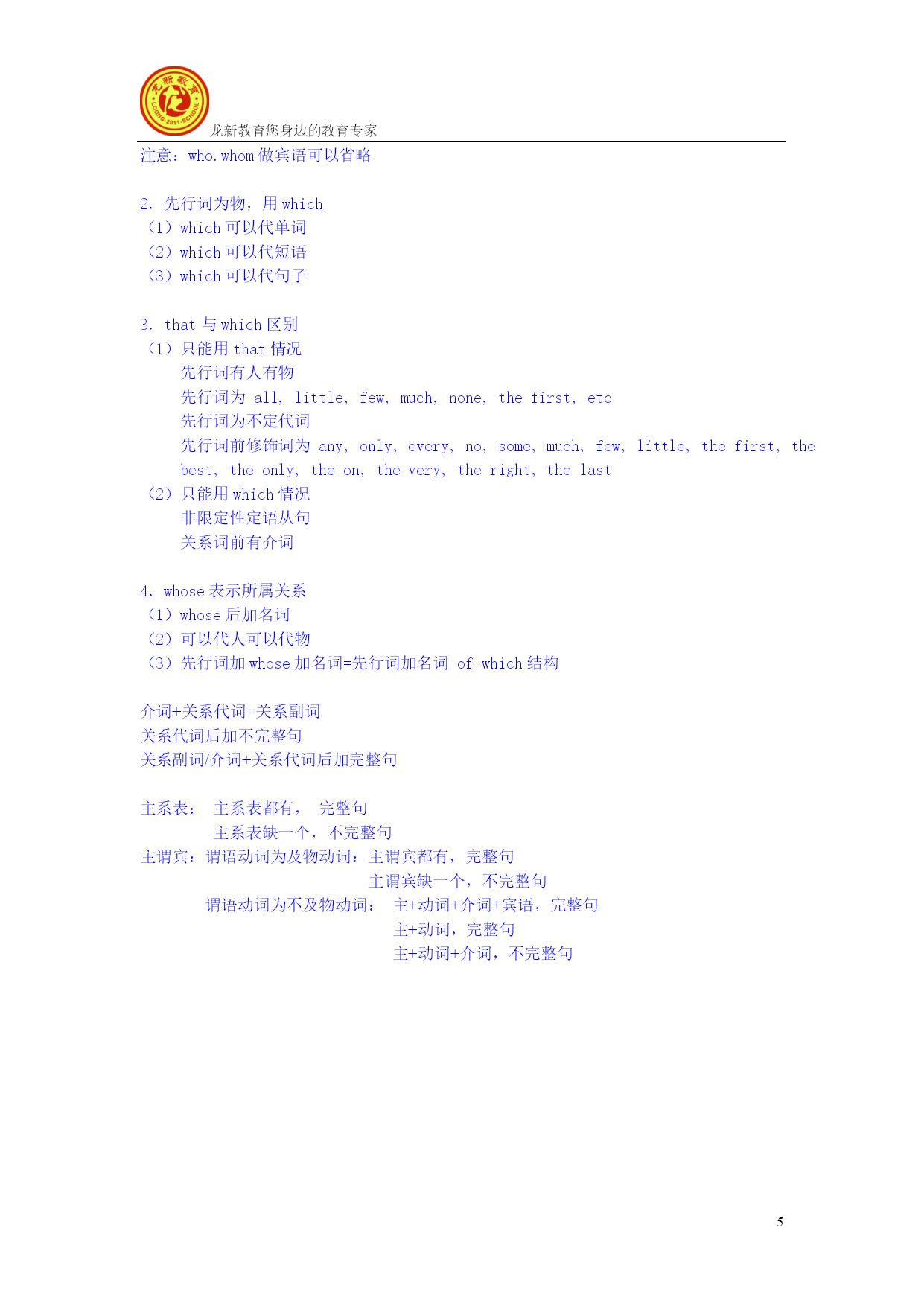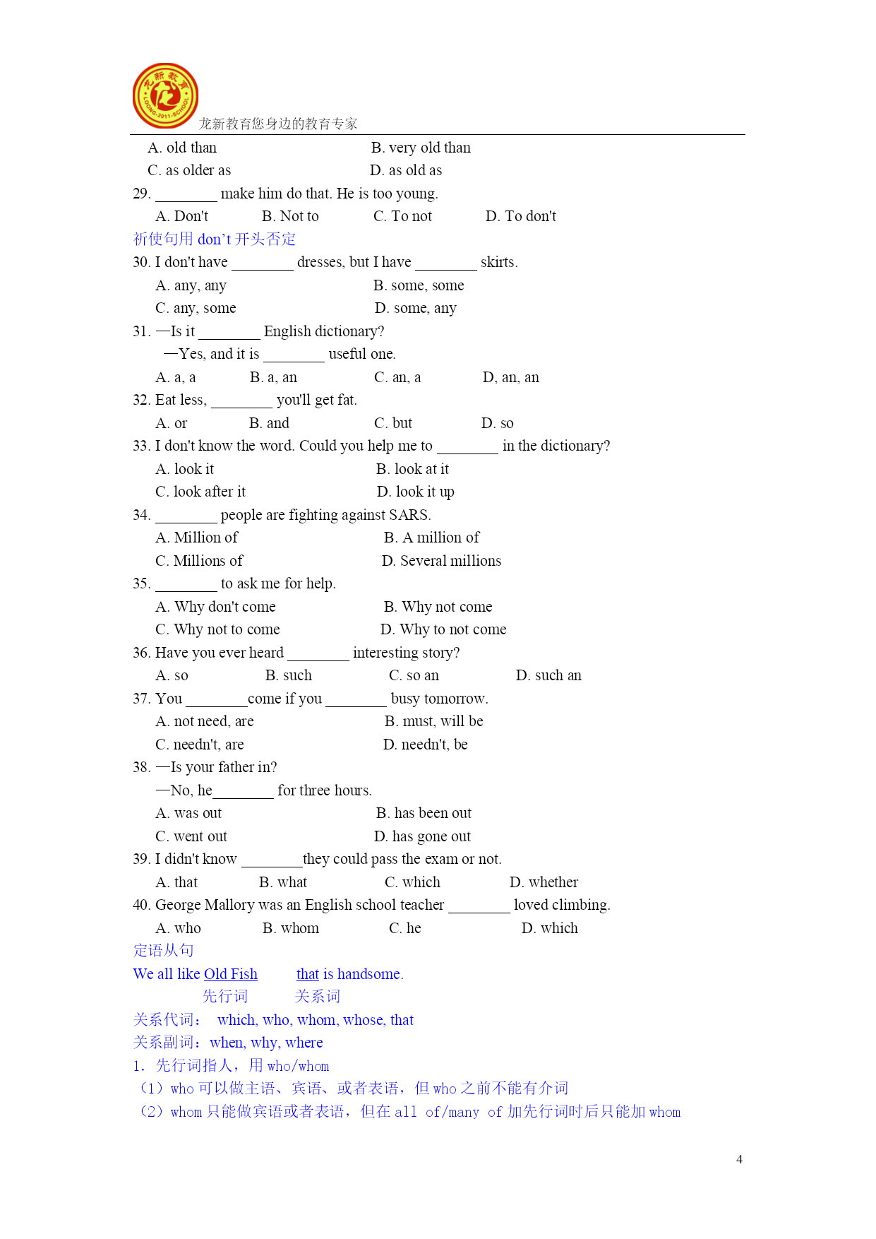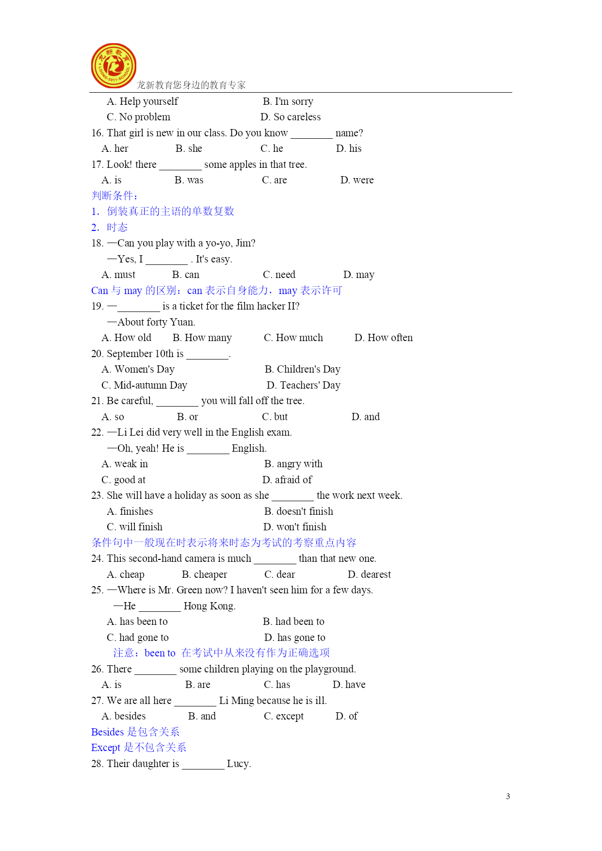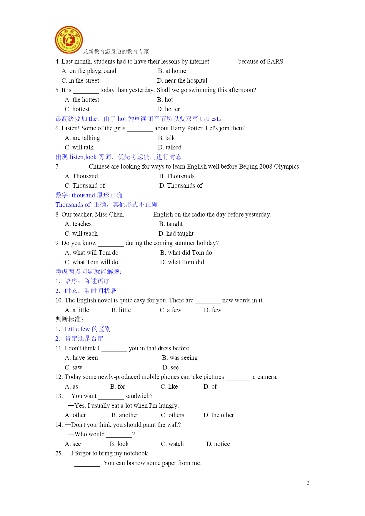 龙新教育您身边的教育专家2013初三英语语法真题讲义1.jack,goodboy!Pleasepass________theglasses.Iwanttoreadthenewspaper.A.youB.meC.himD.her2.ThismorningIhad________eggandabottleofmilkformybreakfast.A.anB.aC.theD.不填冠词不定冠词用法例句用于可数名词单数形式前Susanisascientist.Passmeanorange,please.不特指某人或某物Aboyislookingforyou.Weworkfivedaysaweek.表示“一”的数量,但没有one强烈WearegoingtohaveanEnglishlessontomorrow.Ihaveamouth,anose,twoeyesandtwoears.用于固定词组中Afew,alittle,alotof,amomentago定冠词用法例句特指某人或者某物Showmethephotooftheboy.双方都知道的事物或人Wherearethenewbooks,Jim?Theyareonthesmalltable.上文提过的人或物JiWeilivesonafarm.Thefarmisnotbig.独一无二Thesunisbiggerthanthemoon.序数词和形容词最高级前ThefirstmonthoftheyearisJanuary.普通名词构成的专有名词前TheGreatWall习惯用语InthemorningOntheleft零冠词用法例句专有名词和不可数名词前China名词已经有定语this,that,my,your,some,any等Thatletterisinherbag.复数名词表示一类人或物Myfatherandmotherareteachers.星期、月份、季节、节日前ItisSundaytoday.称呼前WhatcolourareMrs.Green’sshoes?三餐和球类运动前Hewenttoschoolbeforebreakfastthismorning.转折关系3.—Canyouplayfootball?—Yes,Ican,________Ican'tplayitverywell.A.orB.andC.soD.but4.Lastmonth,studentshadtohavetheirlessonsbyinternet________becauseofSARS.A.ontheplaygroundB.athomeC.inthestreetD.nearthehospital5.Itis________todaythanyesterday.Shallwegoswimmingthisafternoon?A.thehottestB.hotC.hottestD.hotter最高级要加the,由于hot为重读闭音节所以要双写t加est。6.Listen!Someofthegirls________aboutHarryPotter.Let'sjointhem!A.aretalkingB.talkC.willtalkD.talked出现listen,look等词,优先考虑使用进行时态。7.________ChinesearelookingforwaystolearnEnglishwellbeforeBeijing2008Olympics.A.ThousandB.ThousandsC.ThousandofD.Thousandsof数字+thousand原形正确Thousandsof正确,其他形式不正确8.Ourteacher,MissChen,________Englishontheradiothedaybeforeyesterday.A.teachesB.taughtC.willteachD.hadtaught9.Doyouknow________duringthecomingsummerholiday?A.whatwillTomdoB.whatdidTomdoC.whatTomwilldoD.whatTomdid考虑两点问题就能解题:1.语序:陈述语序2.时态:看时间状语10.TheEnglishnovelisquiteeasyforyou.Thereare________newwordsinit.A.alittleB.littleC.afewD.few判断标准:1.Littlefew的区别2.肯定还是否定11.Idon'tthinkI________youinthatdressbefore.