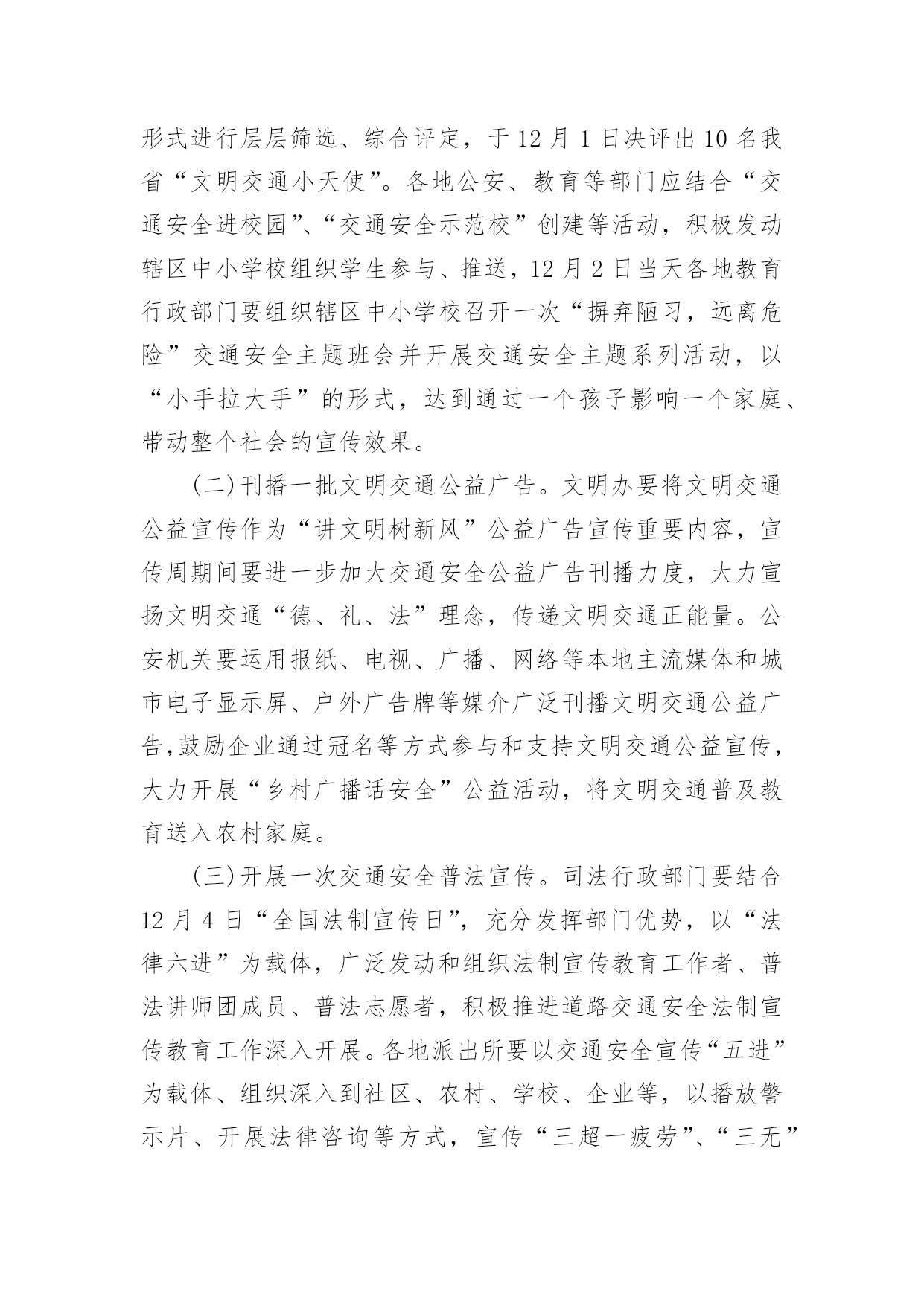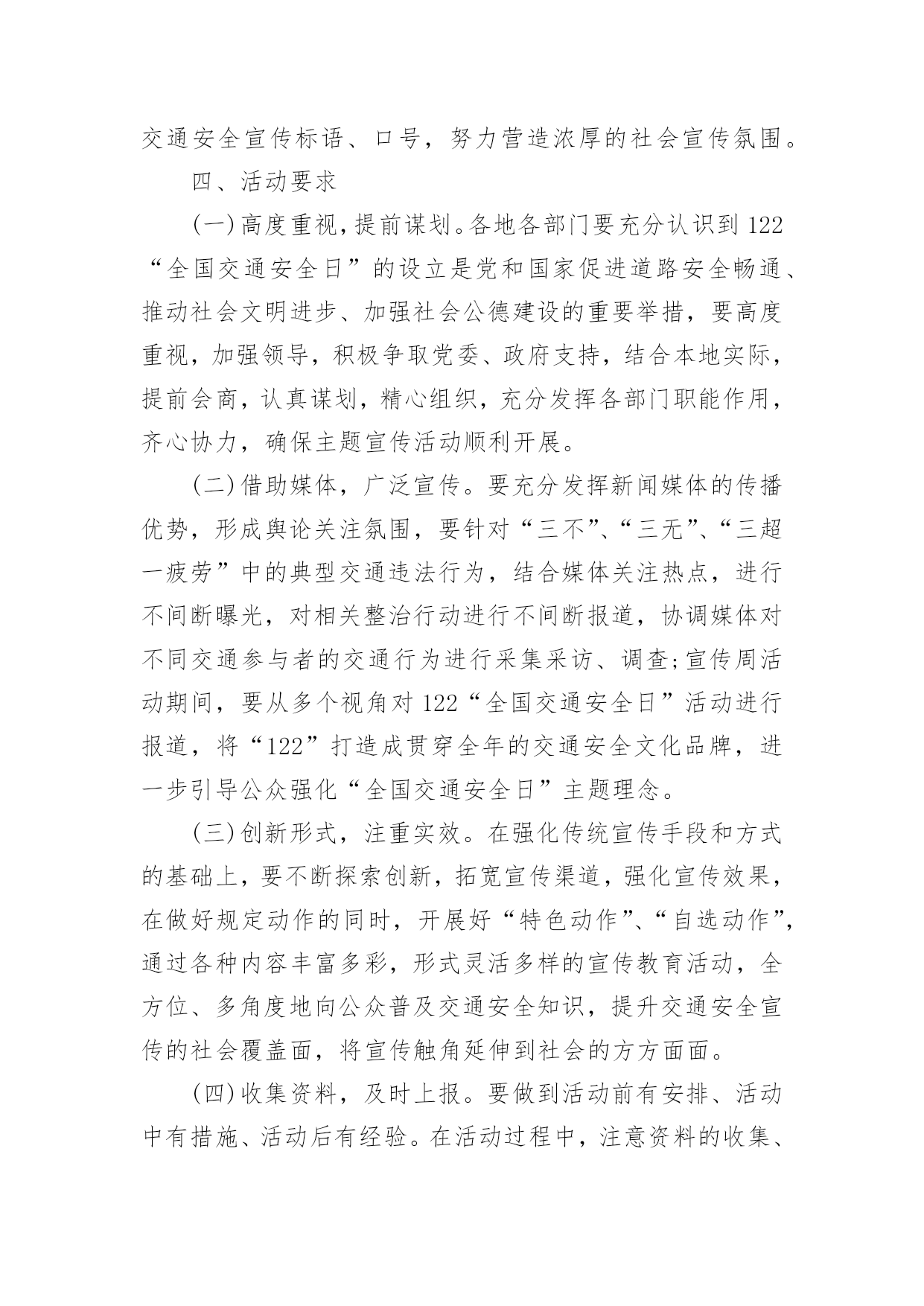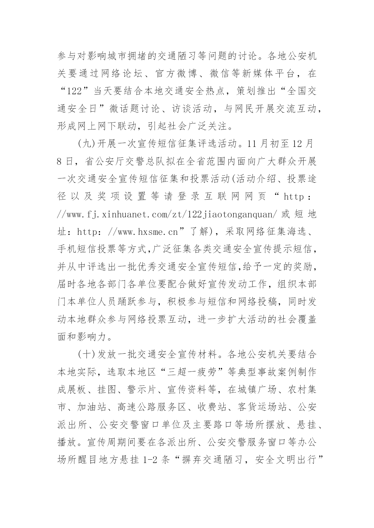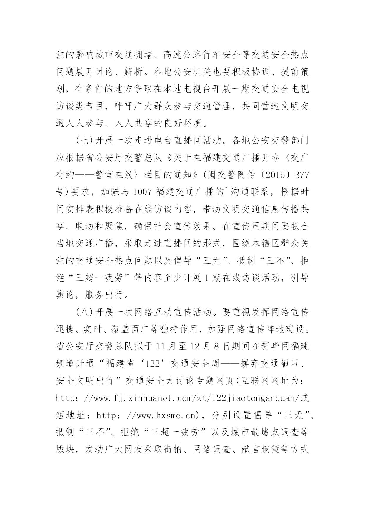 12.2交通安全日宣传活动方案为进一步弘扬现代文明交通理念,增强全民遵守交通法规意识,提升全民文明交通素质,推进“文明交通行动计划”的深入实施,为我省交通安全综合整治“三年行动”营造良好的社会舆论氛围,省公安厅、文明办、教育厅、司法厅、交通运输厅、安全监管局等部门决定联合开展全省“122”交通安全主题宣传周活动,特制定如下活动方案。一、活动时间2015年12月2日至8日,为期一周,12月2日为集中宣传日。二、活动主题紧扣“摒弃交通陋习,安全文明出行”主题,突出重点,在城市重点倡导“三不”(即“不随意变更车道,不乱停车,不闯红灯”)的主题活动;在农村重点拒绝“三无”(即拒绝“驾驶无牌车辆,无证驾驶车辆、骑摩托车不戴头盔”)的主题活动;在客货运输场站、高速公路服务区抵制“三超一疲劳”(即“超速、超员、超载和疲劳驾驶等交通违法行为”)的主题活动。三、活动内容(一)组织一次文明交通天使评选。从10月底起至12月2日,省公安厅、文明办、教育厅、FM1007福建交通广播联合开展“文明交通小天使”评选活动,采取交通安全法规、文明行车知识竞赛,交通故事演讲,亲子游戏,才艺展示等形式进行层层筛选、综合评定,于12月1日决评出10名我省“文明交通小天使”。各地公安、教育等部门应结合“交通安全进校园”、“交通安全示范校”创建等活动,积极发动辖区中小学校组织学生参与、推送,12月2日当天各地教育行政部门要组织辖区中小学校召开一次“摒弃陋习,远离危险”交通安全主题班会并开展交通安全主题系列活动,以“小手拉大手”的形式,达到通过一个孩子影响一个家庭、带动整个社会的宣传效果。(二)刊播一批文明交通公益广告。文明办要将文明交通公益宣传作为“讲文明树新风”公益广告宣传重要内容,宣传周期间要进一步加大交通安全公益广告刊播力度,大力宣扬文明交通“德、礼、法”理念,传递文明交通正能量。公安机关要运用报纸、电视、广播、网络等本地主流媒体和城市电子显示屏、户外广告牌等媒介广泛刊播文明交通公益广告,鼓励企业通过冠名等方式参与和支持文明交通公益宣传,大力开展“乡村广播话安全”公益活动,将文明交通普及教育送入农村家庭。(三)开展一次交通安全普法宣传。司法行政部门要结合12月4日“全国法制宣传日”,充分发挥部门优势,以“法律六进”为载体,广泛发动和组织法制宣传教育工作者、普法讲师团成员、普法志愿者,积极推进道路交通安全法制宣传教育工作深入开展。各地派出所要以交通安全宣传“五进”为载体、组织深入到社区、农村、学校、企业等,以播放警示片、开展法律咨询等方式,宣传“三超一疲劳”、“三无”等交通违法行为的危害性;同时督促、协助乡镇、街道、社区、村委等基层组织设立交通安全宣传栏或交通安全宣传橱窗,及时更新宣传内容。(四)曝光一批交通事故典型案例。安全监管部门要联合公安交通管理部门在宣传周期间集中曝光一批重大较大交通事故案例及相关责任人员处理情况,曝光一批本地发生的“三超一疲劳”交通违法行为等,加强警示安全教育,进一步提升全民的安全生产法治意识,在全社会营造“人人谴责交通违法行为、人人践行文明交通”的浓厚氛围。(五)开展一次客货运重点宣教活动。交通运输部门要推动运输企业交通安全宣传主体责任落实,督促客货运输企业在宣传周期间至少组织开展1次交通安全宣传教育活动,确保企业人员受教育率达100%;交通、公安等部门要督促有关单位在客运站(场)、高速公路出入口、服务区张贴交通安全宣传挂图和标语横幅、设置宣传栏播放交通安全宣传视频。12月2日当天,各地要通过手机短信、微博传播、微信通知等方式开展全国交通安全日点对点宣传,加强交通法规政策、交通安全知识和安全行车常识等实时发布,设区市公安交警部门要运用我省交通安全宣传短信平台向辖区机动车驾驶人发送1-2条交通安全宣传提示短信。(六)开展一期交通安全电视访谈节目。省公安厅交警总队拟与福建广电集团新闻频道合作,“122”期间在该频道《新闻追追追》栏目开展1-2期交通安全电视访谈类节目,邀请畅通工程专家、运输企业代表等作为嘉宾,围绕百姓关注的影响城市交通拥堵、高速公路行车安全等交通安全热点问题展开讨论、解析。各地公安机关也要积极协调、提前策划,有条件的地方争取在本地电视台开展一期交通安全电视访谈类节目,呼吁广大群众参与交通管理,共同营造文明交通人人参与、人人共享的良好环境。(七)开展一次走进电台直播间活动。各地公安交警部门应根据省公安厅交警总队《关于在福建交通广播开办〈交广有约——警官在线〉栏目的通知》(闽交警网传〔2015〕377号)要求,加强与1007福建交通广播的`沟通联系,根据时间安排表积极准备在线访谈内容,带动文明交通信息传播共享、联动和聚焦,确保社会宣传效果。在宣传周期间要联合当地交通广播,采取走进直播间的形式,围绕本辖区群众关注的交通安全热点