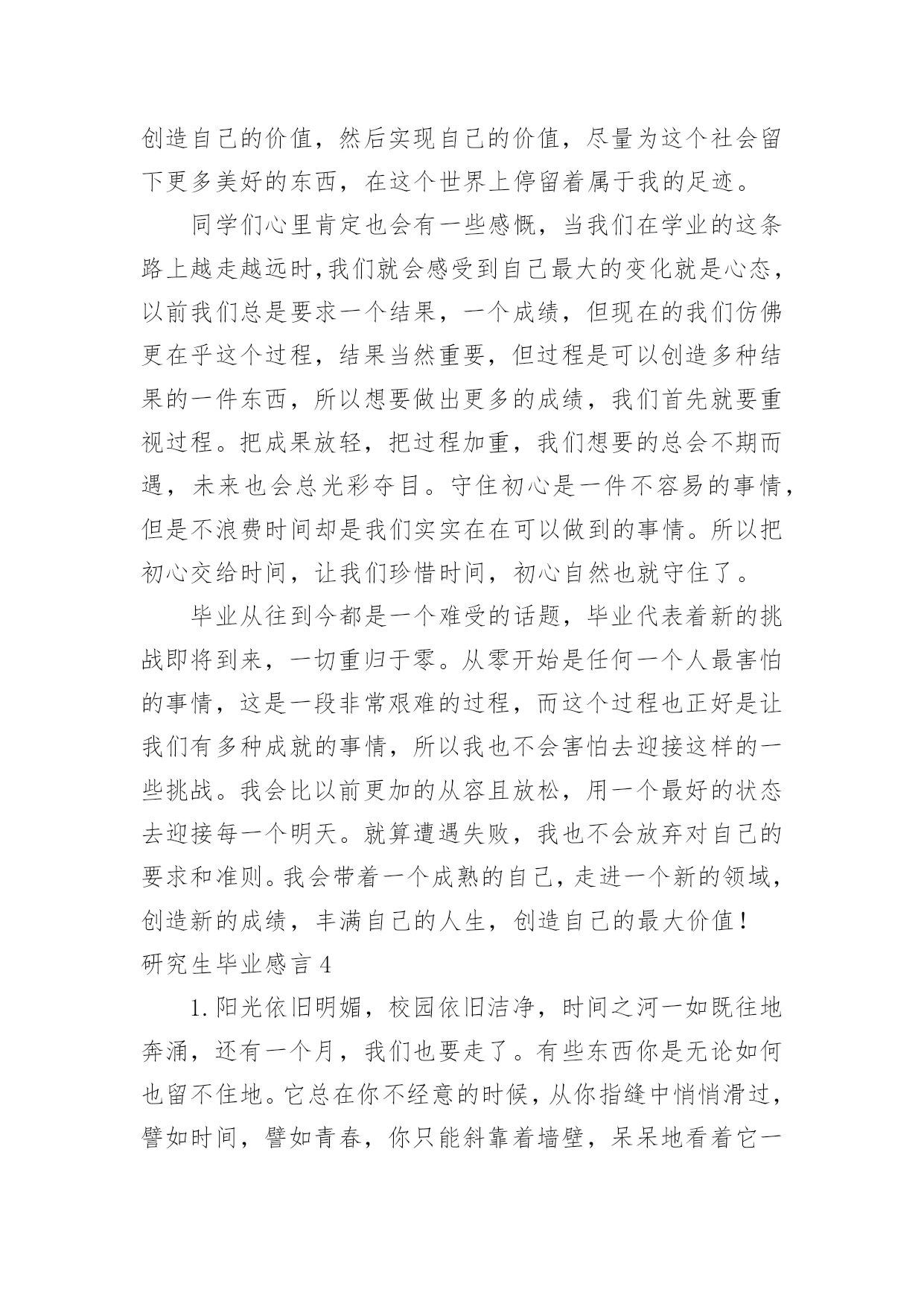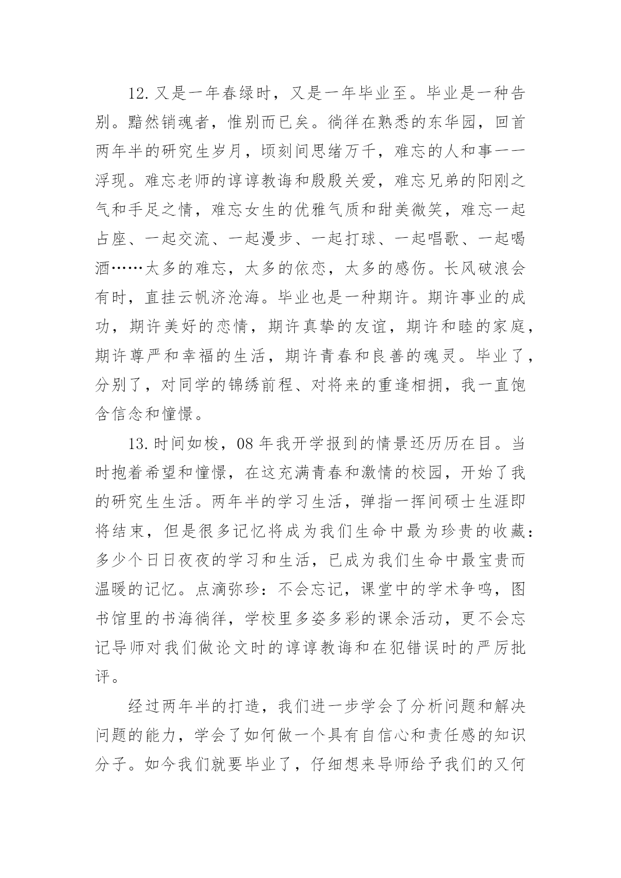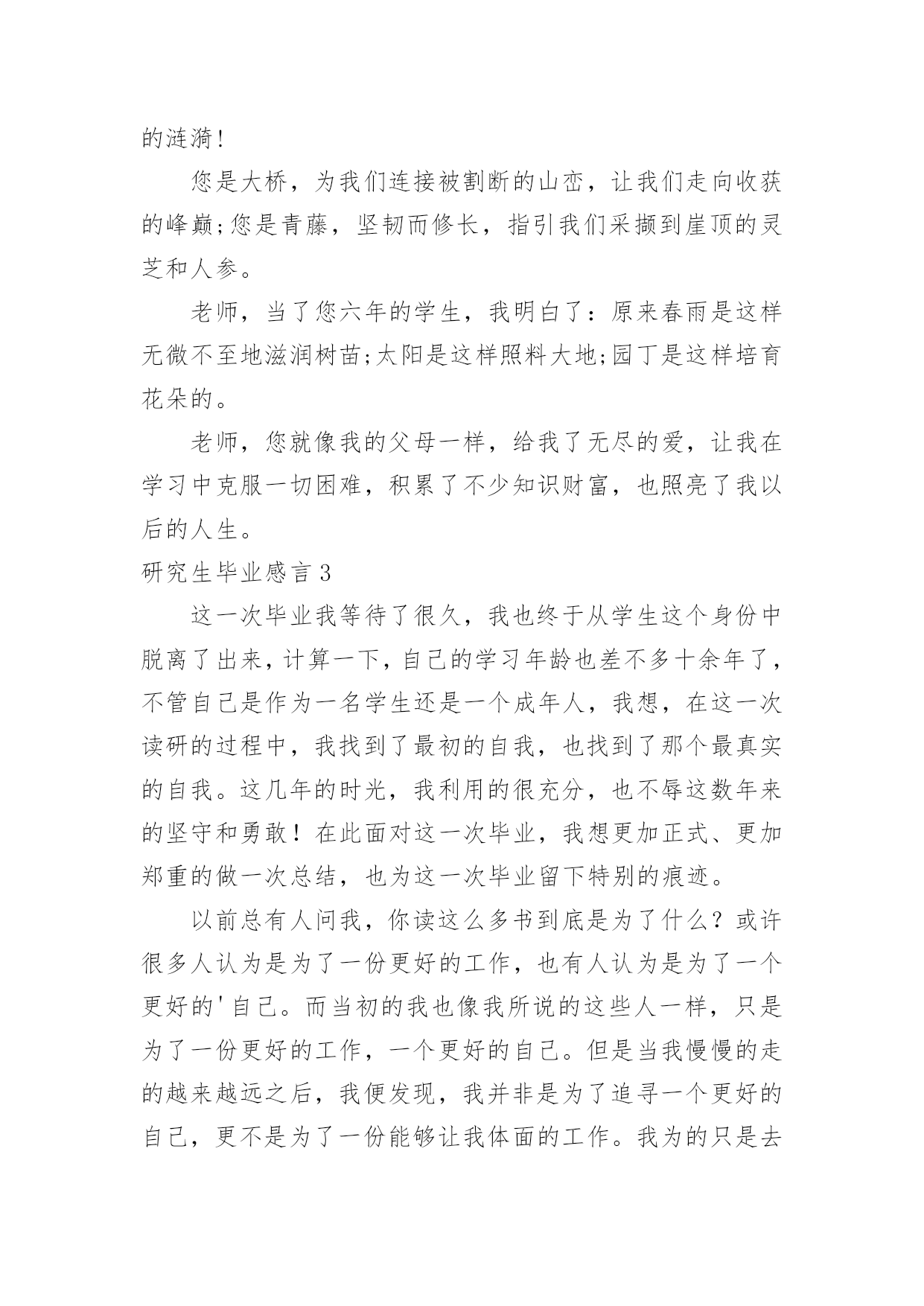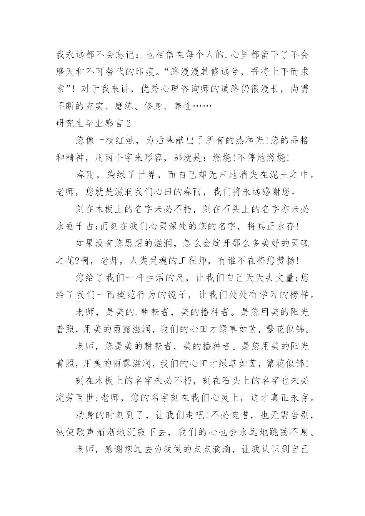 研究生毕业感言研究生毕业感言集锦15篇在学习、工作乃至生活中,我们总会收获一些心得和感悟,这时写感言就再好不过了。那么好的感言都具备一些什么特点呢?以下是小编为大家收集的研究生毕业感言,仅供参考,欢迎大家阅读。研究生毕业感言1每个人暂时别离或安逸或紧张匆忙的工作,抛开各路纷烦,走近我们的心灵,开始了我们崭新的心路历程:小组活动与团体活动中,大家都抱着一种开放与接纳的心态,坦露胸襟,使我们的心灵回到自然、温馨、舒适、随意的安放状态,让心灵得以放松、安祥与平静。每个人都有机会认真端详别人与探讨自己,有机会回归自己、回归真我。或许之前我们习惯审视别人,但这之后我们学会并实践着‘站在对方角度考虑问题’;或许之前我们有时怀疑爱的存在,但发现其实人人内心都非常渴望乃至因其珍贵而将其藏于心灵最深的地方。或许我们有时哀叹生活的不公与自己的不幸,但其实人人都会因生活的尖刺或利刃而受伤不浅,但庆幸大家都在磨砺中不同地坚强与成长着。所以我们应该感谢生活,如果不是它,我们不会有如此的聪慧与感悟!2年的日子说长也不长,说短也不短,在这2年的学习我永远都不会忘记:也相信在每个人的.心里都留下了不会磨灭和不可替代的印痕。“路漫漫其修远兮,吾将上下而求索”!对于我来讲,优秀心理咨询师的道路仍很漫长,尚需不断的充实、磨练、修身、养性……研究生毕业感言2您像一枝红烛,为后辈献出了所有的热和光!您的品格和精神,用两个字来形容,那就是:燃烧!不停地燃烧!春雨,染绿了世界,而自己却无声地消失在泥土之中。老师,您就是滋润我们心田的春雨,我们将永远感谢您。刻在木板上的名字未必不朽,刻在石头上的名字亦未必永垂千古;而刻在我们心灵深处的您的名字,将真正永存!如果没有您思想的滋润,怎么会绽开那么多美好的灵魂之花?啊,老师,人类灵魂的工程师,有谁不在将您赞扬!您给了我们一杆生活的尺,让我们自己天天去丈量;您给了我们一面模范行为的镜子,让我们处处有学习的榜样。老师,是美的.耕耘者,美的播种者。是您用美的阳光普照,用美的雨露滋润,我们的心田才绿草如茵,繁花似锦。老师,您是美的耕耘者,美的播种者。是您用美的阳光普照,用美的雨露滋润,我们的心田才绿草如茵,繁花似锦!刻在木板上的名字未必不朽,刻在石头上的名字也未必流芳百世;老师,您的名字刻在我们心灵上,这才真正永存。动身的时刻到了,让我们走吧!不必惋惜,也无需告别,纵使歌声渐渐地沉寂下去,我们的心也会永远地跳荡不息。老师,感谢您过去为我做的点点滴滴,让我认识到自己的错误。马上要毕业了,再见老师,希望您忘记我过去的不好。老师,跟您相处了两年,让我感觉轻松了不少。您教我怎样丢掉心中的‘石头’,教我怎样宽容别人,真得很感谢您!您的教师生涯,有无数骄傲和幸福的回忆,但您只是把它们珍藏在心底,您的目光注视着的,是又一片待开拓的园地。如果没有您思想之泉的滋润,怎么会绽开那么多美好的灵魂之花?啊,老师,人类灵魂的工程师,有谁不在将您赞扬!即使我两鬓斑白,依然会由衷地呼唤您一声――老师!在这个神圣而崇高的字眼面前,我永远是一个需要启蒙的学生!啊,有了您,花园才这般艳丽,大地才充满春意!老师,快推开窗子看吧,这满园春色,这满园桃李,都在向您敬礼!不计辛勤一砚寒,桃熟流丹,李熟枝残,种花容易树人难。幽谷飞香不一般,诗满人间,画满人间,英才济济笑开颜。敬爱的老师,谢谢您以辛勤的汗水滋润我们的心田,并抚育我们茁壮成长。愿您所有的日子都充满着幸福、欢乐与温馨!您的思想,您的话语,充溢着诗意,蕴含着哲理,又显得那么神奇――呵,在我的脑海里,它们曾激起过多少美妙的涟漪!您是大桥,为我们连接被割断的山峦,让我们走向收获的峰巅;您是青藤,坚韧而修长,指引我们采撷到崖顶的灵芝和人参。老师,当了您六年的学生,我明白了:原来春雨是这样无微不至地滋润树苗;太阳是这样照料大地;园丁是这样培育花朵的。老师,您就像我的父母一样,给我了无尽的爱,让我在学习中克服一切困难,积累了不少知识财富,也照亮了我以后的人生。研究生毕业感言3这一次毕业我等待了很久,我也终于从学生这个身份中脱离了出来,计算一下,自己的学习年龄也差不多十余年了,不管自己是作为一名学生还是一个成年人,我想,在这一次读研的过程中,我找到了最初的自我,也找到了那个最真实的自我。这几年的时光,我利用的很充分,也不辱这数年来的坚守和勇敢!在此面对这一次毕业,我想更加正式、更加郑重的做一次总结,也为这一次毕业留下特别的痕迹。以前总有人问我,你读这么多书到底是为了什么?或许很多人认为是为了一份更好的工作,也有人认为是为了一个更好的'自己。而当初的我也像我所说的这些人一样,只是为了一份更好的工作,一个更好的自己。但是当我慢慢的走的越来越远之后,我便发现,我并非是为了追寻一个更好的自己,更不是为了一份能够让我体面的工作。我为的只是去创