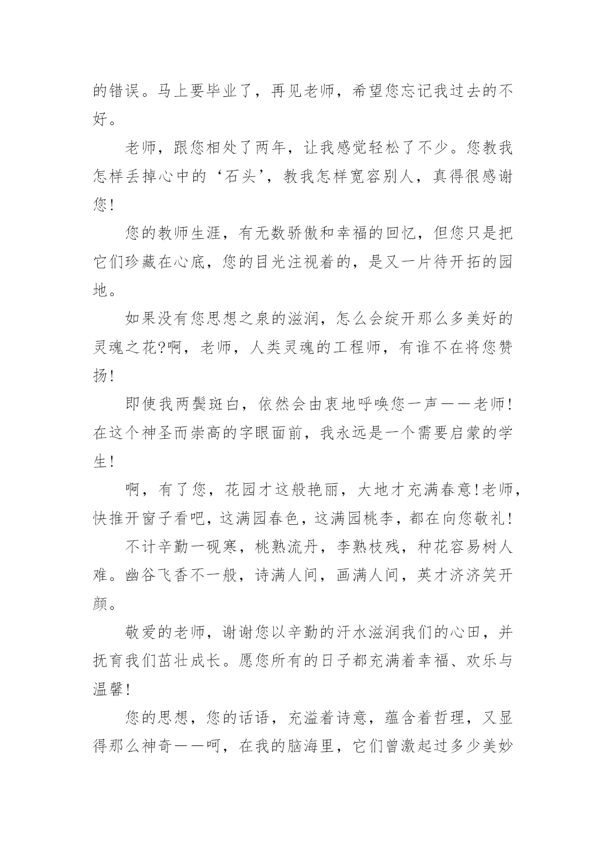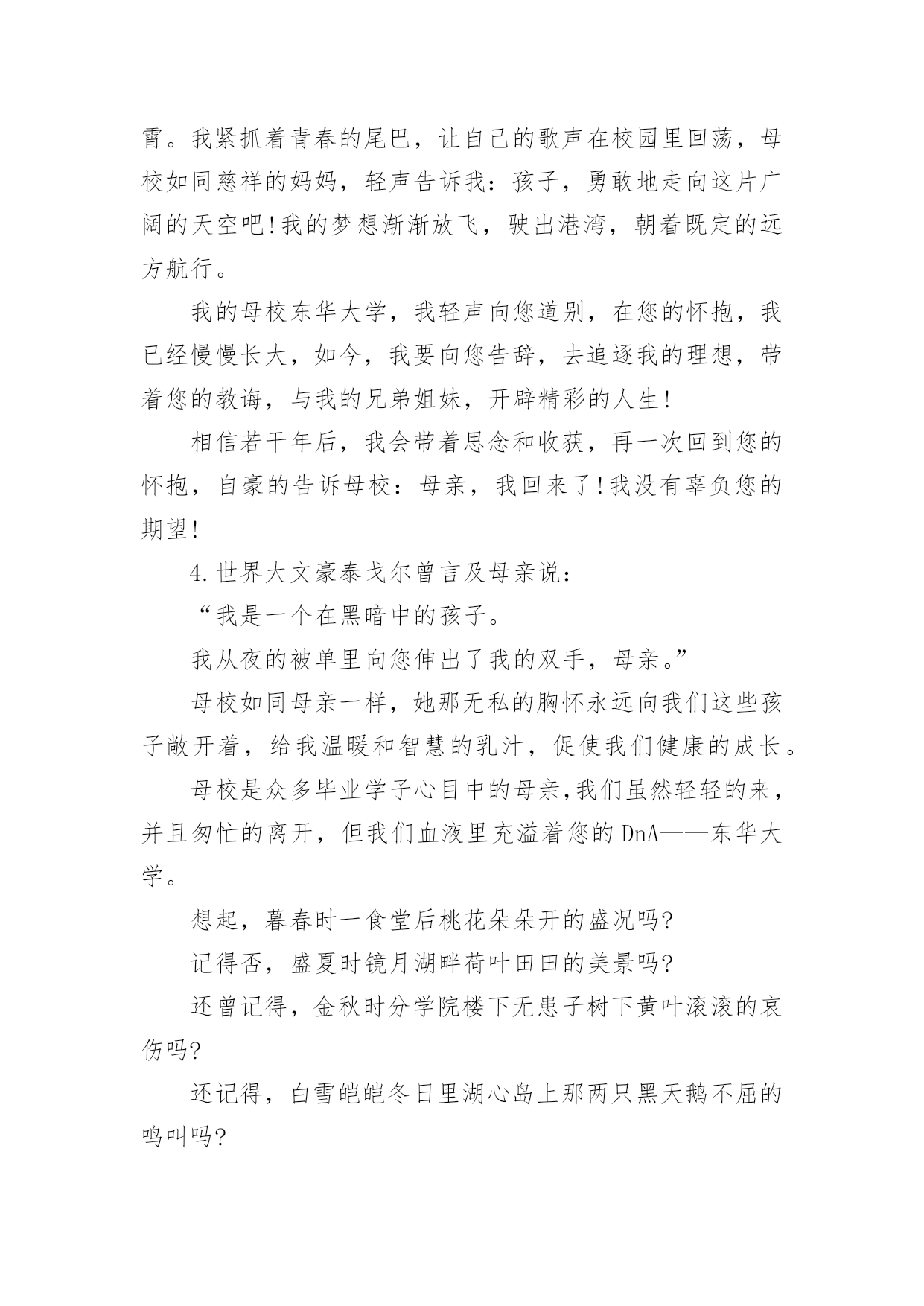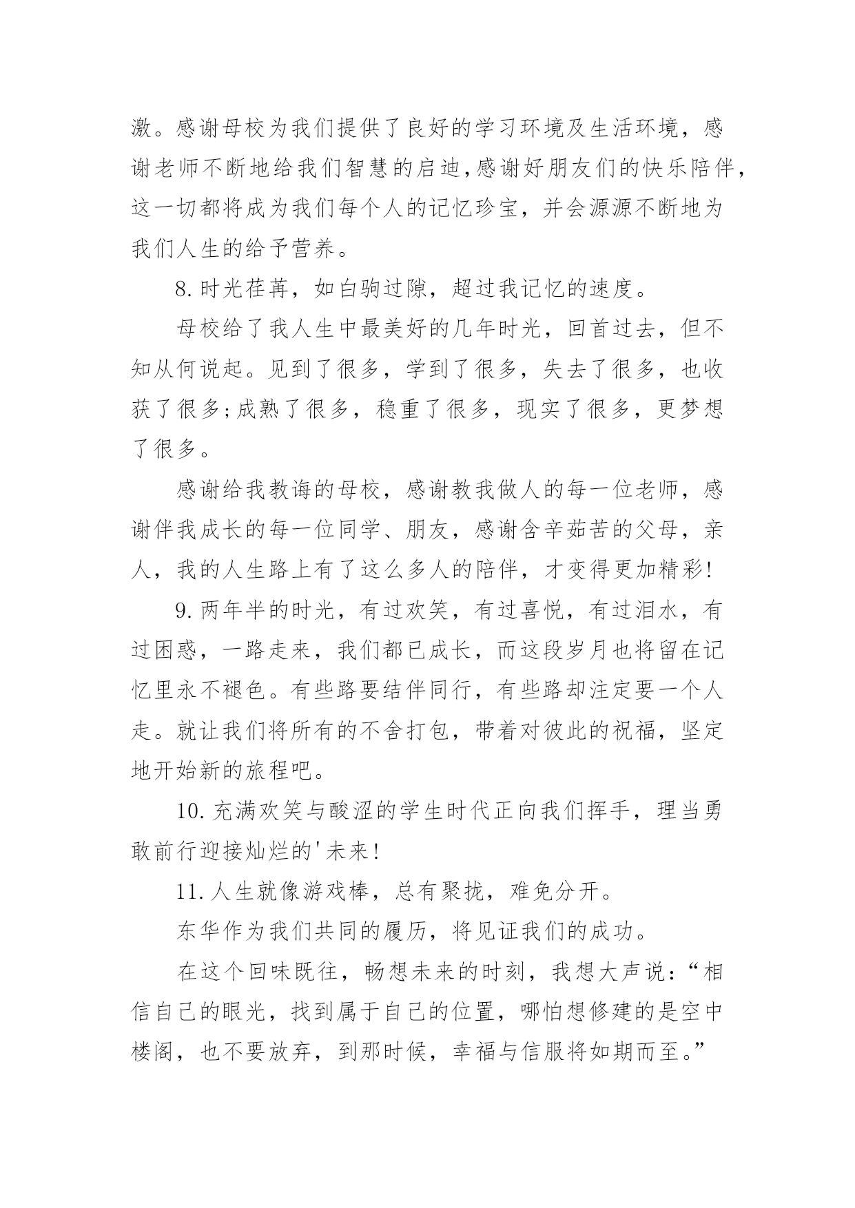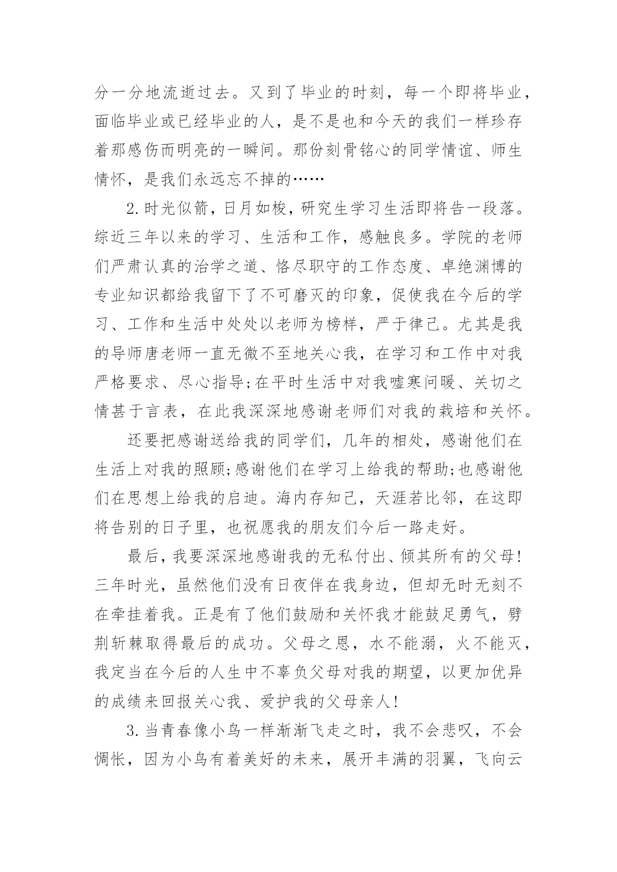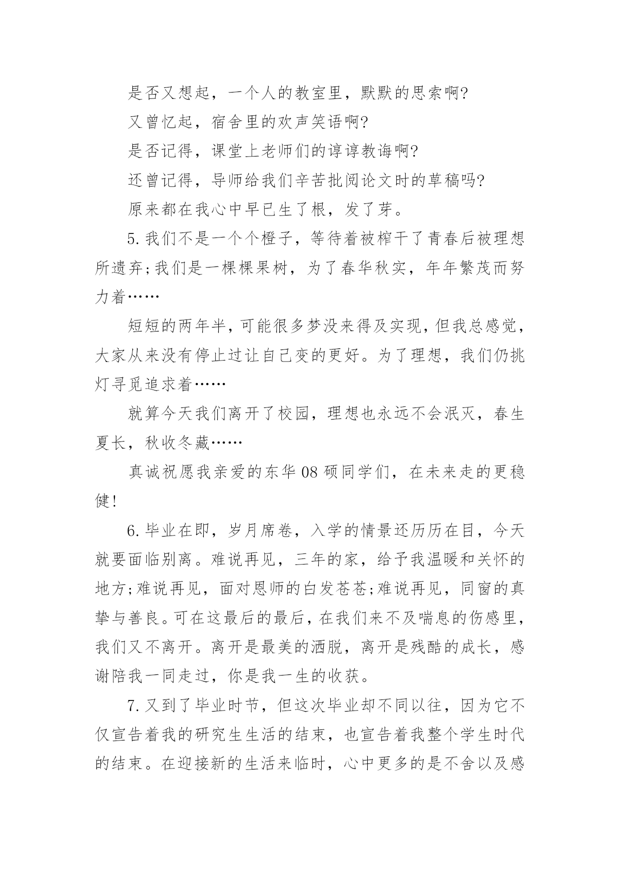 研究生毕业感言研究生毕业感言集锦15篇在学习、工作乃至生活中,我们总会收获一些心得和感悟,这时写感言就再好不过了。那么好的感言都具备一些什么特点呢?以下是小编为大家收集的研究生毕业感言,仅供参考,欢迎大家阅读。研究生毕业感言1每个人暂时别离或安逸或紧张匆忙的工作,抛开各路纷烦,走近我们的心灵,开始了我们崭新的心路历程:小组活动与团体活动中,大家都抱着一种开放与接纳的心态,坦露胸襟,使我们的心灵回到自然、温馨、舒适、随意的安放状态,让心灵得以放松、安祥与平静。每个人都有机会认真端详别人与探讨自己,有机会回归自己、回归真我。或许之前我们习惯审视别人,但这之后我们学会并实践着‘站在对方角度考虑问题’;或许之前我们有时怀疑爱的存在,但发现其实人人内心都非常渴望乃至因其珍贵而将其藏于心灵最深的地方。或许我们有时哀叹生活的不公与自己的不幸,但其实人人都会因生活的尖刺或利刃而受伤不浅,但庆幸大家都在磨砺中不同地坚强与成长着。所以我们应该感谢生活,如果不是它,我们不会有如此的聪慧与感悟!2年的日子说长也不长,说短也不短,在这2年的学习我永远都不会忘记:也相信在每个人的.心里都留下了不会磨灭和不可替代的印痕。“路漫漫其修远兮,吾将上下而求索”!对于我来讲,优秀心理咨询师的道路仍很漫长,尚需不断的充实、磨练、修身、养性……研究生毕业感言2您像一枝红烛,为后辈献出了所有的热和光!您的品格和精神,用两个字来形容,那就是:燃烧!不停地燃烧!春雨,染绿了世界,而自己却无声地消失在泥土之中。老师,您就是滋润我们心田的春雨,我们将永远感谢您。刻在木板上的名字未必不朽,刻在石头上的名字亦未必永垂千古;而刻在我们心灵深处的您的名字,将真正永存!如果没有您思想的滋润,怎么会绽开那么多美好的灵魂之花?啊,老师,人类灵魂的工程师,有谁不在将您赞扬!您给了我们一杆生活的尺,让我们自己天天去丈量;您给了我们一面模范行为的镜子,让我们处处有学习的榜样。老师,是美的.耕耘者,美的播种者。是您用美的阳光普照,用美的雨露滋润,我们的心田才绿草如茵,繁花似锦。老师,您是美的耕耘者,美的播种者。是您用美的阳光普照,用美的雨露滋润,我们的心田才绿草如茵,繁花似锦!刻在木板上的名字未必不朽,刻在石头上的名字也未必流芳百世;老师,您的名字刻在我们心灵上,这才真正永存。动身的时刻到了,让我们走吧!不必惋惜,也无需告别,纵使歌声渐渐地沉寂下去,我们的心也会永远地跳荡不息。老师,感谢您过去为我做的点点滴滴,让我认识到自己的错误。马上要毕业了,再见老师,希望您忘记我过去的不好。老师,跟您相处了两年,让我感觉轻松了不少。您教我怎样丢掉心中的‘石头’,教我怎样宽容别人,真得很感谢您!您的教师生涯,有无数骄傲和幸福的回忆,但您只是把它们珍藏在心底,您的目光注视着的,是又一片待开拓的园地。如果没有您思想之泉的滋润,怎么会绽开那么多美好的灵魂之花?啊,老师,人类灵魂的工程师,有谁不在将您赞扬!即使我两鬓斑白,依然会由衷地呼唤您一声――老师!在这个神圣而崇高的字眼面前,我永远是一个需要启蒙的学生!啊,有了您,花园才这般艳丽,大地才充满春意!老师,快推开窗子看吧,这满园春色,这满园桃李,都在向您敬礼!不计辛勤一砚寒,桃熟流丹,李熟枝残,种花容易树人难。幽谷飞香不一般,诗满人间,画满人间,英才济济笑开颜。敬爱的老师,谢谢您以辛勤的汗水滋润我们的心田,并抚育我们茁壮成长。愿您所有的日子都充满着幸福、欢乐与温馨!您的思想,您的话语,充溢着诗意,蕴含着哲理,又显得那么神奇――呵,在我的脑海里,它们曾激起过多少美妙的涟漪!您是大桥,为我们连接被割断的山峦,让我们走向收获的峰巅;您是青藤,坚韧而修长,指引我们采撷到崖顶的灵芝和人参。老师,当了您六年的学生,我明白了:原来春雨是这样无微不至地滋润树苗;太阳是这样照料大地;园丁是这样培育花朵的。老师,您就像我的父母一样,给我了无尽的爱,让我在学习中克服一切困难,积累了不少知识财富,也照亮了我以后的人生。研究生毕业感言3这一次毕业我等待了很久,我也终于从学生这个身份中脱离了出来,计算一下,自己的学习年龄也差不多十余年了,不管自己是作为一名学生还是一个成年人,我想,在这一次读研的过程中,我找到了最初的自我,也找到了那个最真实的自我。这几年的时光,我利用的很充分,也不辱这数年来的坚守和勇敢!在此面对这一次毕业,我想更加正式、更加郑重的做一次总结,也为这一次毕业留下特别的痕迹。以前总有人问我,你读这么多书到底是为了什么?或许很多人认为是为了一份更好的工作,也有人认为是为了一个更好的'自己。而当初的我也像我所说的这些人一样,只是为了一份更好的工作,一个更好的自己。但是当我慢慢的走的越来越远之后,我便发现,我并非是为了追寻一个更好的自己,更不是为了一份能够让我体面的工作。我为的只是去创
