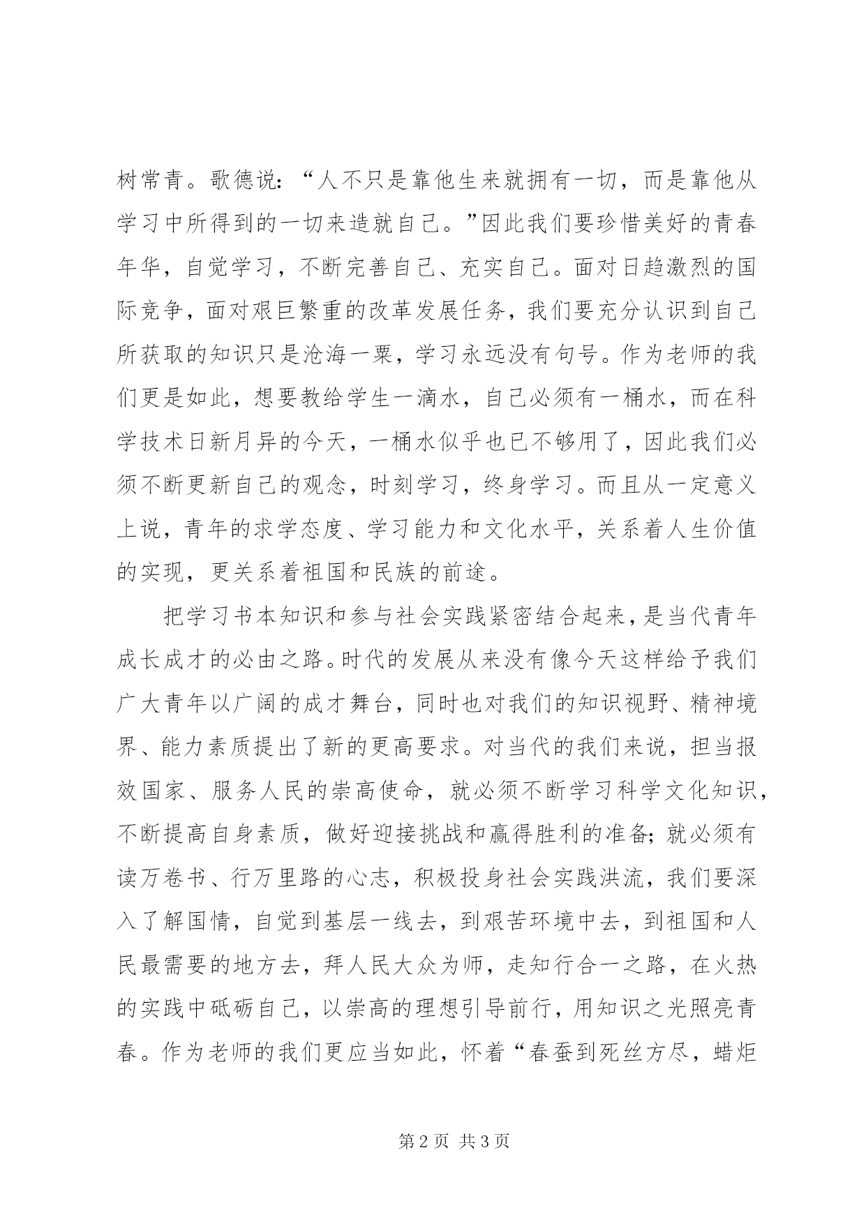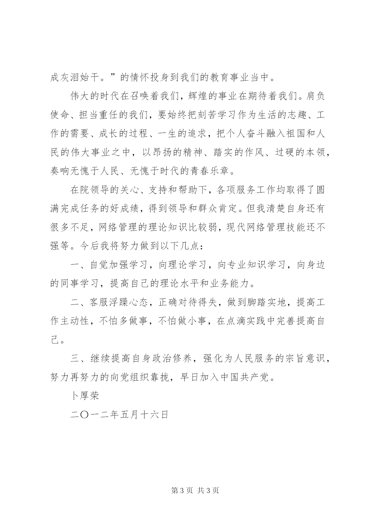 第PAGE\*Arabic\*MERGEFORMAT3页共NUMPAGES\*MERGEFORMAT3页五四青年说心得体会心得体会青春是起航的征帆,远大理想是灯塔,刻苦学习、艰苦奋斗是不竭动力,以高尚品行护航,开拓创新为核心竞争力。胡总书记提出的五点希望,正是鼓励引导广大青年扬帆远航、勇担使命的深情寄语。作为单位的网络管理员,做好管理啊,资讯要丰富,更新要及时,要保证网络的畅通和安全。要跟各庭审做好工作,广泛收集信息和资料。自己首先要学习,要以严格要求自己,这样才能法院网络正常工作,为审判业务保驾护航。2012年5月4日,中国共产主义青年团成立90周年的日子,90年的光辉岁月凝聚着一代又一代青年志士的奉献,一代又一代的青年团员在党中央及各领导的关怀下,不断发展,幸福成长。在今年的纪念大会上胡总书记不仅表达了对青年一代的关怀与爱护,同时也给我们青年一代提出了新的希望和要求。胡锦涛总书记在五四重要讲话中希望广大青年坚持刻苦学习,面向现代化、面向世界、面向未来,以只争朝夕的紧迫感,如饥似渴地学习,不断充实自己、提高自己、丰富自己;同时,注重在实践的熔炉中增长见识、砥砺品质、强化本领,努力成为可堪大用、能负重任的栋梁之材。这是党对我们青年一代的殷切期待,对于激励我们的成长成才具有重要意义。青春是一个充满求知渴望、富于探索和追求的黄金时期。青春稍纵即逝,知识之树常青。歌德说:“人不只是靠他生来就拥有一切,而是靠他从学习中所得到的一切来造就自己。”因此我们要珍惜美好的青春年华,自觉学习,不断完善自己、充实自己。面对日趋激烈的国际竞争,面对艰巨繁重的改革发展任务,我们要充分认识到自己所获取的知识只是沧海一粟,学习永远没有句号。作为老师的我们更是如此,想要教给学生一滴水,自己必须有一桶水,而在科学技术日新月异的今天,一桶水似乎也已不够用了,因此我们必须不断更新自己的观念,时刻学习,终身学习。而且从一定意义上说,青年的求学态度、学习能力和文化水平,关系着人生价值的实现,更关系着祖国和民族的前途。把学习书本知识和参与社会实践紧密结合起来,是当代青年成长成才的必由之路。时代的发展从来没有像今天这样给予我们广大青年以广阔的成才舞台,同时也对我们的知识视野、精神境界、能力素质提出了新的更高要求。对当代的我们来说,担当报效国家、服务人民的崇高使命,就必须不断学习科学文化知识,不断提高自身素质,做好迎接挑战和赢得胜利的准备;就必须有读万卷书、行万里路的心志,积极投身社会实践洪流,我们要深入了解国情,自觉到基层一线去,到艰苦环境中去,到祖国和人民最需要的地方去,拜人民大众为师,走知行合一之路,在火热的实践中砥砺自己,以崇高的理想引导前行,用知识之光照亮青春。作为老师的我们更应当如此,怀着“春蚕到死丝方尽,蜡炬成灰泪始干。”的情怀投身到我们的教育事业当中。伟大的时代在召唤着我们,辉煌的事业在期待着我们。肩负使命、担当重任的我们,要始终把刻苦学习作为生活的志趣、工作的需要、成长的过程、一生的追求,把个人奋斗融入祖国和人民的伟大事业之中,以昂扬的精神、踏实的作风、过硬的本领,奏响无愧于人民、无愧于时代的青春乐章。在院领导的关心、支持和帮助下,各项服务工作均取得了圆满完成任务的好成绩,得到领导和群众肯定。但我清楚自身还有很多不足,网络管理的理论知识比较弱,现代网络管理技能还不强等。今后我将努力做到以下几点:一、自觉加强学习,向理论学习,向专业知识学习,向身边的同事学习,提高自己的理论水平和业务能力。二、客服浮躁心态,正确对待得失,做到脚踏实地,提高工作主动性,不怕多做事,不怕做小事,在点滴实践中完善提高自己。三、继续提高自身政治修养,强化为人民服务的宗旨意识,努力再努力的向党组织靠拢,早日加入中国共产党。卜厚荣二〇一二年五月十六日