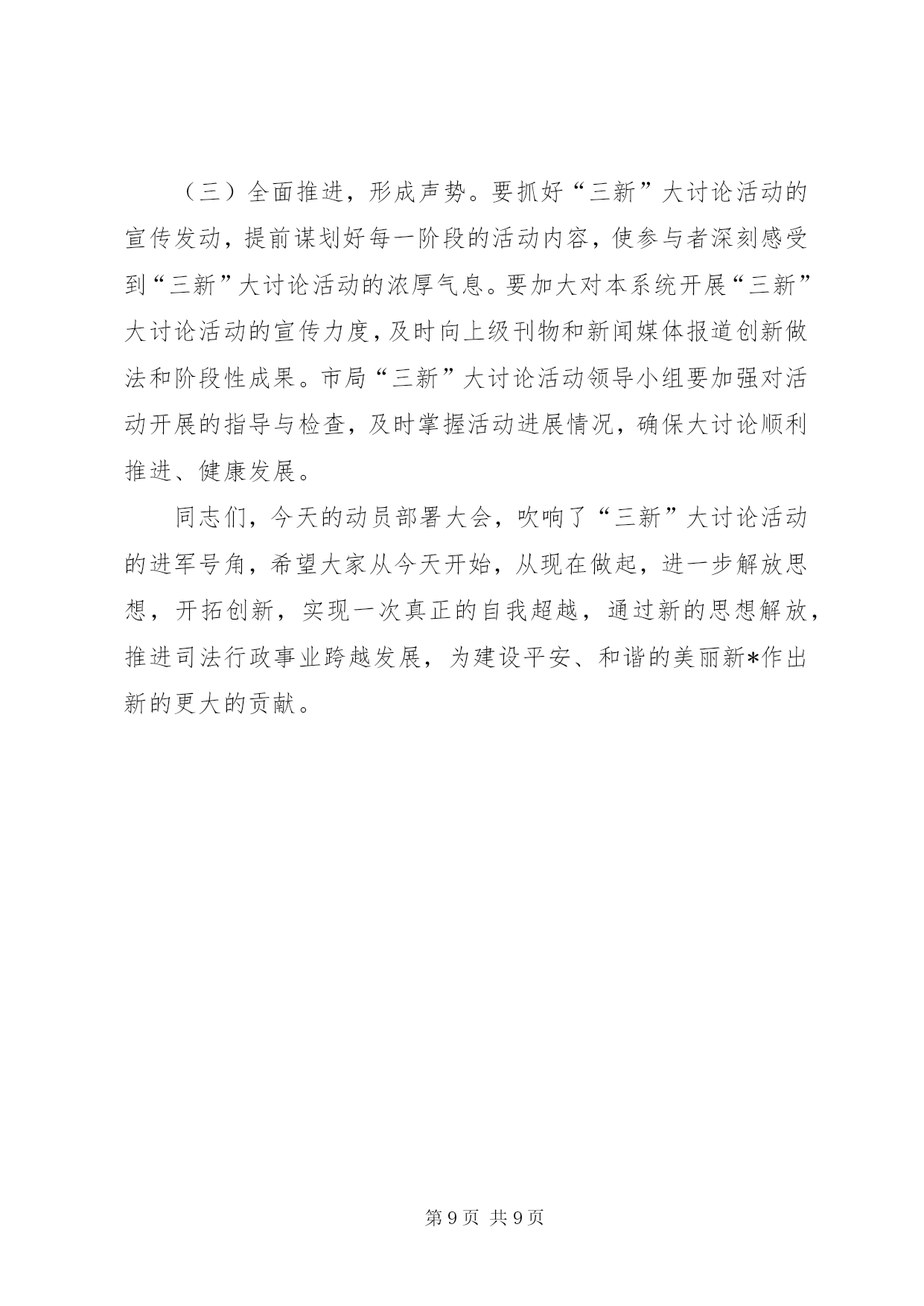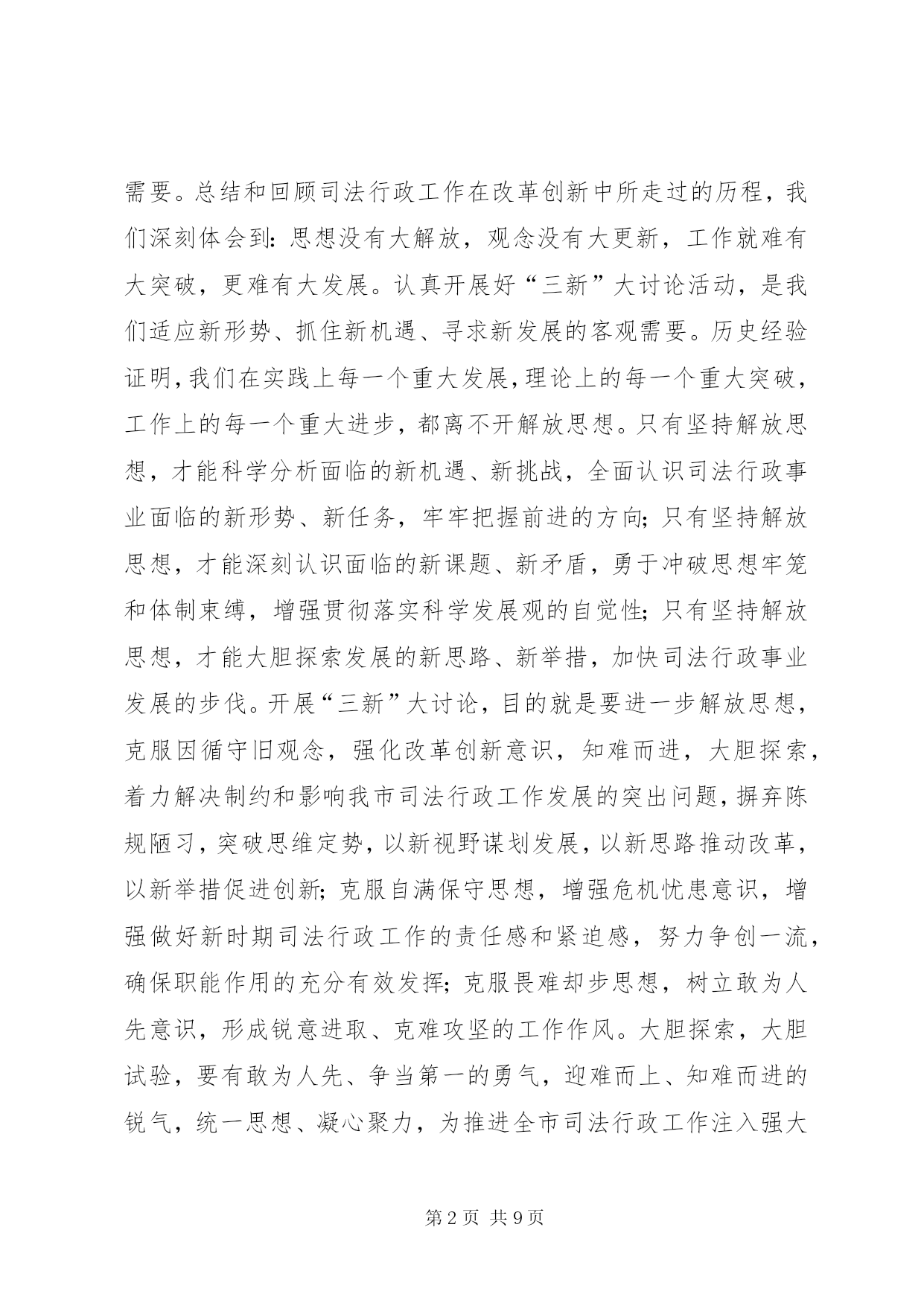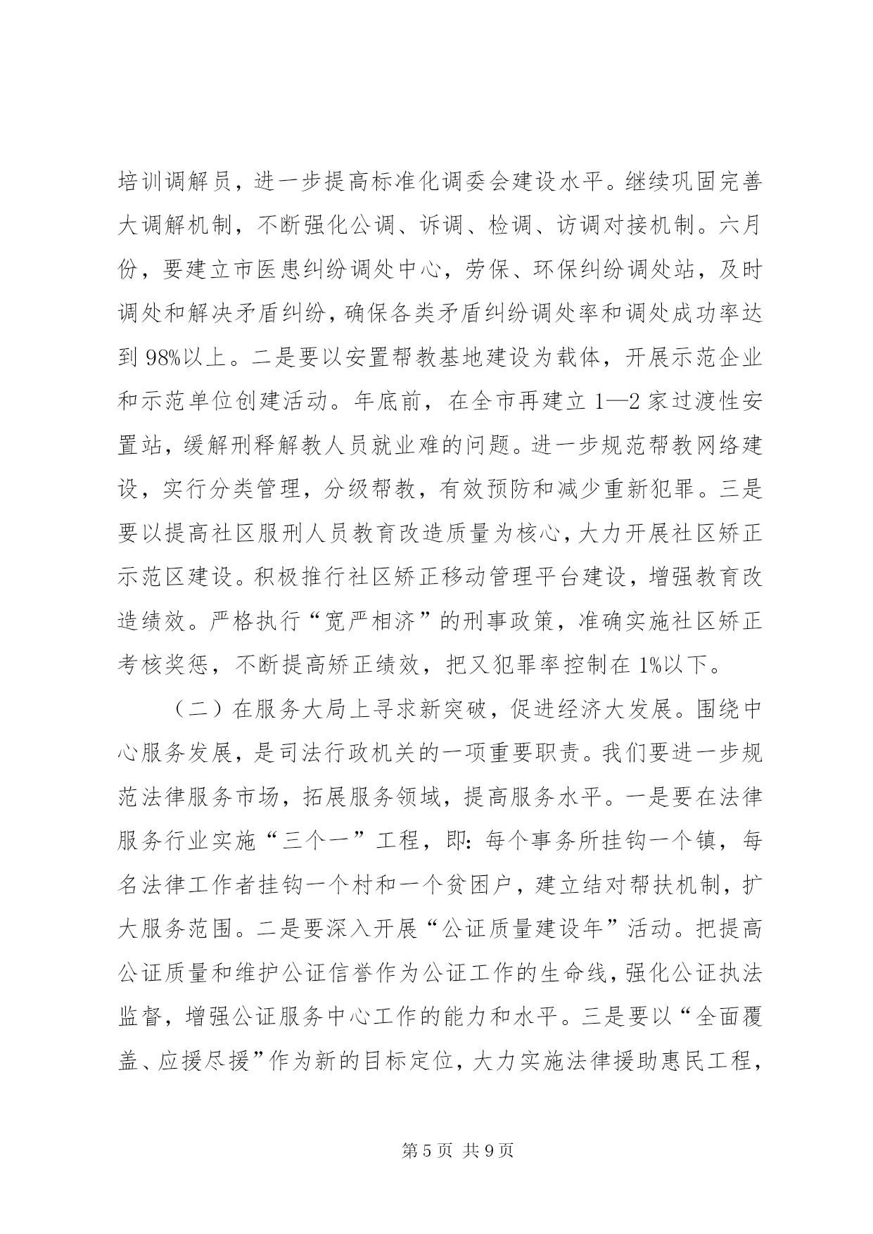 第PAGE\*Arabic\*MERGEFORMAT9页共NUMPAGES\*MERGEFORMAT9页司法行政讨论动员大会上的讲话同志们:最近,市委召开了十届六次全会,会议号召要解放思想,科学发展,好省多快建设美丽新*。*市委政法委、*市司法局先后召开了以“适应新形势、立足新起点、提升新水平”为主题的“三新”大讨论动员大会。为了及时深入地贯彻落实市委十届六次全会和*市“三新”大讨论动员会议精神,经局党组研究,今天,我们在这里召开全市司法行政系统贯彻落实市委十届六次全会精神暨“三新”大讨论动员大会,目的就是进一步统一思想,动员司法行政系统广大党员干部积极投身“三新”大讨论活动,通过大讨论,促进大作为,实现大发展。下面,我讲三点意见,供大家参考。一、统一思想,提高认识,增强开展“三新”大讨论活动的责任感开展“三新”大讨论活动是贯彻党的十七大精神和中央政法委部署的一项重要举措,在司法行政系统开展“三新”大讨论无疑将对包括司法行政工作在内的全市政法工作产生积极的影响。因此,我们要深刻认识开展“三新”大讨论活动的重要性和紧迫性,把“三新”大讨论活动当作开创全市司法行政工作新局面的奠基工程和加强司法行政队伍建设的灵魂工程认真抓好。首先,开展“三新”大讨论活动是新一轮思想大解放的迫切需要。总结和回顾司法行政工作在改革创新中所走过的历程,我们深刻体会到:思想没有大解放,观念没有大更新,工作就难有大突破,更难有大发展。认真开展好“三新”大讨论活动,是我们适应新形势、抓住新机遇、寻求新发展的客观需要。历史经验证明,我们在实践上每一个重大发展,理论上的每一个重大突破,工作上的每一个重大进步,都离不开解放思想。只有坚持解放思想,才能科学分析面临的新机遇、新挑战,全面认识司法行政事业面临的新形势、新任务,牢牢把握前进的方向;只有坚持解放思想,才能深刻认识面临的新课题、新矛盾,勇于冲破思想牢笼和体制束缚,增强贯彻落实科学发展观的自觉性;只有坚持解放思想,才能大胆探索发展的新思路、新举措,加快司法行政事业发展的步伐。开展“三新”大讨论,目的就是要进一步解放思想,克服因循守旧观念,强化改革创新意识,知难而进,大胆探索,着力解决制约和影响我市司法行政工作发展的突出问题,摒弃陈规陋习,突破思维定势,以新视野谋划发展,以新思路推动改革,以新举措促进创新;克服自满保守思想,增强危机忧患意识,增强做好新时期司法行政工作的责任感和紧迫感,努力争创一流,确保职能作用的充分有效发挥;克服畏难却步思想,树立敢为人先意识,形成锐意进取、克难攻坚的工作作风。大胆探索,大胆试验,要有敢为人先、争当第一的勇气,迎难而上、知难而进的锐气,统一思想、凝心聚力,为推进全市司法行政工作注入强大动力。其次,开展“三新”大讨论活动是适应经济发展新形势的必然要求。随着改革开放的不断深入,苏通大桥的胜利通车,我市已全面融入上海一小时都市圈、经济圈和生活圈,真正迎来了前景广阔的大桥经济时代。然而,巨大的人流、物流、信息流、思想意识流将在这里交汇,这个巨大的划时代的变化,对司法行政工作带来前所未有的影响。我们的法制宣传、法律服务和法律保障工作,虽然取得了较好的法律效果和社会效果,但是经济大发展带来的人口剧增由此引发的一系列社会问题对司法行政工作提出了巨大的挑战,如何更好地处理各类矛盾纠纷,有效地进行普法宣传,提供优质的法律服务,我们还缺乏必要的思想准备和应对措施。面临新的形势,我们要更加坚定自觉地贯彻落实科学发展观,努力使工作思维适应日益发展、多态多元的形势需要,以思想的大解放、观念的大更新,促进工作的大跨越。第三,开展“三新”大讨论活动是实现司法行政事业跨越发展的重要途径。当前,司法行政工作正面临着千载难逢的机遇和前所未有的挑战。完成历史赋予的神圣使命,我们深感光荣而艰巨,任重而道远。要实现全市司法行政事业跨越式发展,必须在更高层次、更深程度、更广范围上开展解放思想大讨论活动,争当解放思想的排头兵,深刻审视司法行政事业目前所处的历史时期,分析存在的差距和优势,探寻司法行政事业发展规律,找出影响司法行政事业发展的主要矛盾,逐步消除发展瓶颈,破解发展难题,把思想观念从不适应、不利于司法行政事业科学发展的模糊认识中解放出来,以“三新”大讨论,推动全市司法行政事业又好又快发展。广大党员干部要积极响应局党组的号召,立即行动起来,迅速掀起“三新”大讨论的热潮。要善于用科学发展观武装头脑,勇于接受思想解放这一重大洗礼,努力破除各种旧观念、旧思维、旧习惯,切实在创新发展思路上求突破,在破解现实困难上求突破,在追求工作创新上求突破,用全新的视角和创新的思路指导各项工作,真正使解放思想成为促进司法行政事业又好又快发展的强大动力。二、把握重点,寻求突破,努力推进司法行政工作新跨越开展“三新”大讨