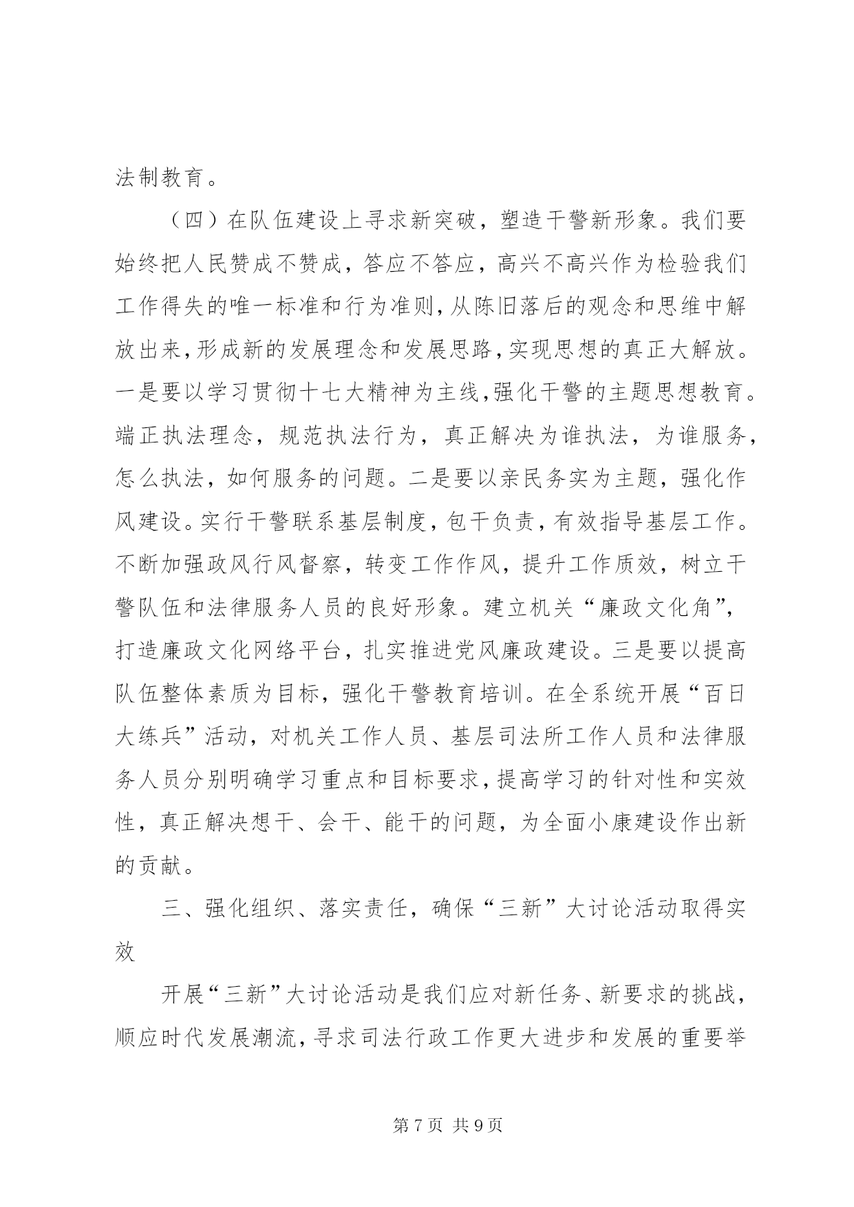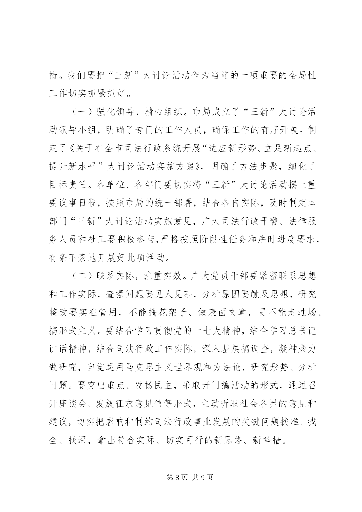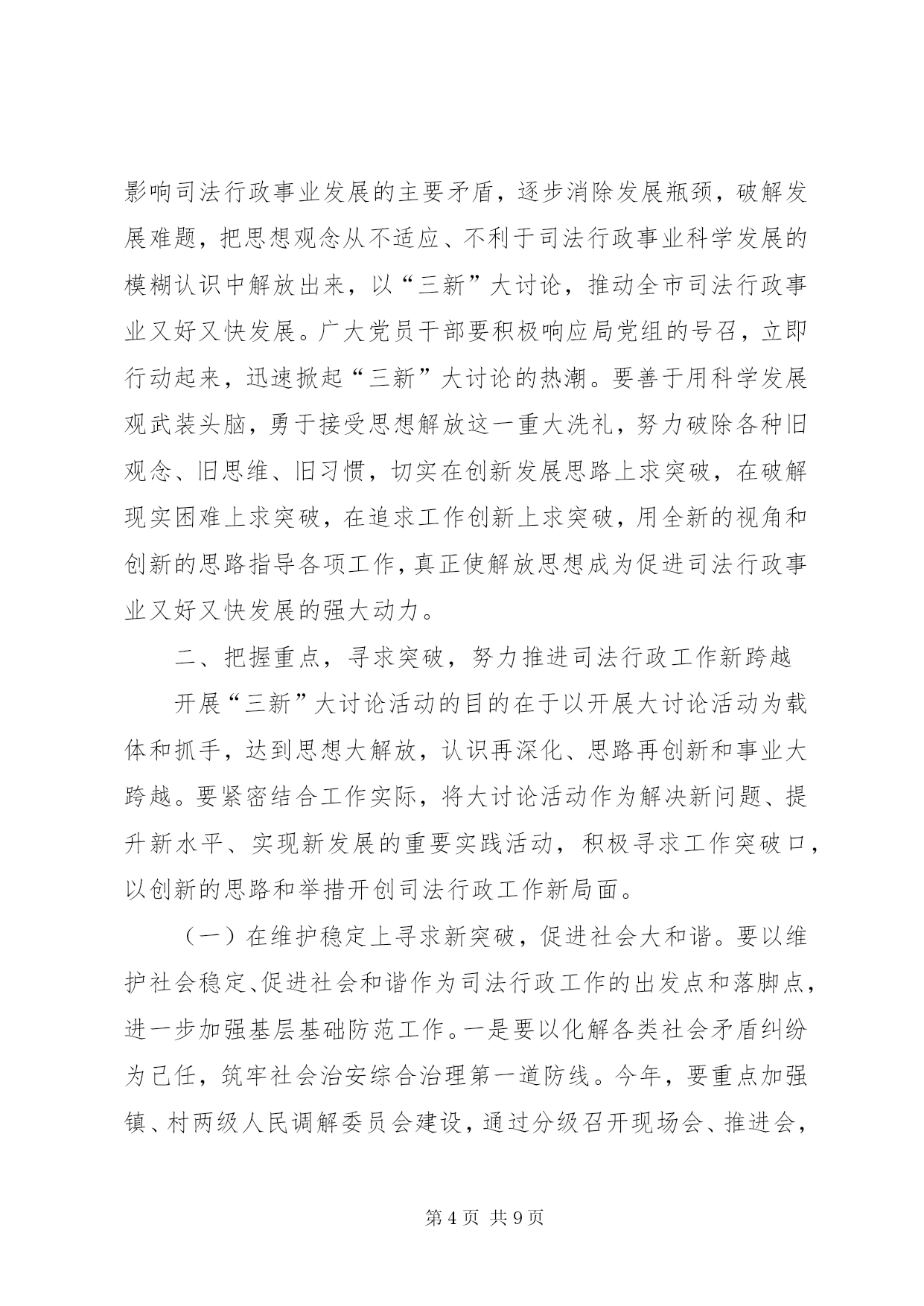 第PAGE\*Arabic\*MERGEFORMAT9页共NUMPAGES\*MERGEFORMAT9页司法行政讨论动员大会上的讲话同志们:最近,市委召开了十届六次全会,会议号召要解放思想,科学发展,好省多快建设美丽新*。*市委政法委、*市司法局先后召开了以“适应新形势、立足新起点、提升新水平”为主题的“三新”大讨论动员大会。为了及时深入地贯彻落实市委十届六次全会和*市“三新”大讨论动员会议精神,经局党组研究,今天,我们在这里召开全市司法行政系统贯彻落实市委十届六次全会精神暨“三新”大讨论动员大会,目的就是进一步统一思想,动员司法行政系统广大党员干部积极投身“三新”大讨论活动,通过大讨论,促进大作为,实现大发展。下面,我讲三点意见,供大家参考。一、统一思想,提高认识,增强开展“三新”大讨论活动的责任感开展“三新”大讨论活动是贯彻党的十七大精神和中央政法委部署的一项重要举措,在司法行政系统开展“三新”大讨论无疑将对包括司法行政工作在内的全市政法工作产生积极的影响。因此,我们要深刻认识开展“三新”大讨论活动的重要性和紧迫性,把“三新”大讨论活动当作开创全市司法行政工作新局面的奠基工程和加强司法行政队伍建设的灵魂工程认真抓好。首先,开展“三新”大讨论活动是新一轮思想大解放的迫切需要。总结和回顾司法行政工作在改革创新中所走过的历程,我们深刻体会到:思想没有大解放,观念没有大更新,工作就难有大突破,更难有大发展。认真开展好“三新”大讨论活动,是我们适应新形势、抓住新机遇、寻求新发展的客观需要。历史经验证明,我们在实践上每一个重大发展,理论上的每一个重大突破,工作上的每一个重大进步,都离不开解放思想。只有坚持解放思想,才能科学分析面临的新机遇、新挑战,全面认识司法行政事业面临的新形势、新任务,牢牢把握前进的方向;只有坚持解放思想,才能深刻认识面临的新课题、新矛盾,勇于冲破思想牢笼和体制束缚,增强贯彻落实科学发展观的自觉性;只有坚持解放思想,才能大胆探索发展的新思路、新举措,加快司法行政事业发展的步伐。开展“三新”大讨论,目的就是要进一步解放思想,克服因循守旧观念,强化改革创新意识,知难而进,大胆探索,着力解决制约和影响我市司法行政工作发展的突出问题,摒弃陈规陋习,突破思维定势,以新视野谋划发展,以新思路推动改革,以新举措促进创新;克服自满保守思想,增强危机忧患意识,增强做好新时期司法行政工作的责任感和紧迫感,努力争创一流,确保职能作用的充分有效发挥;克服畏难却步思想,树立敢为人先意识,形成锐意进取、克难攻坚的工作作风。大胆探索,大胆试验,要有敢为人先、争当第一的勇气,迎难而上、知难而进的锐气,统一思想、凝心聚力,为推进全市司法行政工作注入强大动力。其次,开展“三新”大讨论活动是适应经济发展新形势的必然要求。随着改革开放的不断深入,苏通大桥的胜利通车,我市已全面融入上海一小时都市圈、经济圈和生活圈,真正迎来了前景广阔的大桥经济时代。然而,巨大的人流、物流、信息流、思想意识流将在这里交汇,这个巨大的划时代的变化,对司法行政工作带来前所未有的影响。我们的法制宣传、法律服务和法律保障工作,虽然取得了较好的法律效果和社会效果,但是经济大发展带来的人口剧增由此引发的一系列社会问题对司法行政工作提出了巨大的挑战,如何更好地处理各类矛盾纠纷,有效地进行普法宣传,提供优质的法律服务,我们还缺乏必要的思想准备和应对措施。面临新的形势,我们要更加坚定自觉地贯彻落实科学发展观,努力使工作思维适应日益发展、多态多元的形势需要,以思想的大解放、观念的大更新,促进工作的大跨越。第三,开展“三新”大讨论活动是实现司法行政事业跨越发展的重要途径。当前,司法行政工作正面临着千载难逢的机遇和前所未有的挑战。完成历史赋予的神圣使命,我们深感光荣而艰巨,任重而道远。要实现全市司法行政事业跨越式发展,必须在更高层次、更深程度、更广范围上开展解放思想大讨论活动,争当解放思想的排头兵,深刻审视司法行政事业目前所处的历史时期,分析存在的差距和优势,探寻司法行政事业发展规律,找出影响司法行政事业发展的主要矛盾,逐步消除发展瓶颈,破解发展难题,把思想观念从不适应、不利于司法行政事业科学发展的模糊认识中解放出来,以“三新”大讨论,推动全市司法行政事业又好又快发展。广大党员干部要积极响应局党组的号召,立即行动起来,迅速掀起“三新”大讨论的热潮。要善于用科学发展观武装头脑,勇于接受思想解放这一重大洗礼,努力破除各种旧观念、旧思维、旧习惯,切实在创新发展思路上求突破,在破解现实困难上求突破,在追求工作创新上求突破,用全新的视角和创新的思路指导各项工作,真正使解放思想成为促进司法行政事业又好又快发展的强大动力。二、把握重点,寻求突破,努力推进司法行政工作新跨越开展“三新”大讨