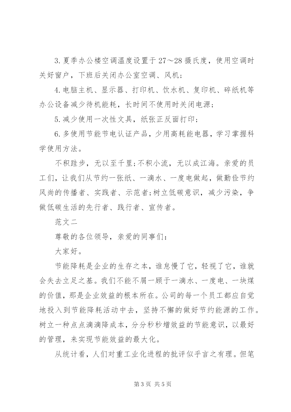 第PAGE\*Arabic\*MERGEFORMAT5页共NUMPAGES\*MERGEFORMAT5页企业低碳环保的倡议书范文一亲爱的员工们:国务院总理xx12月18日在丹麦哥本哈根气候变化会议领导人会议上发表题为《凝聚共识加强合作推进应对气候变化历史进程》的重要讲话。他指出:遏制气候变暖,拯救地球家园,是全人类共同的使命,每个国家和民族,每个企业和个人,都应当责无旁贷地行动起来。你是否知道。每节约一度电,就相当于节省了0.4千克煤的能耗和4升净水,同时还减少1千克二氧化碳和千克的二氧化硫的排放;全国一个人节约1度电,那么13亿人就可以省下5.2亿千克煤的能耗,减少13亿千克二氧化碳的排放hellip;hellip;节能环保和低碳生活多么重要。追求健康生活,不仅要低脂、低盐、低糖,也要低碳。低碳生活(low-carbonlife)节能环保,有利于减缓全球气候变暖和环境恶化的速度,势在必行。低碳生活就是提倡借助低能量、低消耗、低开支的生活方式,把生活耗用能量降到最低,从而减少二氧化碳的排放,保护地球环境不再持续变暖。减少二氧化碳排放,选择低碳生活,是摆在全社会面前的重要课题。作为一个有社会责任感的企业,我们有责任与全社会一道,从自己做起,从现在做起,从小事做起,减少污染,保护环境,低碳生活。在此,公司党委、工会、团委向全体员工发出倡议:一、学习低碳知识,树立低碳意识,坚持低碳设计,倡导低碳生活,努力践行低碳生活,从我做起主题活动。二、致力于引导客户节能环保,追求低碳生活。努力将先进、高效、节能的技术应用至通信网络设计中。向用户推荐适合的技术,而不是最贵的技术考虑用户网络投入产出关系,做最经济的项目;运用先进技术不贪大求洋,设计中注意为客户节能降耗、节省开支;引导客户科学建设理念,引领中国通信技术的应用发展。三、保护资源,节约能源,实行垃圾分类,废品回收,废旧利用。四、减少污染,减少噪音,减少热量排放,提倡使用清洁能源。五、注重环境卫生,爱护花草树木,保护野生动植物,维护生态平衡。六、积极倡导6种低碳生活方式:1.从节约一滴水、一度电开始,以树勤俭、倡导节能的美德,用完水后,及时拧好水龙头,见到滴水的龙头,及时拧紧,杜绝跑、冒、滴、漏现象;2.人走灯关,光线充足时,不要开灯;3.夏季办公楼空调温度设置于27~28摄氏度,使用空调时关好窗户,下班后关闭办公室空调、风机;4.电脑主机、显示器、打印机、饮水机、复印机、碎纸机等办公设备减少待机能耗,长时间不使用时关闭电源;5.减少使用一次性文具,纸张正反面打印;6.多使用节能节电认证产品,少用高耗能电器,学习掌握科学使用方法。不积跬步,无以至千里;不积小流,无以成江海。亲爱的员工们,让我们从节约一张纸、一滴水、一度电做起,做勤俭节约风尚的传播者、实践者、示范者;树立低碳意识,减少污染,争做低碳生活的先行者、践行者、宣传者。范文二尊敬的各位领导,亲爱的同事们:大家好。节能降耗是企业的生存之本,谁怠慢了它,轻视了它,谁就会失去立足之基。我们不能不屑一顾于一滴水、一度电、一块煤的价值,那是企业效益的根本所在。公司的每一个员工都应自觉地投入到节能降耗活动中去,坚持不懈的做好节约能源的工作。树立一种点点滴滴降成本,分分秒秒增效益的节能意识,以最好的管理,来实现节能效益的最大化。从统计看,人们对重工业化进程的批评似乎言之有理。但笔者以为,以此认定我国能耗高、能源紧张主要是重工业发展过快造成的,有点偏颇,还打错了板子。为进一步推进科学发展观主题教育活动的深入展开,充分认识节能降耗工作的紧迫性和重要性,工会向广大员工发出倡议,在全公司范围内开展降本增效,从我做起活动。活动以从我做起,节约一滴水,节约一度电为主题,要求广大员工从实际出发,无论是在生产或生活中,都要注意节能降耗,从每个人做起,从身边做起,从点滴做起,从举手之劳做起。自倡议发出至今,陆续收到员工提出的一些节能降耗的好做法、好想法,有员工提到:浪费是一个公司最头痛的地方,积少成多,公司的发展也会受到限制、节能降耗是公司长期发展的重要工作,节能降耗就意味着增效,只有增效我们企业才会有更好的明天、要做到从立项就考虑节能降耗的问题。从根本抓起才是省时省事的思路、创造力是节能的源头,我们要抓住源头;规范化制度化是节能的保障,我们必须强化保障;节能意识的树立是实现的基石。这充分说明,大家对节能降耗有了更深层次的认识。我们日常工作和生活中应该做到节能降耗。每一名员工都必须从自我做起。以不断增强资源忧患意识、要有节约意识和环保意识,从而提高企业能源的使用效率,达到节能降耗的真正目的。最后我希望通过咱们的这次活动,能够认识到节能降耗的重要性,为我们中科纳米的发展再创一片宏伟蓝图。校园低碳环保的倡议书学校低碳环保的倡议书社区低碳环保的