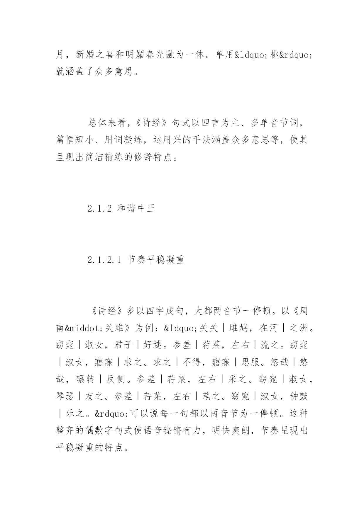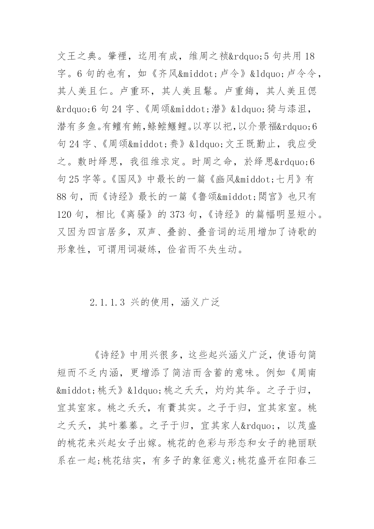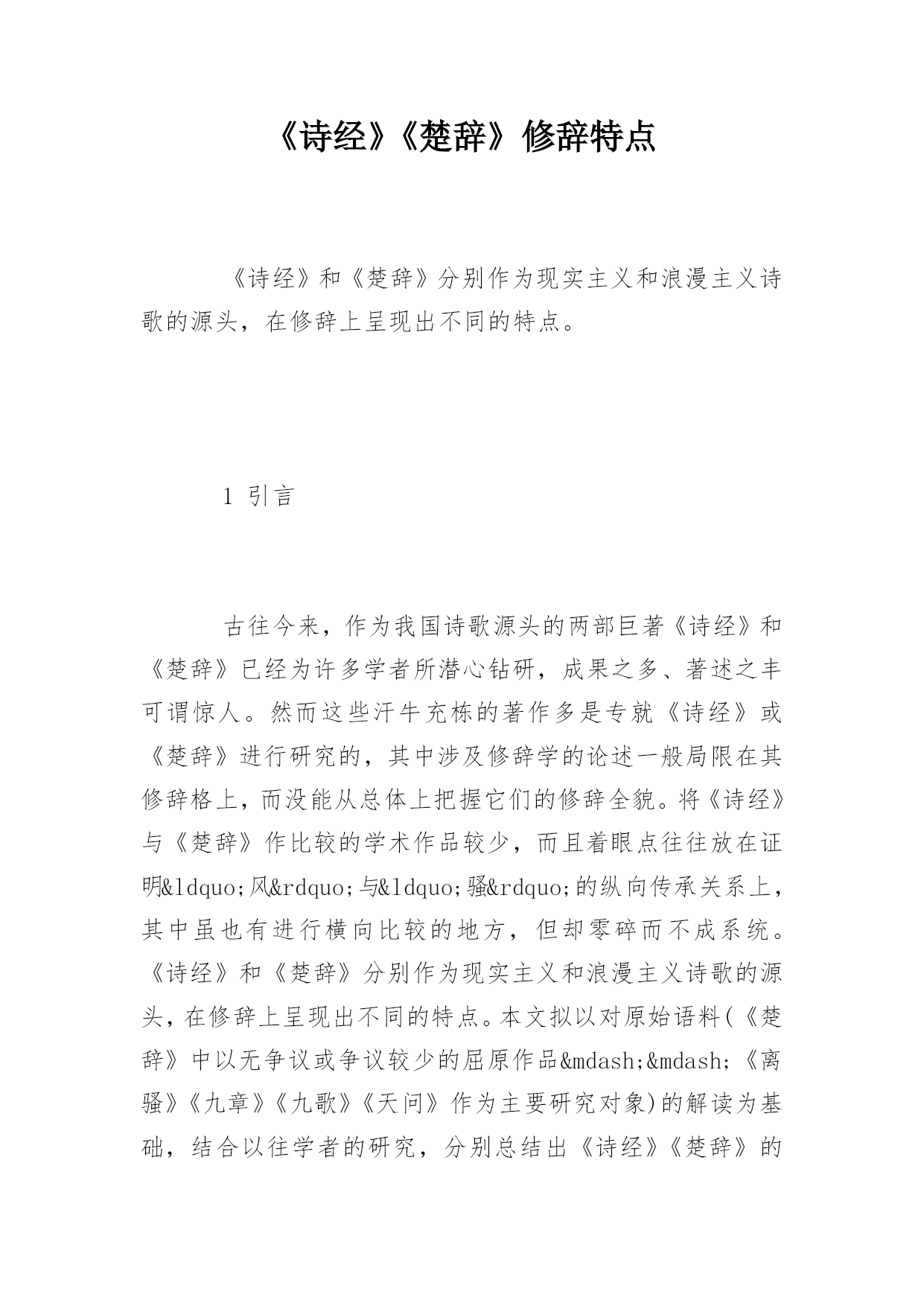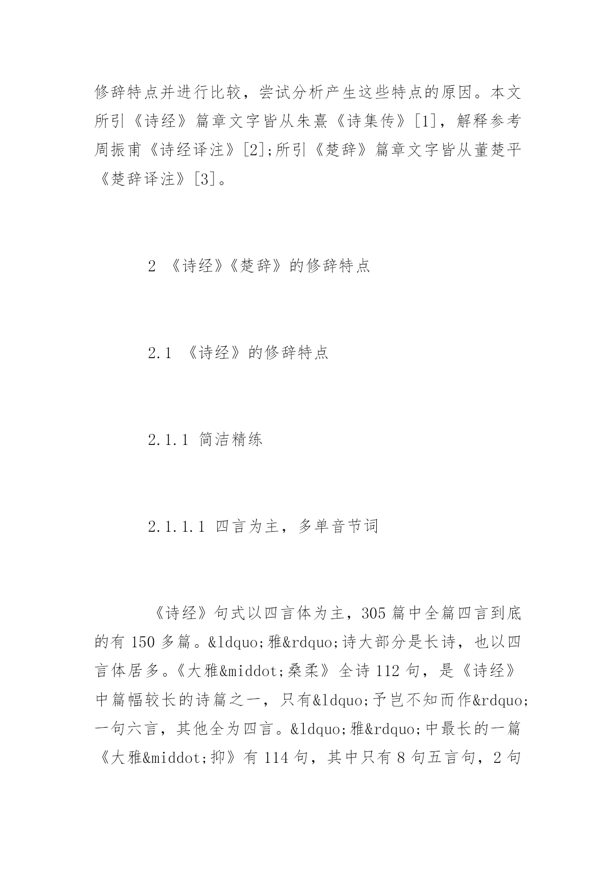 《诗经》《楚辞》修辞特点《诗经》和《楚辞》分别作为现实主义和浪漫主义诗歌的源头,在修辞上呈现出不同的特点。1引言古往今来,作为我国诗歌源头的两部巨著《诗经》和《楚辞》已经为许多学者所潜心钻研,成果之多、著述之丰可谓惊人。然而这些汗牛充栋的著作多是专就《诗经》或《楚辞》进行研究的,其中涉及修辞学的论述一般局限在其修辞格上,而没能从总体上把握它们的修辞全貌。将《诗经》与《楚辞》作比较的学术作品较少,而且着眼点往往放在证明“风”与“骚”的纵向传承关系上,其中虽也有进行横向比较的地方,但却零碎而不成系统。《诗经》和《楚辞》分别作为现实主义和浪漫主义诗歌的源头,在修辞上呈现出不同的特点。本文拟以对原始语料(《楚辞》中以无争议或争议较少的屈原作品——《离骚》《九章》《九歌》《天问》作为主要研究对象)的解读为基础,结合以往学者的研究,分别总结出《诗经》《楚辞》的修辞特点并进行比较,尝试分析产生这些特点的原因。本文所引《诗经》篇章文字皆从朱熹《诗集传》[1],解释参考周振甫《诗经译注》[2];所引《楚辞》篇章文字皆从董楚平《楚辞译注》[3]。2《诗经》《楚辞》的修辞特点2.1《诗经》的修辞特点2.1.1简洁精练2.1.1.1四言为主,多单音节词《诗经》句式以四言体为主,305篇中全篇四言到底的有150多篇。“雅”诗大部分是长诗,也以四言体居多。《大雅·桑柔》全诗112句,是《诗经》中篇幅较长的诗篇之一,只有“予岂不知而作”一句六言,其他全为四言。“雅”中最长的一篇《大雅·抑》有114句,其中只有8句五言句,2句六言句,其他全为四言。“颂”中最长也是《诗经》中最长的一篇《鲁颂·閟宫》有120句,其中只有12句五言句,其他全为四言。向熹做过统计:《诗经》305篇共计7284句,其中6667个四字句,占全书的92%;617个非四字句,占全书的8%。非四字句中二、三、五、六、七、八字句分别有8、157、340、88、19、5句[4]。夏传才也做过统计:《诗经》全书305篇,共有7248句,其中四言句有6591句,约占总数的91%;五言句共369句,约占总数的5%;三言句有158句,约占总数的2%;再次为六、七、二、一言句,分别有85、19、14、7句,而八言句仅有5句[5]。两位学者的统计虽然有些出入,但《诗经》以四言句为主是无可争议的事实。《诗经》中的词汇以单音节词为主,而以两个单音节词连用为常态,两个音节构成一个节奏音步。《诗经》中诗句绝大多数是四言偶数句,原因也在此。以《邶风·击鼓》为例,全诗20句,共80字,除“孙子仲”是人名,“契阔”有人以为是“偏义复词”[6]仍存争议之外,其余都为单音节词。当然,跟一般的先秦诸子说理散文相比,《诗经》的双音节词所占的比率相当大。《诗经》里有很多联绵词(包括双声、叠韵、双声兼叠韵以及非双声叠韵的联绵词)和叠音词。许威汉指出:“联绵词的大量使用,这是《诗经》用词的显著特点”[7]。《诗经》中双声词如“参差、踟躇、辗转”等,叠韵词如“窈窕、崔嵬、匍匐”等。叠音词在下面会有详细讨论。《诗经》以四言句为主,句式短小整齐,多使用单音节词,给人以言辞简洁、干净利落之感。2.1.1.2篇幅短小,用词凝练《诗经》中除“笙诗”有题无辞之外,最短的只有5句,如《周颂·维清》“维清缉熙,文王之典。肇禋,迄用有成,维周之祯”5句共用18字。6句的也有,如《齐风·卢令》“卢令令,其人美且仁。卢重环,其人美且鬈。卢重鋂,其人美且偲”6句24字、《周颂·潜》“猗与漆沮,潜有多鱼。有鳣有鲔,鲦鲿鰋鲤。以享以祀,以介景福”6句24字、《周颂·赉》“文王既勤止,我应受之。敷时绎思,我徂维求定。时周之命,於绎思”6句25字等。《国风》中最长的一篇《豳风·七月》有88句,而《诗经》最长的一篇《鲁颂·閟宫》也只有120句,相比《离骚》的373句,《诗经》的篇幅明显短小。又因为四言居多,双声、叠韵、叠音词的运用增加了诗歌的形象性,可谓用词凝练,俭省而不失生动。2.1.1.3兴的使用,涵义广泛《诗经》中用兴很多,这些起兴涵义广泛,使语句简短而不乏内涵,