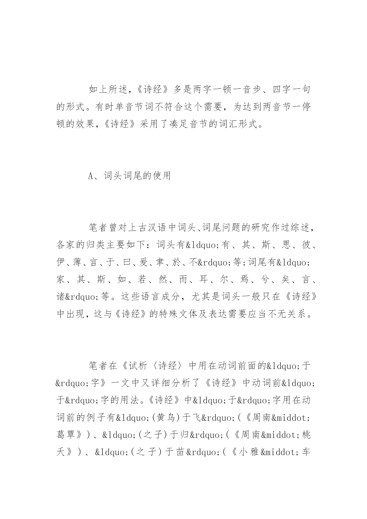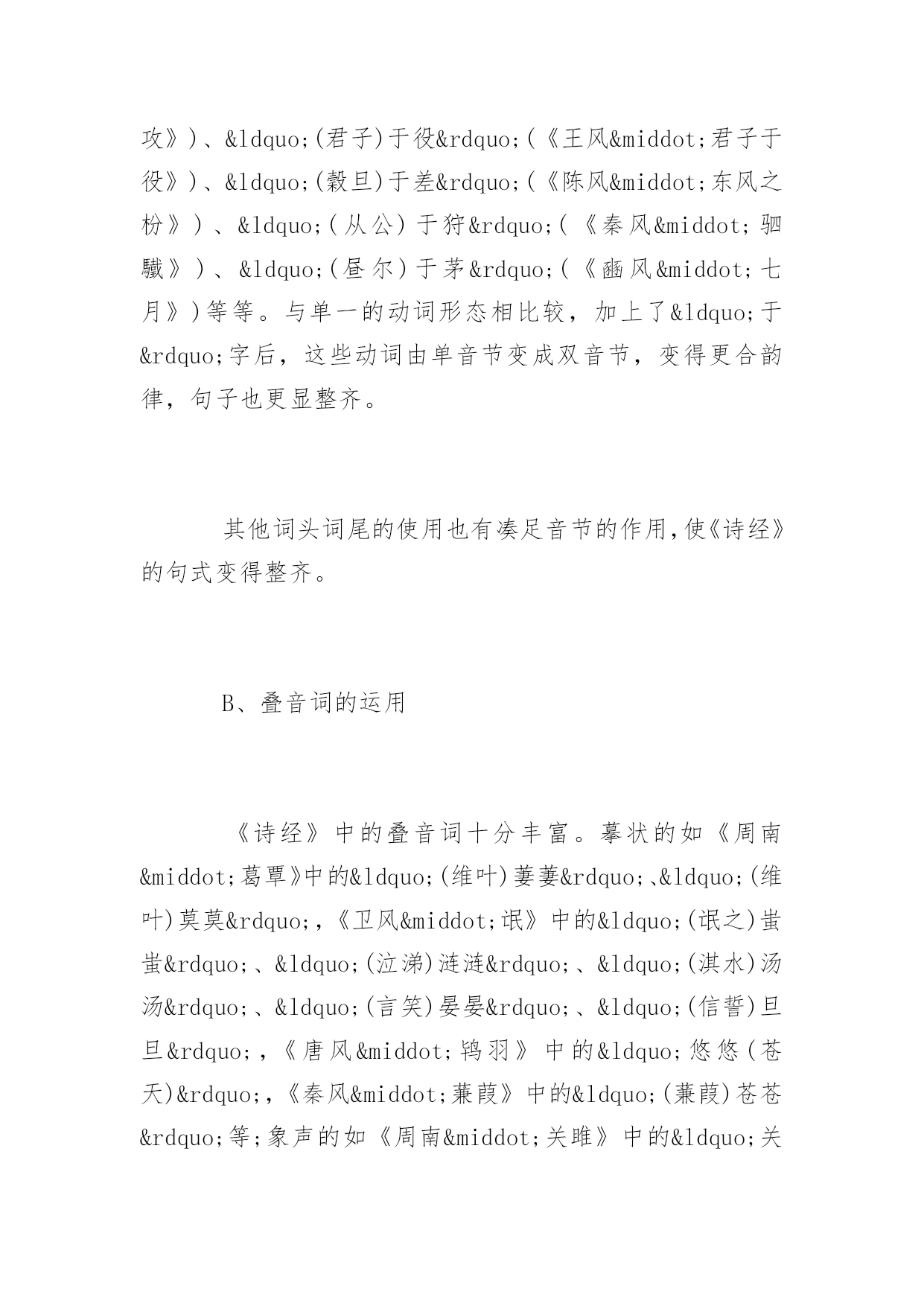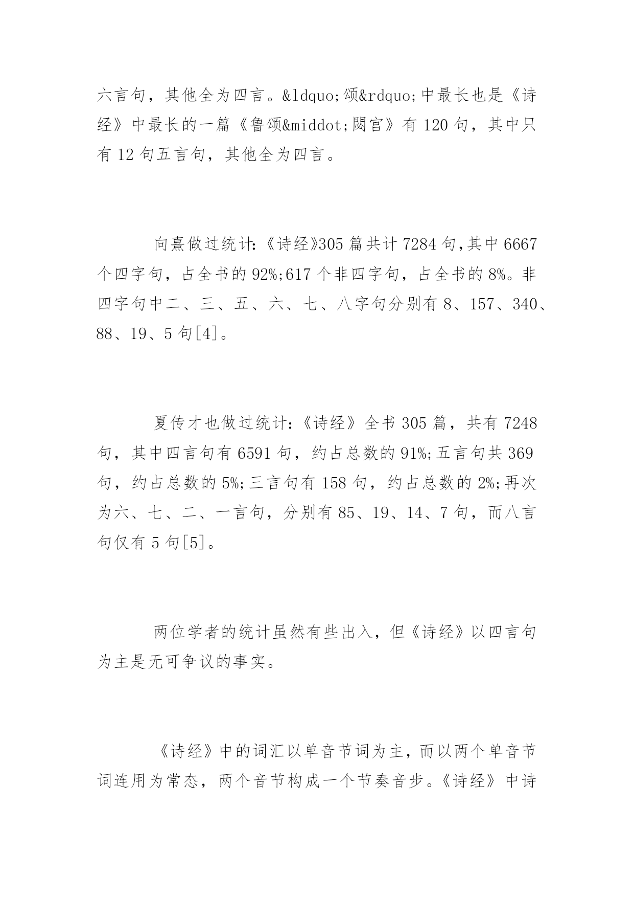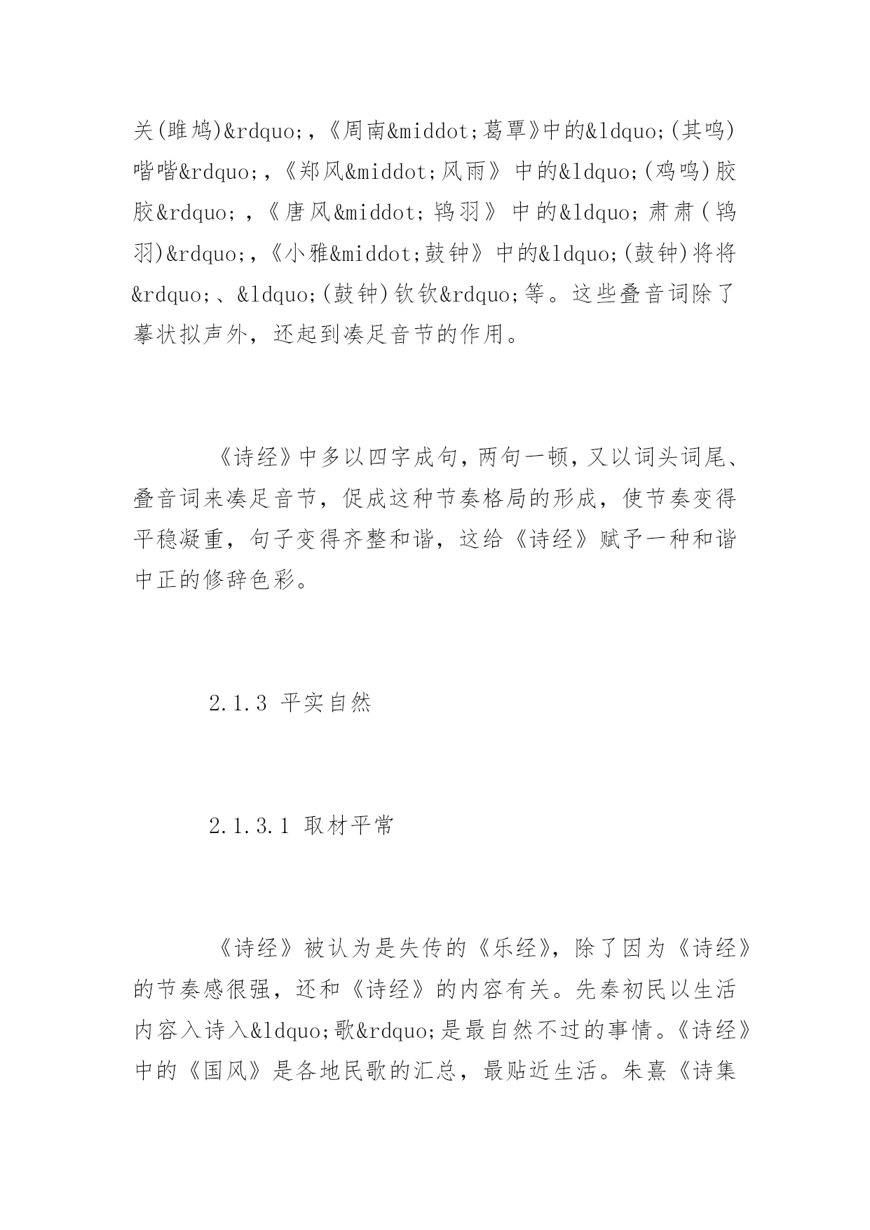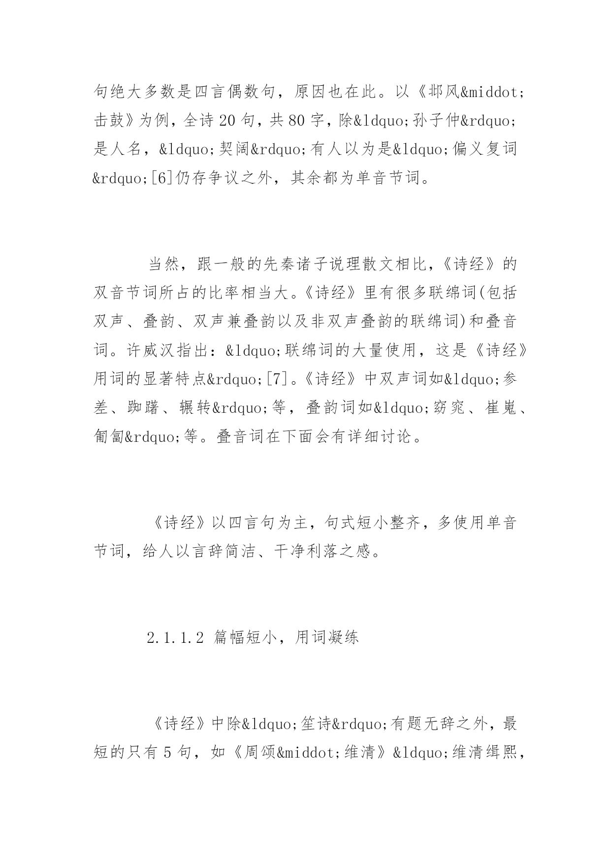 《诗经》《楚辞》修辞特点《诗经》和《楚辞》分别作为现实主义和浪漫主义诗歌的源头,在修辞上呈现出不同的特点。1引言古往今来,作为我国诗歌源头的两部巨著《诗经》和《楚辞》已经为许多学者所潜心钻研,成果之多、著述之丰可谓惊人。然而这些汗牛充栋的著作多是专就《诗经》或《楚辞》进行研究的,其中涉及修辞学的论述一般局限在其修辞格上,而没能从总体上把握它们的修辞全貌。将《诗经》与《楚辞》作比较的学术作品较少,而且着眼点往往放在证明“风”与“骚”的纵向传承关系上,其中虽也有进行横向比较的地方,但却零碎而不成系统。《诗经》和《楚辞》分别作为现实主义和浪漫主义诗歌的源头,在修辞上呈现出不同的特点。本文拟以对原始语料(《楚辞》中以无争议或争议较少的屈原作品——《离骚》《九章》《九歌》《天问》作为主要研究对象)的解读为基础,结合以往学者的研究,分别总结出《诗经》《楚辞》的修辞特点并进行比较,尝试分析产生这些特点的原因。本文所引《诗经》篇章文字皆从朱熹《诗集传》[1],解释参考周振甫《诗经译注》[2];所引《楚辞》篇章文字皆从董楚平《楚辞译注》[3]。2《诗经》《楚辞》的修辞特点2.1《诗经》的修辞特点2.1.1简洁精练2.1.1.1四言为主,多单音节词《诗经》句式以四言体为主,305篇中全篇四言到底的有150多篇。“雅”诗大部分是长诗,也以四言体居多。《大雅·桑柔》全诗112句,是《诗经》中篇幅较长的诗篇之一,只有“予岂不知而作”一句六言,其他全为四言。“雅”中最长的一篇《大雅·抑》有114句,其中只有8句五言句,2句六言句,其他全为四言。“颂”中最长也是《诗经》中最长的一篇《鲁颂·閟宫》有120句,其中只有12句五言句,其他全为四言。向熹做过统计:《诗经》305篇共计7284句,其中6667个四字句,占全书的92%;617个非四字句,占全书的8%。非四字句中二、三、五、六、七、八字句分别有8、157、340、88、19、5句[4]。夏传才也做过统计:《诗经》全书305篇,共有7248句,其中四言句有6591句,约占总数的91%;五言句共369句,约占总数的5%;三言句有158句,约占总数的2%;再次为六、七、二、一言句,分别有85、19、14、7句,而八言句仅有5句[5]。两位学者的统计虽然有些出入,但《诗经》以四言句为主是无可争议的事实。《诗经》中的词汇以单音节词为主,而以两个单音节词连用为常态,两个音节构成一个节奏音步。《诗经》中诗句绝大多数是四言偶数句,原因也在此。以《邶风·击鼓》为例,全诗20句,共80字,除“孙子仲”是人名,“契阔”有人以为是“偏义复词”[6]仍存争议之外,其余都为单音节词。当然,跟一般的先秦诸子说理散文相比,《诗经》的双音节词所占的比率相当大。《诗经》里有很多联绵词(包括双声、叠韵、双声兼叠韵以及非双声叠韵的联绵词)和叠音词。许威汉指出:“联绵词的大量使用,这是《诗经》用词的显著特点”[7]。《诗经》中双声词如“参差、踟躇、辗转”等,叠韵词如“窈窕、崔嵬、匍匐”等。叠音词在下面会有详细讨论。《诗经》以四言句为主,句式短小整齐,多使用单音节词,给人以言辞简洁、干净利落之感。2.1.1.2篇幅短小,用词凝练《诗经》中除“笙诗”有题无辞之外,最短的只有5句,如《周颂·维清》“维清缉熙,文王之典。肇禋,迄用有成,维周之祯”5句共用18字。6句的也有,如《齐风·卢令》“卢令令,其人美且仁。卢重环,其人美且鬈。卢重鋂,其人美且偲”6句24字、《周颂·潜》“猗与漆沮,潜有多鱼。有鳣有鲔,鲦鲿鰋鲤。以享以祀,以介景福”6句24字、《周颂·赉》“文王既勤止,我应受之。敷时绎思,我徂维求定。时周之命,於绎思”6句25字等。《国风》中最长的一篇《豳风·七月》有88句,而《诗经》最长的一篇《鲁颂·閟宫》也只有120句,相比《离骚》的373句,《诗经》的篇幅明显短小。又因为四言居多,双声、叠韵、叠音词的运用增加了诗歌的形象性,可谓用词凝练,俭省而不失生动。2.1.1.3兴的使用,涵义广泛《诗经》中用兴很多,这些起兴涵义广泛,使语句简短而不乏内涵,