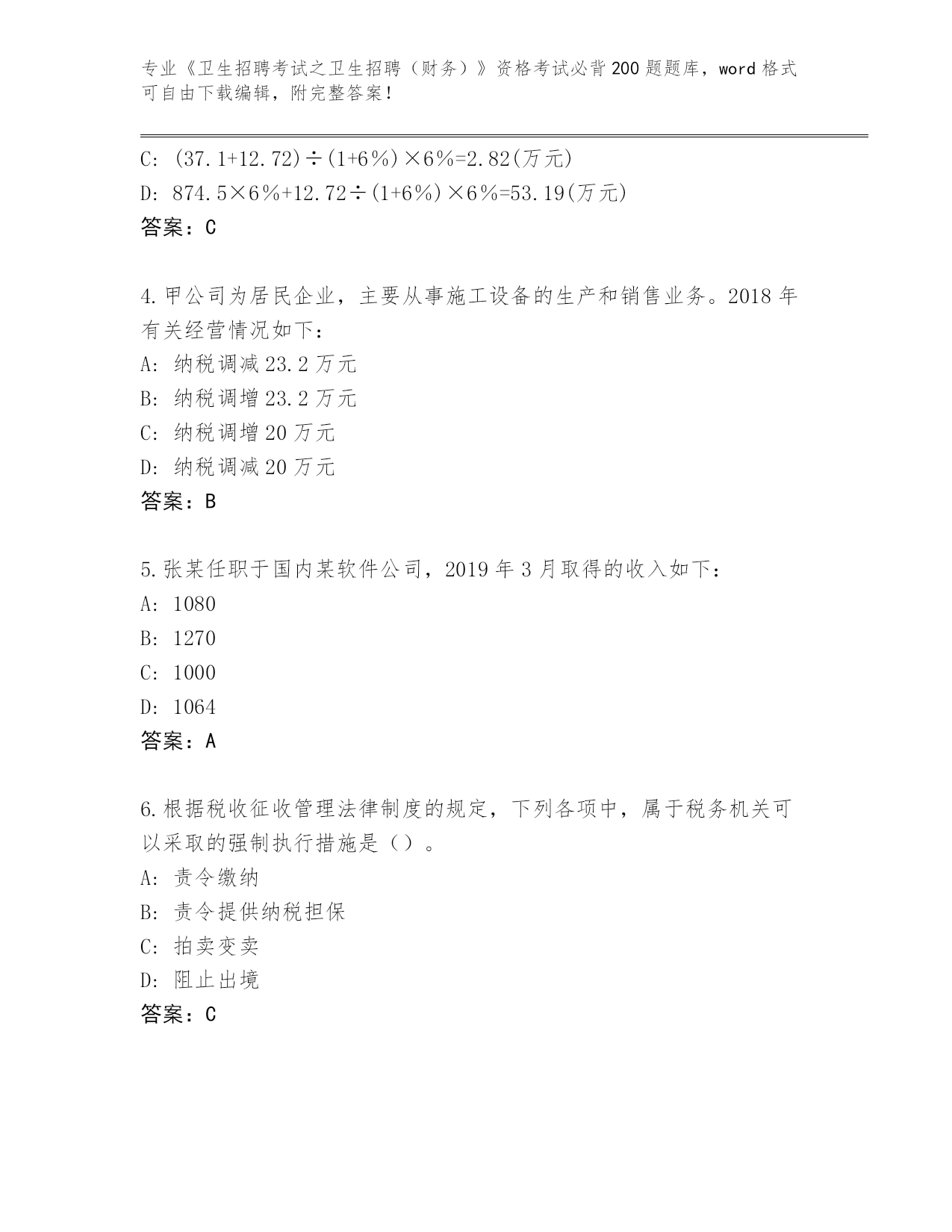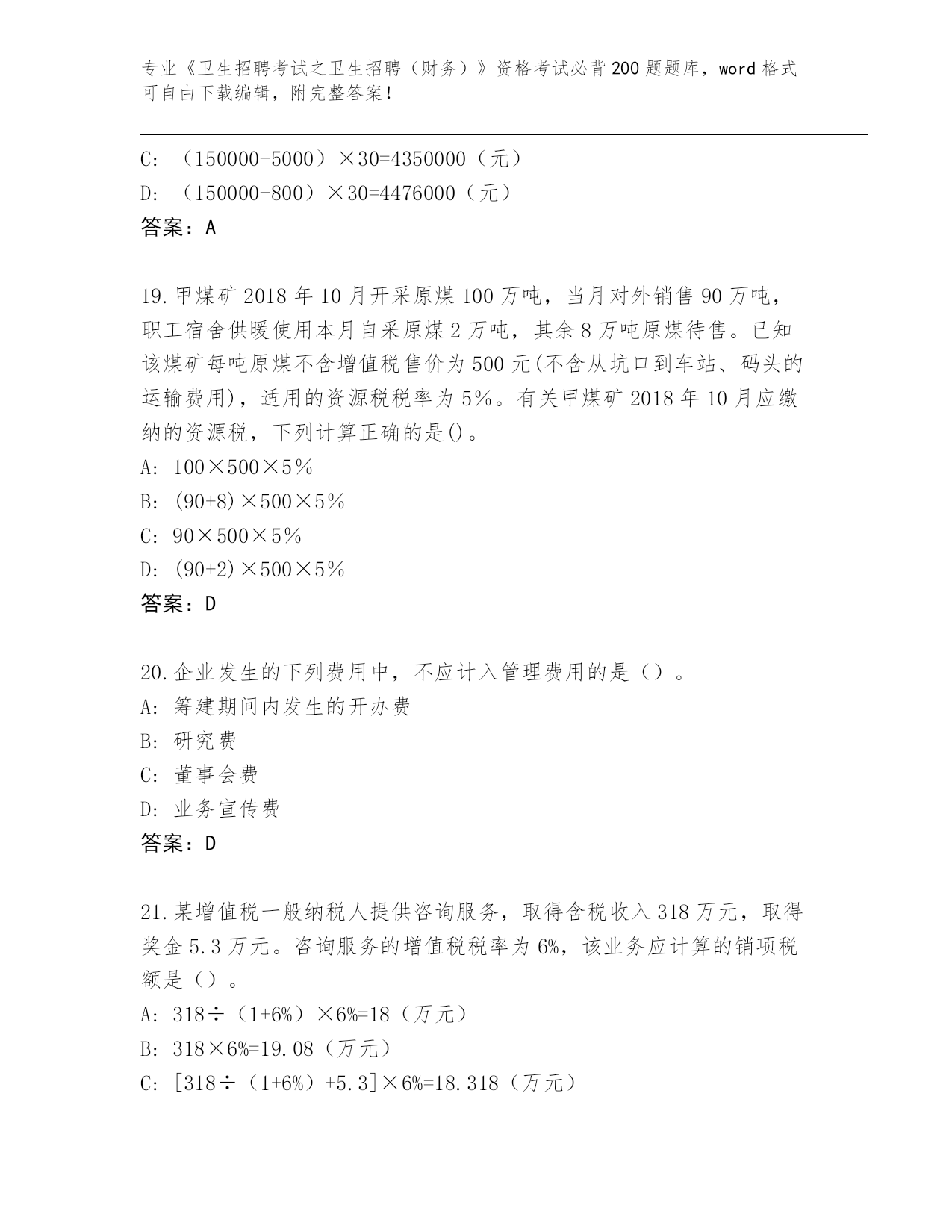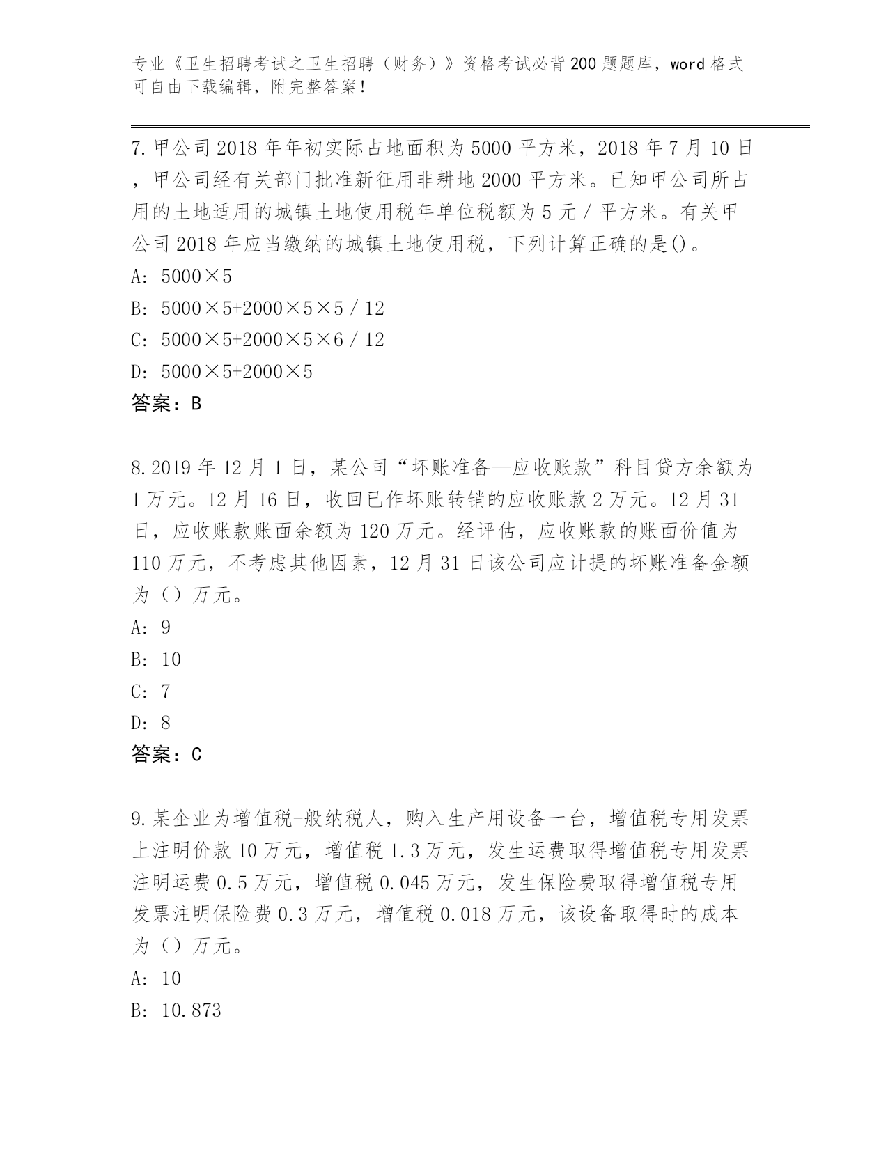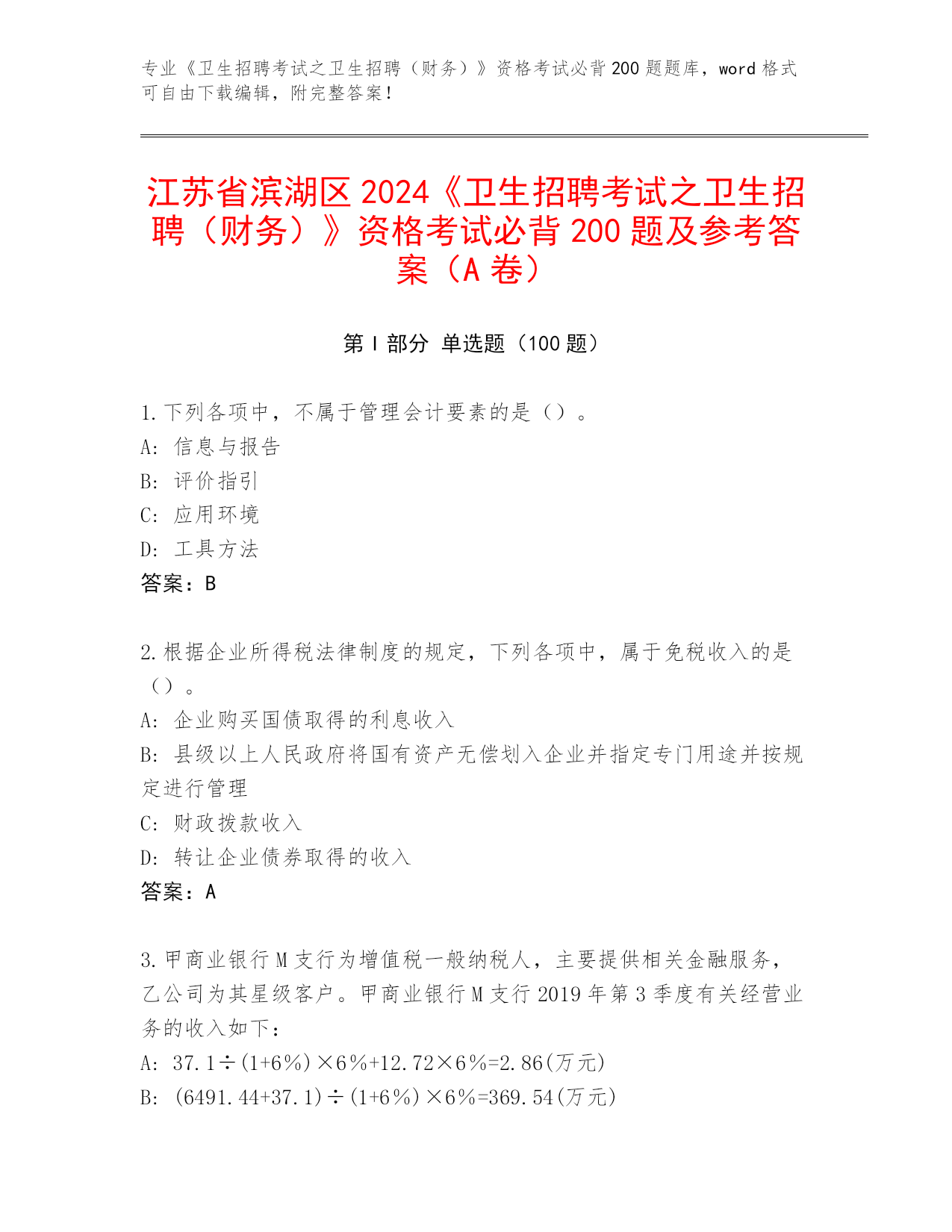 2024江苏省滨湖区《卫生招聘考试之卫生招聘(财务)》资格考试必背200题内部题库附答案(考试直接用)