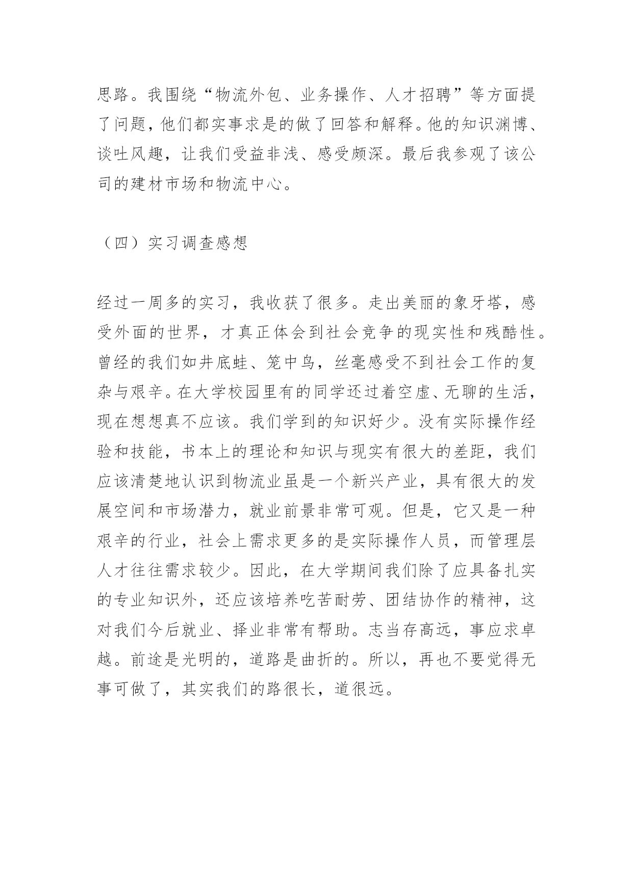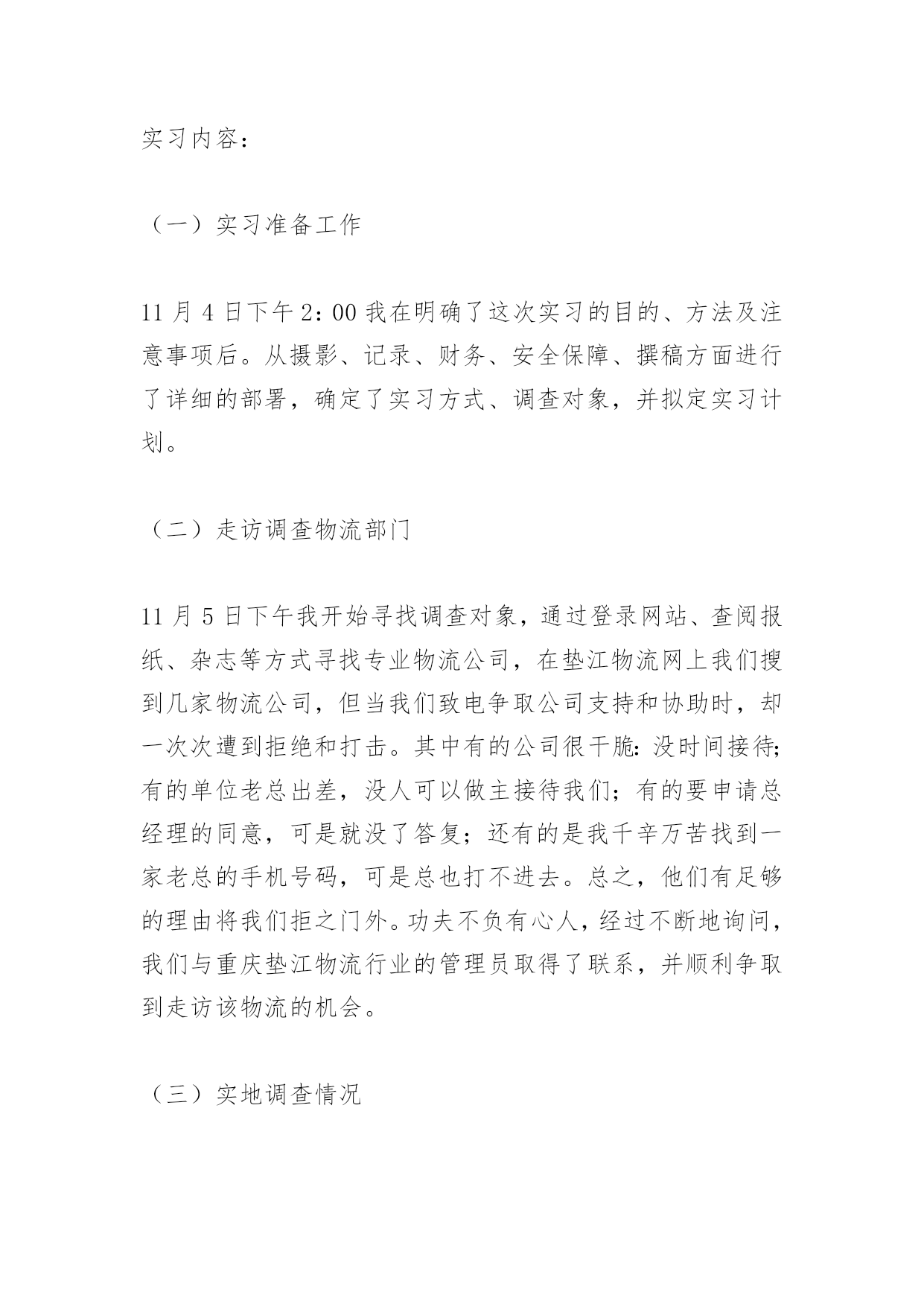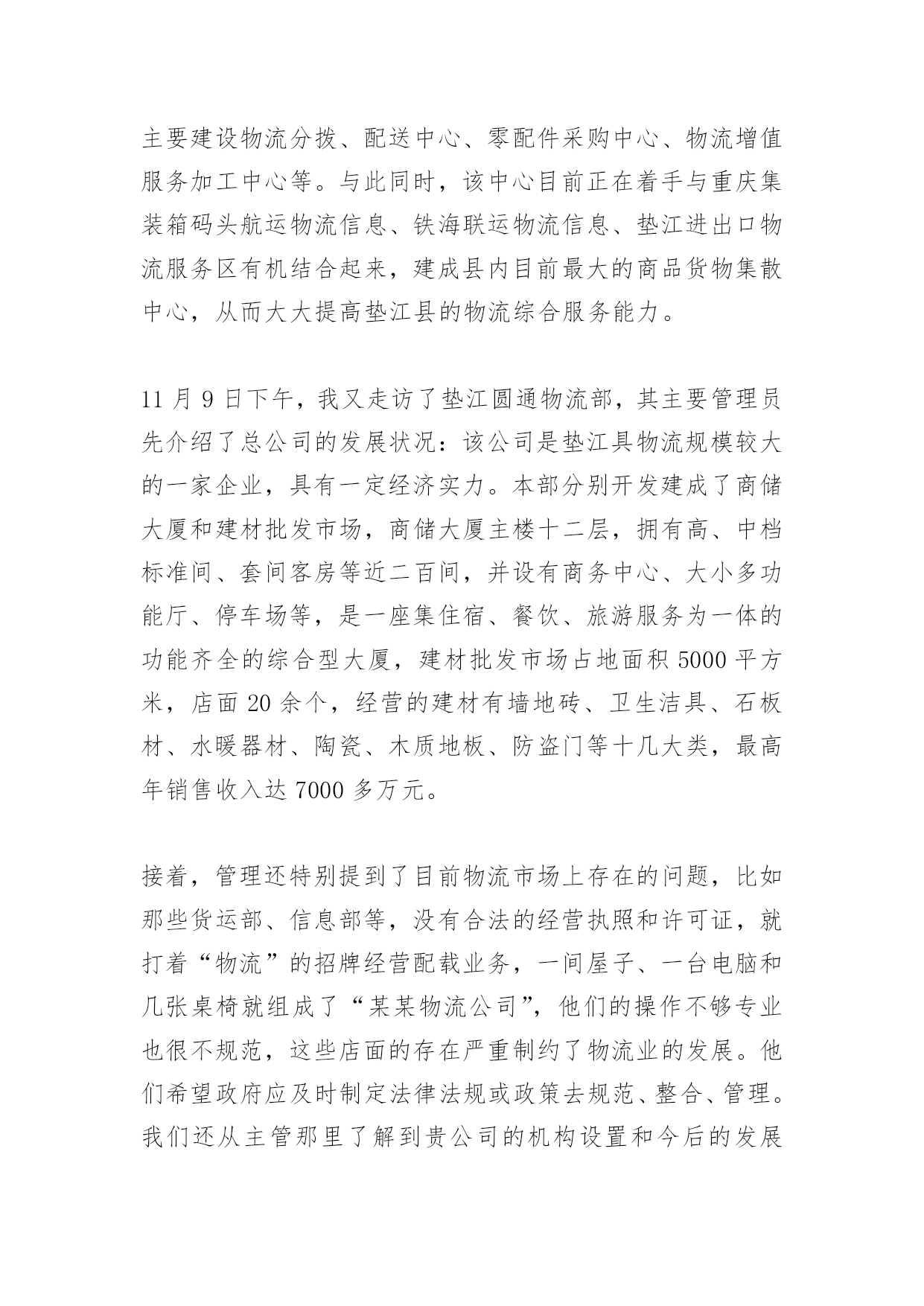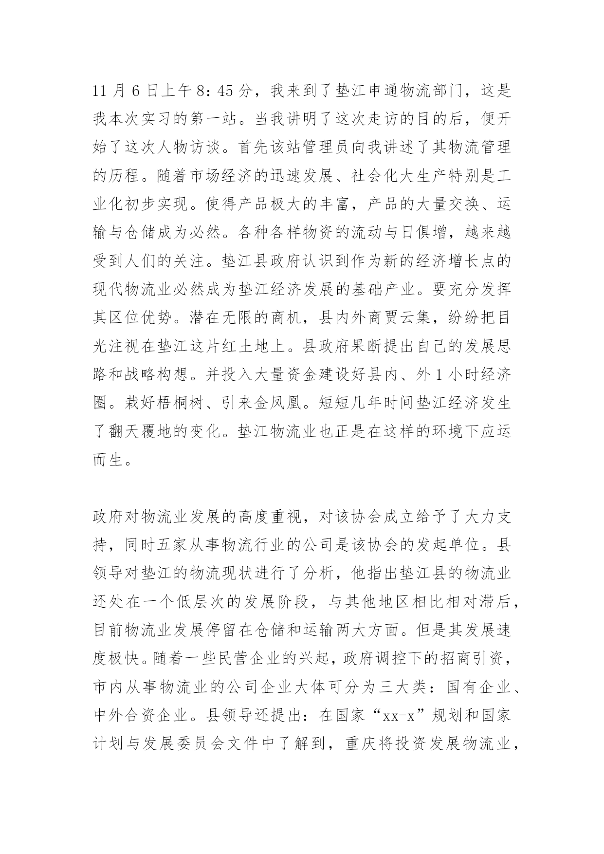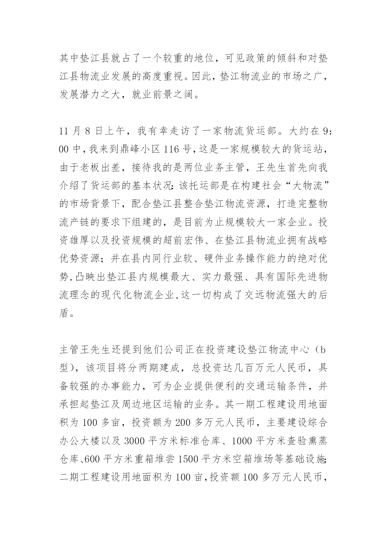 物流专员毕业实结物流专员毕业实结实习目的:选择身边的企业单位为对象,联系课上所学理论,采用实地考察跟踪其物流全过程的方法,对垫江物流业发展现状进行初步了解。培养实际调研能力,尝试检验所学知识,并从实际中进一步学习了解物流的内涵与外延。实习方式:采用实地调研的方式,具体采用了面对面的访谈了解、过程跟踪调查和侧面行为观察的方式。出动全组成员合理分工,每人负责不同侧面的内容,协同合作,调查后集体讨论分析,并总结出实习报告。实习时间:20**年11月2日—11月12日实习地点:重庆市垫江县实习步骤:一、前期准备工作1、11月2日下午2:00在中色物流公司报道。2、11月3日上午10:00在中色物流公司,听取物流管理的意见,并拟定实习方式、调查对象。3、11月4日下午通过登录网站、查阅报纸、杂志等方式寻找调查对象,并争取专业物流公司或单位的支持和协助。到系办公室开介绍信。4、准备数码相机、笔记本等实习所需物品。二、开展实习活动1、11月6日,走访垫江县物流行业。2、11月7日,参观、调查申通物流公司。3、11月9日,走访垫江县圆通物流部门。三、后期总结工作11月11日—12日收集并整理资料,对物流情况分析并定稿。实习内容:(一)实习准备工作11月4日下午2:00我在明确了这次实习的目的、方法及注意事项后。从摄影、记录、财务、安全保障、撰稿方面进行了详细的部署,确定了实习方式、调查对象,并拟定实习计划。(二)走访调查物流部门11月5日下午我开始寻找调查对象,通过登录网站、查阅报纸、杂志等方式寻找专业物流公司,在垫江物流网上我们搜到几家物流公司,但当我们致电争取公司支持和协助时,却一次次遭到拒绝和打击。其中有的公司很干脆:没时间接待;有的单位老总出差,没人可以做主接待我们;有的要申请总经理的同意,可是就没了答复;还有的是我千辛万苦找到一家老总的手机号码,可是总也打不进去。总之,他们有足够的理由将我们拒之门外。功夫不负有心人,经过不断地询问,我们与重庆垫江物流行业的管理员取得了联系,并顺利争取到走访该物流的机会。(三)实地调查情况11月6日上午8:45分,我来到了垫江申通物流部门,这是我本次实习的第一站。当我讲明了这次走访的目的后,便开始了这次人物访谈。首先该站管理员向我讲述了其物流管理的历程。随着市场经济的迅速发展、社会化大生产特别是工业化初步实现。使得产品极大的丰富,产品的大量交换、运输与仓储成为必然。各种各样物资的流动与日俱增,越来越受到人们的关注。垫江县政府认识到作为新的经济增长点的现代物流业必然成为垫江经济发展的基础产业。要充分发挥其区位优势。潜在无限的商机,县内外商贾云集,纷纷把目光注视在垫江这片红土地上。县政府果断提出自己的发展思路和战略构想。并投入大量资金建设好县内、外1小时经济圈。栽好梧桐树、引来金凤凰。短短几年时间垫江经济发生了翻天覆地的变化。垫江物流业也正是在这样的环境下应运而生。政府对物流业发展的高度重视,对该协会成立给予了大力支持,同时五家从事物流行业的公司是该协会的发起单位。县领导对垫江的物流现状进行了分析,他指出垫江县的物流业还处在一个低层次的发展阶段,与其他地区相比相对滞后,目前物流业发展停留在仓储和运输两大方面。但是其发展速度极快。随着一些民营企业的兴起,政府调控下的招商引资,市内从事物流业的公司企业大体可分为三大类:国有企业、中外合资企业。县领导还提出:在国家“xx-x”规划和国家计划与发展委员会文件中了解到,重庆将投资发展物流业,其中垫江县就占了一个较重的地位,可见政策的倾斜和对垫江县物流业发展的高度重视。因此,垫江物流业的市场之广,发展潜力之大,就业前景之阔。11月8日上午,我有幸走访了一家物流货运部。大约在9:00中,我来到鼎峰小区116号,这是一家规模较大的货运站,由于老板出差,接待我的是两位业务主管,王先生首先向我介绍了货运部的基本状况:该托运部是在构建社会“大物流”的市场背景下,配合垫江县整合垫江物流资源,打造完整物流产链的要求下组建的,是目前为止规模较大一家企业。投资雄厚以及投资规模的超前宏伟、在垫江县物流业拥有战略优势资源;并在县内同行业软、硬件业务操作能力的绝对优势,凸映出垫江县内规模最大、实力最强、具有国际先进物流理念的现代化物流企业,这一切构成了交远物流强大的后盾。主管王先生还提到他们公司正在投资建设垫江物流中心(b型),该项目将分两期建成,总投资达几百万元人民币,具备较强的办事能力,可为企业提供便利的交通运输条件,并承担起垫江及周边地区运输的业务。其一期工程建设用地面积为100多亩,投资额为200多万元人民币,主要建设综合办公大楼以及3000平方米标准仓库、1000平方米查验熏蒸仓库、600平方米重箱堆尝1500平方米空箱堆场等基础设施;二期工程建设用地面积为100亩,投资额10