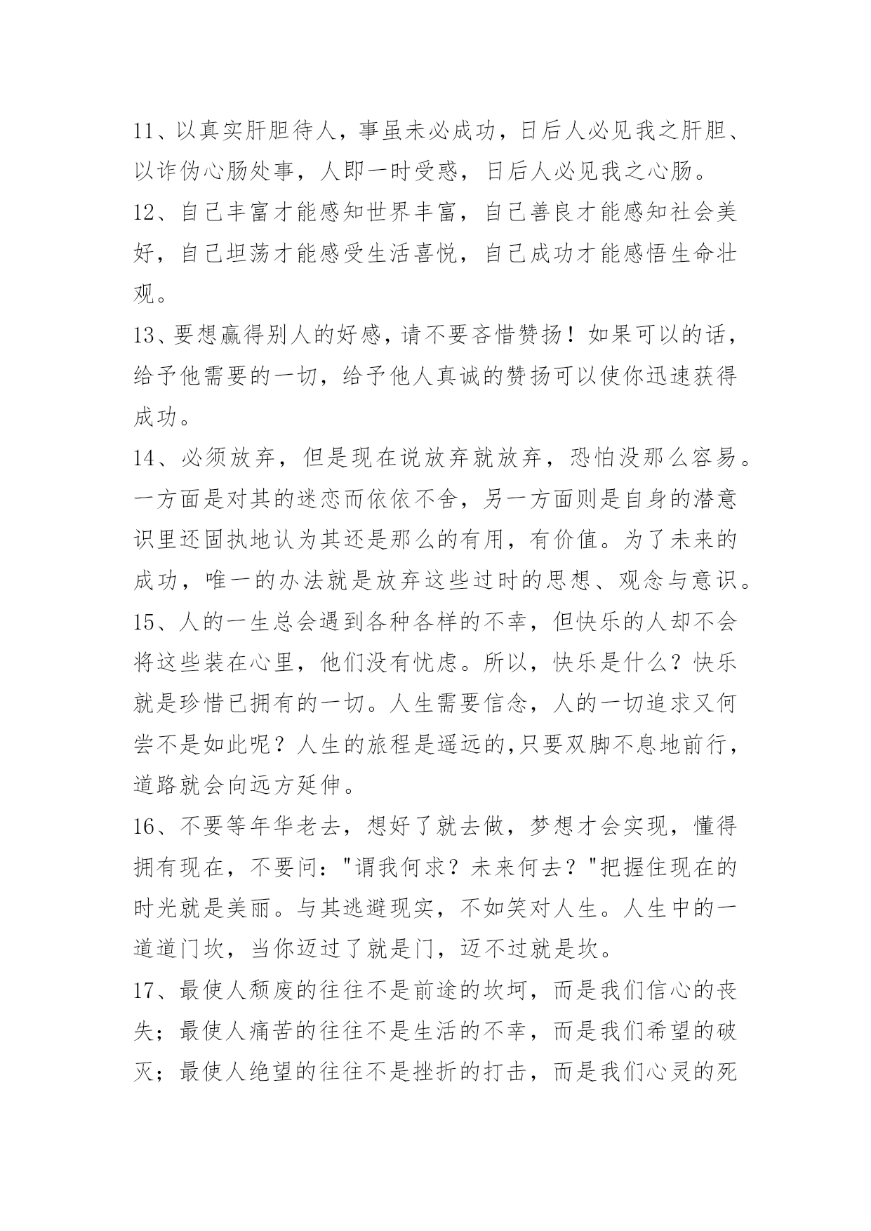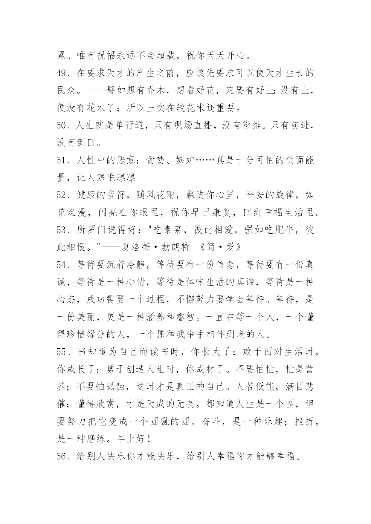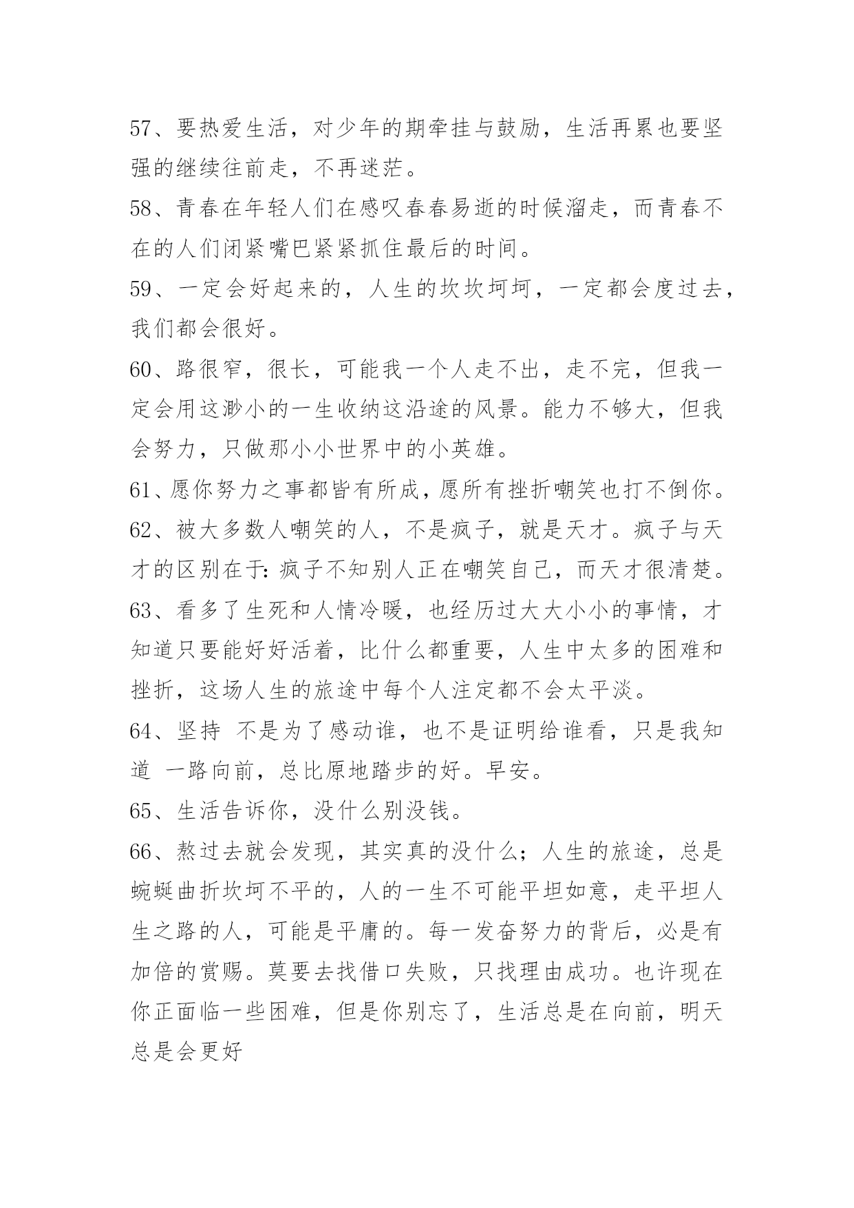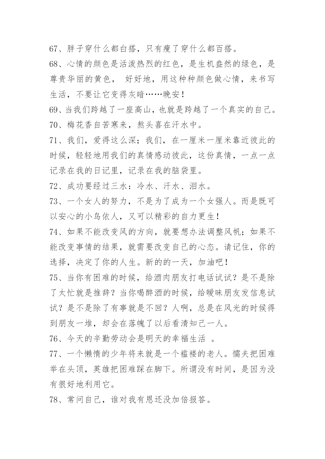 奋斗的励志语录99条精选奋斗的励志语录99条是你的,就是你的。越是紧握,越容易失去。下面是小编整理的奋斗的励志语录99条,感兴趣的一起来看看吧。1、六和文化:生活是一场过程,从来也不是一种手段。人生窄,窄在算计。人生宽,宽在一念。2、生活不要活成一种死板和纠结,需要一点点幽默,化解那些尴尬,有时候需要一种自嘲,缓和那些难堪,虽然生活不是戏剧,一种内心的平和,才是生活的艺术,面对烦恼,调整心情的方向,学会冷静的面对。人生在世,被别人笑笑,自己笑笑,也是一件好事。3、再坚强的爱情,一百年,都得缴械投降。4、凡事往好的一面想,积极地面对人生,乐观地对待生活。只有放下沉重的心理包袱,才能感觉生活中无穷的乐趣。青少年要养成乐观的心态,它会使你的生活更加快乐。5、无私付出的人具有人性的善良,人品的高尚,处世的洒脱,也是一个淡泊者。古人常说:"淡泊可以明志",就是不追逐世俗的功名利禄,以心灵的恬淡平与来显示人的志趣与志向。淡泊者看淡名利并非无视名利,淡泊者追求成功并不狗苟蝇营。"水能性淡为吾友,竹解心虚即我师。"淡泊是一种雅致,是一种空灵,是人生路上有理智的选择。淡泊明志,是一种积极的心态,淡而愈浓,近而愈远。当放开生命的那些细枝末节,所向往的、所追求的那一种生命的形式,才真正地在我们前方,而不再是糊涂与慌乱中的一时梦幻。6、理想之路是用汗水浇出来的,成功之路是由努力奋斗创造出来的,回首往事,当年我踏进省城时,首先映入我眼帘的是一排排的高楼大厦,一条条蠕动的车辆,面对那从没见过的宏伟场面,我惊呆了,原来人类的智慧竟然可以撼天动地。是的,如果说农村是大自然本身孕育的产物,而城市就是我们人类自己创造的杰作,于是,我在面对人类伟大的创造而感叹时,自己就好像走进了一个陌生的世界,眼花缭乱。7、没有彻骨寒,何来梅花香?人生没有苦难,便会脆弱不堪。因为苦难,成功更显美丽;因为灾患,幸福更是甘甜……8、[幸福女人的经典语录]不要受他人的威信影响而试图仿效他人。须知唯有自己方能真正拥有自己,任何人都不可能成为另一个自己。每天重复说10次这句强而有力的话:"谁也无法阻挡我成功。"男人不是女人的救世主,婚姻不是人生的金饭碗。9、咱们活得像头驴,而期望就是悬在驴眼前的,那颗看得到却够不着的白菜,不断地被牵着鼻子走。还乐得屁颠儿屁颠儿的以为成功总是触手可及。10、可以承受压力的品质是包容,要学会弯下身子迁就,接受一切,就得到一切。无可无不可,心怀恬淡如流水行云,享受已有的,这样生活才是真实的,我们做人做事也需要这种生活态度。在通往成功的道路上,只有努力拼搏的人才能够弥补自己的不足,超越平庸,取得最后的胜利。11、以真实肝胆待人,事虽未必成功,日后人必见我之肝胆、以诈伪心肠处事,人即一时受惑,日后人必见我之心肠。12、自己丰富才能感知世界丰富,自己善良才能感知社会美好,自己坦荡才能感受生活喜悦,自己成功才能感悟生命壮观。13、要想赢得别人的好感,请不要吝惜赞扬!如果可以的话,给予他需要的一切,给予他人真诚的赞扬可以使你迅速获得成功。14、必须放弃,但是现在说放弃就放弃,恐怕没那么容易。一方面是对其的迷恋而依依不舍,另一方面则是自身的潜意识里还固执地认为其还是那么的有用,有价值。为了未来的成功,唯一的办法就是放弃这些过时的思想、观念与意识。15、人的一生总会遇到各种各样的不幸,但快乐的人却不会将这些装在心里,他们没有忧虑。所以,快乐是什么?快乐就是珍惜已拥有的一切。人生需要信念,人的一切追求又何尝不是如此呢?人生的旅程是遥远的,只要双脚不息地前行,道路就会向远方延伸。16、不要等年华老去,想好了就去做,梦想才会实现,懂得拥有现在,不要问:"谓我何求?未来何去?"把握住现在的时光就是美丽。与其逃避现实,不如笑对人生。人生中的一道道门坎,当你迈过了就是门,迈不过就是坎。17、最使人颓废的往往不是前途的坎坷,而是我们信心的丧失;最使人痛苦的往往不是生活的不幸,而是我们希望的破灭;最使人绝望的往往不是挫折的打击,而是我们心灵的死亡。所以,充满自信、满怀希望、心中有爱的去拥抱生活,就算事情再糟糕,一切也都会慢慢变好的。18、多一点微笑,少一点忧愁;多一点爱,少一点恨;多一点阅读,少一点嘀咕;多一点运动,少一点美容。生活本来平淡如水,放一点盐它就会是咸的,放一点糖它就会是甜的,放一点咖啡它就会是苦的,放一点茶它就会是香的,想调成什么味道,全凭你自己。安静一点,淡然一点,沉稳一点,随意一点。19、人人都有感情,而并非都有伟大而高尚的行为,这由于感情推动力的薄弱。要转弱为强,转薄而为厚,有待于陶冶。蔡元培《蔡元培美学文选》。20、未来的点点滴滴,需要我们脚踏实地走出来,每一个人都有不一样的人生,不一样的故事,但是都是精彩的。我们不要轻易否定别人,也不要轻易放弃自己,更不要盲目追逐