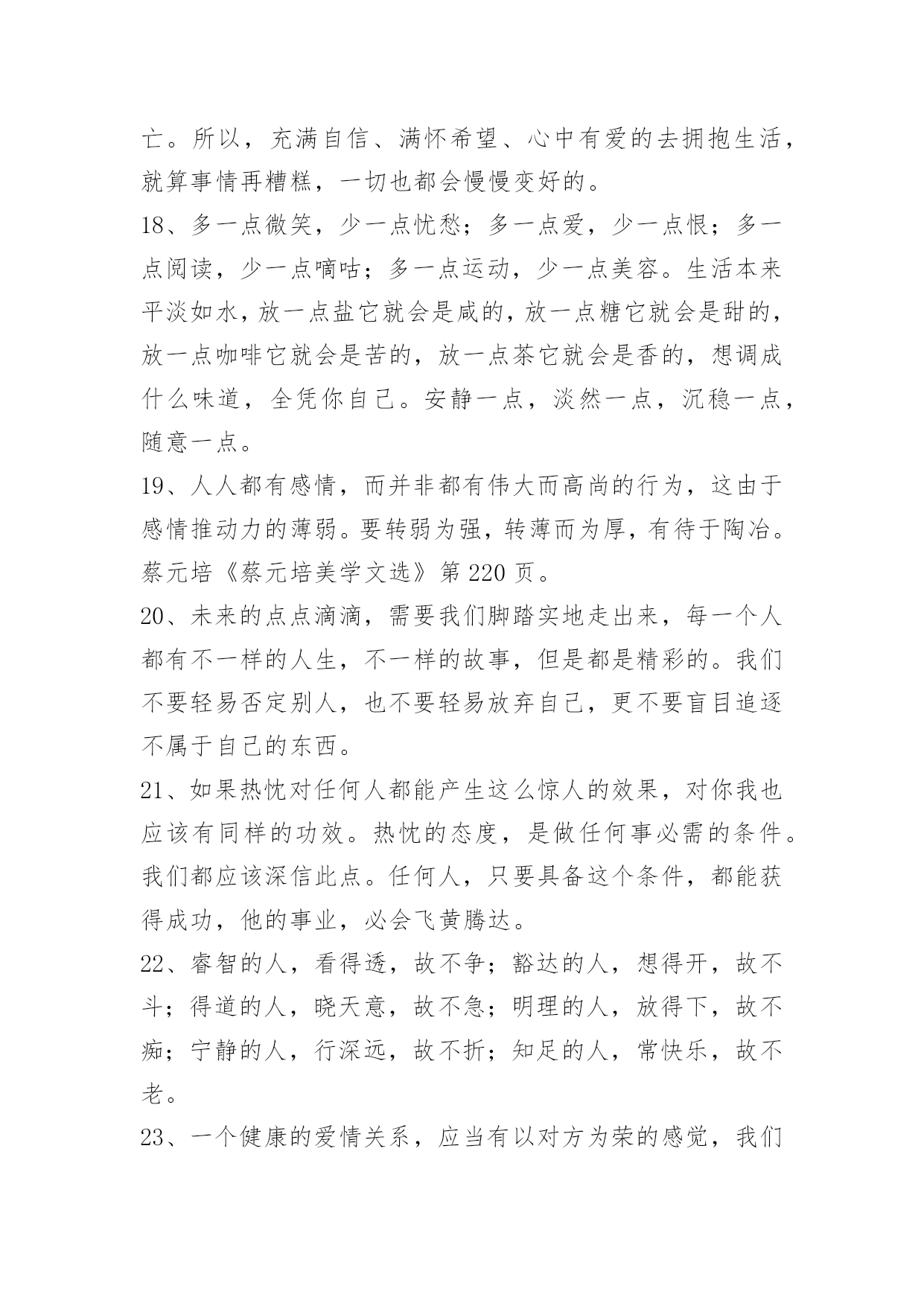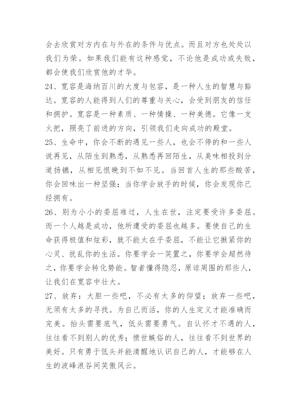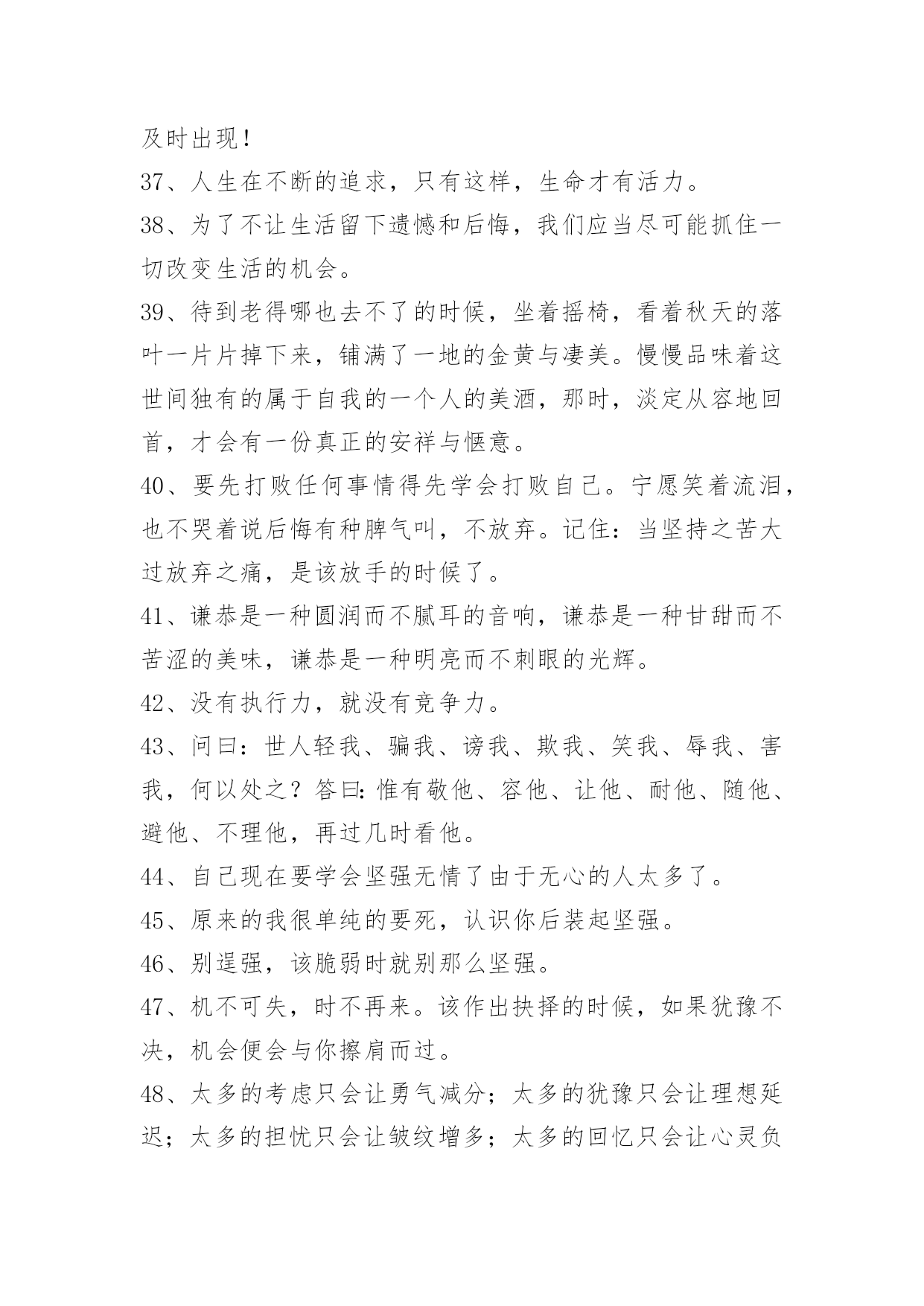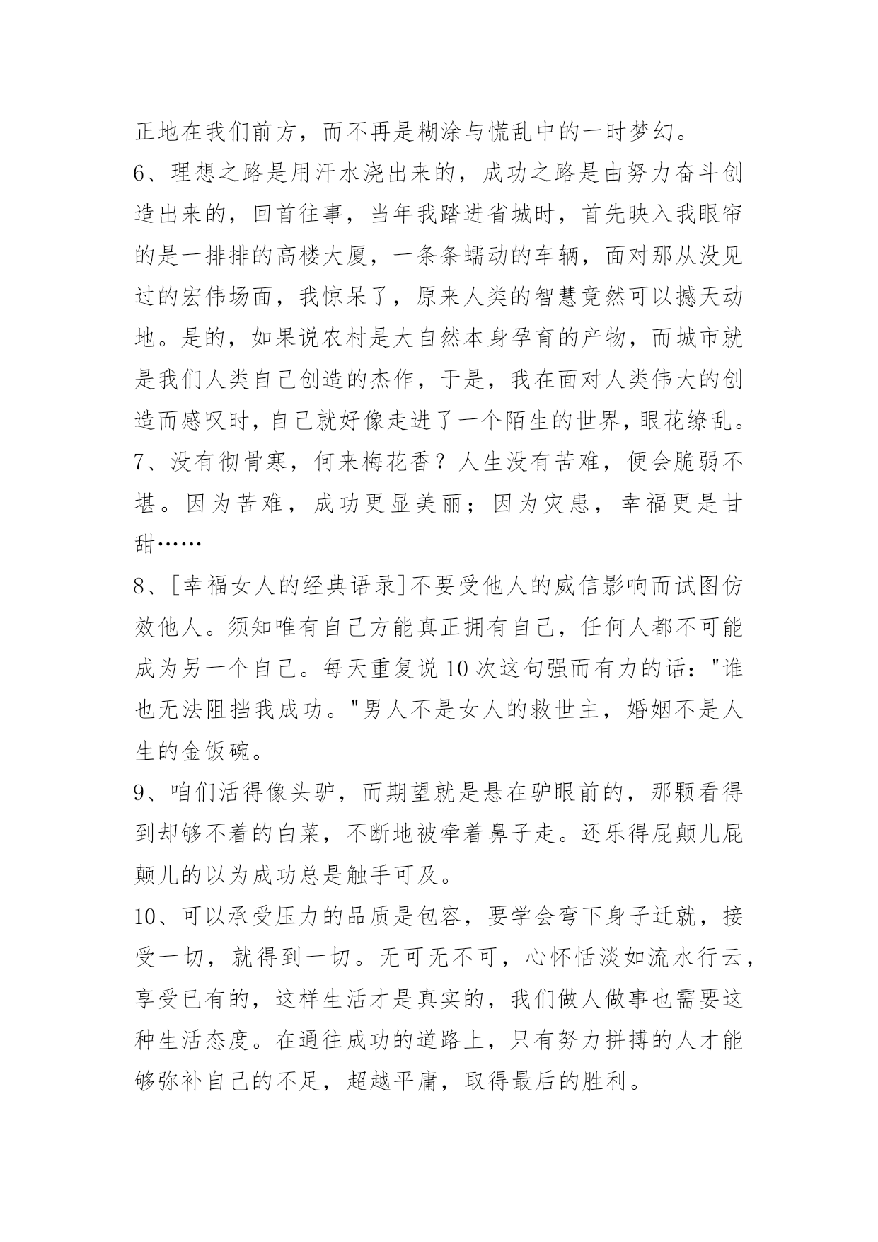 奋斗的励志语录99条精选奋斗的励志语录99条是你的,就是你的。越是紧握,越容易失去。下面是小编整理的奋斗的励志语录99条,感兴趣的一起来看看吧。1、六和文化:生活是一场过程,从来也不是一种手段。人生窄,窄在算计。人生宽,宽在一念。2、生活不要活成一种死板和纠结,需要一点点幽默,化解那些尴尬,有时候需要一种自嘲,缓和那些难堪,虽然生活不是戏剧,一种内心的平和,才是生活的艺术,面对烦恼,调整心情的方向,学会冷静的面对。人生在世,被别人笑笑,自己笑笑,也是一件好事。3、再坚强的爱情,一百年,都得缴械投降。4、凡事往好的一面想,积极地面对人生,乐观地对待生活。只有放下沉重的心理包袱,才能感觉生活中无穷的乐趣。青少年要养成乐观的心态,它会使你的生活更加快乐。5、无私付出的人具有人性的善良,人品的高尚,处世的洒脱,也是一个淡泊者。古人常说:"淡泊可以明志",就是不追逐世俗的功名利禄,以心灵的恬淡平与来显示人的志趣与志向。淡泊者看淡名利并非无视名利,淡泊者追求成功并不狗苟蝇营。"水能性淡为吾友,竹解心虚即我师。"淡泊是一种雅致,是一种空灵,是人生路上有理智的选择。淡泊明志,是一种积极的心态,淡而愈浓,近而愈远。当放开生命的那些细枝末节,所向往的、所追求的那一种生命的形式,才真正地在我们前方,而不再是糊涂与慌乱中的一时梦幻。6、理想之路是用汗水浇出来的,成功之路是由努力奋斗创造出来的,回首往事,当年我踏进省城时,首先映入我眼帘的是一排排的高楼大厦,一条条蠕动的车辆,面对那从没见过的宏伟场面,我惊呆了,原来人类的智慧竟然可以撼天动地。是的,如果说农村是大自然本身孕育的产物,而城市就是我们人类自己创造的杰作,于是,我在面对人类伟大的创造而感叹时,自己就好像走进了一个陌生的世界,眼花缭乱。7、没有彻骨寒,何来梅花香?人生没有苦难,便会脆弱不堪。因为苦难,成功更显美丽;因为灾患,幸福更是甘甜……8、[幸福女人的经典语录]不要受他人的威信影响而试图仿效他人。须知唯有自己方能真正拥有自己,任何人都不可能成为另一个自己。每天重复说10次这句强而有力的话:"谁也无法阻挡我成功。"男人不是女人的救世主,婚姻不是人生的金饭碗。9、咱们活得像头驴,而期望就是悬在驴眼前的,那颗看得到却够不着的白菜,不断地被牵着鼻子走。还乐得屁颠儿屁颠儿的以为成功总是触手可及。10、可以承受压力的品质是包容,要学会弯下身子迁就,接受一切,就得到一切。无可无不可,心怀恬淡如流水行云,享受已有的,这样生活才是真实的,我们做人做事也需要这种生活态度。在通往成功的道路上,只有努力拼搏的人才能够弥补自己的不足,超越平庸,取得最后的胜利。11、以真实肝胆待人,事虽未必成功,日后人必见我之肝胆、以诈伪心肠处事,人即一时受惑,日后人必见我之心肠。12、自己丰富才能感知世界丰富,自己善良才能感知社会美好,自己坦荡才能感受生活喜悦,自己成功才能感悟生命壮观。13、要想赢得别人的好感,请不要吝惜赞扬!如果可以的话,给予他需要的一切,给予他人真诚的赞扬可以使你迅速获得成功。14、必须放弃,但是现在说放弃就放弃,恐怕没那么容易。一方面是对其的迷恋而依依不舍,另一方面则是自身的潜意识里还固执地认为其还是那么的有用,有价值。为了未来的成功,唯一的办法就是放弃这些过时的思想、观念与意识。15、人的一生总会遇到各种各样的不幸,但快乐的人却不会将这些装在心里,他们没有忧虑。所以,快乐是什么?快乐就是珍惜已拥有的一切。人生需要信念,人的一切追求又何尝不是如此呢?人生的旅程是遥远的,只要双脚不息地前行,道路就会向远方延伸。16、不要等年华老去,想好了就去做,梦想才会实现,懂得拥有现在,不要问:"谓我何求?未来何去?"把握住现在的时光就是美丽。与其逃避现实,不如笑对人生。人生中的一道道门坎,当你迈过了就是门,迈不过就是坎。17、最使人颓废的往往不是前途的坎坷,而是我们信心的丧失;最使人痛苦的往往不是生活的不幸,而是我们希望的破灭;最使人绝望的往往不是挫折的打击,而是我们心灵的死亡。所以,充满自信、满怀希望、心中有爱的去拥抱生活,就算事情再糟糕,一切也都会慢慢变好的。18、多一点微笑,少一点忧愁;多一点爱,少一点恨;多一点阅读,少一点嘀咕;多一点运动,少一点美容。生活本来平淡如水,放一点盐它就会是咸的,放一点糖它就会是甜的,放一点咖啡它就会是苦的,放一点茶它就会是香的,想调成什么味道,全凭你自己。安静一点,淡然一点,沉稳一点,随意一点。19、人人都有感情,而并非都有伟大而高尚的行为,这由于感情推动力的薄弱。要转弱为强,转薄而为厚,有待于陶冶。蔡元培《蔡元培美学文选》。20、未来的点点滴滴,需要我们脚踏实地走出来,每一个人都有不一样的人生,不一样的故事,但是都是精彩的。我们不要轻易否定别人,也不要轻易放弃自己,更不要盲目追逐