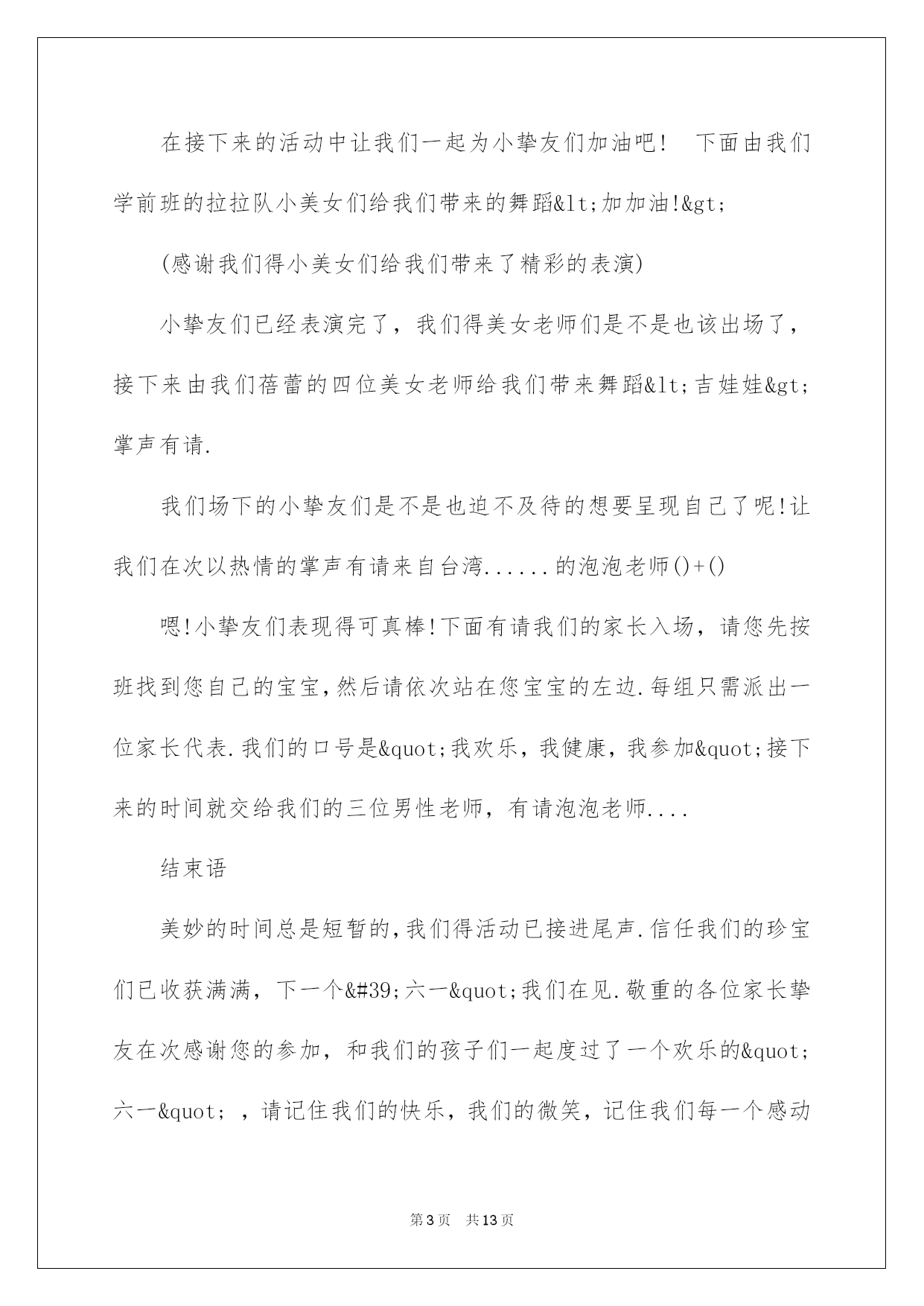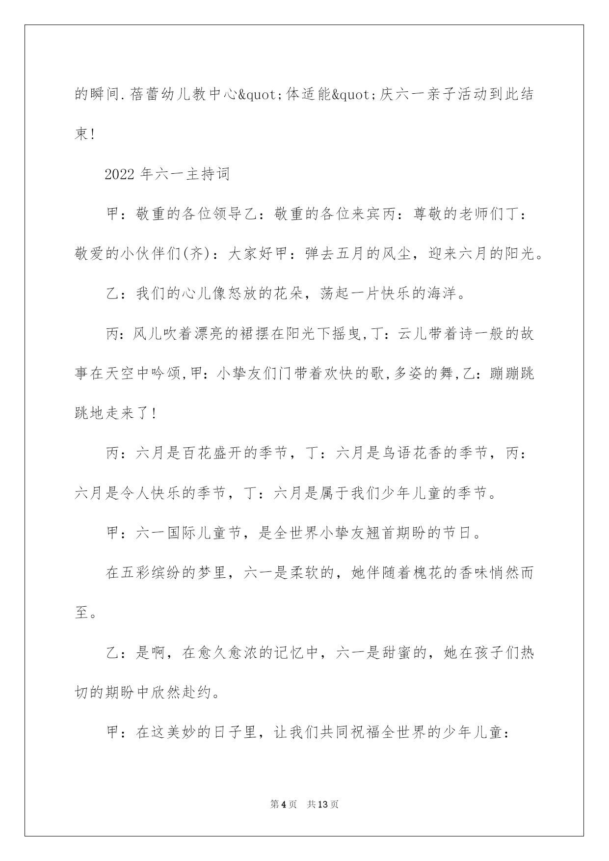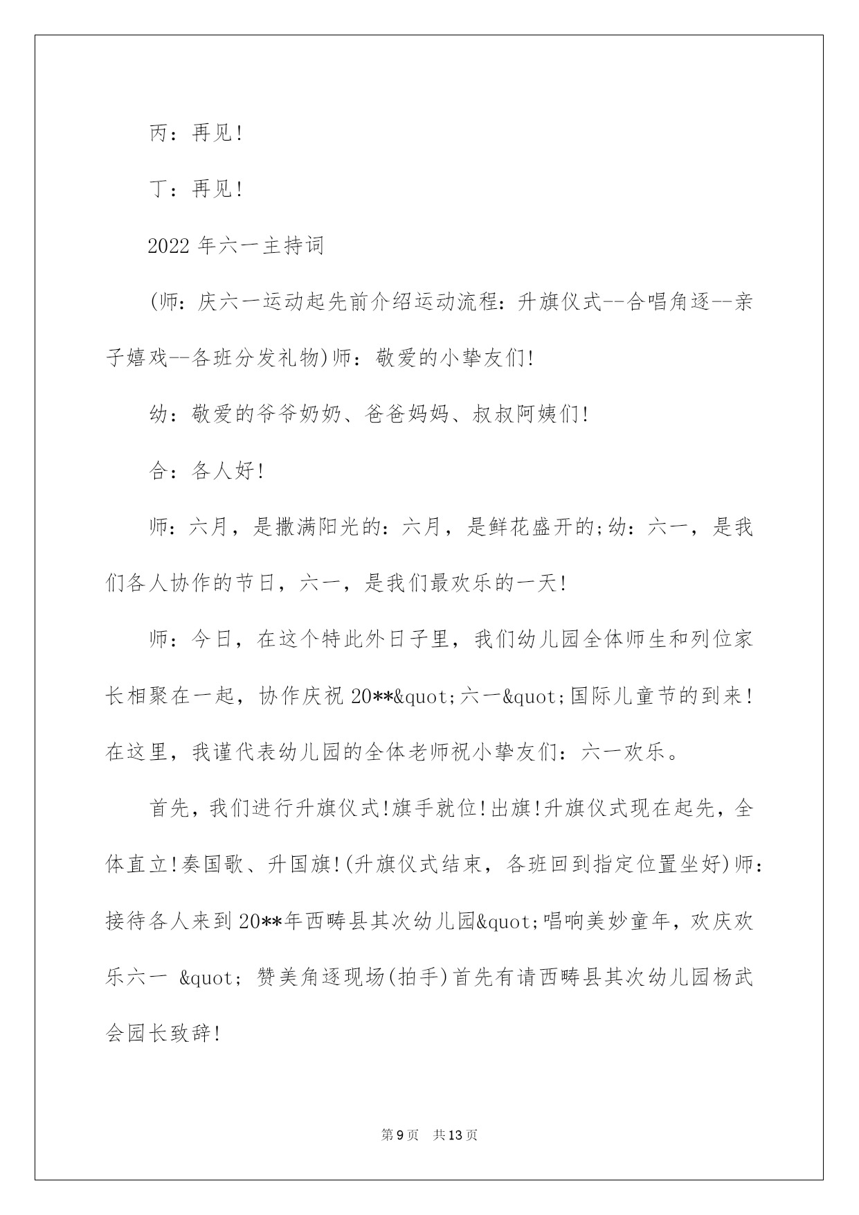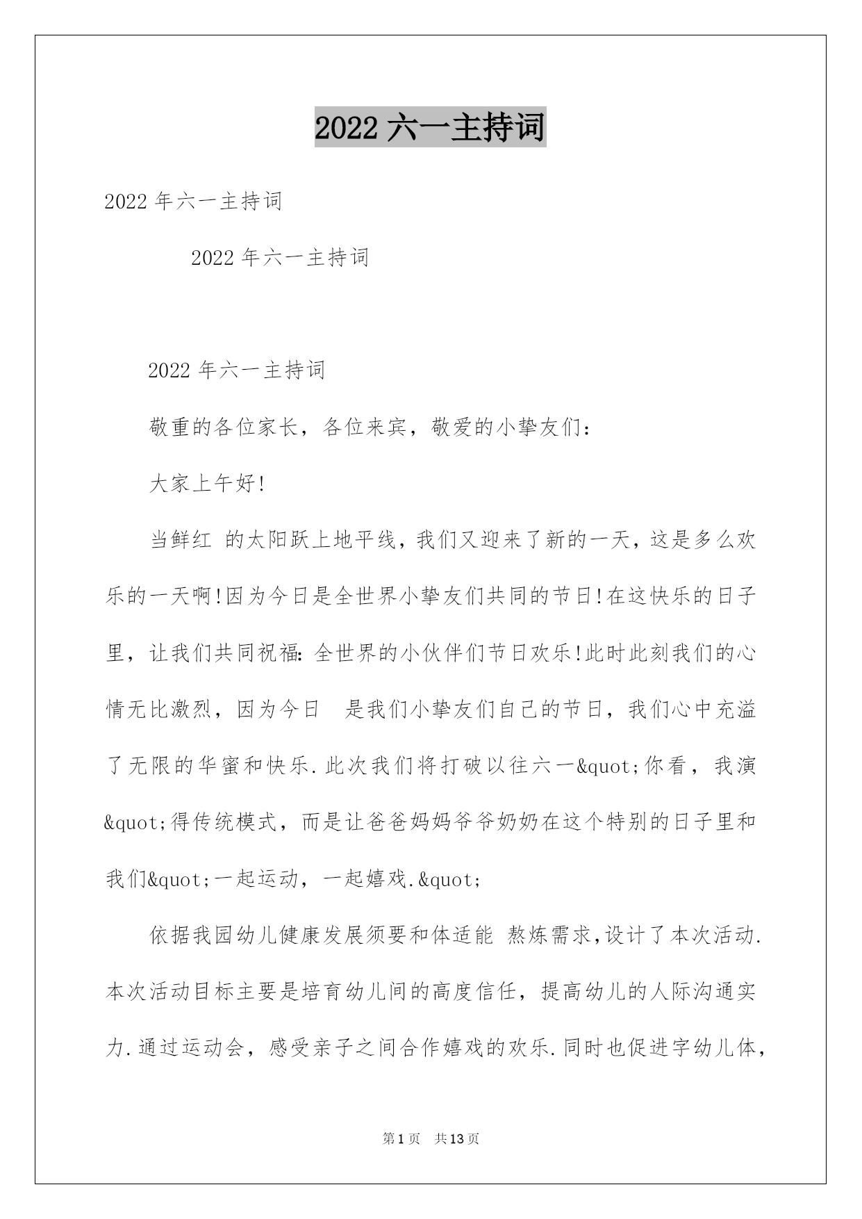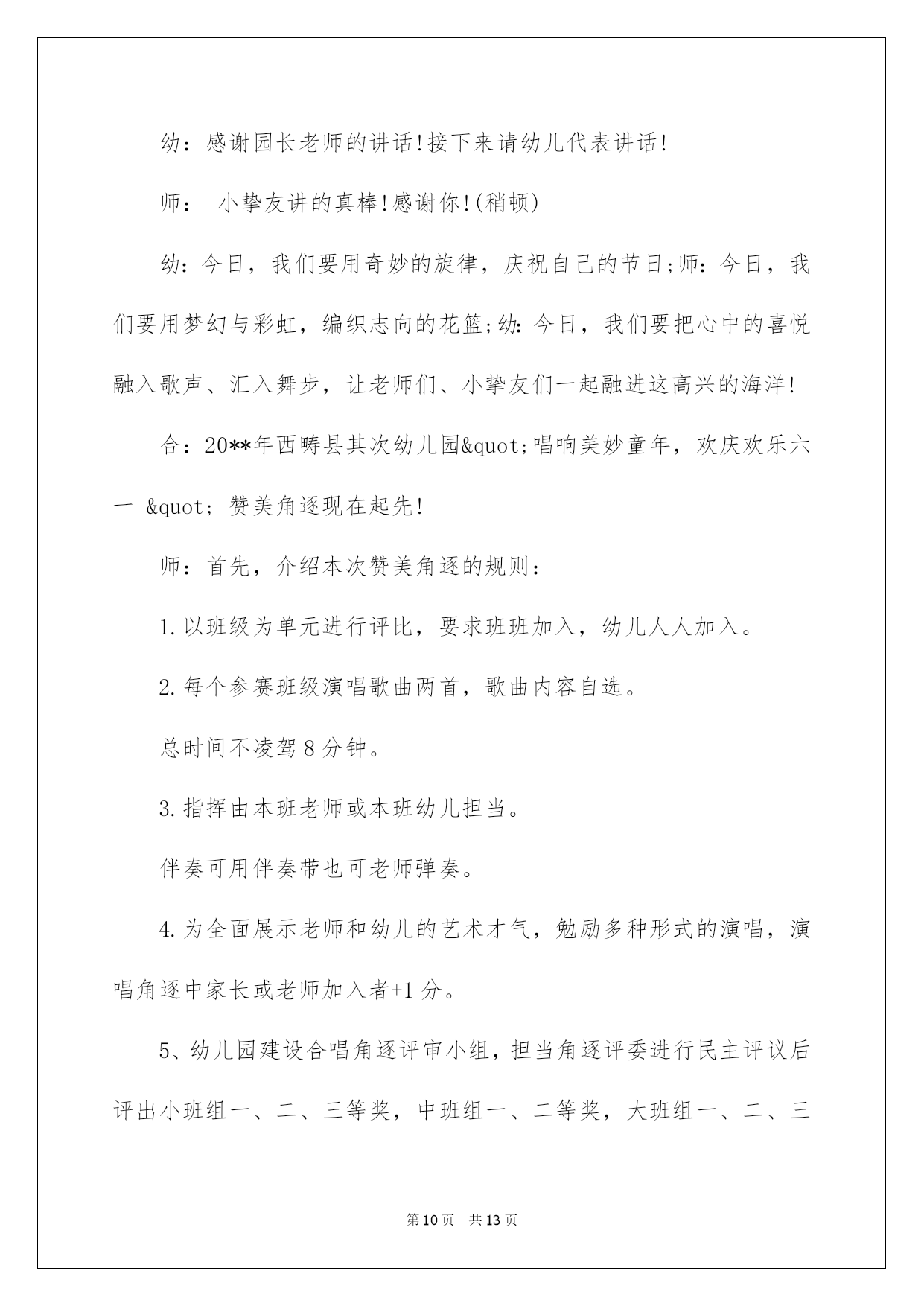 第PAGE\*Arabic\*MERGEFORMAT13页共NUMPAGES\*Arabic\*MERGEFORMAT13页第PAGE\*MERGEFORMAT13页共NUMPAGES\*MERGEFORMAT13页第PAGE\*MERGEFORMAT13页共NUMPAGES\*MERGEFORMAT13页第PAGE\*MERGEFORMAT13页共NUMPAGES\*MERGEFORMAT13页第PAGE\*MERGEFORMAT13页共NUMPAGES\*MERGEFORMAT13页第PAGE\*MERGEFORMAT13页共NUMPAGES\*MERGEFORMAT13页第PAGE\*MERGEFORMAT13页共NUMPAGES\*MERGEFORMAT13页第PAGE\*MERGEFORMAT13页共NUMPAGES\*MERGEFORMAT13页第PAGE\*MERGEFORMAT13页共NUMPAGES\*MERGEFORMAT13页第PAGE\*MERGEFORMAT13页共NUMPAGES\*MERGEFORMAT13页第PAGE\*MERGEFORMAT13页共NUMPAGES\*MERGEFORMAT13页2022六一主持词2022年六一主持词2022年六一主持词2022年六一主持词敬重的各位家长,各位来宾,敬爱的小挚友们:大家上午好!当鲜红的太阳跃上地平线,我们又迎来了新的一天,这是多么欢乐的一天啊!因为今日是全世界小挚友们共同的节日!在这快乐的日子里,让我们共同祝福:全世界的小伙伴们节日欢乐!此时此刻我们的心情无比激烈,因为今日是我们小挚友们自己的节日,我们心中充溢了无限的华蜜和快乐.此次我们将打破以往六一"你看,我演"得传统模式,而是让爸爸妈妈爷爷奶奶在这个特别的日子里和我们"一起运动,一起嬉戏."依据我园幼儿健康发展须要和体适能熬炼需求,设计了本次活动.本次活动目标主要是培育幼儿间的高度信任,提高幼儿的人际沟通实力.通过运动会,感受亲子之间合作嬉戏的欢乐.同时也促进字幼儿体,智,德.美等全面发展.就让我们一起欢乐得运动吧!瞧!那群可爱的小挚友们个个整装待发,都已经等不及了呢!就让我们以热情的掌声欢迎他们入场吧!首先出场的是我们学前班的小挚友,他们迈着整齐的步伐走过了会场,你瞧,他们多像一只只展翅欲飞的雄鹰,打算大展身手,就让我们拭目以待吧!下面出场的是我们大班的小挚友,他们天真可爱,充溢活力,个个喜笑顔开,在这个充溢爱的季节里,愿他们欢乐无忧,愿他们在蓓蕾幼儿园的摇篮中华蜜地度过每一天.接下来出场的是中班的小挚友,他们的步伐虽然透着稚气,却迈得非常有力.他们脸上挂着天真的笑容,但那笑容里却写满了坚毅和英勇.让我们为这些精神饱满的孩子们加油,喝彩!最终由我们的聪聪老师和毛毛老师带着他们的小小班的小挚友们向我们走来,他们仔细的小模样可真是可爱!我们信任,这些可爱的小天使们肯定会给我们带来欢乐,带来好运的!我们的小小动动员们都已经进场了,接下来有请我们的程园长上台讲话.(感谢我们程园长得精彩致词)在接下来的活动中让我们一起为小挚友们加油吧!下面由我们学前班的拉拉队小美女们给我们带来的舞蹈<加加油!>(感谢我们得小美女们给我们带来了精彩的表演)小挚友们已经表演完了,我们得美女老师们是不是也该出场了,接下来由我们蓓蕾的四位美女老师给我们带来舞蹈<吉娃娃>掌声有请.我们场下的小挚友们是不是也迫不及待的想要呈现自己了呢!让我们在次以热情的掌声有请来自台湾......的泡泡老师()+()嗯!小挚友们表现得可真棒!下面有请我们的家长入场,请您先按班找到您自己的宝宝,然后请依次站在您宝宝的左边.每组只需派出一位家长代表.我们的口号是"我欢乐,我健康,我参加"接下来的时间就交给我们的三位男性老师,有请泡泡老师....结束语美妙的时间总是短暂的,我们得活动已接进尾声.信任我们的珍宝们已收获满满,下一个'六一"我们在见.敬重的各位家长挚友在次感谢您的参加,和我们的孩子们一起度过了一个欢乐的"六一",请记住我们的快乐,我们的微笑,记住我们每一个感动的瞬间.蓓蕾幼儿教中心"体适能"庆六一亲子活动到此结束!2022年六一主持词甲:敬重的各位领导乙:敬重的各位来宾丙:尊敬的老师们丁:敬爱的小伙伴们(齐):大家好甲:弹去五月的风尘,迎来六月的阳光。乙:我们的心儿像怒放的花朵,荡起一片快乐的海洋。丙:风儿吹着漂亮的裙摆在阳光下摇曳,丁:云儿