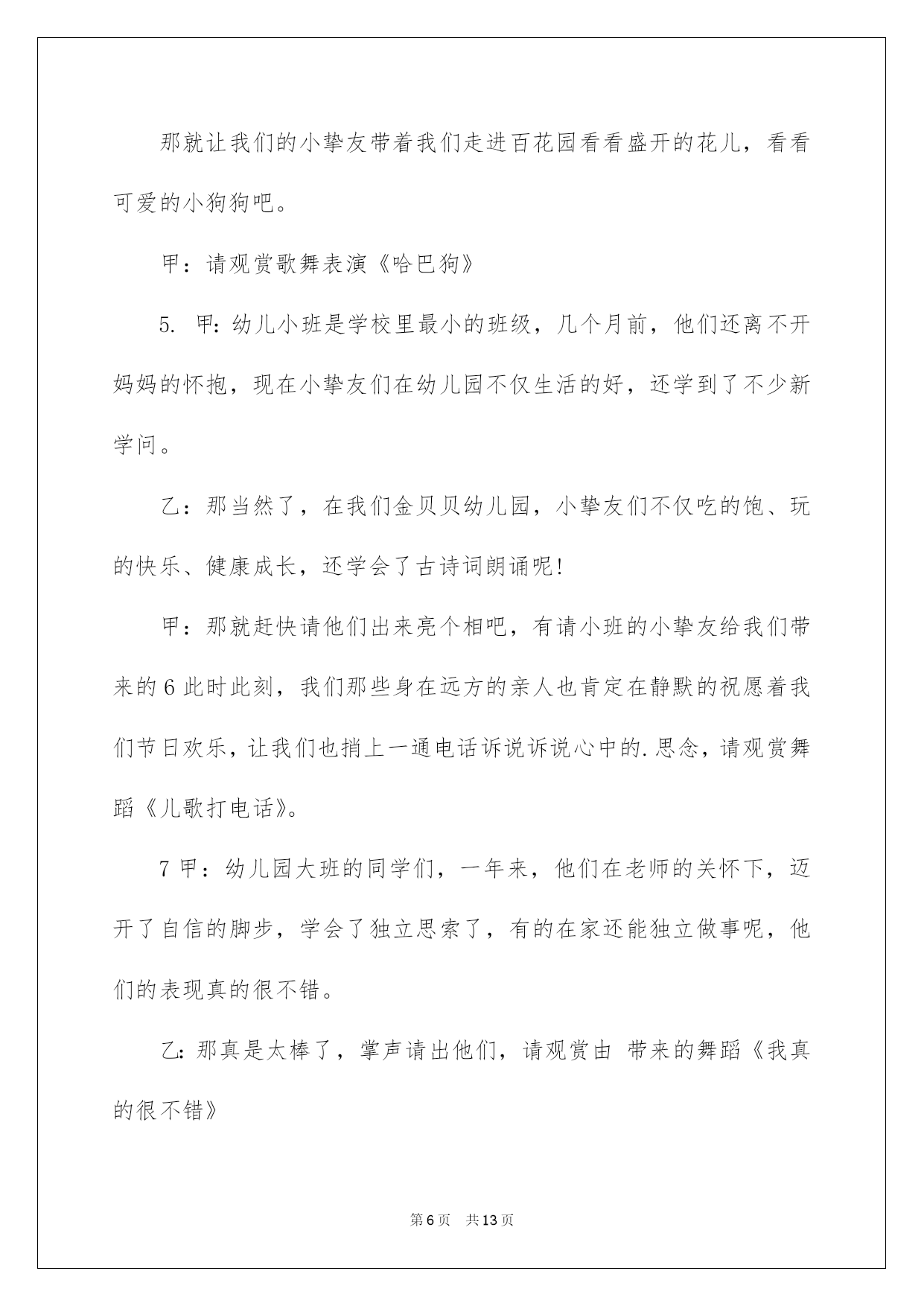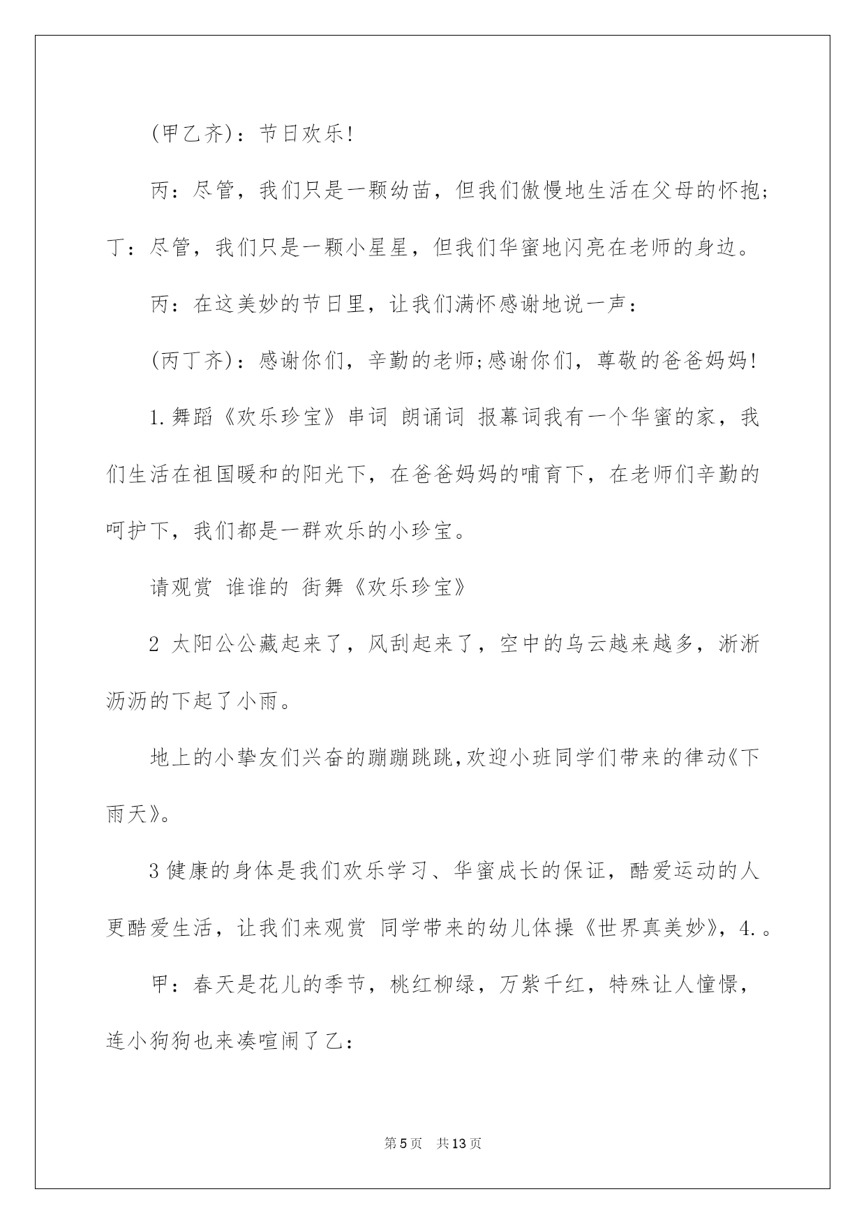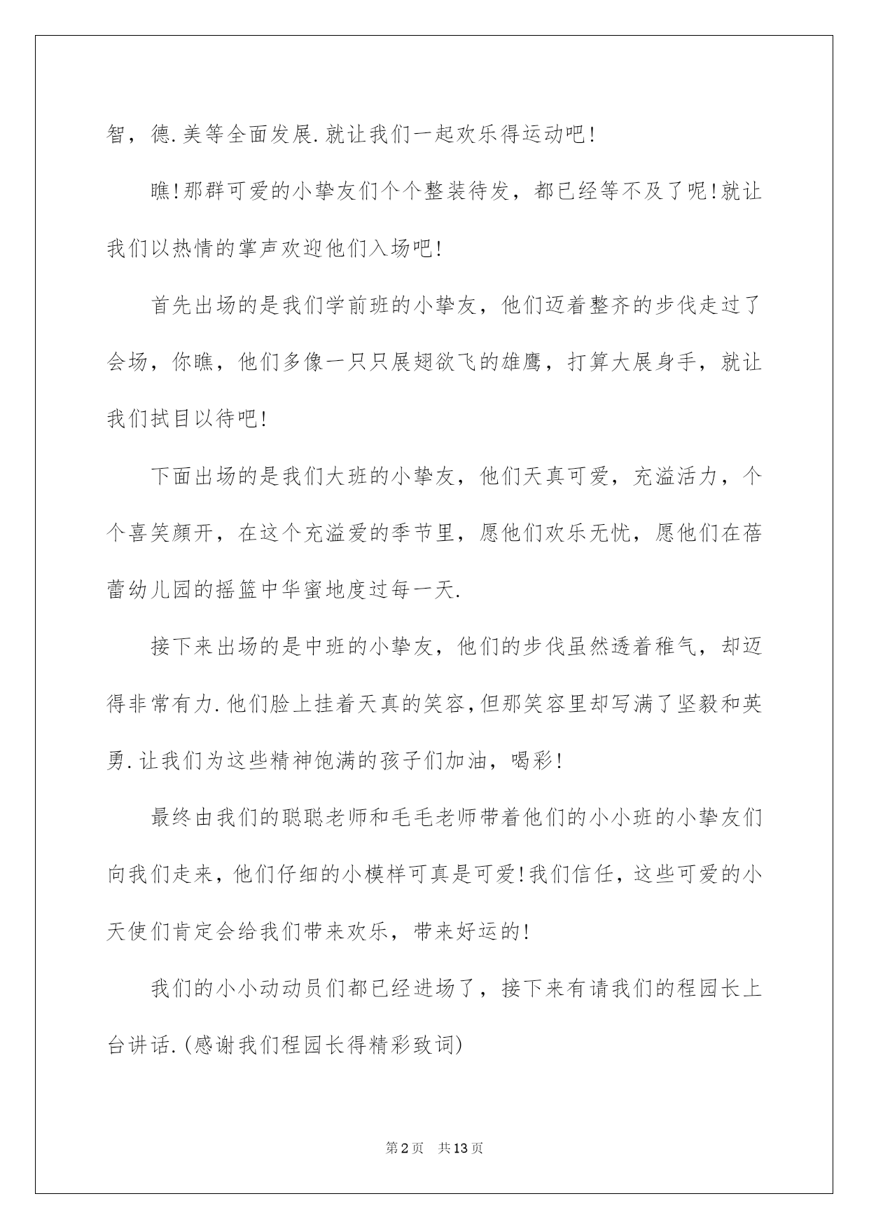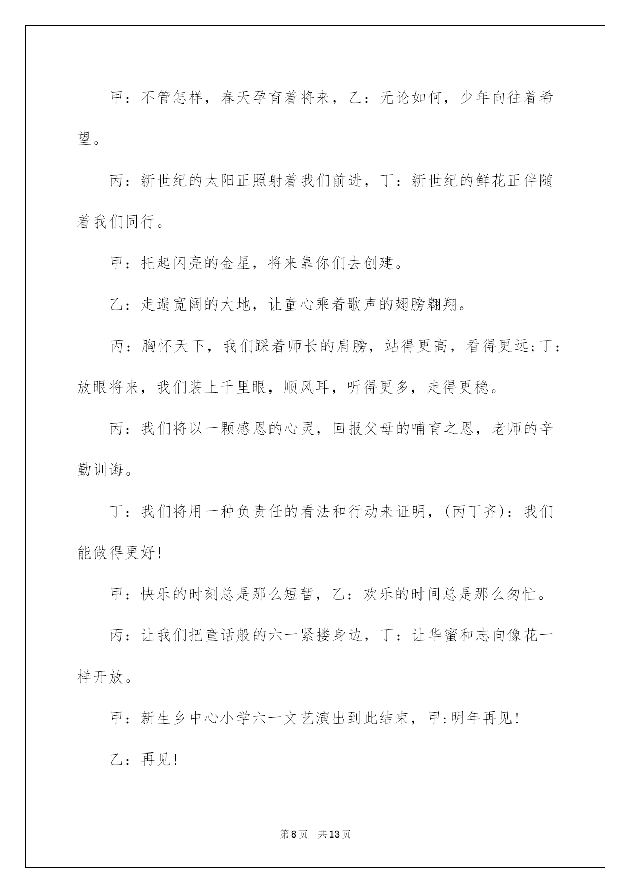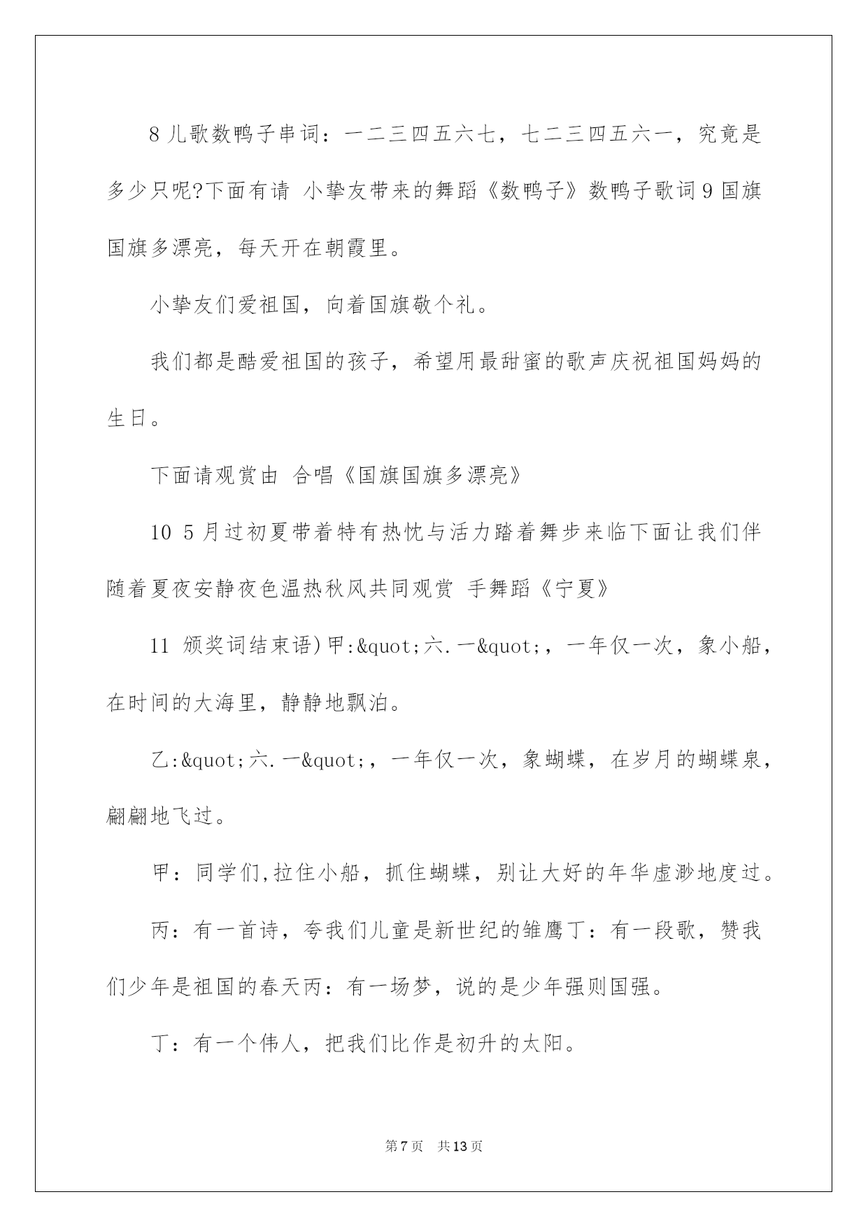 第PAGE\*Arabic\*MERGEFORMAT13页共NUMPAGES\*Arabic\*MERGEFORMAT13页第PAGE\*MERGEFORMAT13页共NUMPAGES\*MERGEFORMAT13页第PAGE\*MERGEFORMAT13页共NUMPAGES\*MERGEFORMAT13页第PAGE\*MERGEFORMAT13页共NUMPAGES\*MERGEFORMAT13页第PAGE\*MERGEFORMAT13页共NUMPAGES\*MERGEFORMAT13页第PAGE\*MERGEFORMAT13页共NUMPAGES\*MERGEFORMAT13页第PAGE\*MERGEFORMAT13页共NUMPAGES\*MERGEFORMAT13页第PAGE\*MERGEFORMAT13页共NUMPAGES\*MERGEFORMAT13页第PAGE\*MERGEFORMAT13页共NUMPAGES\*MERGEFORMAT13页第PAGE\*MERGEFORMAT13页共NUMPAGES\*MERGEFORMAT13页第PAGE\*MERGEFORMAT13页共NUMPAGES\*MERGEFORMAT13页2022六一主持词2022年六一主持词2022年六一主持词2022年六一主持词敬重的各位家长,各位来宾,敬爱的小挚友们:大家上午好!当鲜红的太阳跃上地平线,我们又迎来了新的一天,这是多么欢乐的一天啊!因为今日是全世界小挚友们共同的节日!在这快乐的日子里,让我们共同祝福:全世界的小伙伴们节日欢乐!此时此刻我们的心情无比激烈,因为今日是我们小挚友们自己的节日,我们心中充溢了无限的华蜜和快乐.此次我们将打破以往六一"你看,我演"得传统模式,而是让爸爸妈妈爷爷奶奶在这个特别的日子里和我们"一起运动,一起嬉戏."依据我园幼儿健康发展须要和体适能熬炼需求,设计了本次活动.本次活动目标主要是培育幼儿间的高度信任,提高幼儿的人际沟通实力.通过运动会,感受亲子之间合作嬉戏的欢乐.同时也促进字幼儿体,智,德.美等全面发展.就让我们一起欢乐得运动吧!瞧!那群可爱的小挚友们个个整装待发,都已经等不及了呢!就让我们以热情的掌声欢迎他们入场吧!首先出场的是我们学前班的小挚友,他们迈着整齐的步伐走过了会场,你瞧,他们多像一只只展翅欲飞的雄鹰,打算大展身手,就让我们拭目以待吧!下面出场的是我们大班的小挚友,他们天真可爱,充溢活力,个个喜笑顔开,在这个充溢爱的季节里,愿他们欢乐无忧,愿他们在蓓蕾幼儿园的摇篮中华蜜地度过每一天.接下来出场的是中班的小挚友,他们的步伐虽然透着稚气,却迈得非常有力.他们脸上挂着天真的笑容,但那笑容里却写满了坚毅和英勇.让我们为这些精神饱满的孩子们加油,喝彩!最终由我们的聪聪老师和毛毛老师带着他们的小小班的小挚友们向我们走来,他们仔细的小模样可真是可爱!我们信任,这些可爱的小天使们肯定会给我们带来欢乐,带来好运的!我们的小小动动员们都已经进场了,接下来有请我们的程园长上台讲话.(感谢我们程园长得精彩致词)在接下来的活动中让我们一起为小挚友们加油吧!下面由我们学前班的拉拉队小美女们给我们带来的舞蹈<加加油!>(感谢我们得小美女们给我们带来了精彩的表演)小挚友们已经表演完了,我们得美女老师们是不是也该出场了,接下来由我们蓓蕾的四位美女老师给我们带来舞蹈<吉娃娃>掌声有请.我们场下的小挚友们是不是也迫不及待的想要呈现自己了呢!让我们在次以热情的掌声有请来自台湾......的泡泡老师()+()嗯!小挚友们表现得可真棒!下面有请我们的家长入场,请您先按班找到您自己的宝宝,然后请依次站在您宝宝的左边.每组只需派出一位家长代表.我们的口号是"我欢乐,我健康,我参加"接下来的时间就交给我们的三位男性老师,有请泡泡老师....结束语美妙的时间总是短暂的,我们得活动已接进尾声.信任我们的珍宝们已收获满满,下一个'六一"我们在见.敬重的各位家长挚友在次感谢您的参加,和我们的孩子们一起度过了一个欢乐的"六一",请记住我们的快乐,我们的微笑,记住我们每一个感动的瞬间.蓓蕾幼儿教中心"体适能"庆六一亲子活动到此结束!2022年六一主持词甲:敬重的各位领导乙:敬重的各位来宾丙:尊敬的老师们丁:敬爱的小伙伴们(齐):大家好甲:弹去五月的风尘,迎来六月的阳光。乙:我们的心儿像怒放的花朵,荡起一片快乐的海洋。丙:风儿吹着漂亮的裙摆在阳光下摇曳,丁:云儿