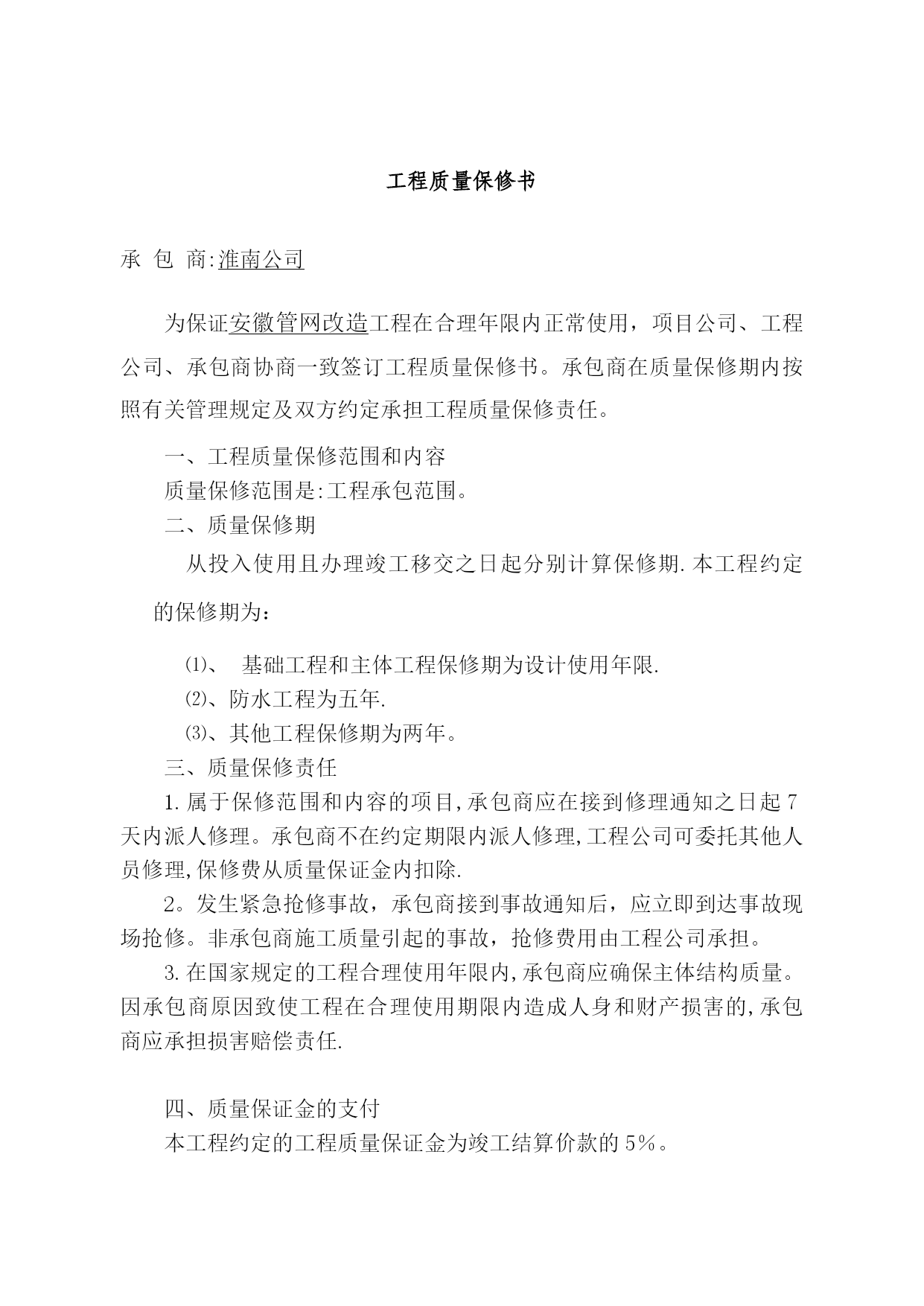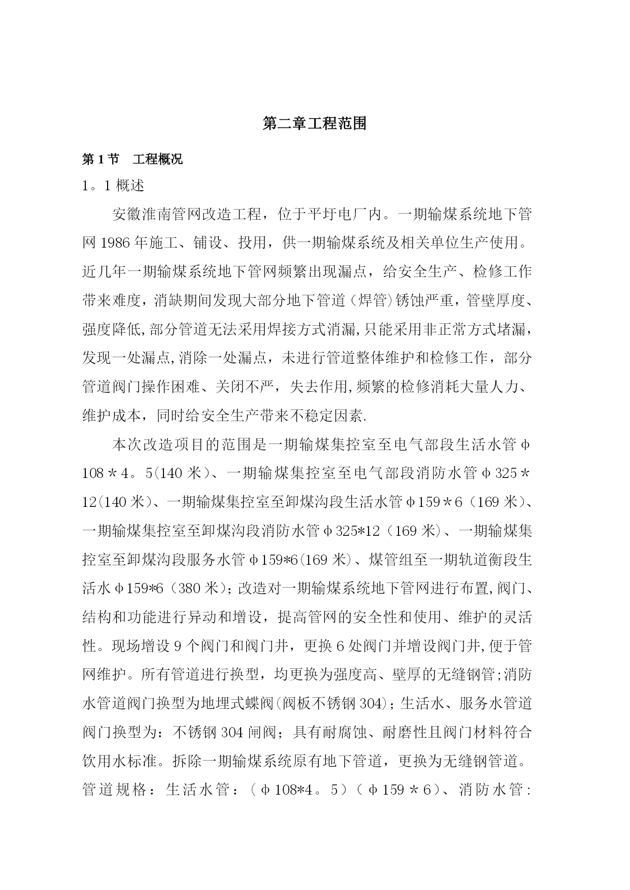 管网改造施工方案【实用文档】doc文档可直接使用可编辑,欢迎下载目录第一章企业资质及资信材料TOC\o"1—3"第二章工程范围第1节工程概况第2节编制的原则第三章总平面布置第1节施工现场条件第2节本工程生产设施布置第3节总平面布置图第四章现场管理组织机构和劳动力计划第1节项目管理组织机构及职能第2节拟投入本工程项目经理部人员简历表第3节主要劳动力计划第五章施工管理第1节施工管理制度第2节施工计划管理第3节施工技术管理第六章施工准备第1节技术准备第2节物资准备第3节施工现场准备第七章主要施工内容和术方案第1节主要施工内容第2节主要施工方案第八章质量管理措施第1节质量目标第2节质量管理的控制措施第3节质量通病控制措施第4节工程竣工后的质量保修措施第九章安全、环境和文明施工管理第1节安全工作方针、目标第2节安全管理体系第3节安全控制措施第4节文明施工管理目标第5节文明施工管理制度和措施第6节保卫、消防管理措施第7节环保措施第十章季节性施工第十一章附图(施工平面布置示意图和施工进度计划示意图)第一章《投标人情况登记表》单位全称法定代表人通讯地址邮政编码开户银行账号本次投标联系人联系人所在部门移动电子邮件信箱注:以上信息作为投标保证金退还依据,请认真填写帐号及邮寄地址,并与投标保证金密封在一起。投标代表签字(盖章):日期:工程质量保修书承包商:淮南公司为保证安徽管网改造工程在合理年限内正常使用,项目公司、工程公司、承包商协商一致签订工程质量保修书。承包商在质量保修期内按照有关管理规定及双方约定承担工程质量保修责任。一、工程质量保修范围和内容质量保修范围是:工程承包范围。二、质量保修期从投入使用且办理竣工移交之日起分别计算保修期.本工程约定的保修期为:基础工程和主体工程保修期为设计使用年限.⑵、防水工程为五年.⑶、其他工程保修期为两年。三、质量保修责任1.属于保修范围和内容的项目,承包商应在接到修理通知之日起7天内派人修理。承包商不在约定期限内派人修理,工程公司可委托其他人员修理,保修费从质量保证金内扣除.2。发生紧急抢修事故,承包商接到事故通知后,应立即到达事故现场抢修。非承包商施工质量引起的事故,抢修费用由工程公司承担。3.在国家规定的工程合理使用年限内,承包商应确保主体结构质量。因承包商原因致使工程在合理使用期限内造成人身和财产损害的,承包商应承担损害赔偿责任.四、质量保证金的支付本工程约定的工程质量保证金为竣工结算价款的5%。五、质量保证金的退还工程公司在本工程投入使用一年后,工程结算经过国家规定部门审计后,将剩余保证金本金返还承包商.六、其他双方约定的其它工程质量保修事项:剩余保证金返还后,并不免除承包商对所施工范围在设计使用年限内的保修责任。本工程质量保修书作为施工合同附件,由甲方和承包商共同签署。甲方(盖章):承包商(盖章):授权委托人(签字):授权委托人(签字):年月日年月日淮南常华建安公司组织机构企业名称淮南限责任公司法定代表人注册地址安徽淮南邮政编码成立时间05540554资质等级营业执照6承包经历20年(国内)年(国际)分包经历年(国内)年(国际)职工人数总人数:58人技术人员:35人行政人员:12人公司主要业务概况公司总经理1人副总经理2人人事劳动部3人综合部2人财务部2人工程技术部3人安全环保部2人工会4人装潢公司12土建工程项目部10安装工程项目部8材料部4人生产服务项目部12承包工程设立的组织机构总公司项目经理项目副经理项目工程师生产总负责后勤总负责测量组施工组技术组质安组物资组计划劳资组劳资组行政保卫组测量放线工程技术管理现场调度安全监督与管理质量监督与管理现场施工管理材料保管材料采购供应劳动人事供应计划预算统计管理成本核算与控制财会会计治安保卫医疗与后勤管理其它作业班组脚手架作业班组钢筋作业班组木工作业班组泥工砼作业班组安装作业班组装修作业班组防水作业班组后勤作业班组工程范围第1节工程概况1。1概述安徽淮南管网改造工程,位于平圩电厂内。一期输煤系统地下管网1986年施工、铺设、投用,供一期输煤系统及相关单位生产使用。近几年一期输煤系统地下管网频繁出现漏点,给安全生