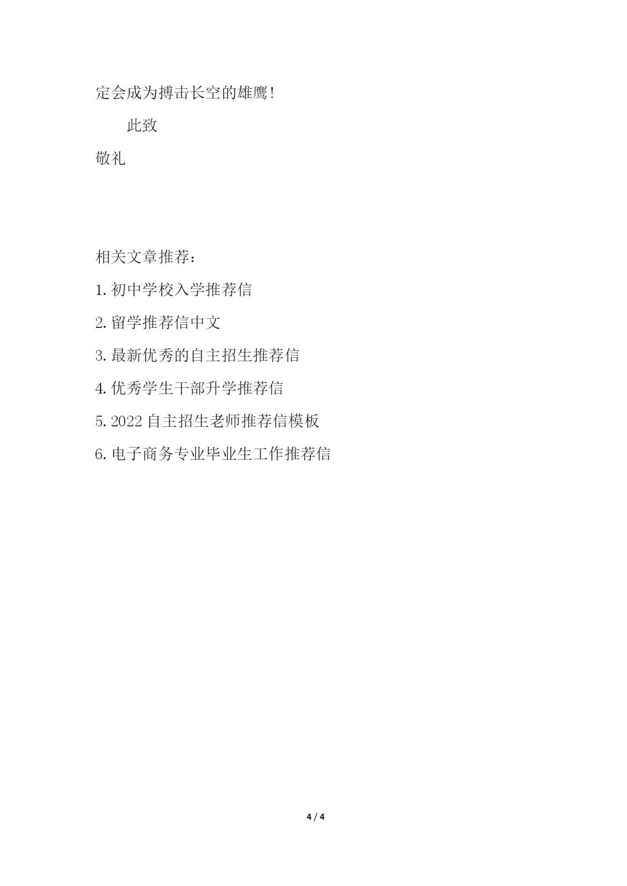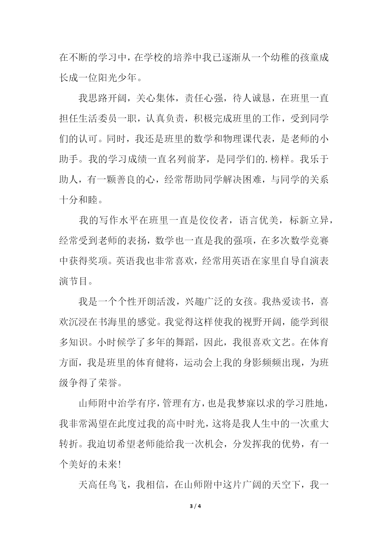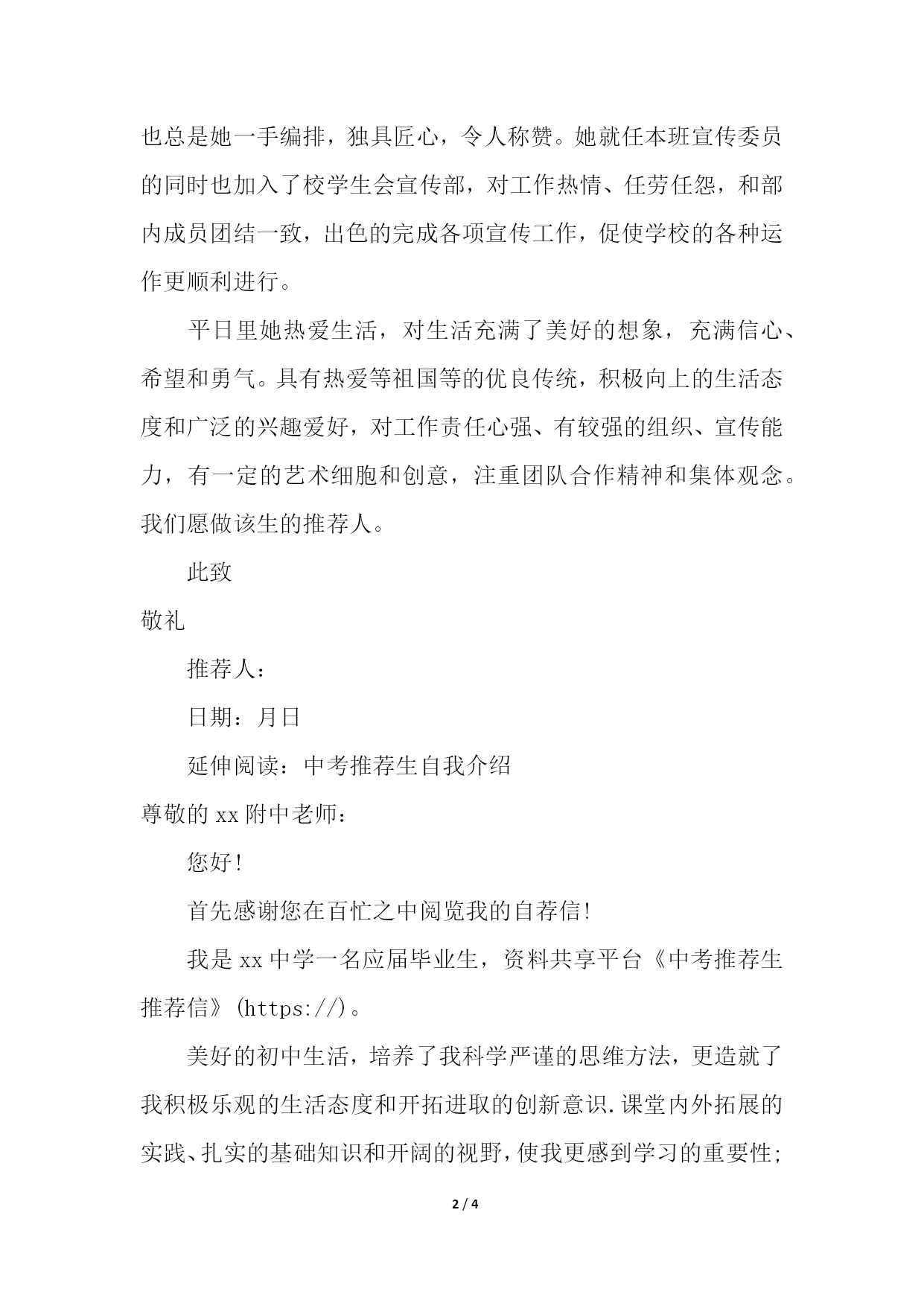 PAGE4/NUMPAGES4中考推荐生推荐信中考推荐生推荐信尊敬的领导与老师们:您好!同学是我们所教的一位优秀的学生。在初中的三年生活中,她渐渐具备了向上的思维品格、较强的学习能力,完善的个性特点,乐于奉献,真诚待人。在学习品质方面,课堂学习认真,紧跟老师思路;课下乐于与老师同学交流,完善自我。该生成绩优异,学习习惯优秀,品行端正良好。该同学乐于钻研,勤学善问,数学、政治、语文成绩突出,有较好的分析能力,也有独立自主的见解和坚实的意志品质。三年的校园生涯和社会实践生活中她不断的挑战自我、充实自己,向着自己的理想迈进。该生尤爱读书,积极参加学校的朗诵、辩论等活动,取得了一定的成绩,因为博览,所以全面,因为厚积,所以有发,相信她的努力不会让你们失望。在课余工作方面,乐于帮助同学、在生活上也会伸出援助之手,在班中具有威信。对待老师彬彬有礼,甘于和同学分享。担任着数学课代表和宣传委员的职务,分担老师的任务,下达老师的指令,是我们的好帮手。在学校宣传栏当中总会发现她的作品,为学校增光添彩,而且在学农活动和劳动技术课上的班级黑板报也总是她一手编排,独具匠心,令人称赞。她就任本班宣传委员的同时也加入了校学生会宣传部,对工作热情、任劳任怨,和部内成员团结一致,出色的完成各项宣传工作,促使学校的各种运作更顺利进行。平日里她热爱生活,对生活充满了美好的想象,充满信心、希望和勇气。具有热爱等祖国等的优良传统,积极向上的生活态度和广泛的兴趣爱好,对工作责任心强、有较强的组织、宣传能力,有一定的艺术细胞和创意,注重团队合作精神和集体观念。我们愿做该生的推荐人。此致敬礼推荐人:日期:月日延伸阅读:中考推荐生自我介绍尊敬的xx附中老师:您好!首先感谢您在百忙之中阅览我的自荐信!我是xx中学一名应届毕业生,资料共享平台《中考推荐生推荐信》(https://)。美好的初中生活,培养了我科学严谨的思维方法,更造就了我积极乐观的生活态度和开拓进取的创新意识.课堂内外拓展的实践、扎实的基础知识和开阔的视野,使我更感到学习的重要性;在不断的学习中,在学校的培养中我已逐渐从一个幼稚的孩童成长成一位阳光少年。我思路开阔,关心集体,责任心强,待人诚恳,在班里一直担任生活委员一职,认真负责,积极完成班里的工作,受到同学们的认可。同时,我还是班里的数学和物理课代表,是老师的小助手。我的学习成绩一直名列前茅,是同学们的.榜样。我乐于助人,有一颗善良的心,经常帮助同学解决困难,与同学的关系十分和睦。我的写作水平在班里一直是佼佼者,语言优美,标新立异,经常受到老师的表扬,数学也一直是我的强项,在多次数学竞赛中获得奖项。英语我也非常喜欢,经常用英语在家里自导自演表演节目。我是一个个性开朗活泼,兴趣广泛的女孩。我热爱读书,喜欢沉浸在书海里的感觉。我觉得这样使我的视野开阔,能学到很多知识。小时候学了多年的舞蹈,因此,我很喜欢文艺。在体育方面,我是班里的体育健将,运动会上我的身影频频出现,为班级争得了荣誉。山师附中治学有序,管理有方,也是我梦寐以求的学习胜地,我非常渴望在此度过我的高中时光,这将是我人生中的一次重大转折。我迫切希望老师能给我一次机会,分发挥我的优势,有一个美好的未来!天高任鸟飞,我相信,在山师附中这片广阔的天空下,我一定会成为搏击长空的雄鹰!此致敬礼相关文章推荐:1.初中学校入学推荐信2.留学推荐信中文3.最新优秀的自主招生推荐信4.优秀学生干部升学推荐信5.2022自主招生老师推荐信模板6.电子商务专业毕业生工作推荐信