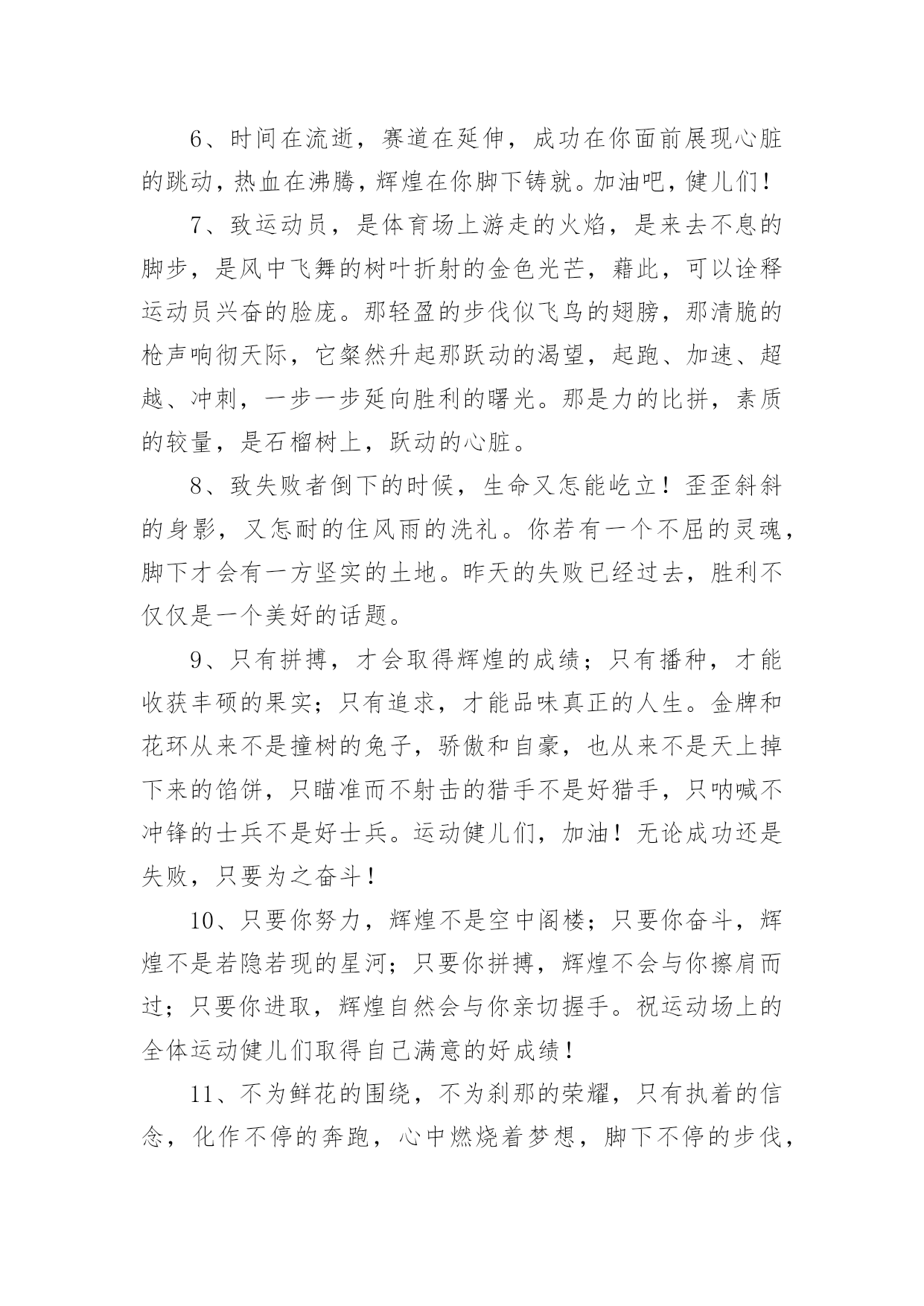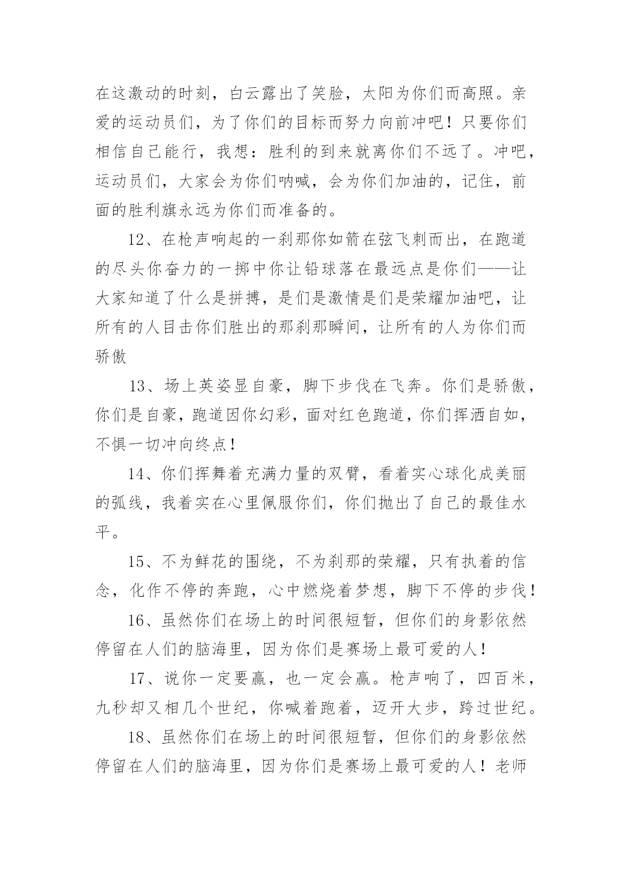 老师运动会加油稿老师运动会加油稿随着社会不断地进步,能够利用到加油稿的场合越来越多,加油稿是用于给别人加油鼓气,提升别人气势的文稿。为了让您在写加油稿时更加简单方便,以下是小编整理的老师运动会加油稿,供大家参考借鉴,希望可以帮助到有需要的朋友。1、叫,血在烧,都是渴望有无限的希望,掌声响起来为新的力量喝彩,掌声响起来,每一棵都精彩。2、我们不喜欢无云的天空,我们不喜欢无泪的人生,因为,云朵也是一道风景,眼泪也是一种晶莹,不要总是遗憾,生命的美丽,常常在于过程,不要总是哀叹,一点点挫折,只会让人,越战越勇。3、今天的你们英姿飒爽,今天的你们一马当先。不要放弃,不要气馁。相信自己,你是最棒的!你永远都是我们心中的体育健儿!加油!4、青春是诗,青春是歌,青春是朝气蓬勃。看,踏着青春的旋律走来的是5、人生的路,有坦途,也有坎坷;走过的岁月,有欢笑,也有苦涩,泪水告诉我一个跌倒的故事,汗水使我多了一份沉重,几多成熟。6、时间在流逝,赛道在延伸,成功在你面前展现心脏的跳动,热血在沸腾,辉煌在你脚下铸就。加油吧,健儿们!7、致运动员,是体育场上游走的火焰,是来去不息的脚步,是风中飞舞的树叶折射的金色光芒,藉此,可以诠释运动员兴奋的脸庞。那轻盈的步伐似飞鸟的翅膀,那清脆的枪声响彻天际,它粲然升起那跃动的渴望,起跑、加速、超越、冲刺,一步一步延向胜利的曙光。那是力的比拼,素质的较量,是石榴树上,跃动的心脏。8、致失败者倒下的时候,生命又怎能屹立!歪歪斜斜的身影,又怎耐的住风雨的洗礼。你若有一个不屈的灵魂,脚下才会有一方坚实的土地。昨天的失败已经过去,胜利不仅仅是一个美好的话题。9、只有拼搏,才会取得辉煌的成绩;只有播种,才能收获丰硕的果实;只有追求,才能品味真正的人生。金牌和花环从来不是撞树的兔子,骄傲和自豪,也从来不是天上掉下来的馅饼,只瞄准而不射击的猎手不是好猎手,只呐喊不冲锋的士兵不是好士兵。运动健儿们,加油!无论成功还是失败,只要为之奋斗!10、只要你努力,辉煌不是空中阁楼;只要你奋斗,辉煌不是若隐若现的星河;只要你拼搏,辉煌不会与你擦肩而过;只要你进取,辉煌自然会与你亲切握手。祝运动场上的全体运动健儿们取得自己满意的好成绩!11、不为鲜花的围绕,不为刹那的荣耀,只有执着的信念,化作不停的奔跑,心中燃烧着梦想,脚下不停的步伐,在这激动的时刻,白云露出了笑脸,太阳为你们而高照。亲爱的运动员们,为了你们的目标而努力向前冲吧!只要你们相信自己能行,我想:胜利的到来就离你们不远了。冲吧,运动员们,大家会为你们呐喊,会为你们加油的,记住,前面的胜利旗永远为你们而准备的。12、在枪声响起的一刹那你如箭在弦飞刺而出,在跑道的尽头你奋力的一掷中你让铅球落在最远点是你们——让大家知道了什么是拼搏,是们是激情是们是荣耀加油吧,让所有的人目击你们胜出的那刹那瞬间,让所有的人为你们而骄傲13、场上英姿显自豪,脚下步伐在飞奔。你们是骄傲,你们是自豪,跑道因你幻彩,面对红色跑道,你们挥洒自如,不惧一切冲向终点!14、你们挥舞着充满力量的双臂,看着实心球化成美丽的弧线,我着实在心里佩服你们,你们抛出了自己的最佳水平。15、不为鲜花的围绕,不为刹那的荣耀,只有执着的信念,化作不停的奔跑,心中燃烧着梦想,脚下不停的步伐!16、虽然你们在场上的时间很短暂,但你们的身影依然停留在人们的脑海里,因为你们是赛场上最可爱的人!17、说你一定要赢,也一定会赢。枪声响了,四百米,九秒却又相几个世纪,你喊着跑着,迈开大步,跨过世纪。18、虽然你们在场上的时间很短暂,但你们的身影依然停留在人们的脑海里,因为你们是赛场上最可爱的人!老师运动会加油稿