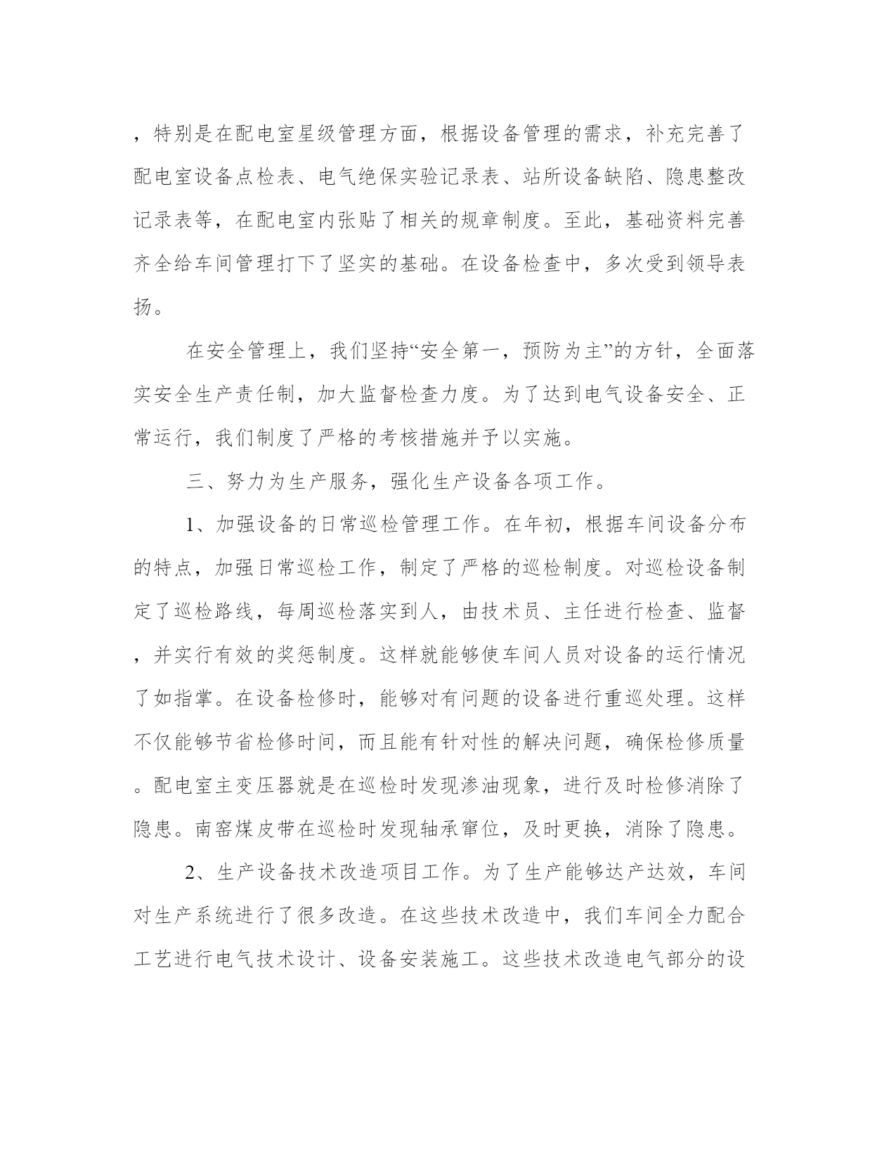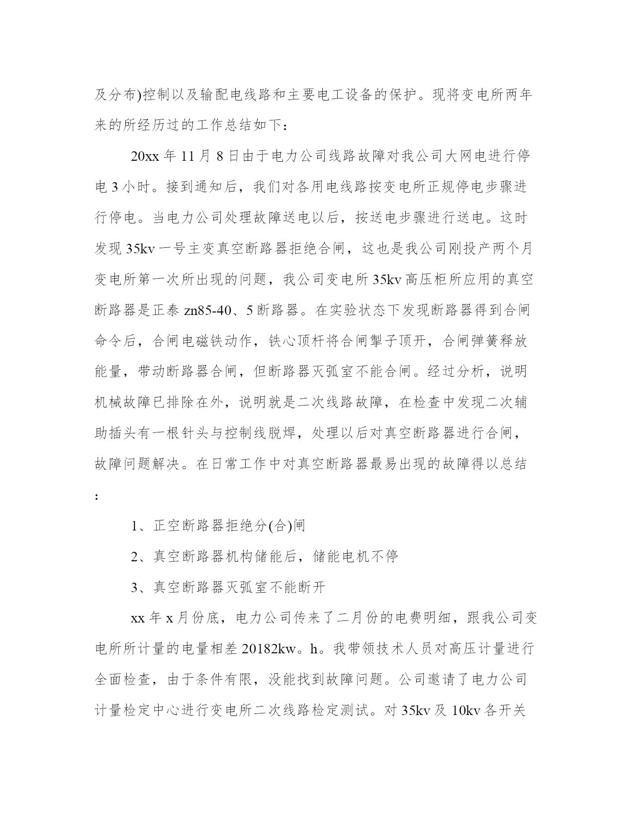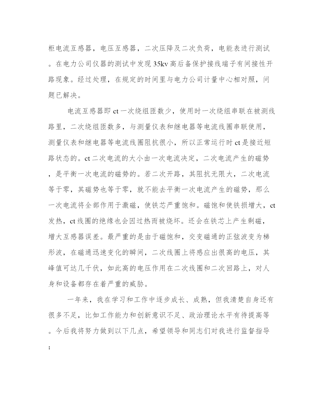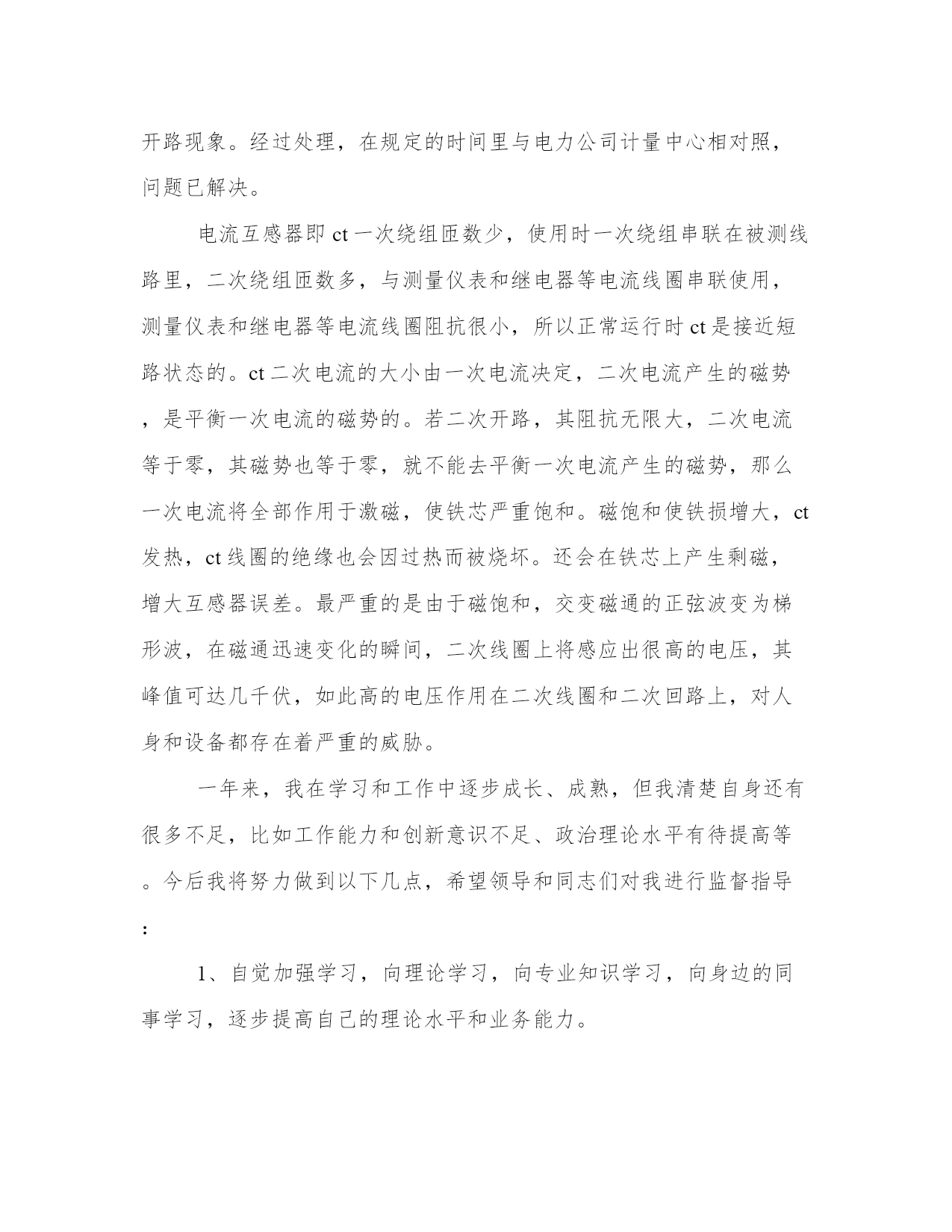 最新电气技术员个人工作总结(大全8篇)围绕工作中的某一方面或某一问题进行的专门性总结,总结某一方面的成绩、经验。那关于总结格式是怎样的呢?而个人总结又该怎么写呢?以下是小编为大家收集的总结范文,仅供参考,大家一起来看看吧。电气技术员个人工作总结篇一我叫xxx,从事电气设备维修工作已有5年时间。自xx年x月来到哈xx公司工作,至今工作已有两年多时间。从进公司至今一直以来从事变电运行维护和管理工作。先后参加并组织了高压计量与继电保护的整定及校检;无功补偿与电压整定;直流屏检验维护;变电所二次线路故障与处理;高压柜的故障与处理;高压电缆头的制作与处理;变电所春秋季全所检修与维护;户外高压架空线路的故障处理与维护。我始终把刻苦钻研技术与提高高压技术作业率相结合,积极学习各项高压设备的原理及其维修经验,并坚持不断提高自己的理论和实际操作技能,解决了变电运行中遇到的好多技术难题,为提高受电及输电设备运转率奠定了良好的基础。变电所是电力系统中对电能的电压和电流进行变换、集中和分配的场所。为保证电能的质量以及设备的安全,在变电所中还需进行电压调整、潮流(电力系统中各节点和支路中的电压、电流和功率的流向及分布)控制以及输配电线路和主要电工设备的保护。现将变电所两年来的所经历过的工作总结如下:20xx年11月8日由于电力公司线路故障对我公司大网电进行停电3小时。接到通知后,我们对各用电线路按变电所正规停电步骤进行停电。当电力公司处理故障送电以后,按送电步骤进行送电。这时发现35kv一号主变真空断路器拒绝合闸,这也是我公司刚投产两个月变电所第一次所出现的问题,我公司变电所35kv高压柜所应用的真空断路器是正泰zn85-40、5断路器。在实验状态下发现断路器得到合闸命令后,合闸电磁铁动作,铁心顶杆将合闸掣子顶开,合闸弹簧释放能量,带动断路器合闸,但断路器灭弧室不能合闸。经过分析,说明机械故障已排除在外,说明就是二次线路故障,在检查中发现二次辅助插头有一根针头与控制线脱焊,处理以后对真空断路器进行合闸,故障问题解决。在日常工作中对真空断路器最易出现的故障得以总结:1、正空断路器拒绝分(合)闸2、真空断路器机构储能后,储能电机不停3、真空断路器灭弧室不能断开xx年x月份底,电力公司传来了二月份的电费明细,跟我公司变电所所计量的电量相差20182kw。h。我带领技术人员对高压计量进行全面检查,由于条件有限,没能找到故障问题。公司邀请了电力公司计量检定中心进行变电所二次线路检定测试。对35kv及10kv各开关柜电流互感器,电压互感器,二次压降及二次负荷,电能表进行测试。在电力公司仪器的测试中发现35kv高后备保护接线端子有间接性开路现象。经过处理,在规定的时间里与电力公司计量中心相对照,问题已解决。电流互感器即ct一次绕组匝数少,使用时一次绕组串联在被测线路里,二次绕组匝数多,与测量仪表和继电器等电流线圈串联使用,测量仪表和继电器等电流线圈阻抗很小,所以正常运行时ct是接近短路状态的。ct二次电流的大小由一次电流决定,二次电流产生的磁势,是平衡一次电流的磁势的。若二次开路,其阻抗无限大,二次电流等于零,其磁势也等于零,就不能去平衡一次电流产生的磁势,那么一次电流将全部作用于激磁,使铁芯严重饱和。磁饱和使铁损增大,ct发热,ct线圈的绝缘也会因过热而被烧坏。还会在铁芯上产生剩磁,增大互感器误差。最严重的是由于磁饱和,交变磁通的正弦波变为梯形波,在磁通迅速变化的瞬间,二次线圈上将感应出很高的电压,其峰值可达几千伏,如此高的电压作用在二次线圈和二次回路上,对人身和设备都存在着严重的威胁。一年来,我在学习和工作中逐步成长、成熟,但我清楚自身还有很多不足,比如工作能力和创新意识不足、政治理论水平有待提高等。今后我将努力做到以下几点,希望领导和同志们对我进行监督指导:1、自觉加强学习,向理论学习,向专业知识学习,向身边的同事学习,逐步提高自己的理论水平和业务能力。2、克服年轻气躁,做到脚踏实地,提高工作主动性,不怕多做事,不怕做小事,在点滴实践中完善提高自己。3、继续提高自身政治修养,强化为人民服务的宗旨意识,努力使自己成为一名优秀的国家公务员。电气技术员个人工作总结篇二本站发布电气技术员个人工作总结模板,更多电气技术员个人工作总结模板相关信息请访问本站工作总结频道。本站工作总结频道为大家整理的电气技术员个人工作总结模板,供大家阅读参考。时间总是脚步匆匆,一年时间有多长?三百六十五个日出、三百六十五个日落而已,xx年就在日出日落的交替中过去了,回首这一年的工作和生活充实与茫然各占一半。今年我仍然在北戴河疗养院整体改造项目上负责电气方面的工作。上半年主要是结构施工,电气方面配合土建做管路预埋以及接地防雷工作,电气项目的施工队伍是秦皇